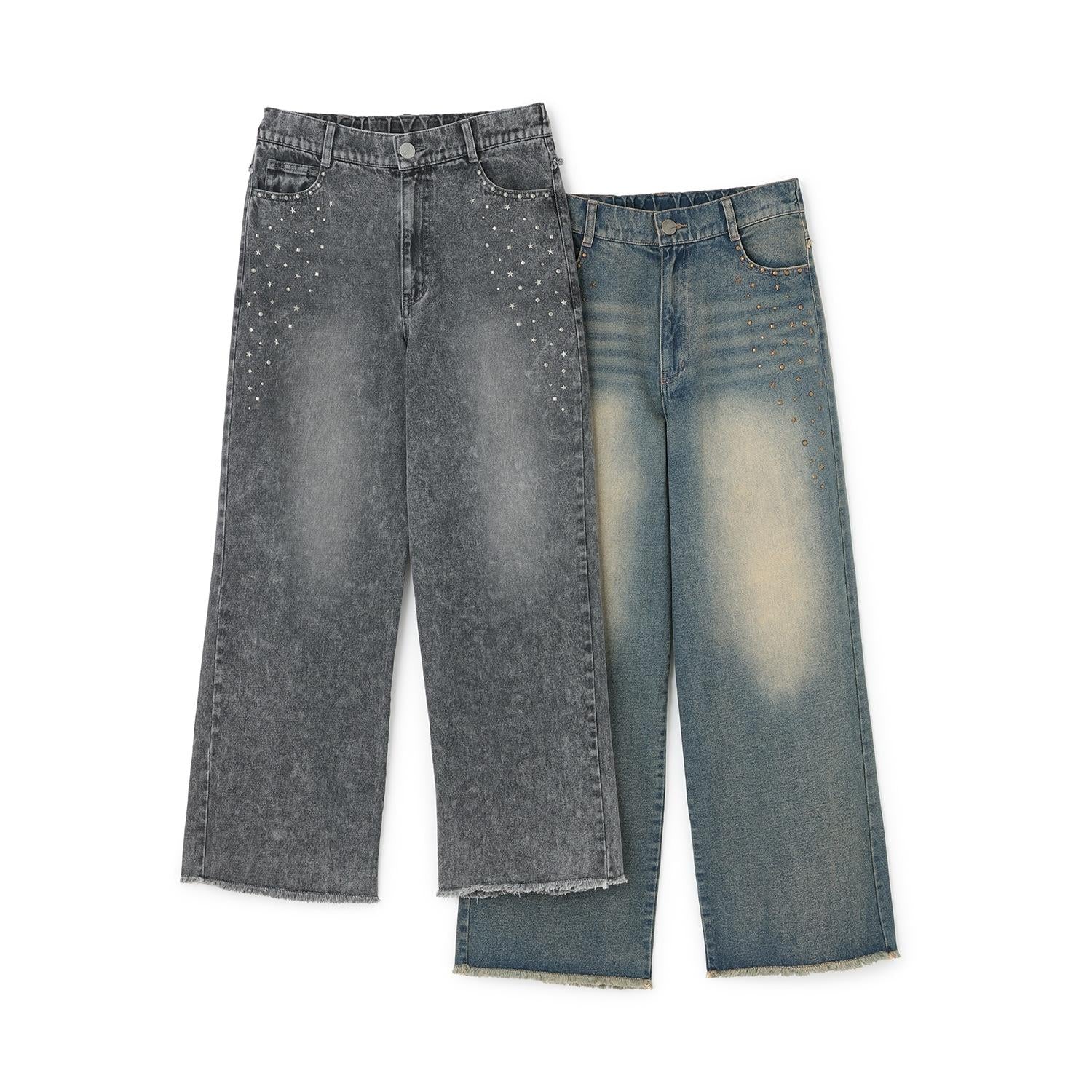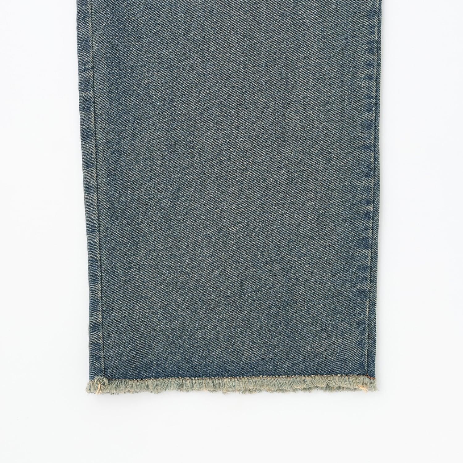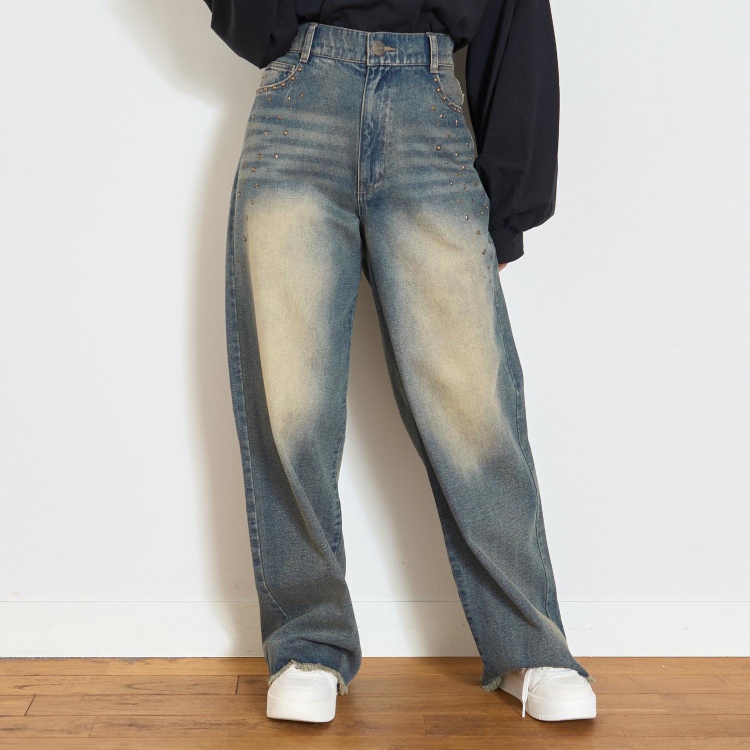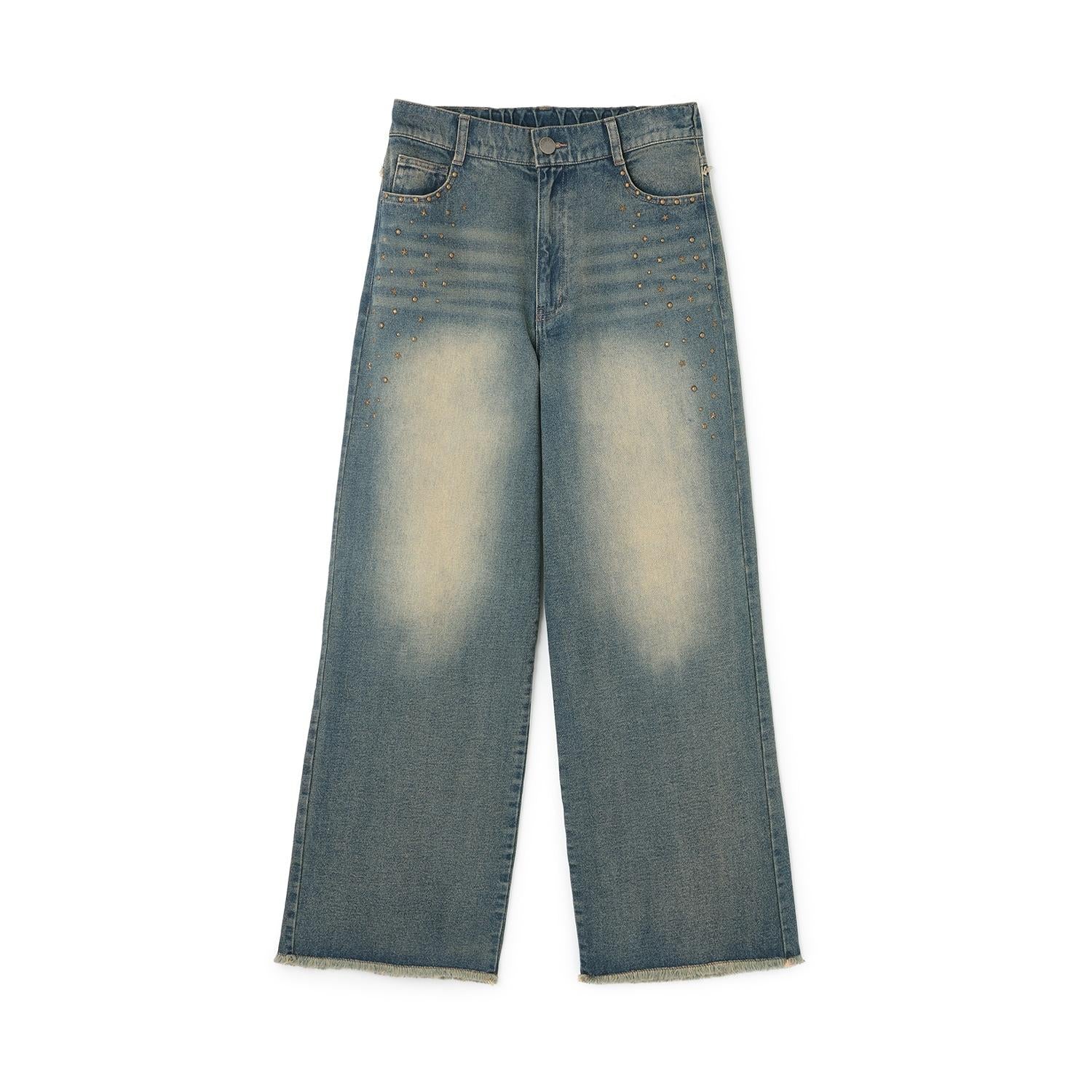 這條牛仔長褲充滿了時下流行的邋遢細節。