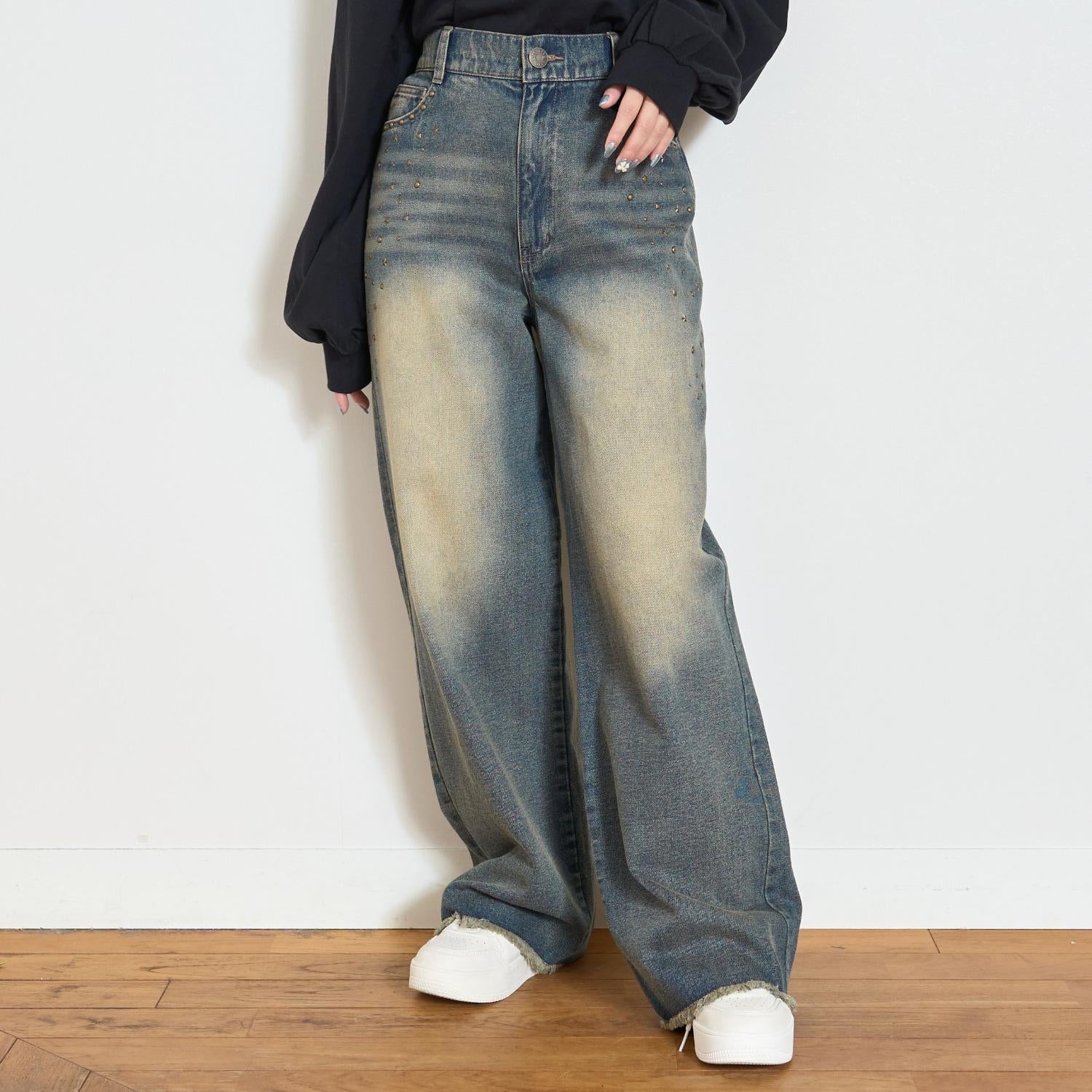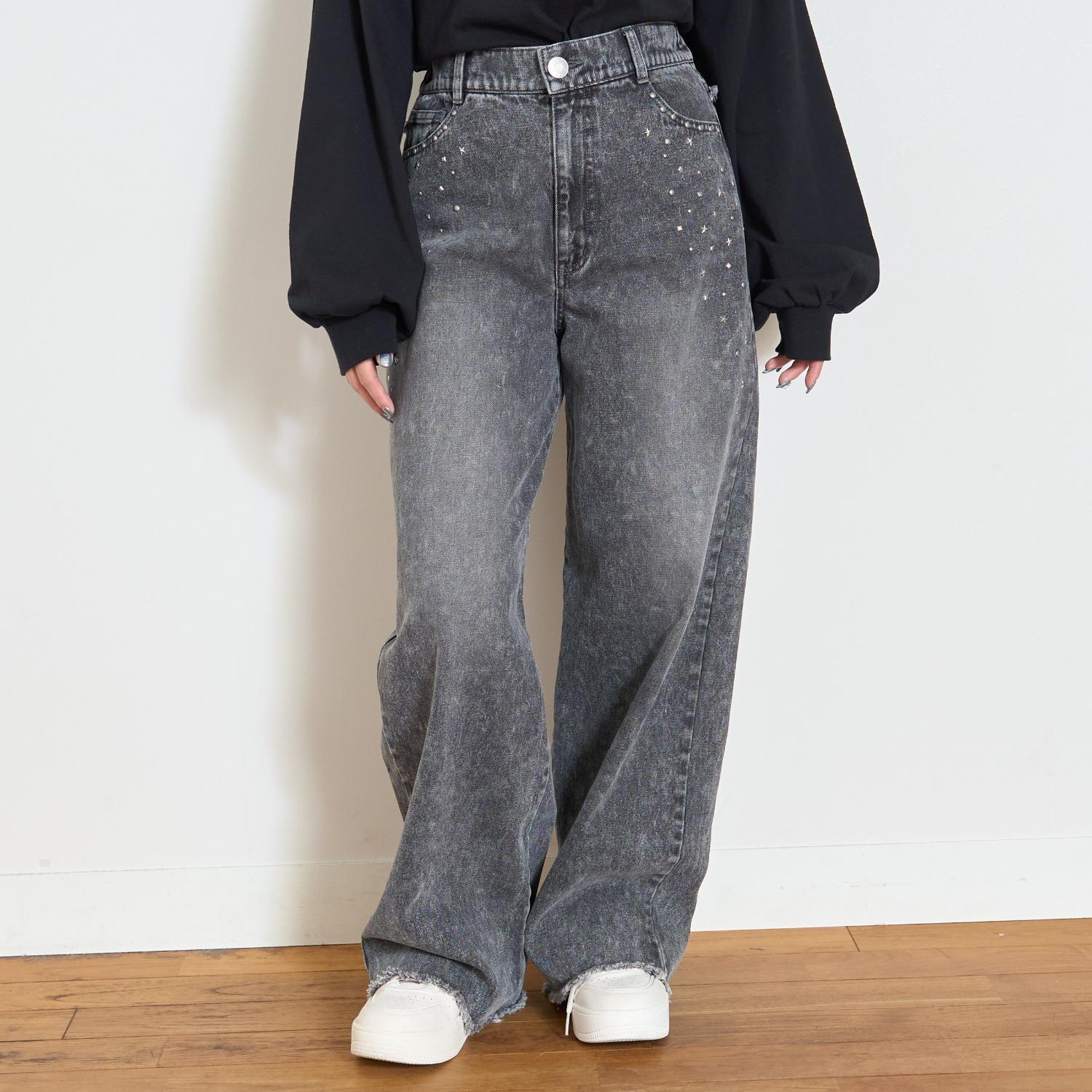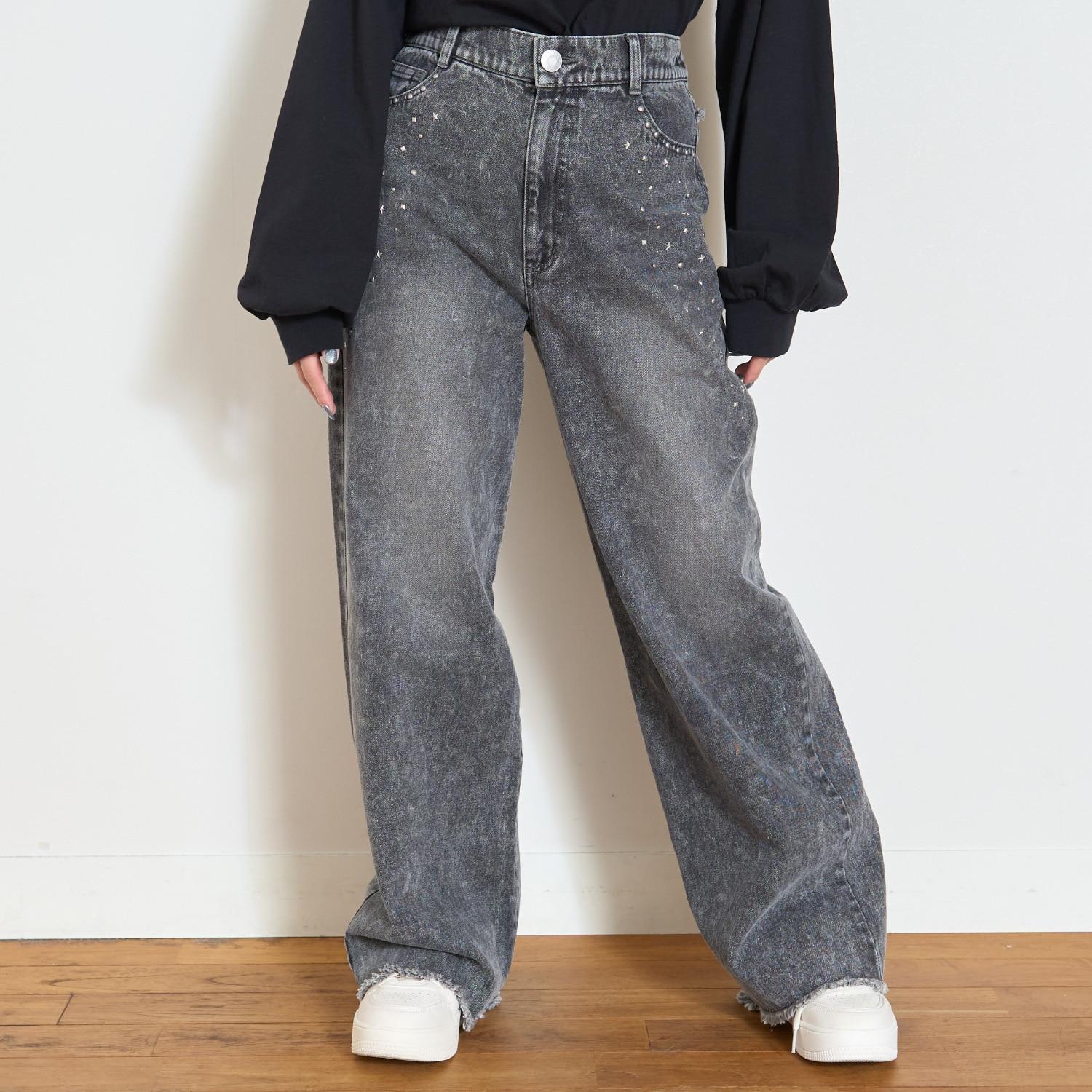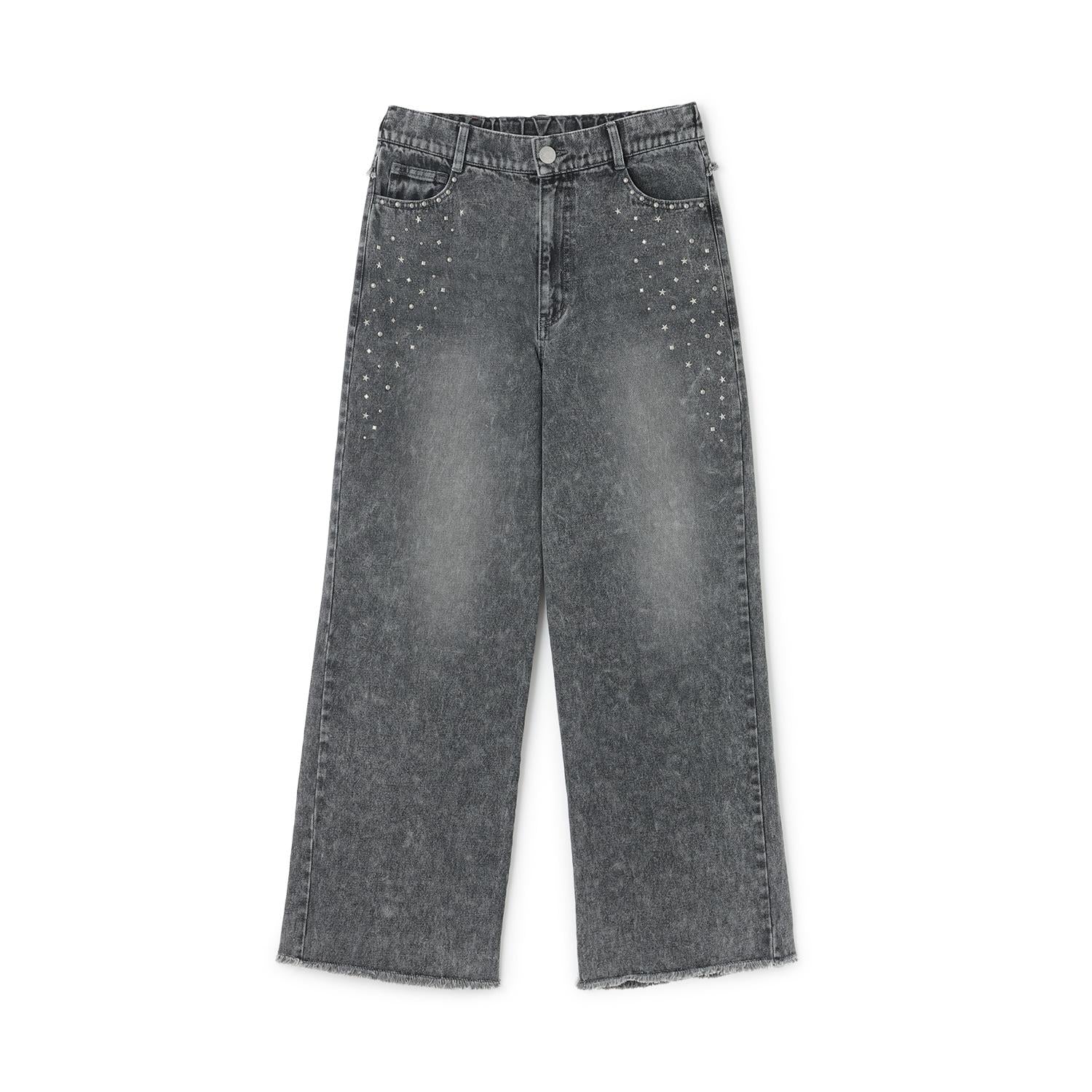 這條牛仔長褲充滿了時下流行的邋遢細節。