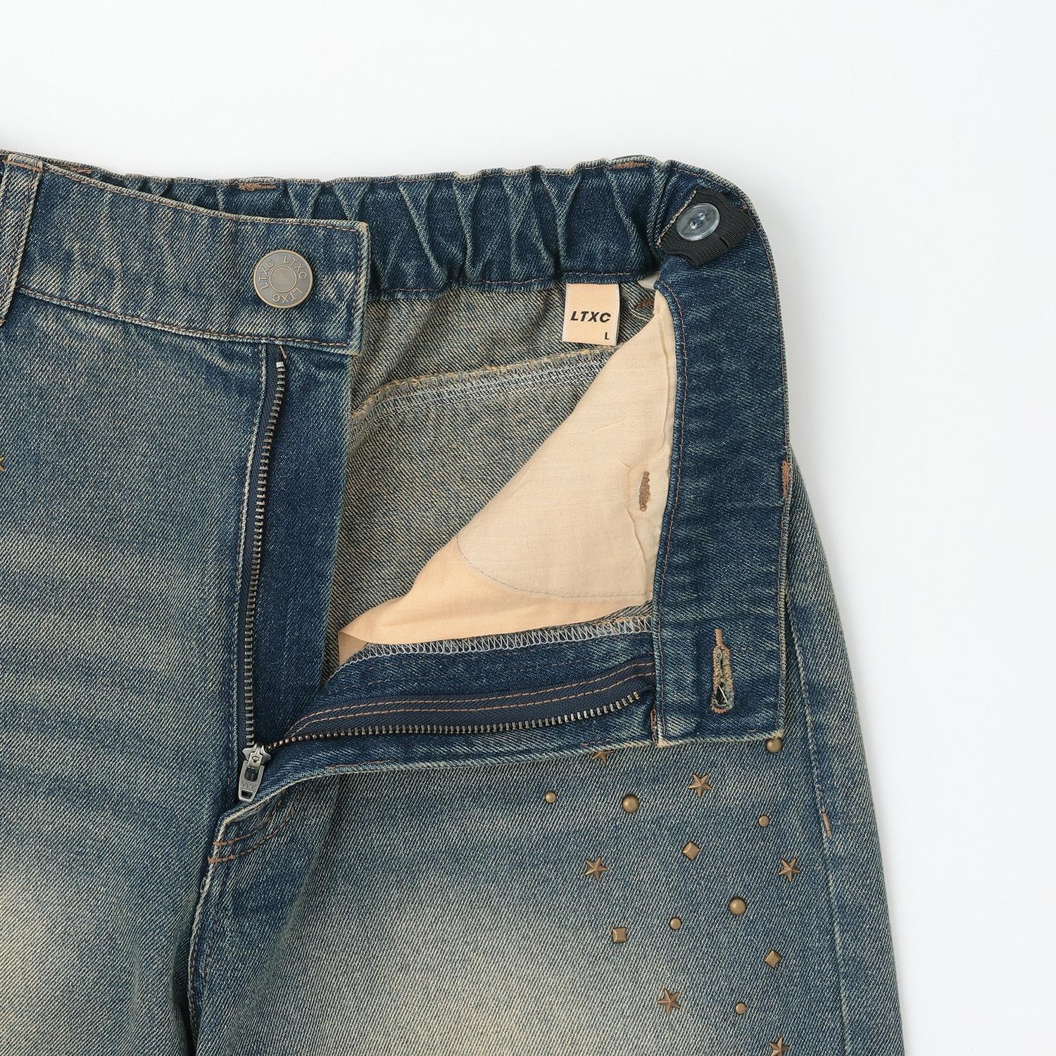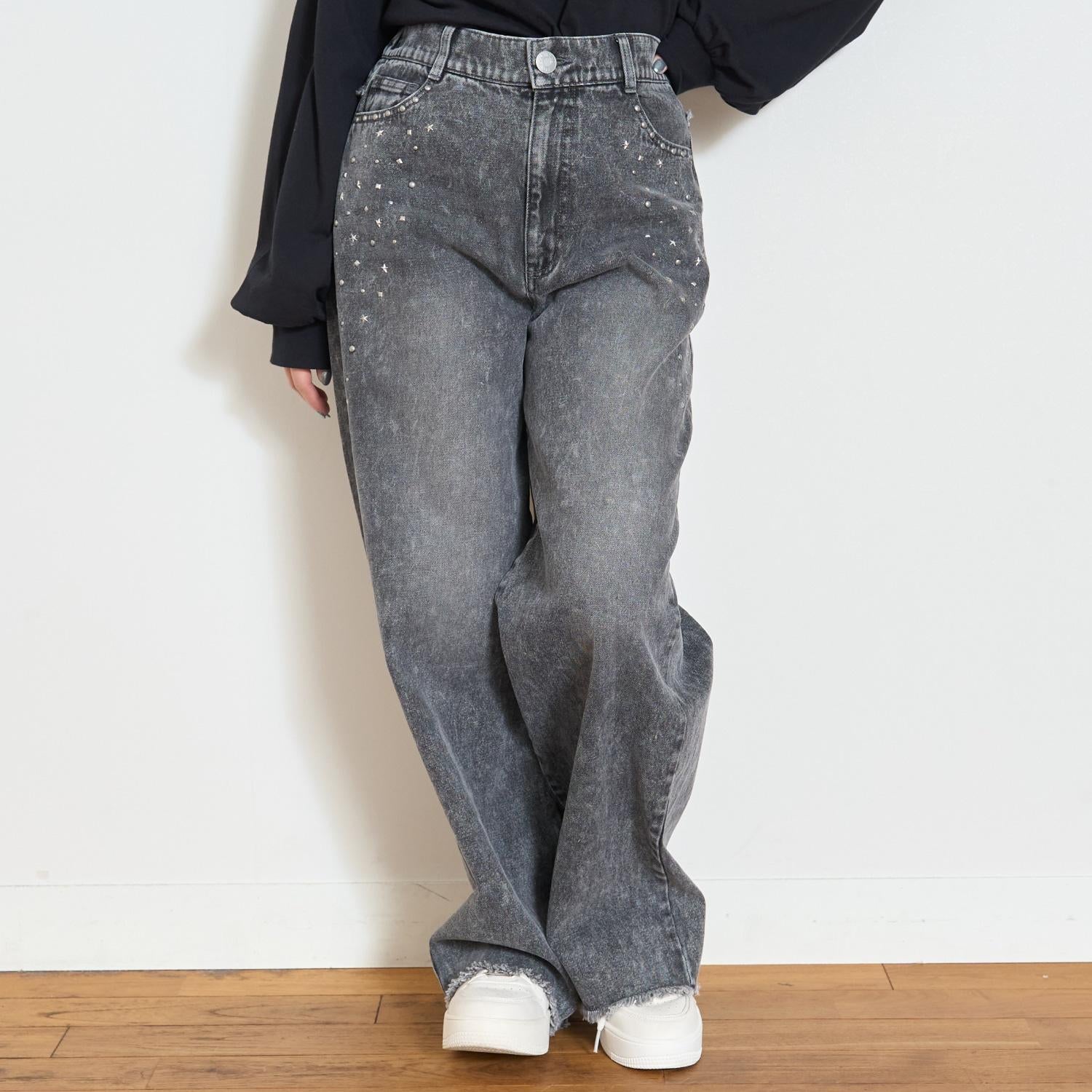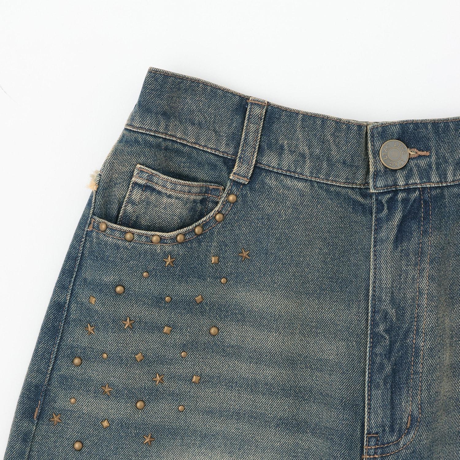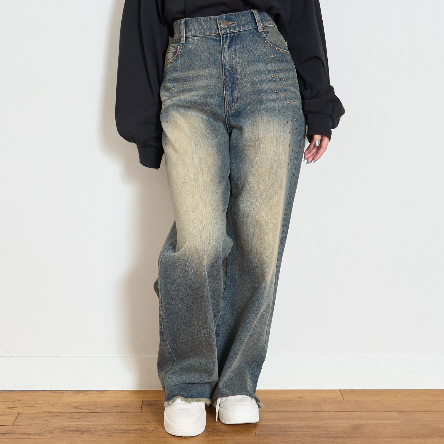 這條牛仔長褲充滿了時下流行的邋遢細節。