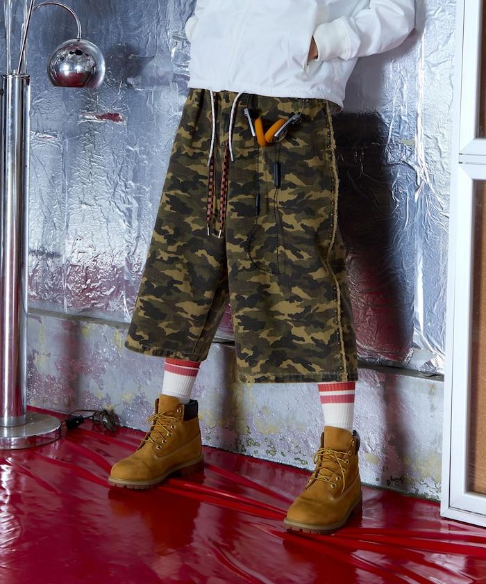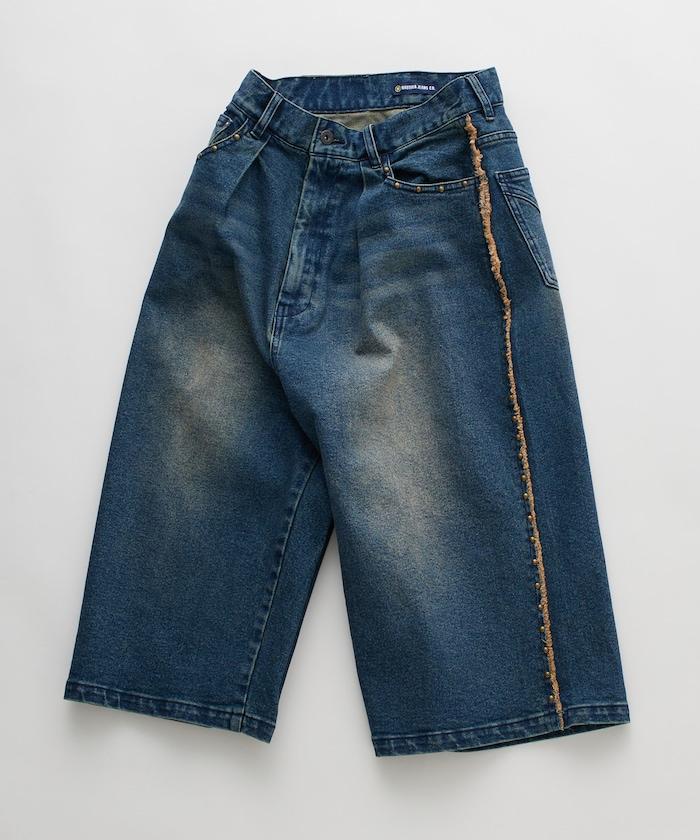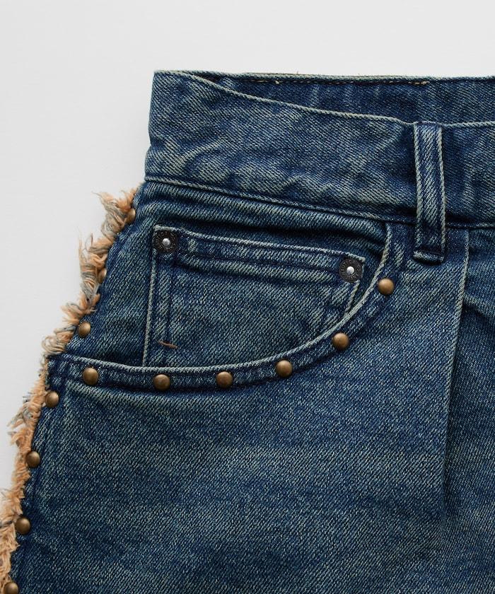 八分褲,褲邊和口袋飾有鉚釘。