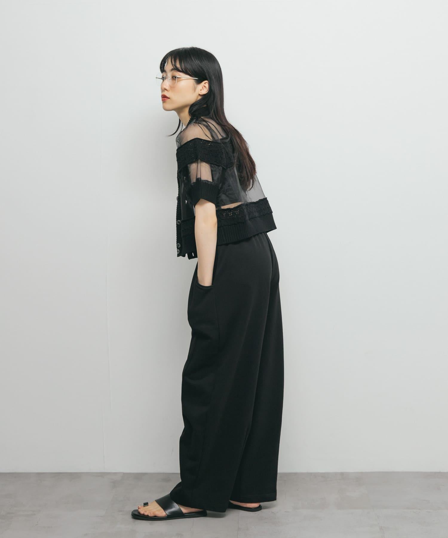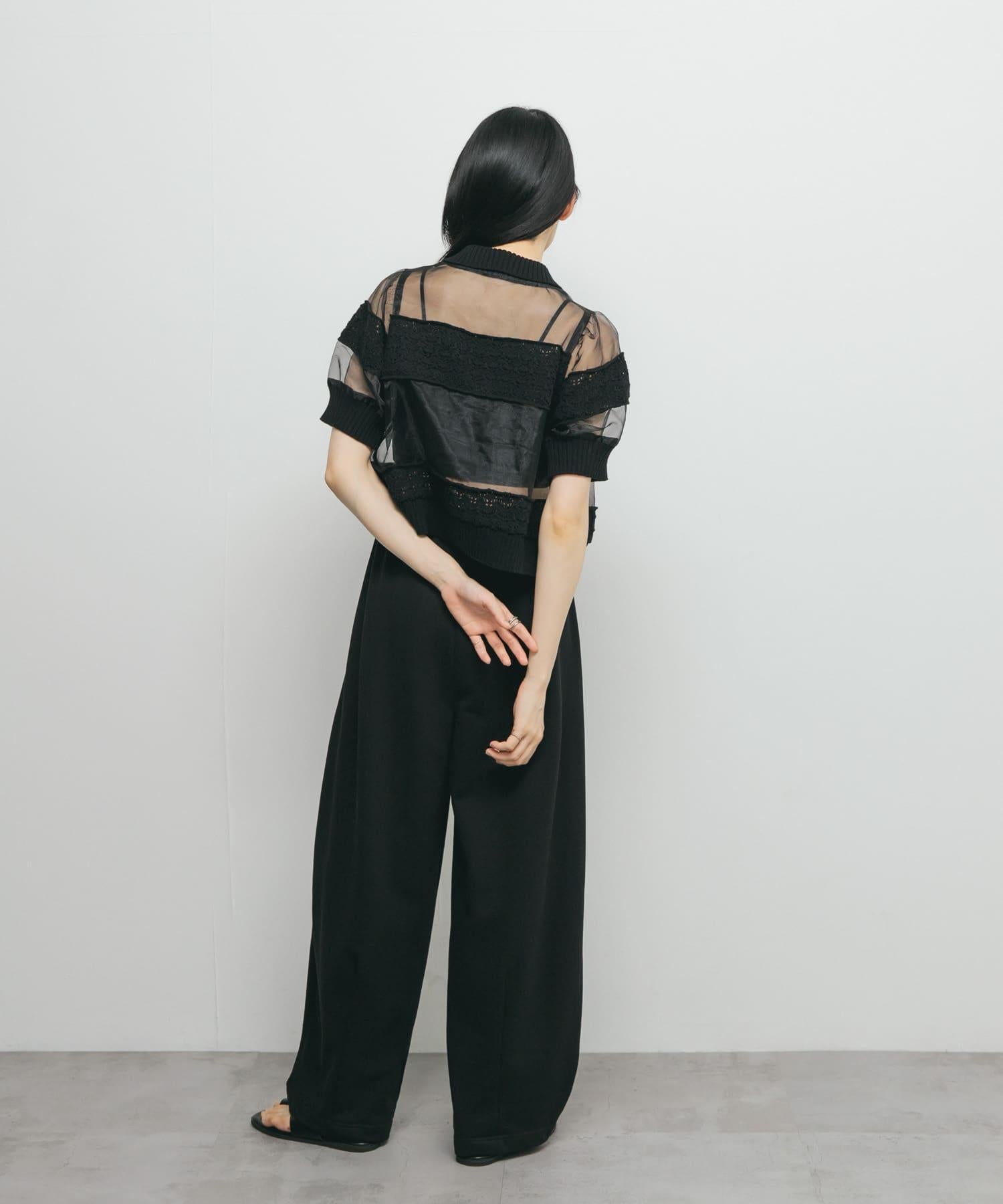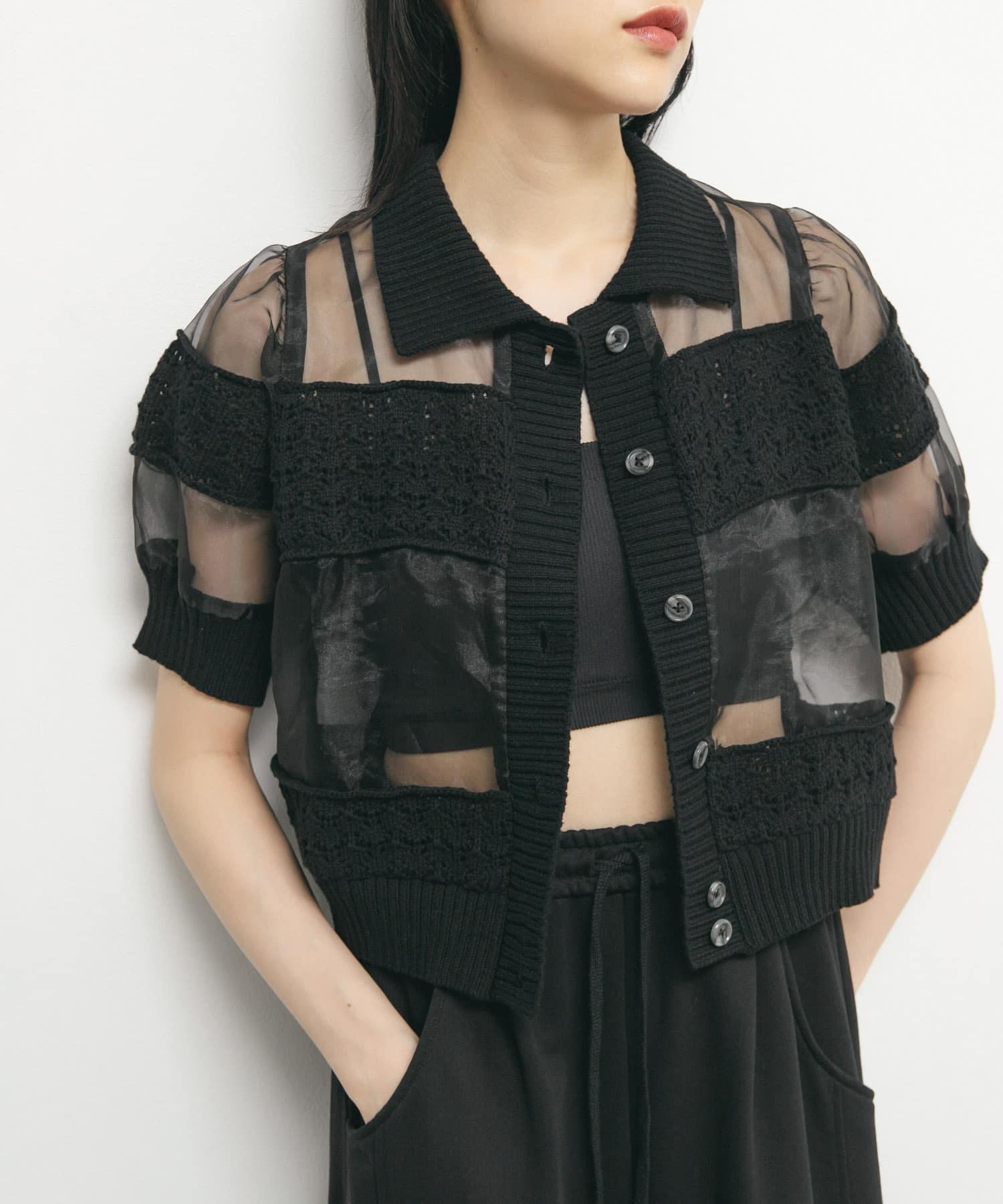 這件上衣設計獨特,主體面料使用了歐根紗材料,邊框上對接了針織物。領口、門襟和袖口採用羅紋設計,便於搭配休閒裝。長短適中的款式與高腰下裝相得益彰,非常適合搭配休閒褲和牛仔褲。我們還建議打開前面的紐扣,像外套一樣穿著。