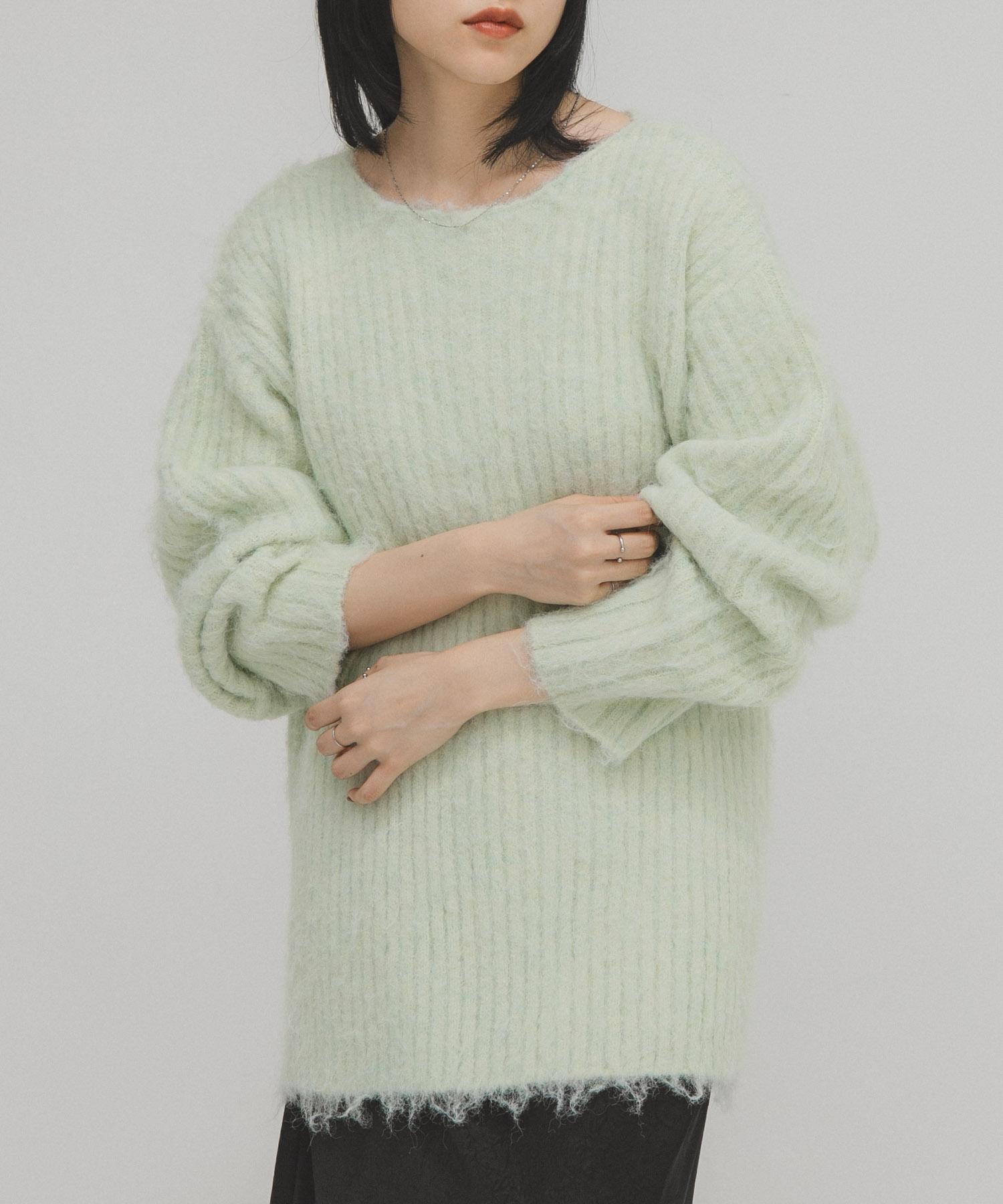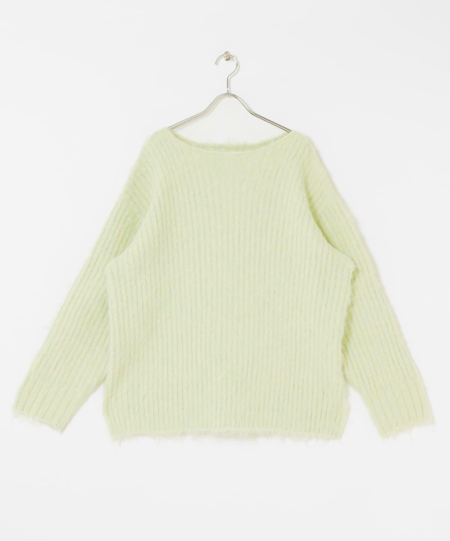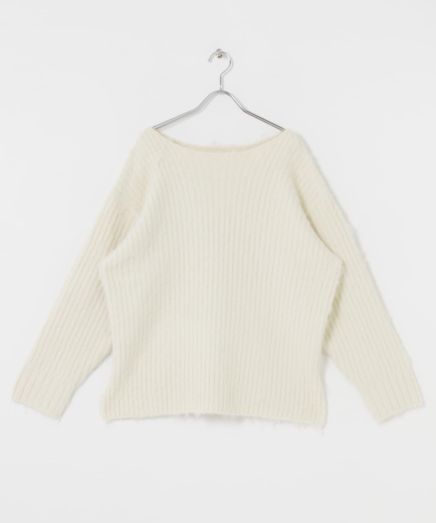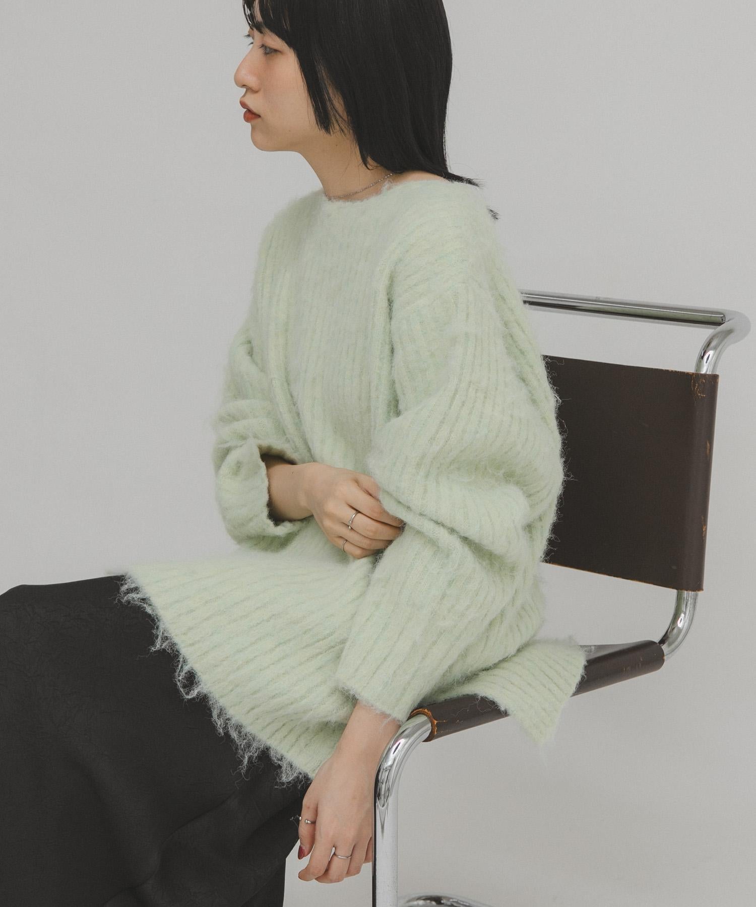女性化的針織面料,表面蓬鬆柔軟,穿著舒適。毛茸茸的面料容易顯得臃腫,但羅紋針織強調了垂直線條,船形領口營造出女性的寬鬆感。長度覆蓋至腰部,輪廓也很關鍵。