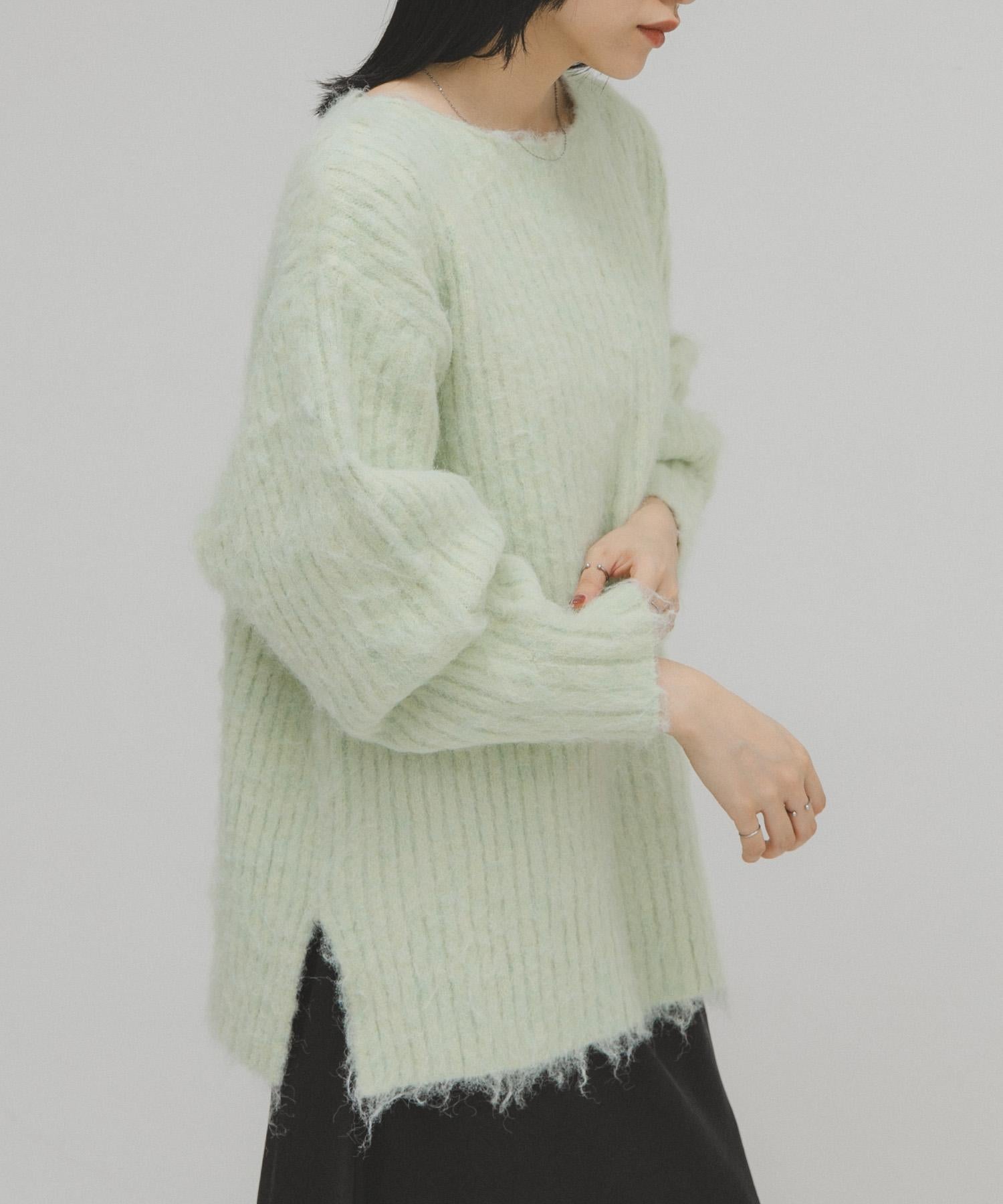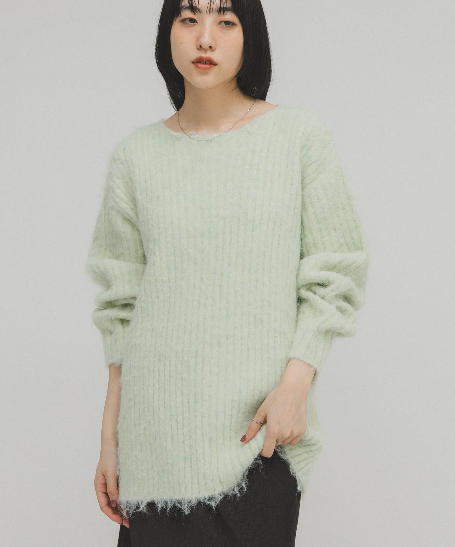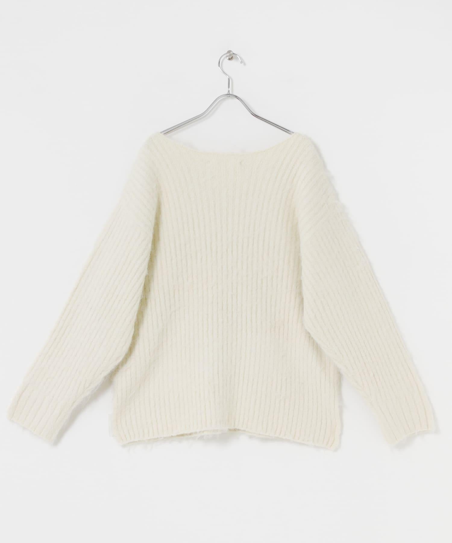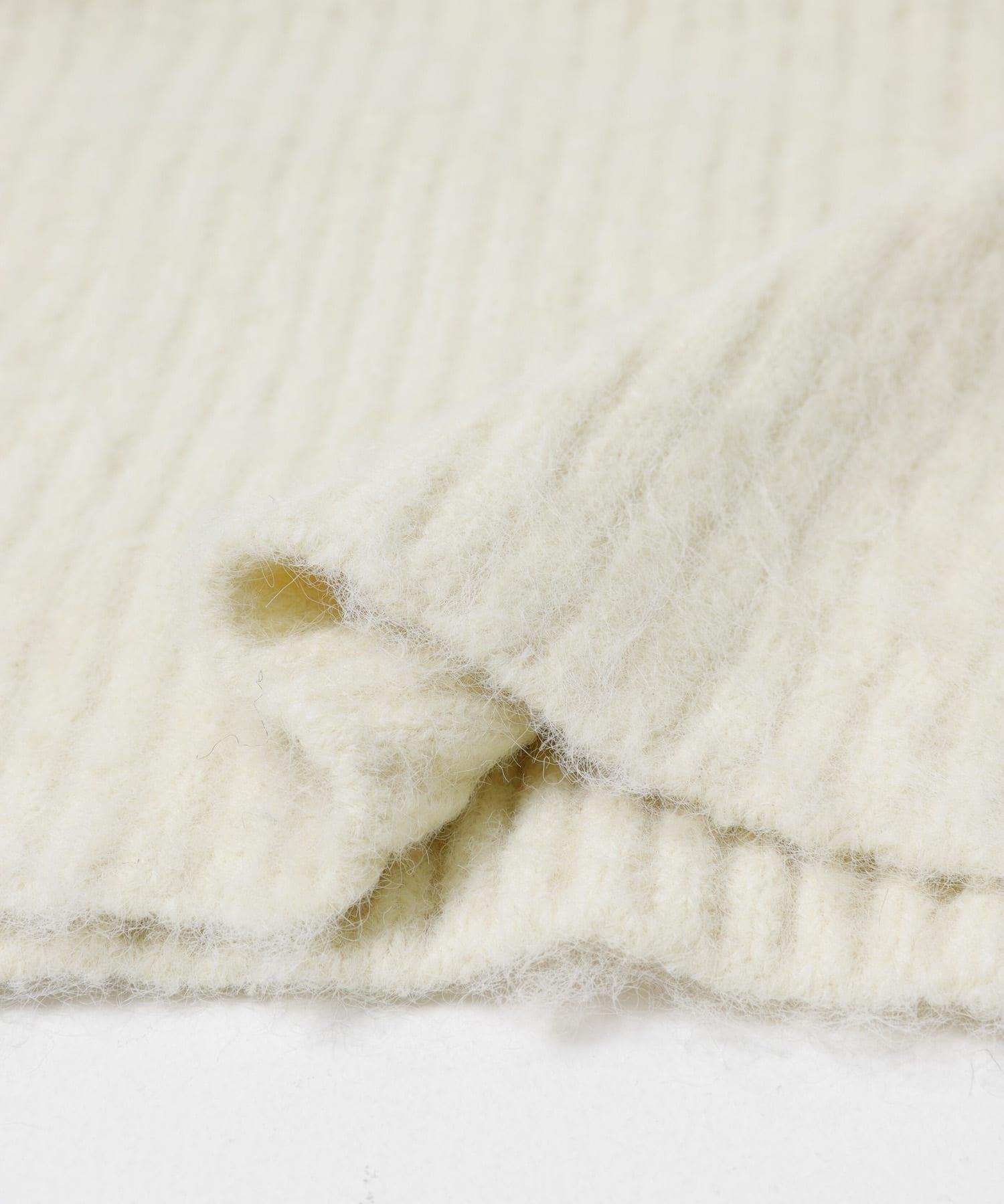 女性化的針織面料,表面蓬鬆柔軟,穿著舒適。毛茸茸的面料容易顯得臃腫,但羅紋針織強調了垂直線條,船形領口營造出女性的寬鬆感。長度覆蓋至腰部,輪廓也很關鍵。