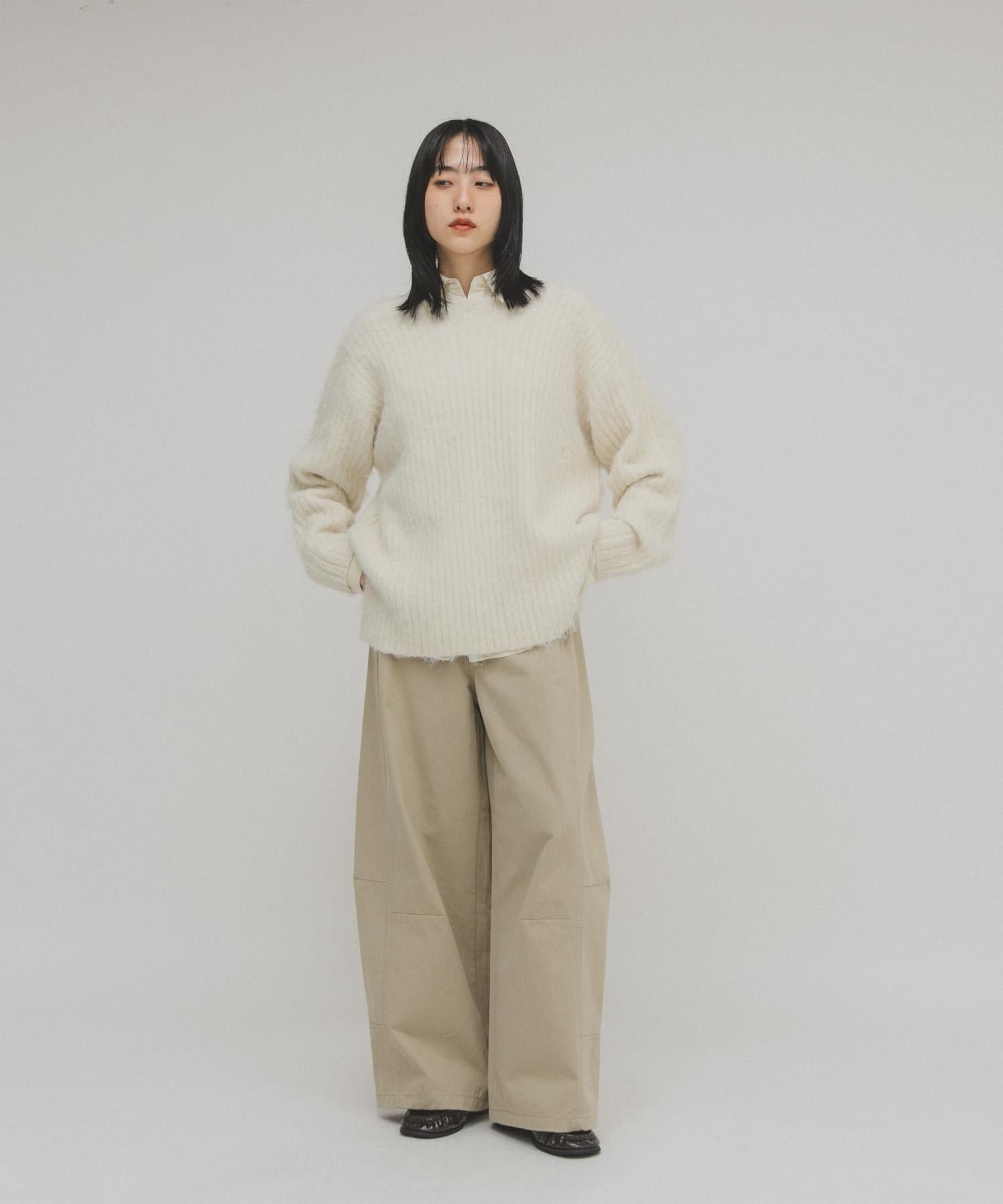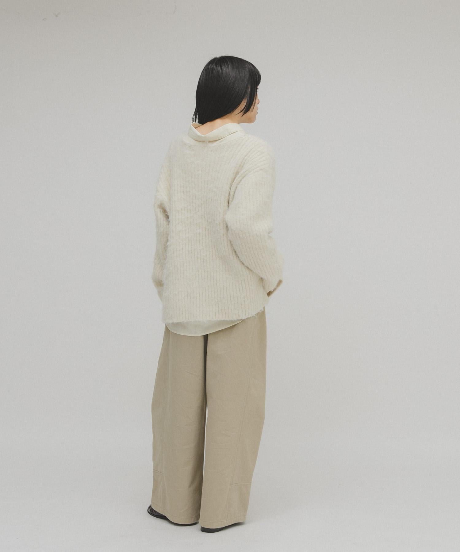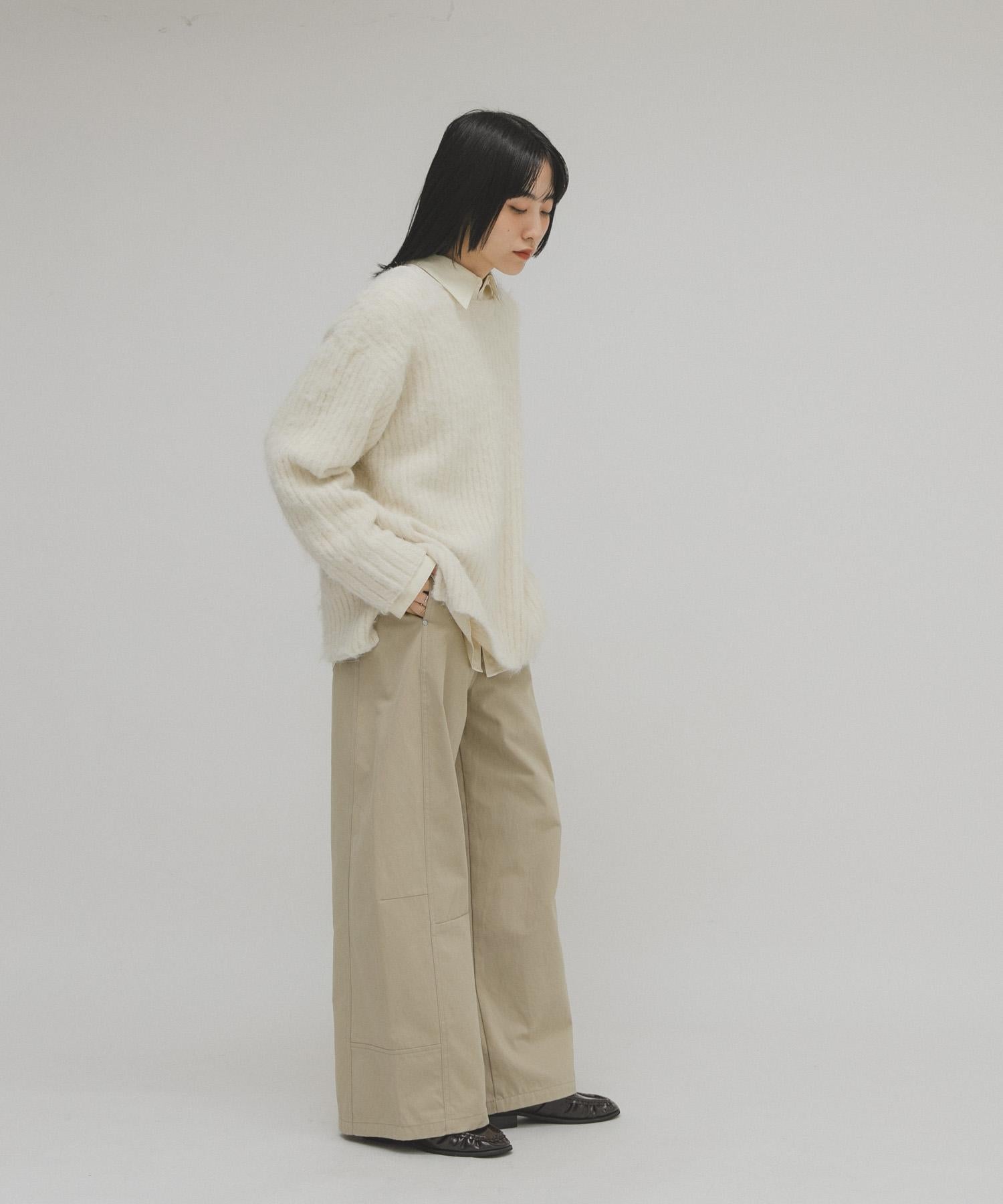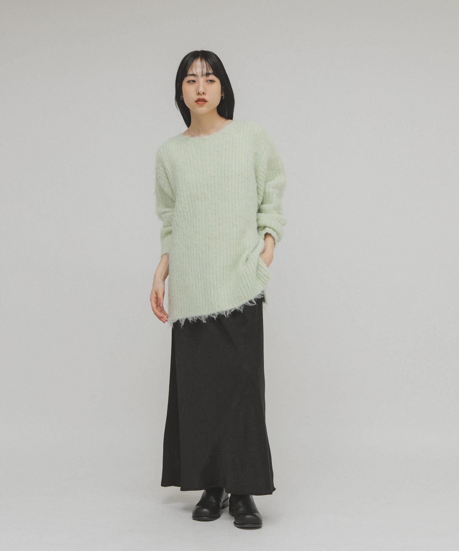 女性化的針織面料,表面蓬鬆柔軟,穿著舒適。毛茸茸的面料容易顯得臃腫,但羅紋針織強調了垂直線條,船形領口營造出女性的寬鬆感。長度覆蓋至腰部,輪廓也很關鍵。