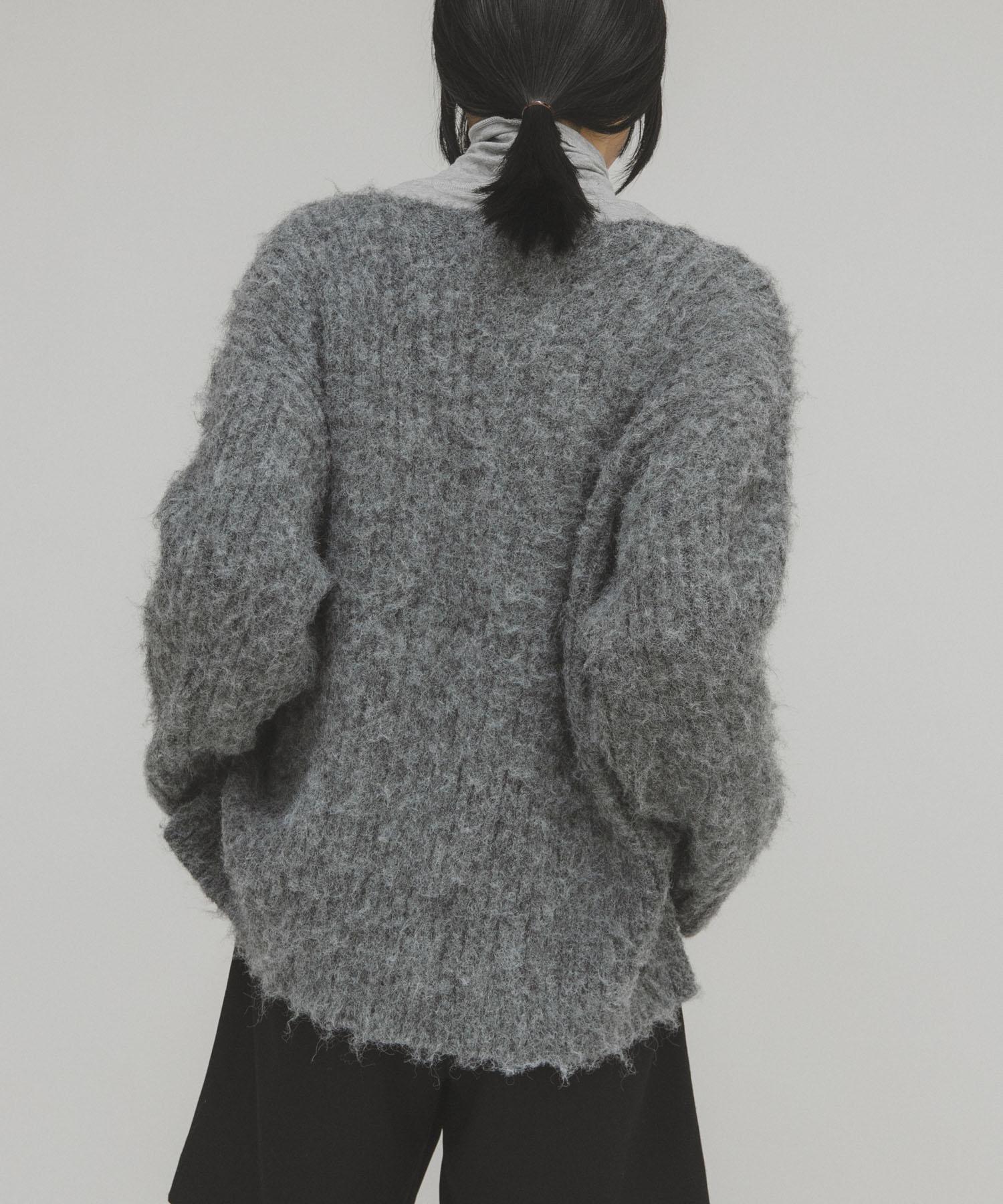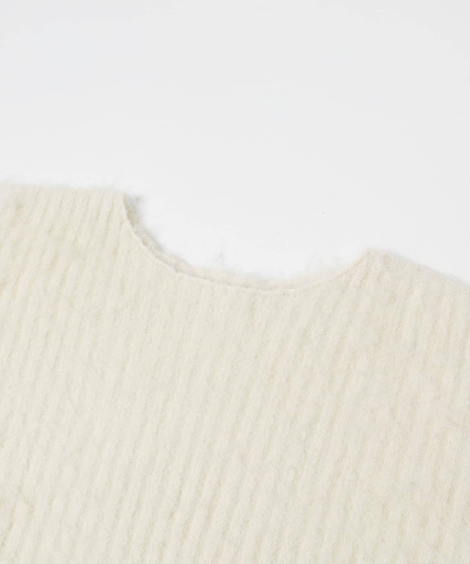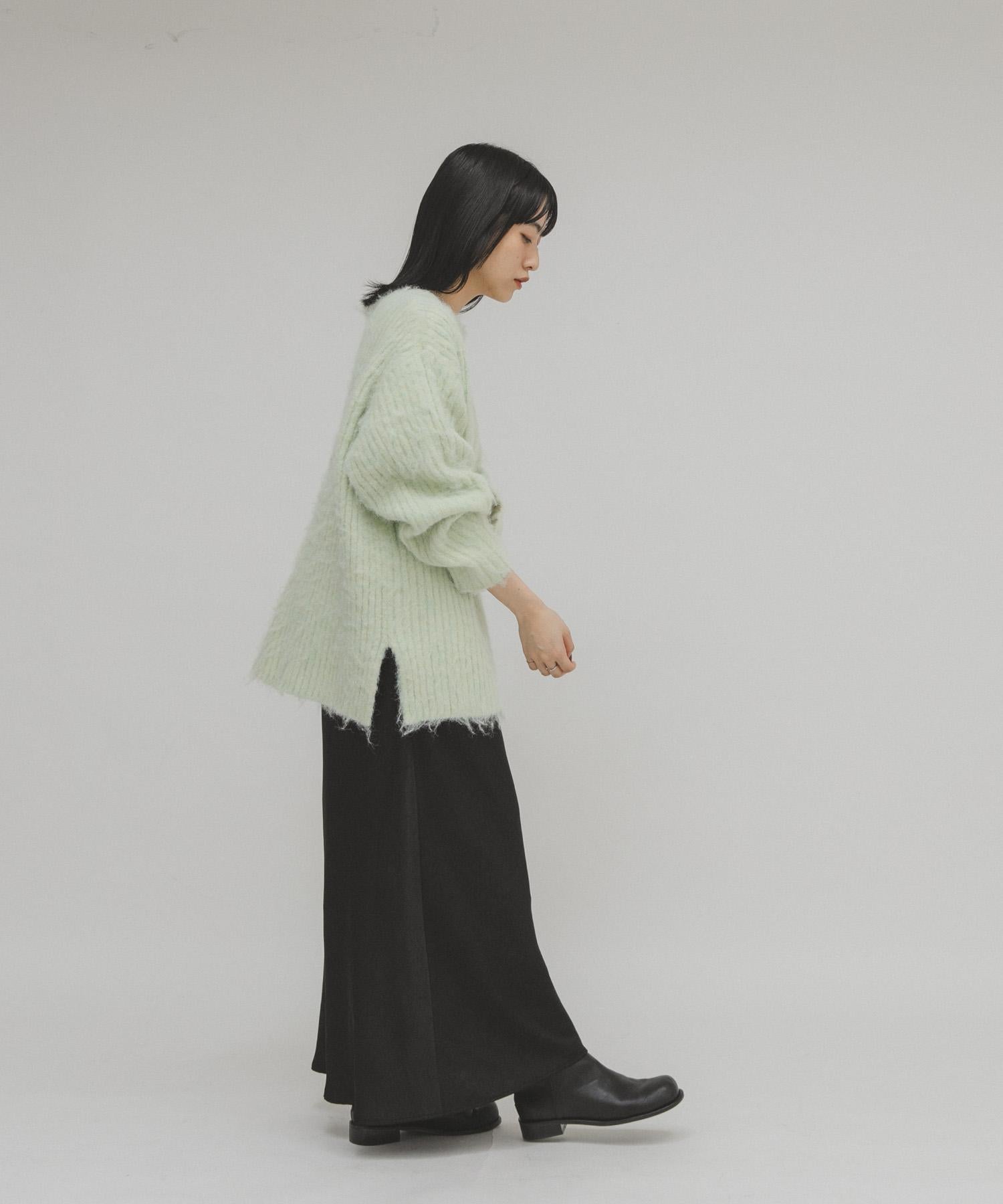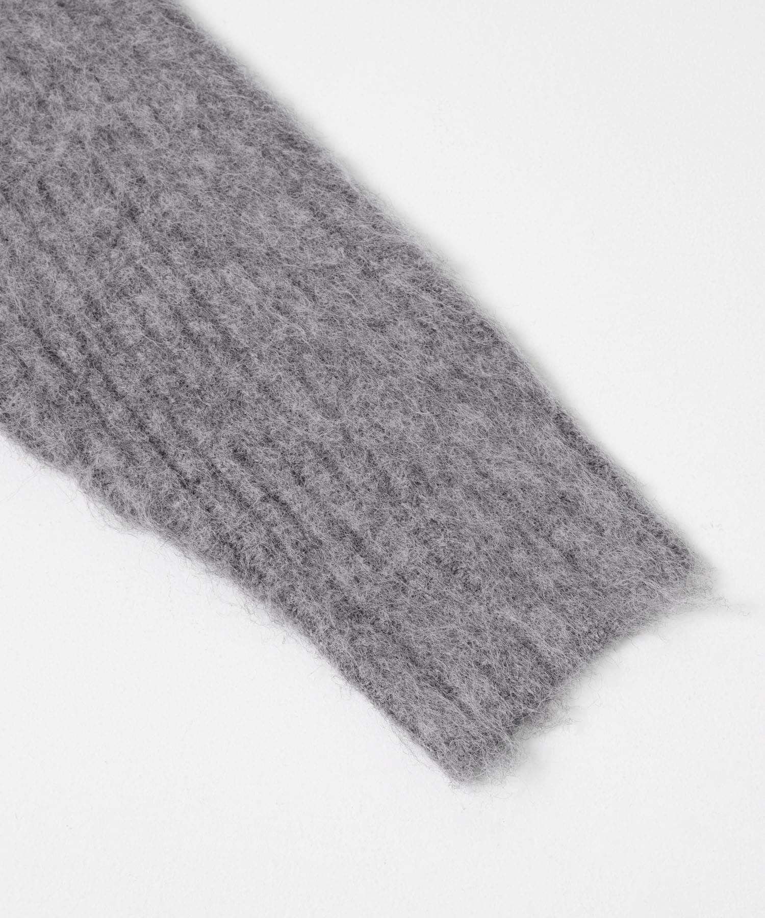 女性化的針織面料,表面蓬鬆柔軟,穿著舒適。毛茸茸的面料容易顯得臃腫,但羅紋針織強調了垂直線條,船形領口營造出女性的寬鬆感。長度覆蓋至腰部,輪廓也很關鍵。