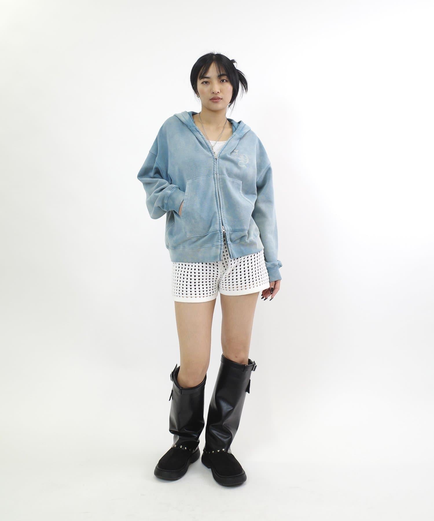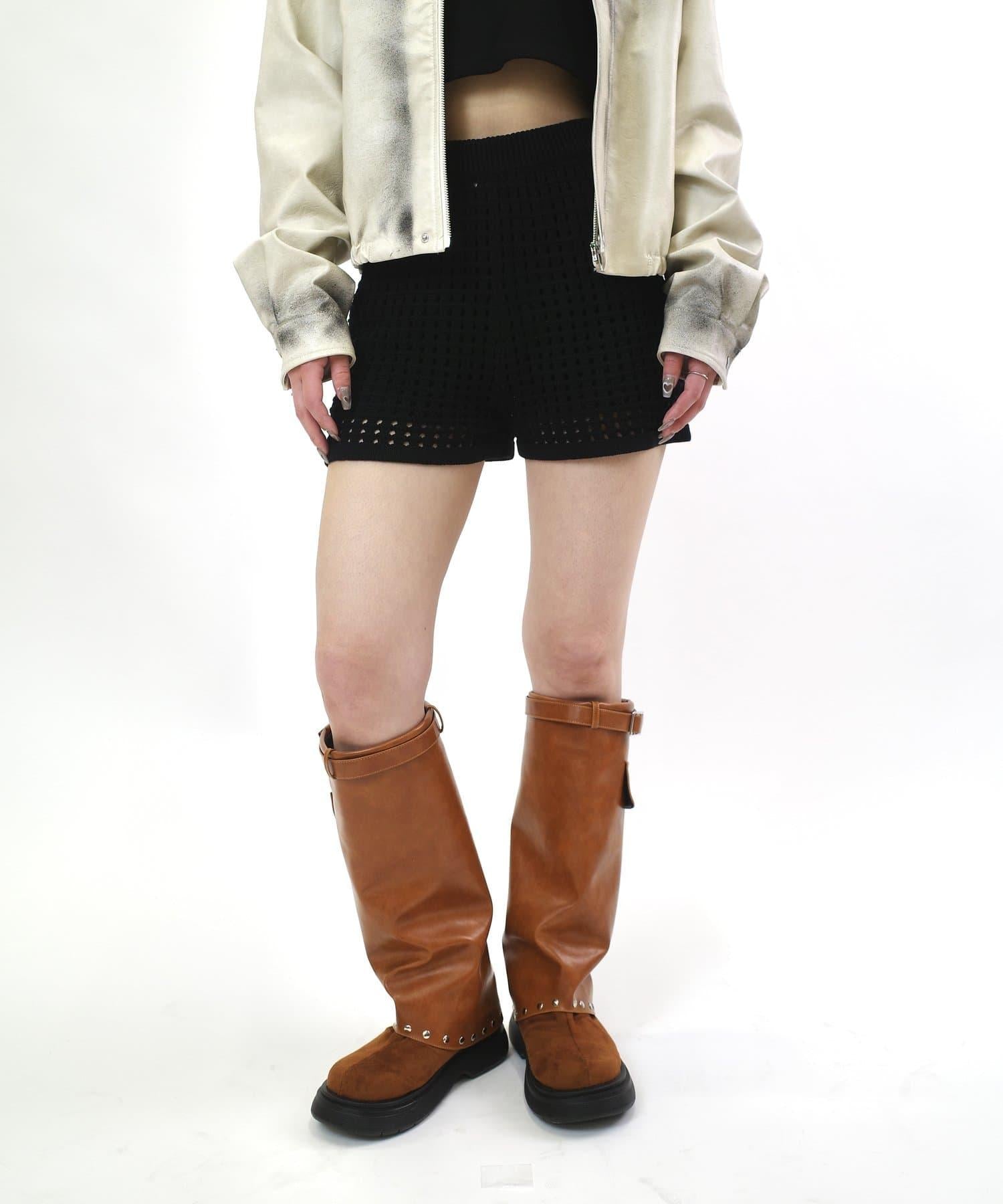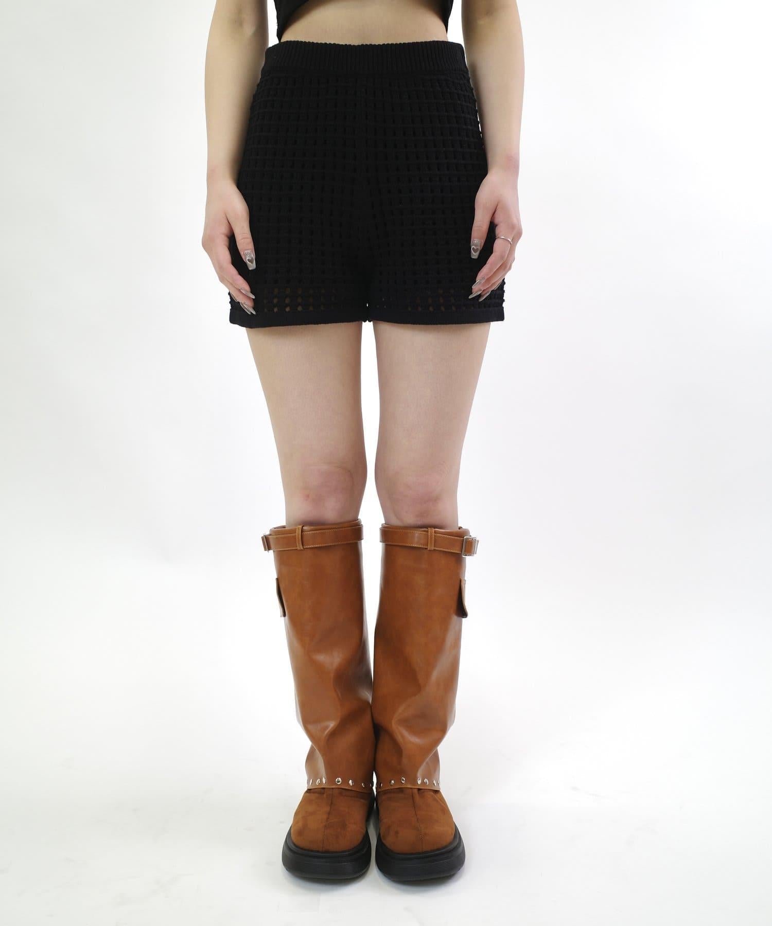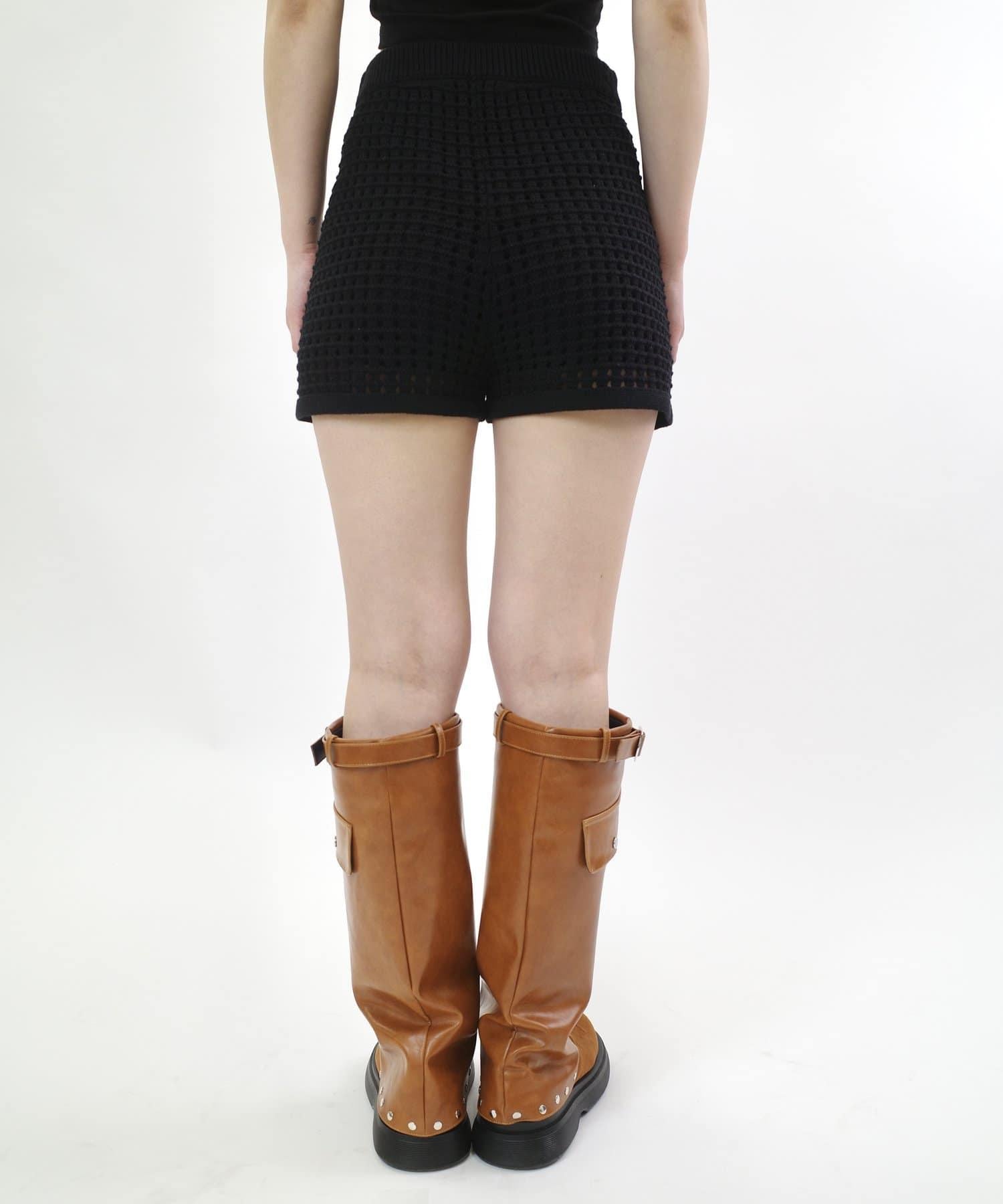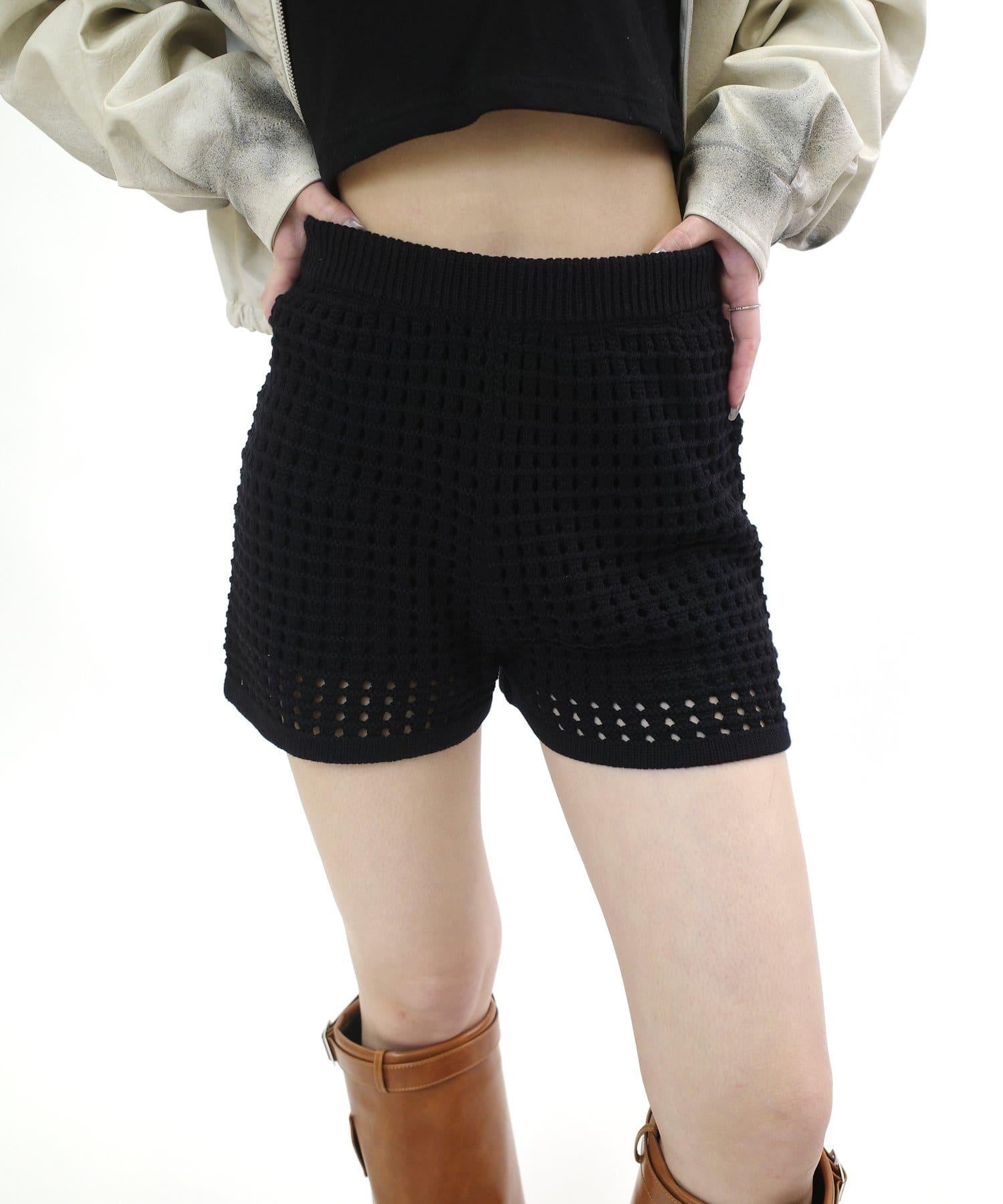 短褲採用大膽的鏤空編織,單穿時呈透明狀,建議下身搭配羅紋短褲或稍緊身的打底褲。