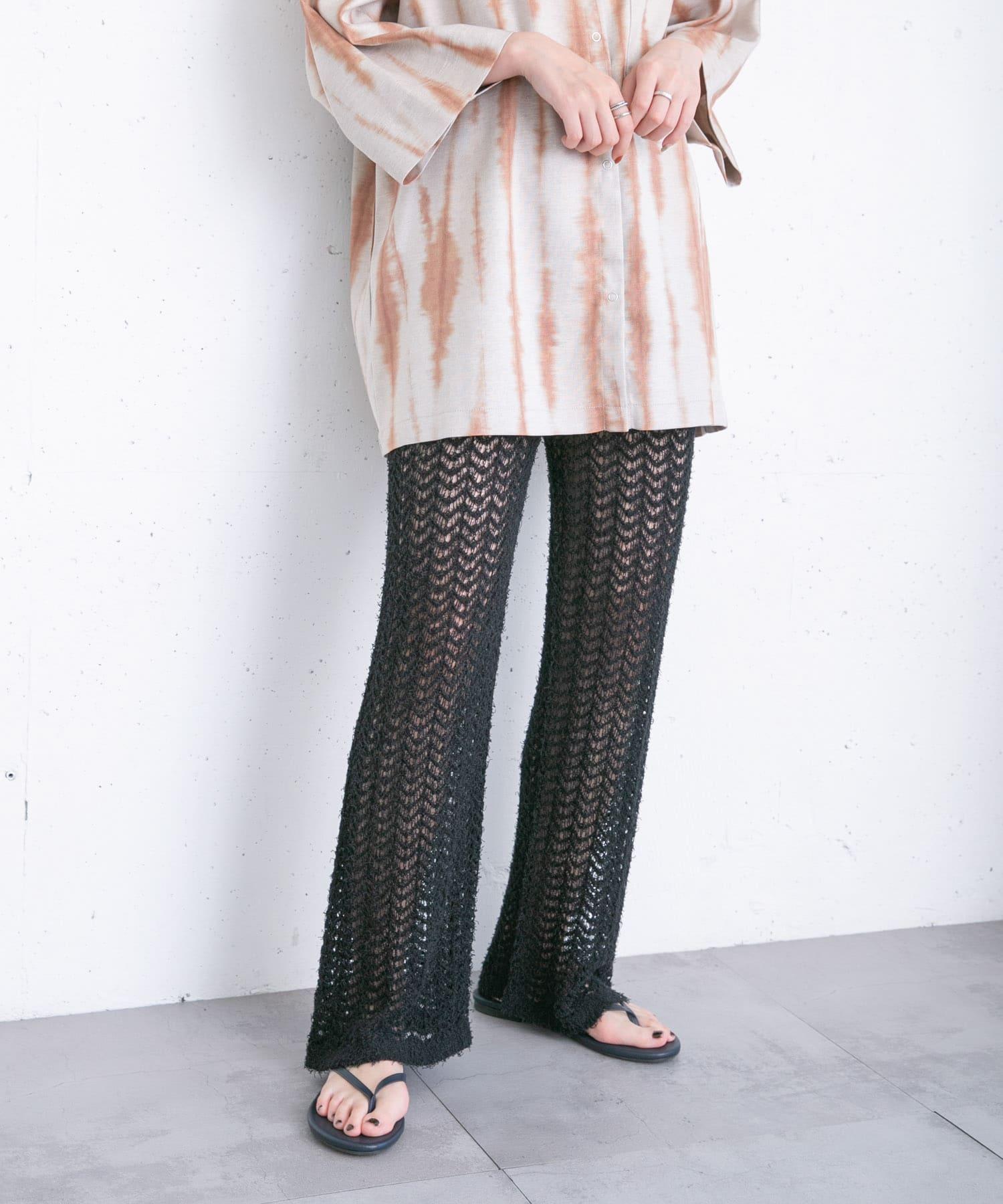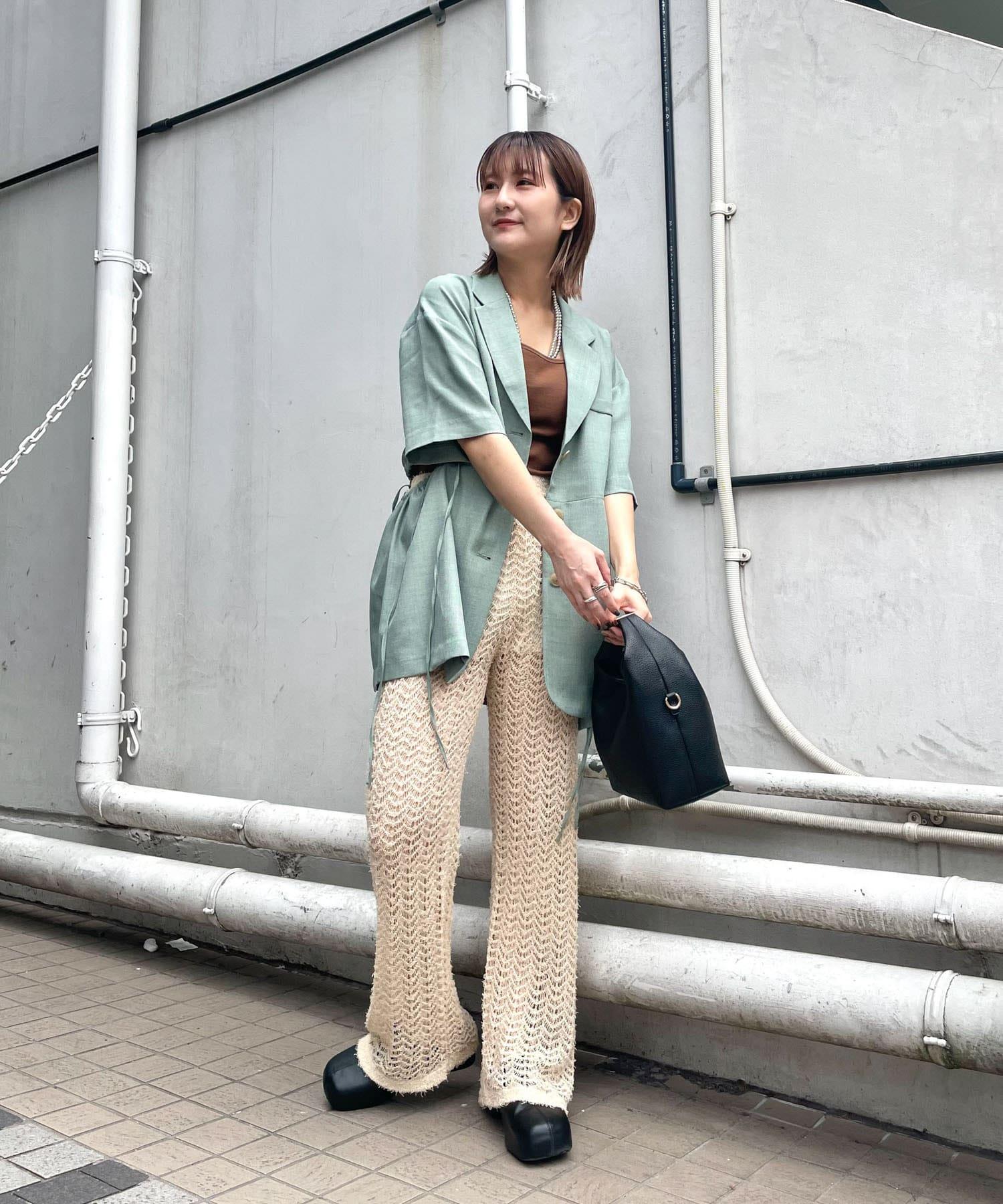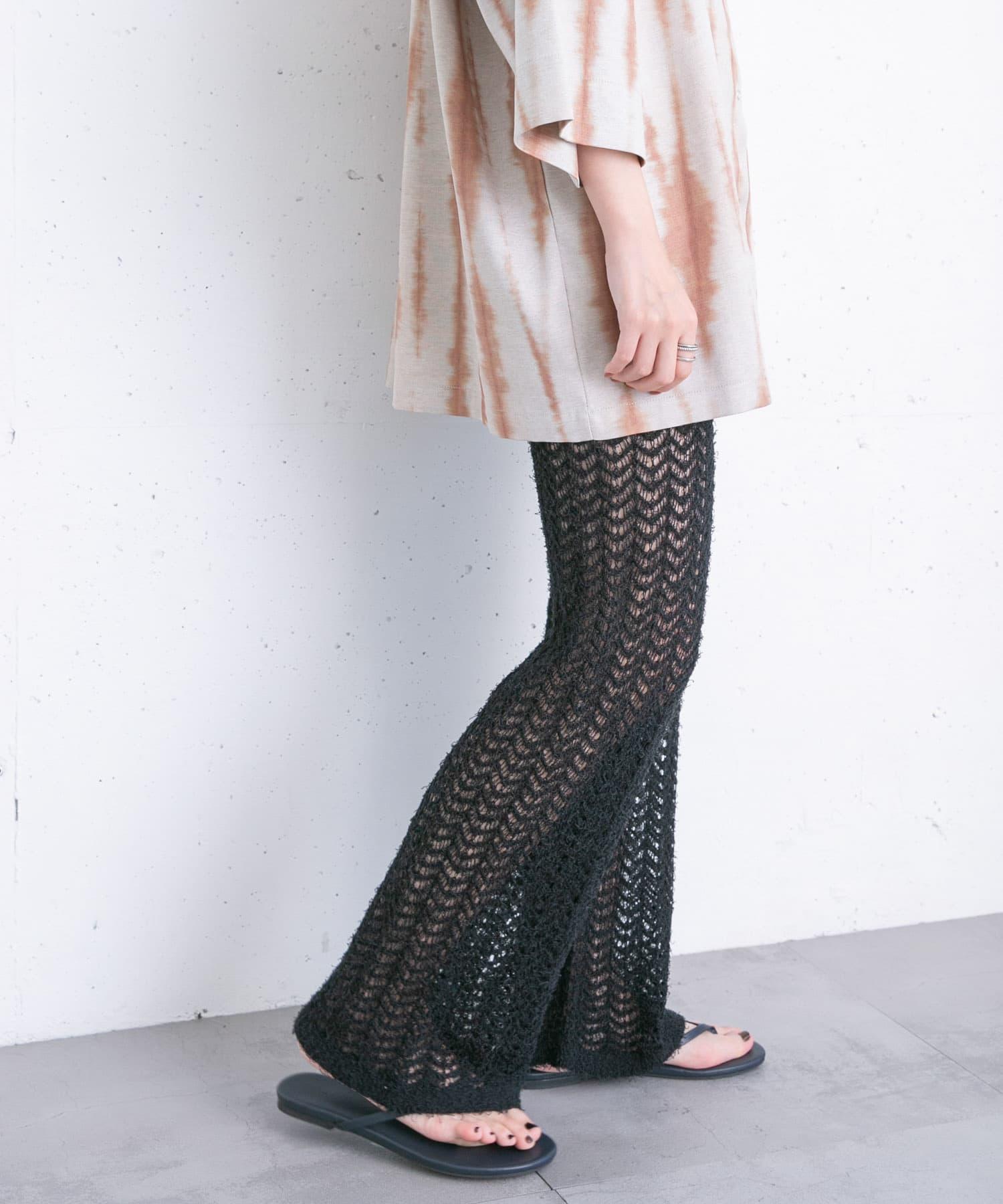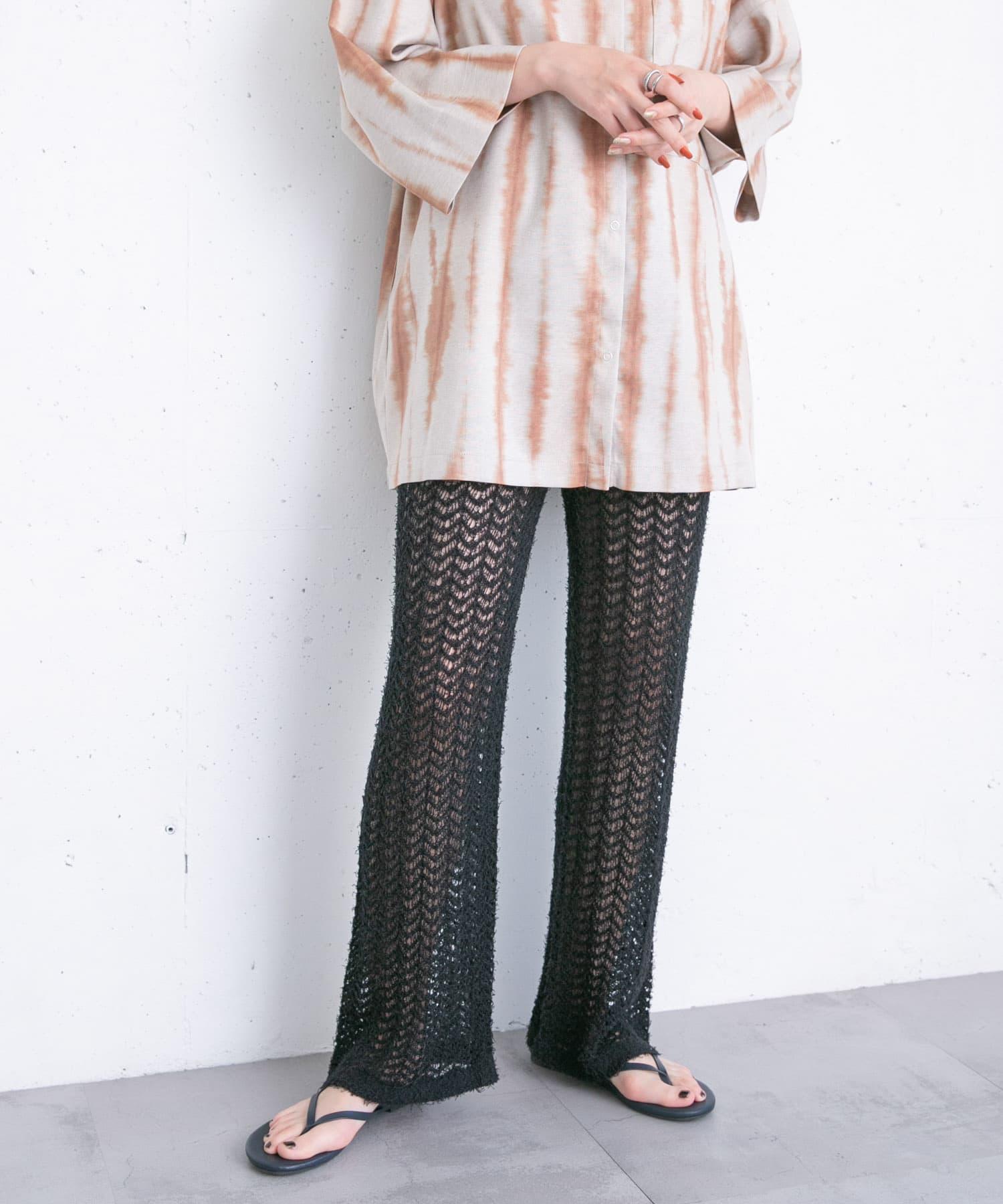 由於其通透性,建議與稍長的上衣、外衣和連衣裙搭配。尤其是長款連身裙,往往會以同樣的方式進行搭配,因此請盡情享受褲子帶來的變化。也有與裙子相同材質的款式(KB35-25J130)。