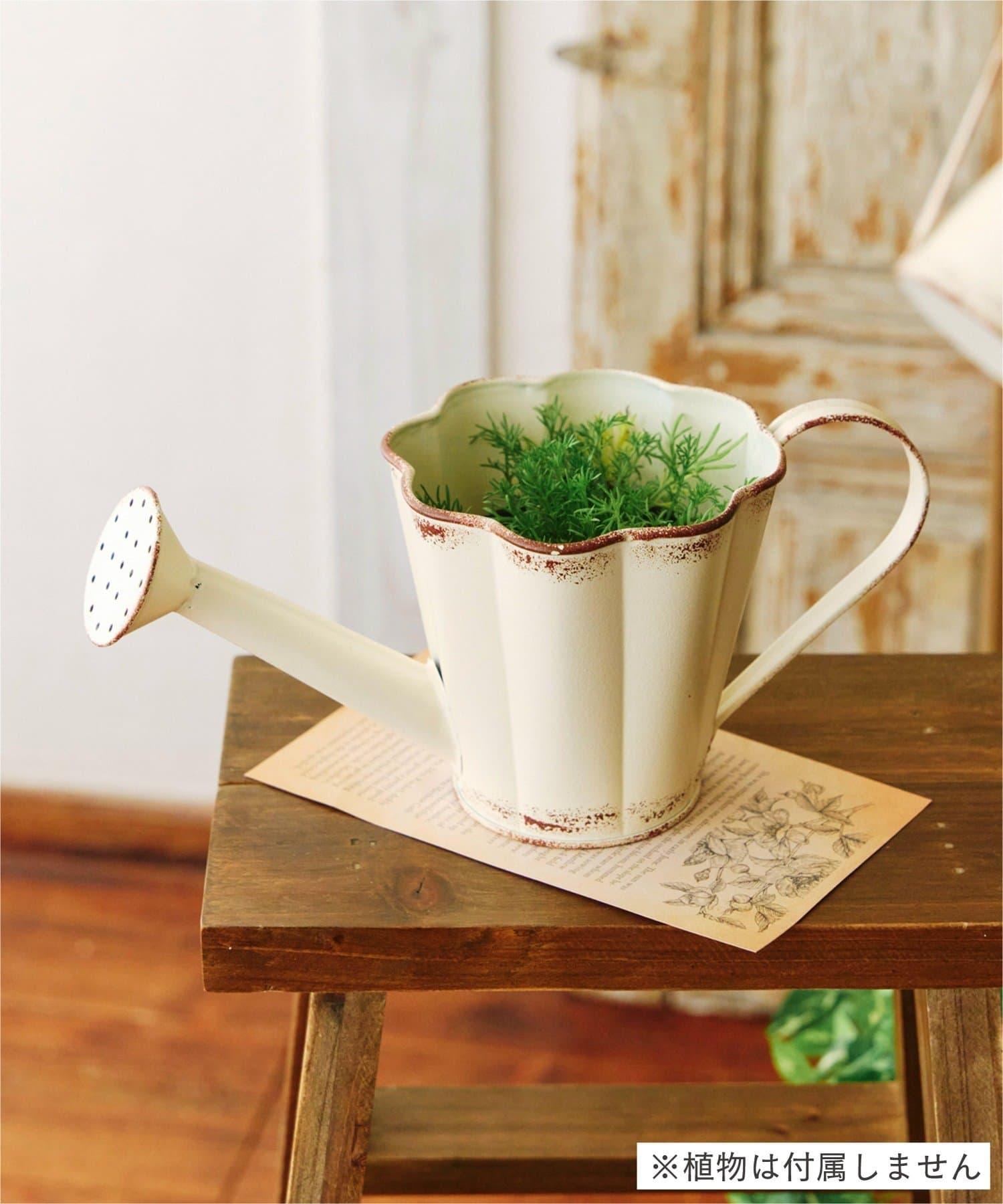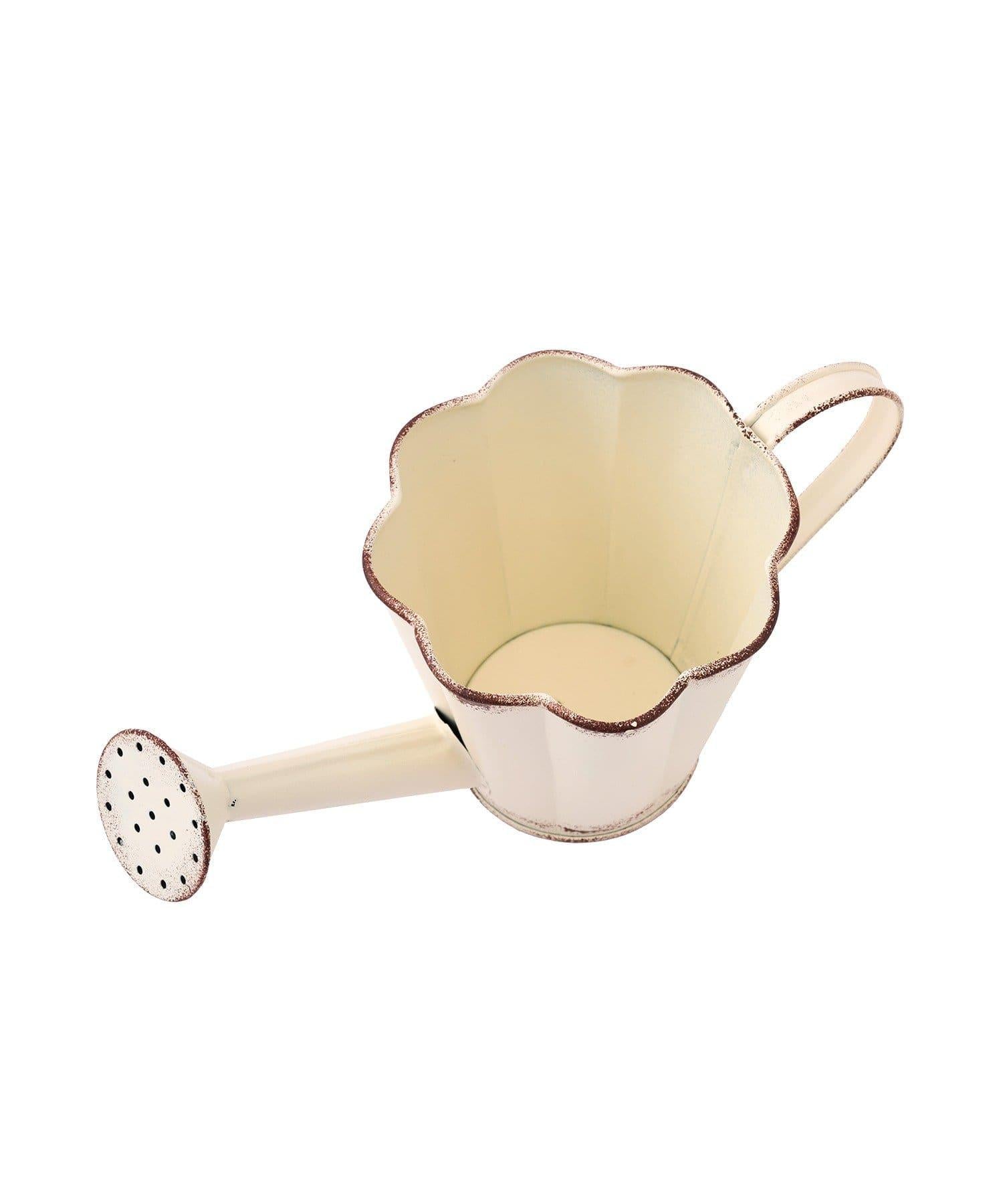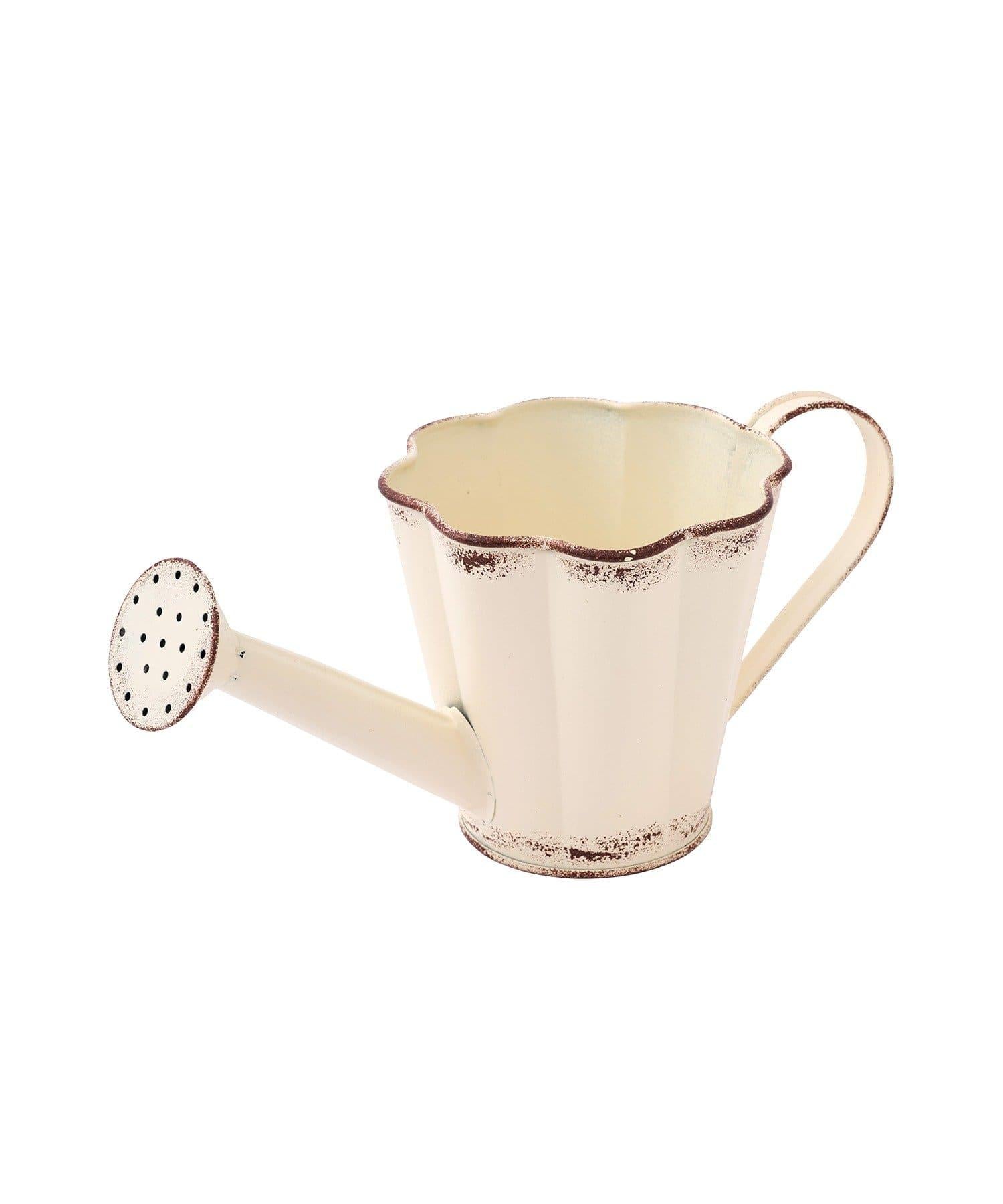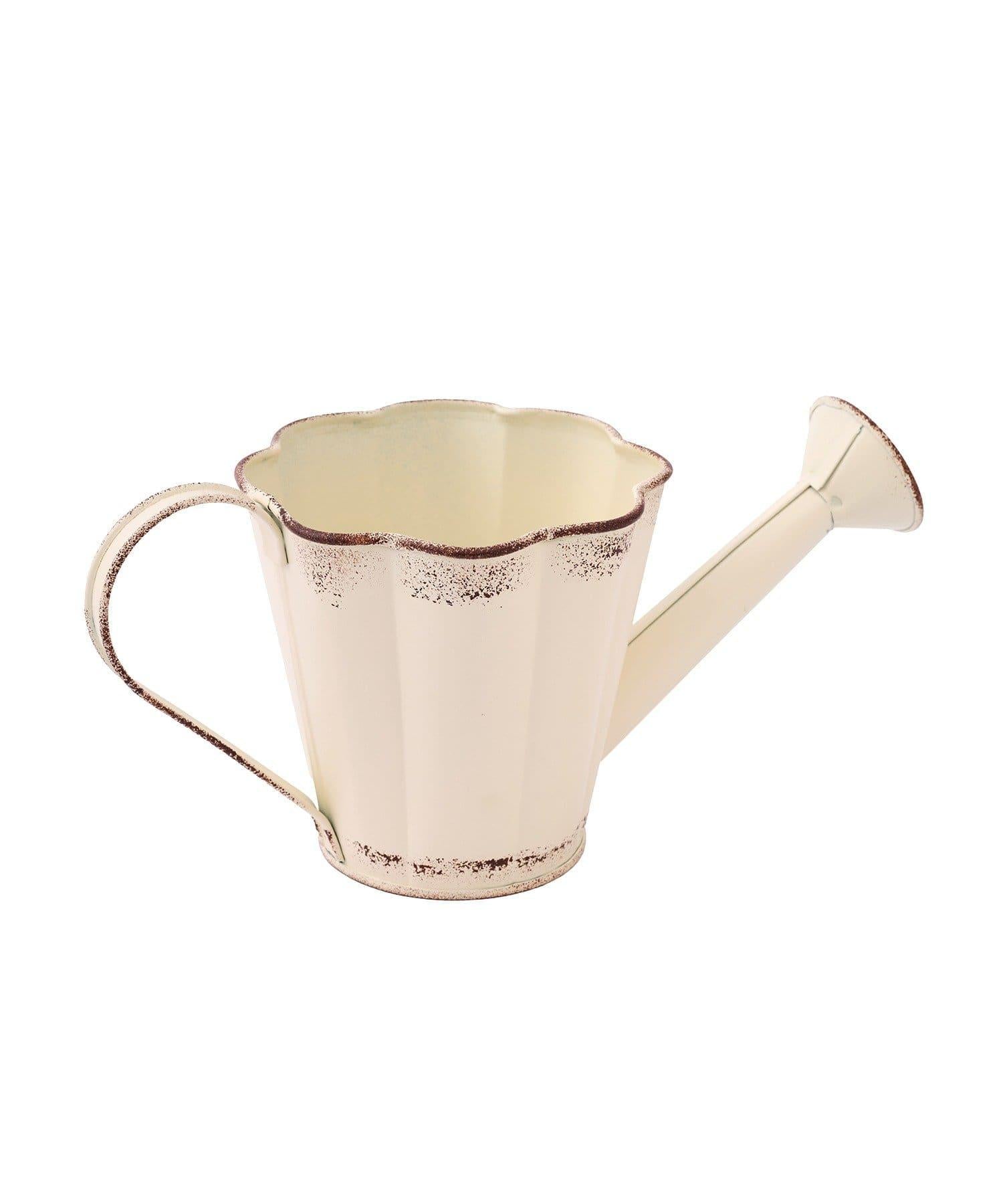 仿古錫罐形狀的花盆罩,象牙白的色調和破舊的漆面顯得格外柔和。