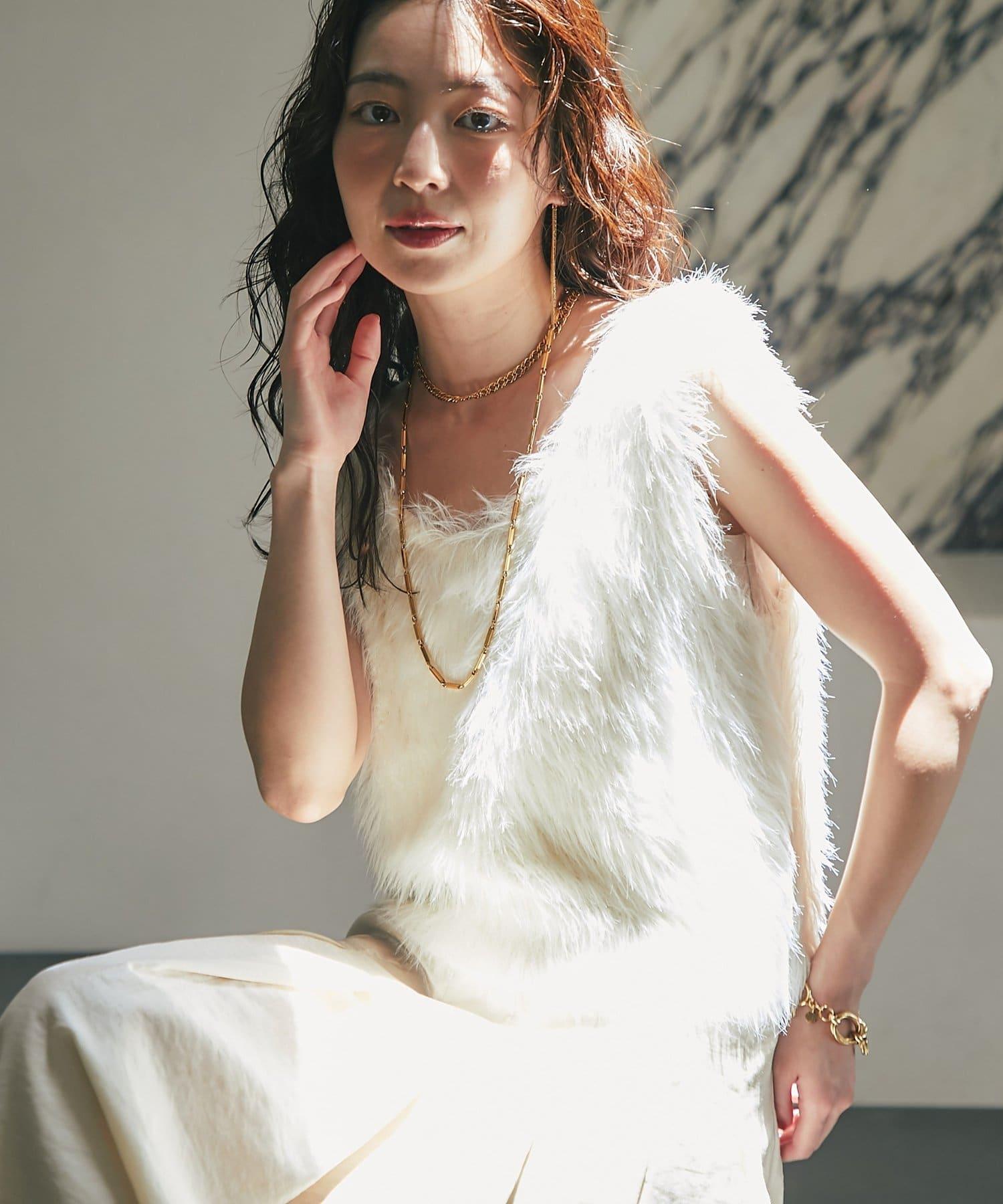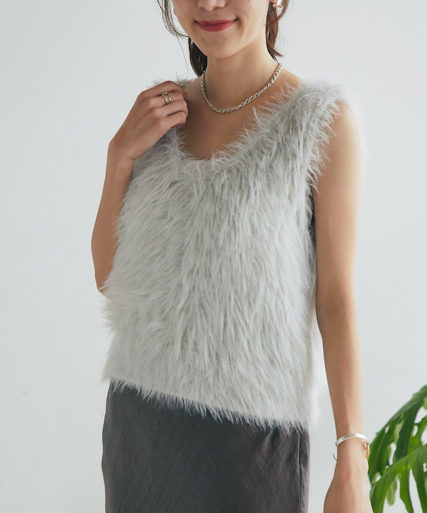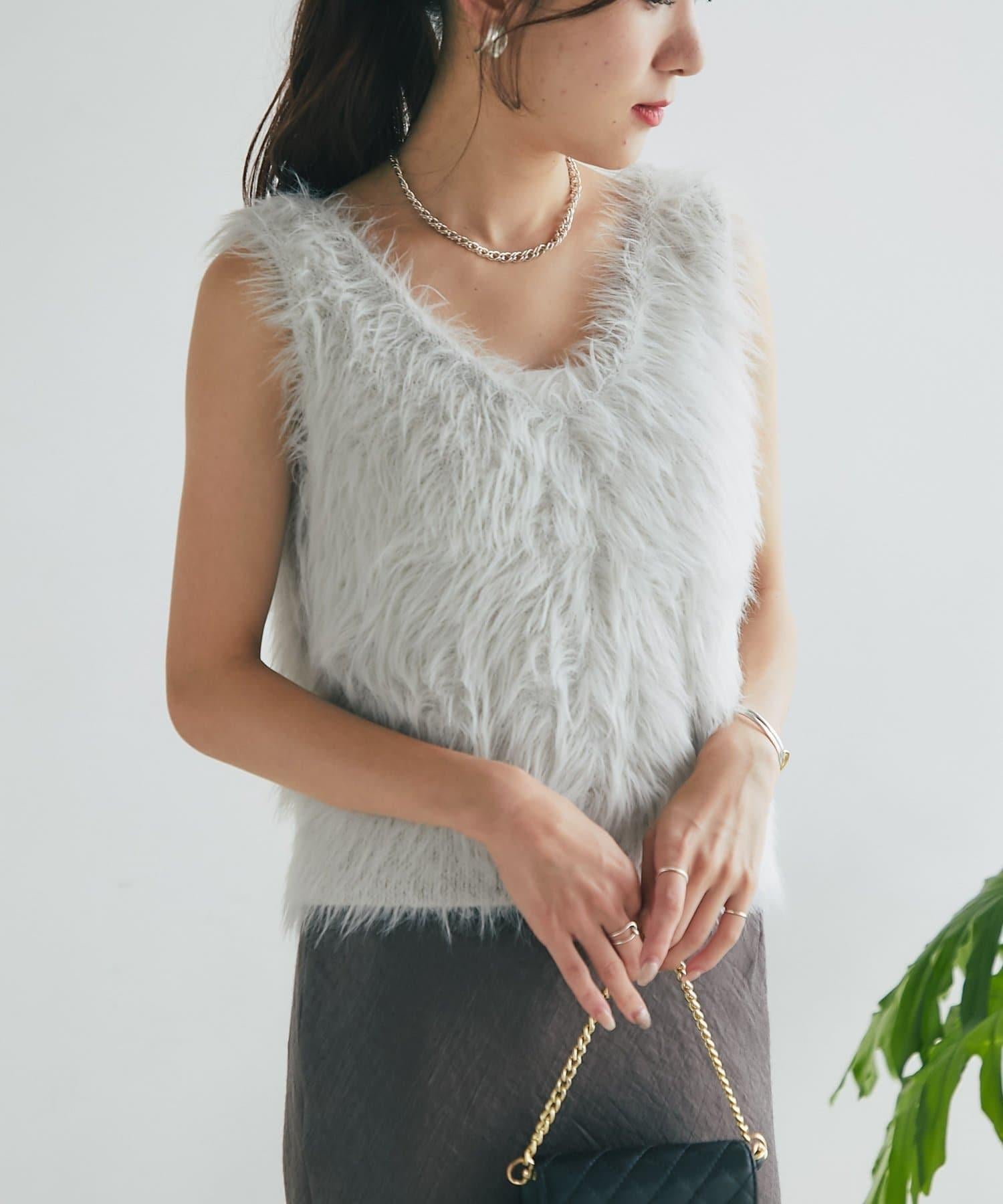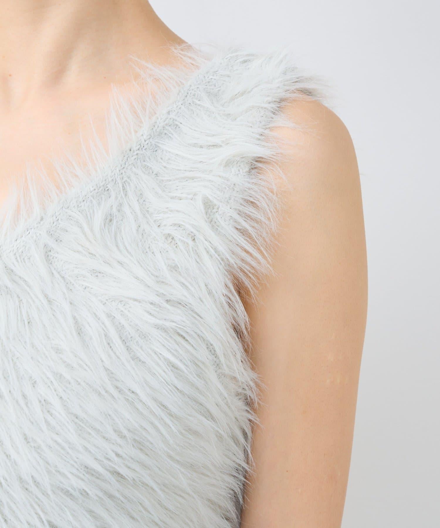 柔軟蓬鬆的針織馬甲,採用搶眼的長毛羽毛材質。
