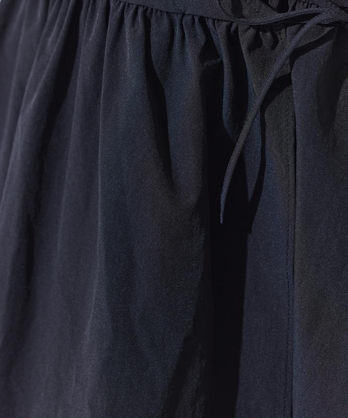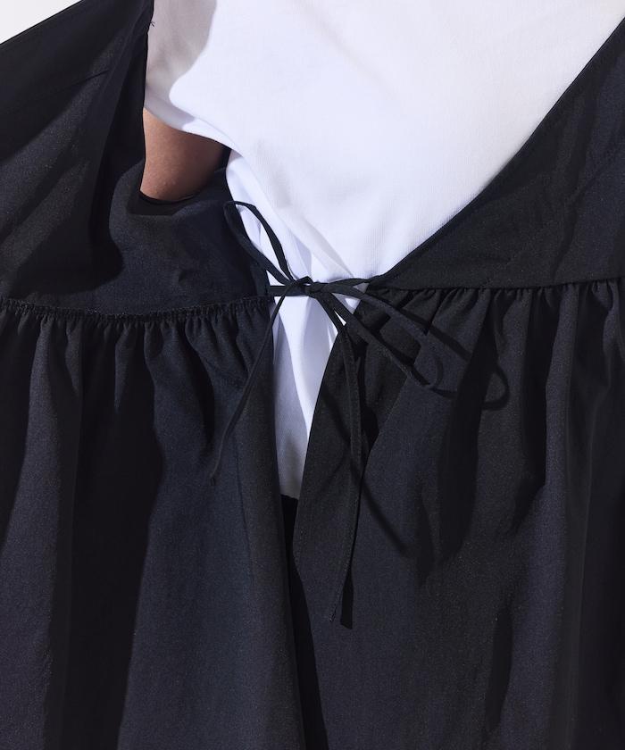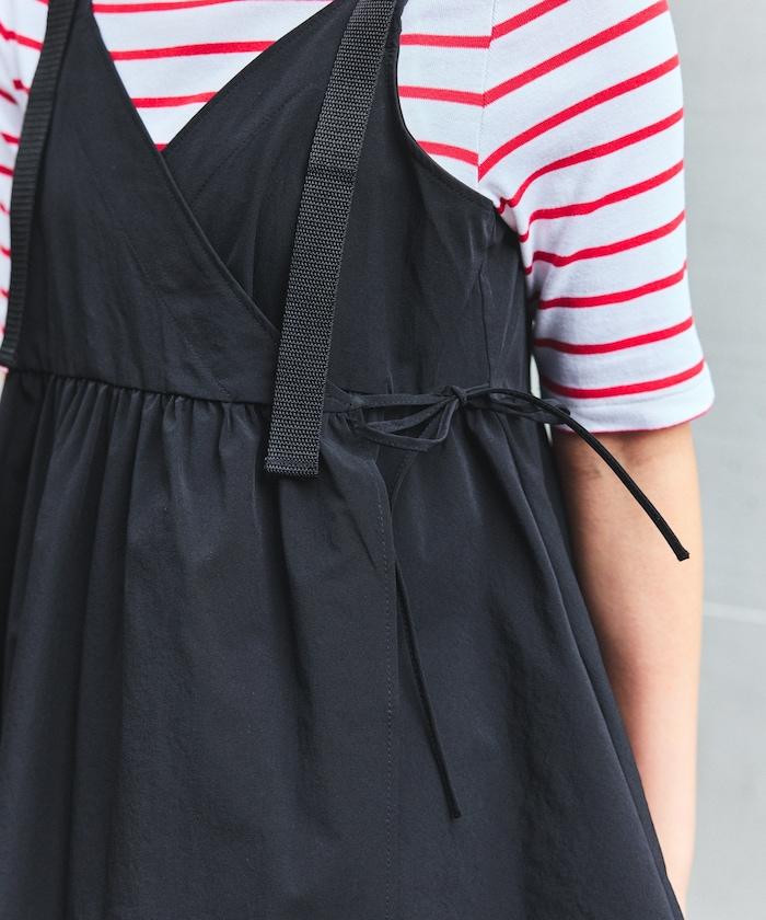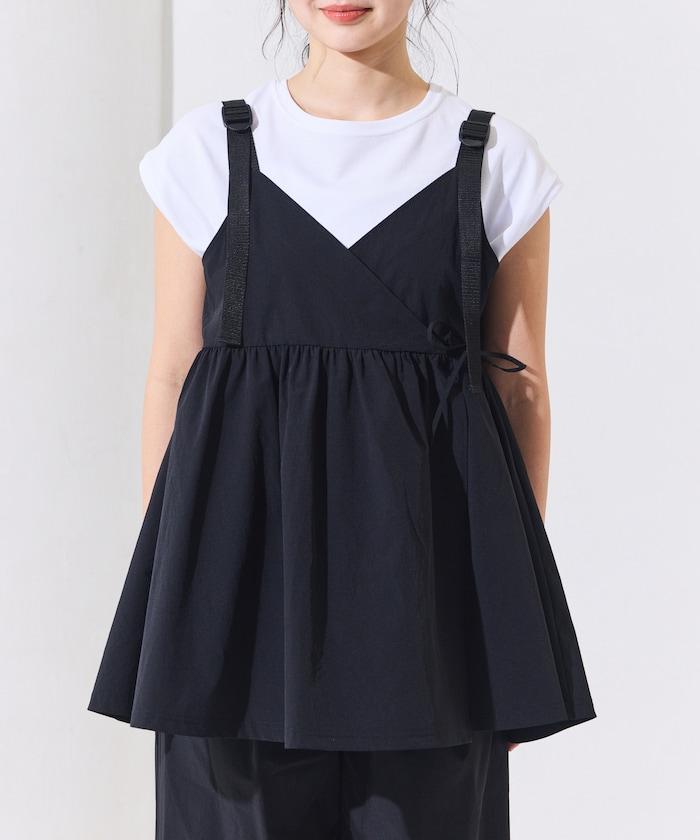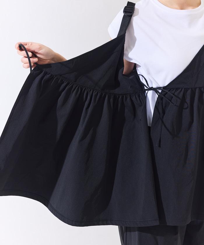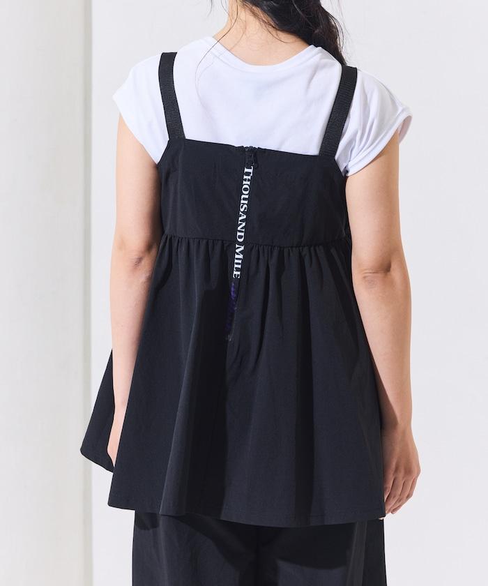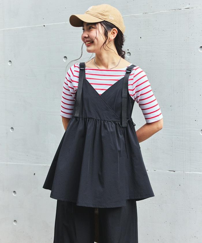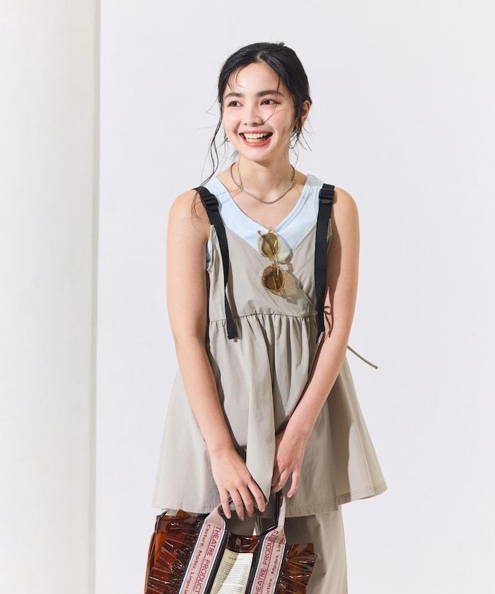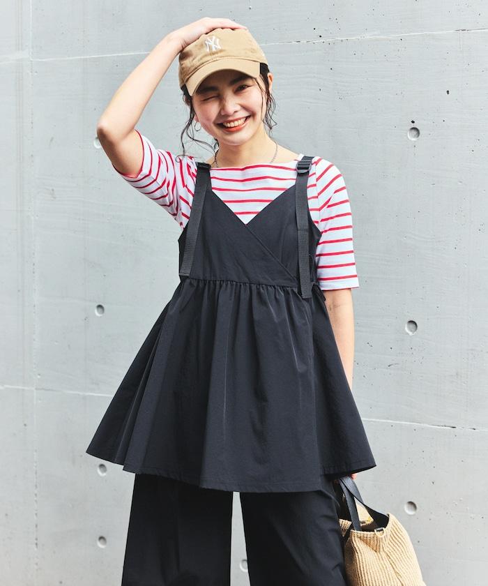 吊帶上衣的長度剛好垂在臀部,起到微妙的遮蓋身材效果,而帶有動感的喇叭廓形則自然地勾勒出腰部線條。