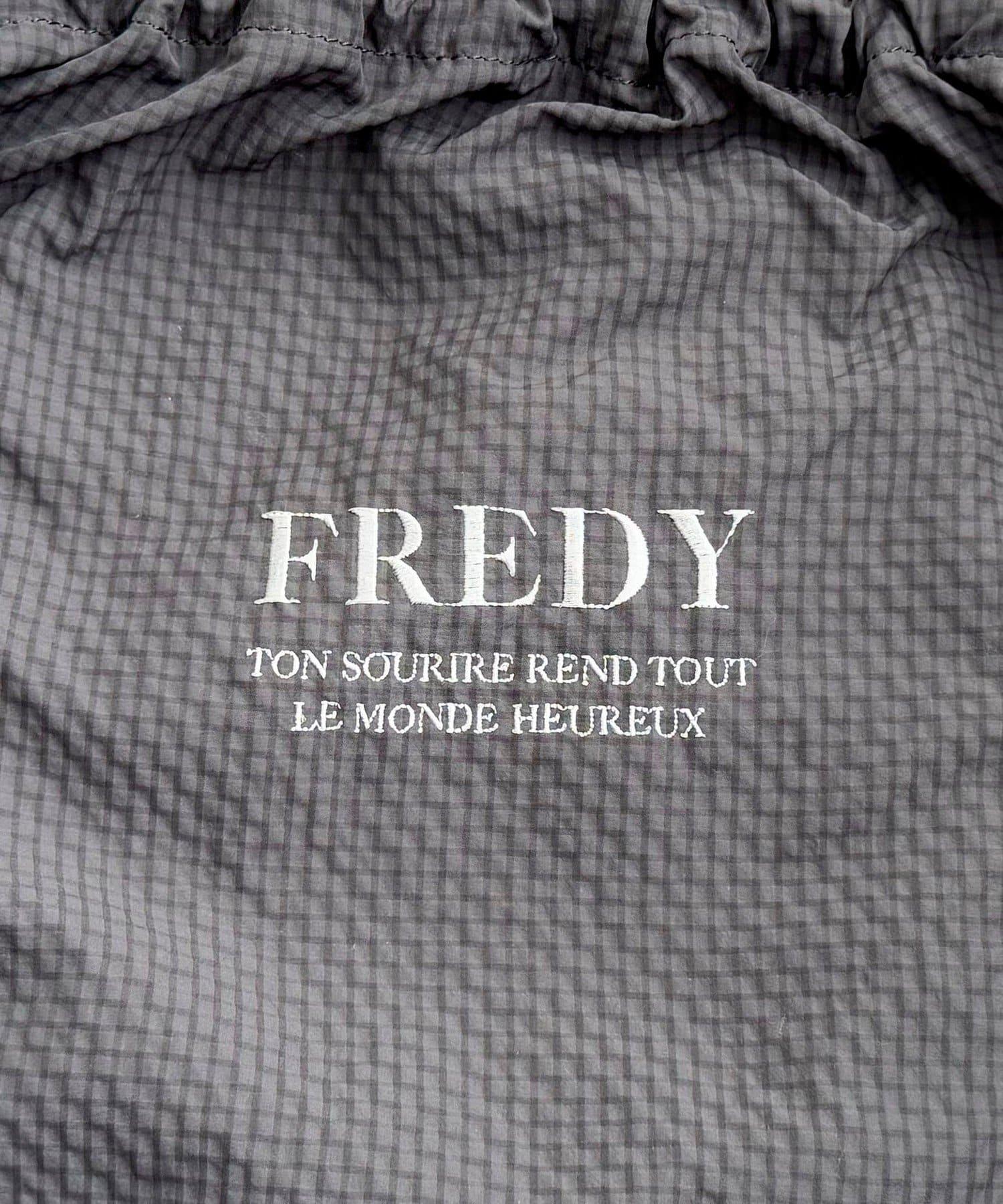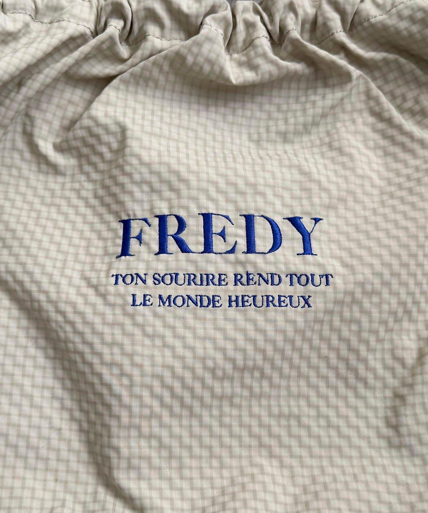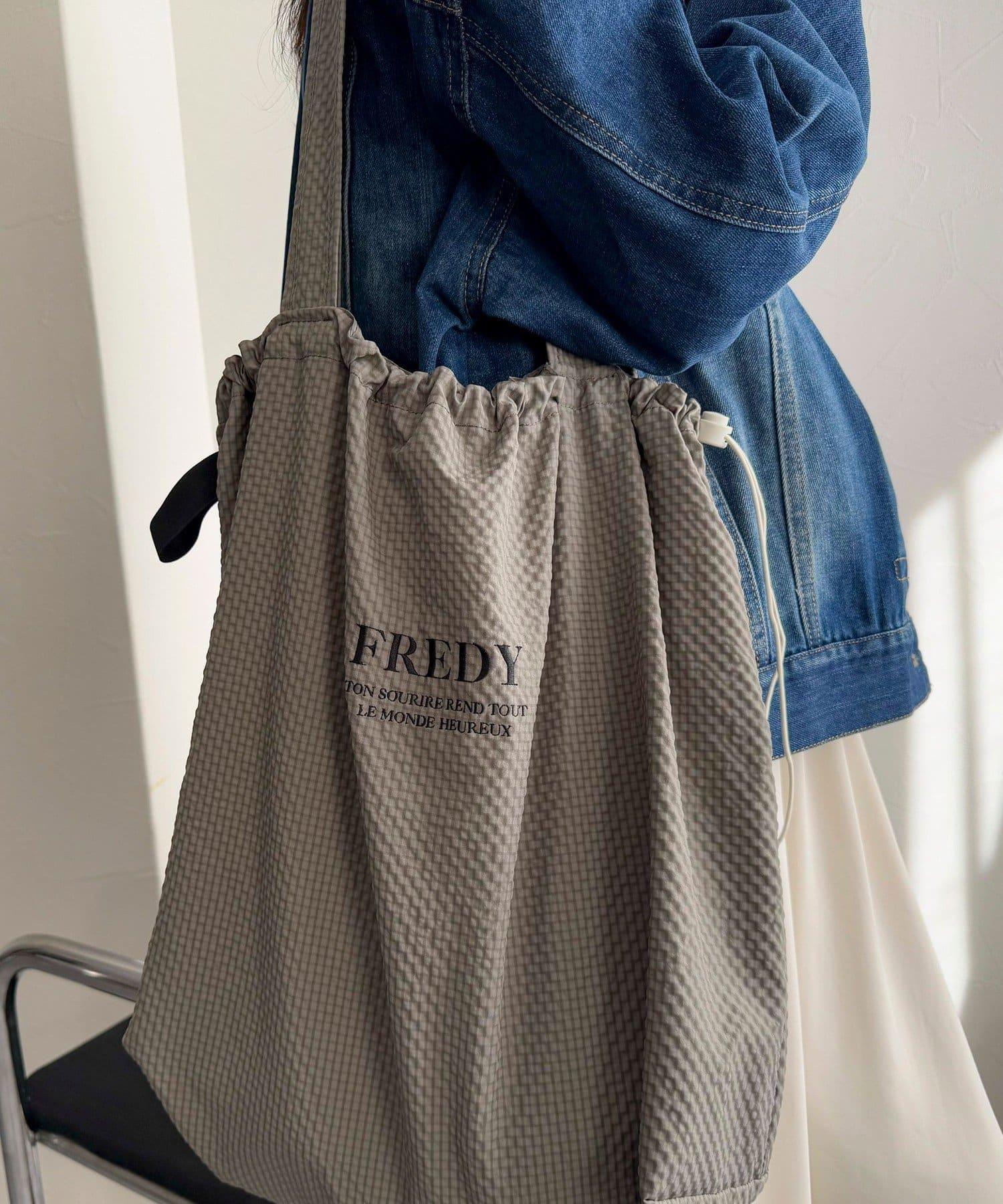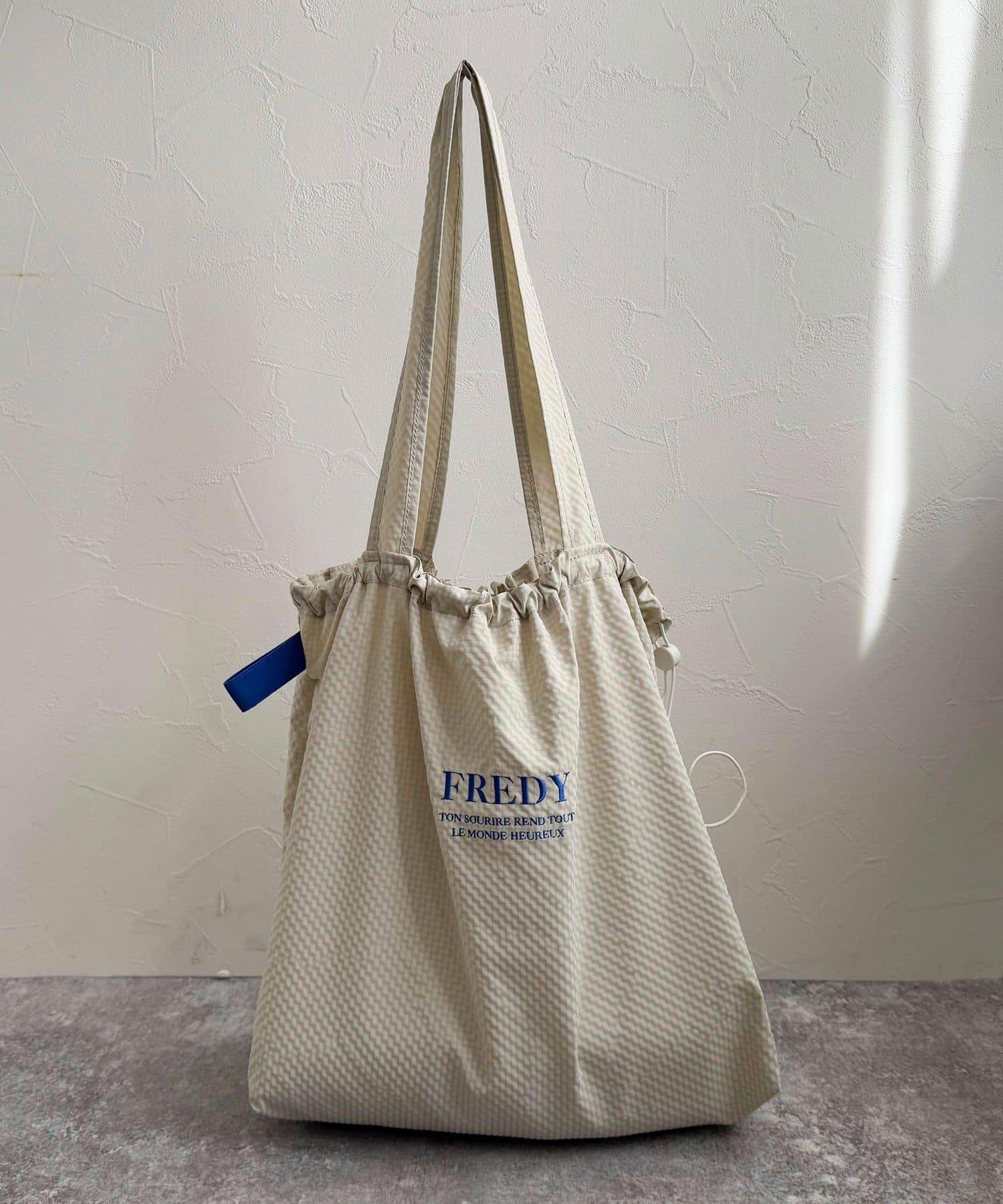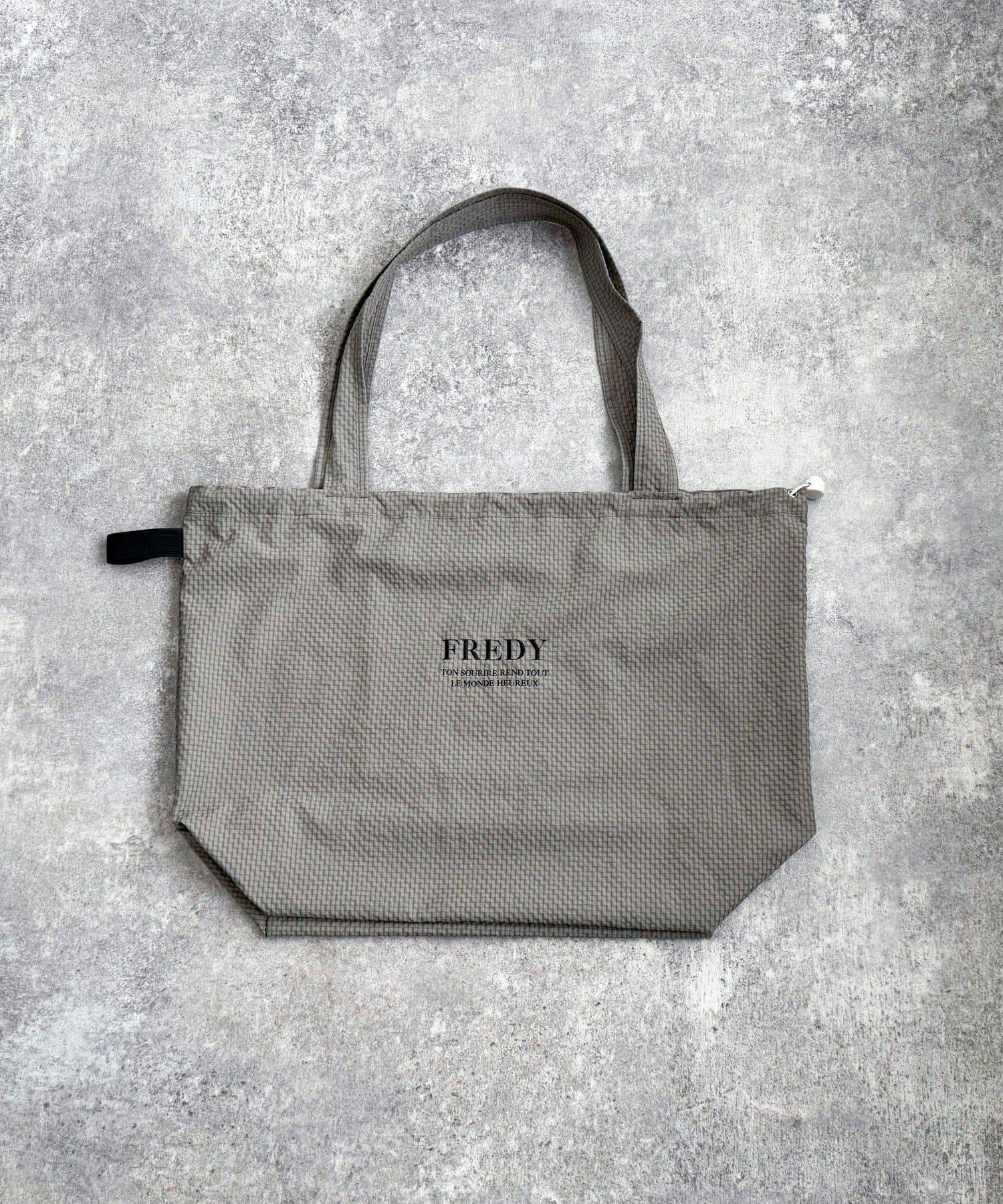 這是一款便於日常使用的手提包,格紋面料上繡有 FREDY 字樣。