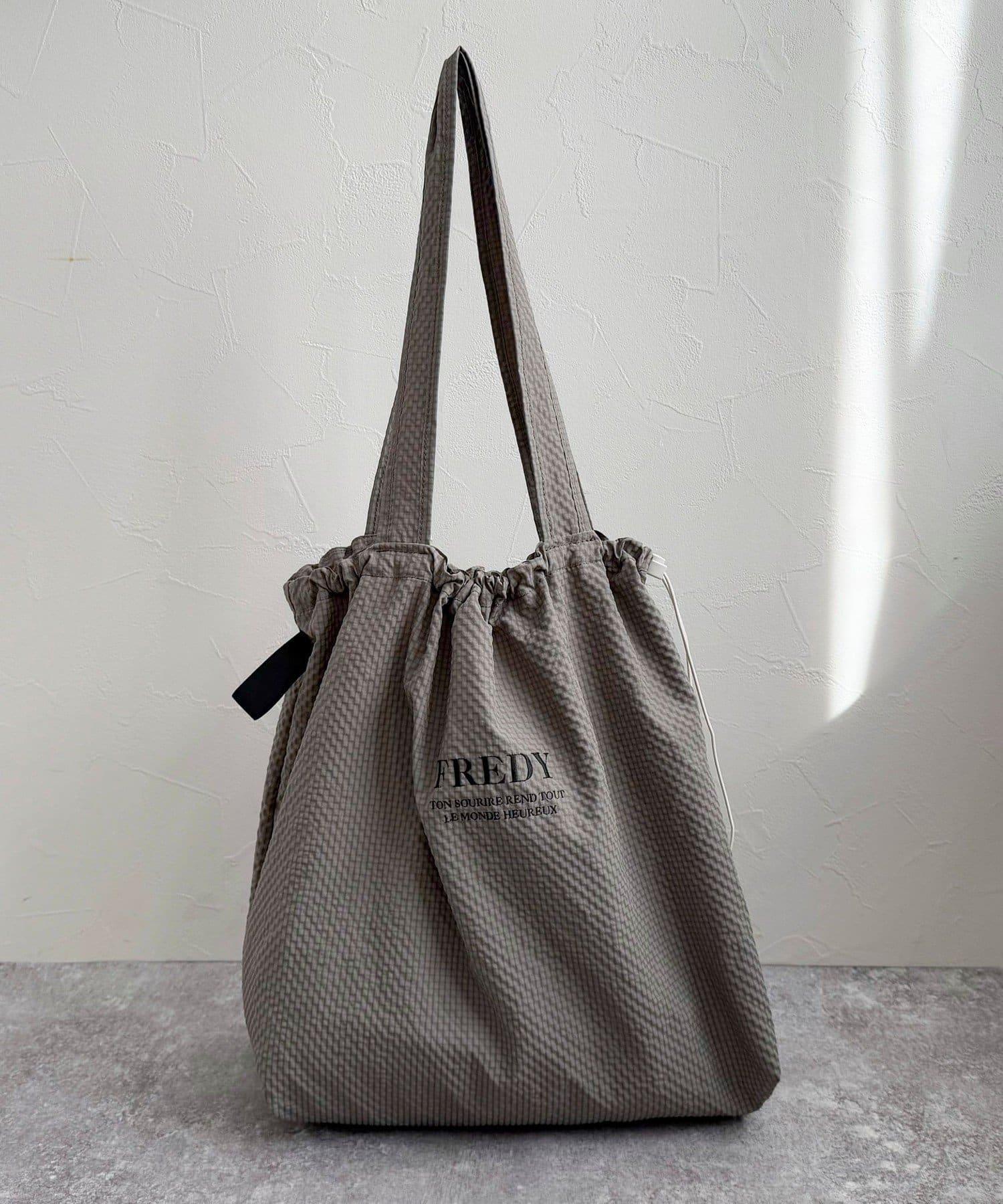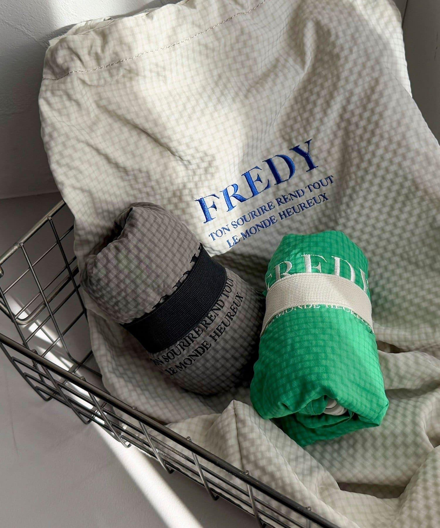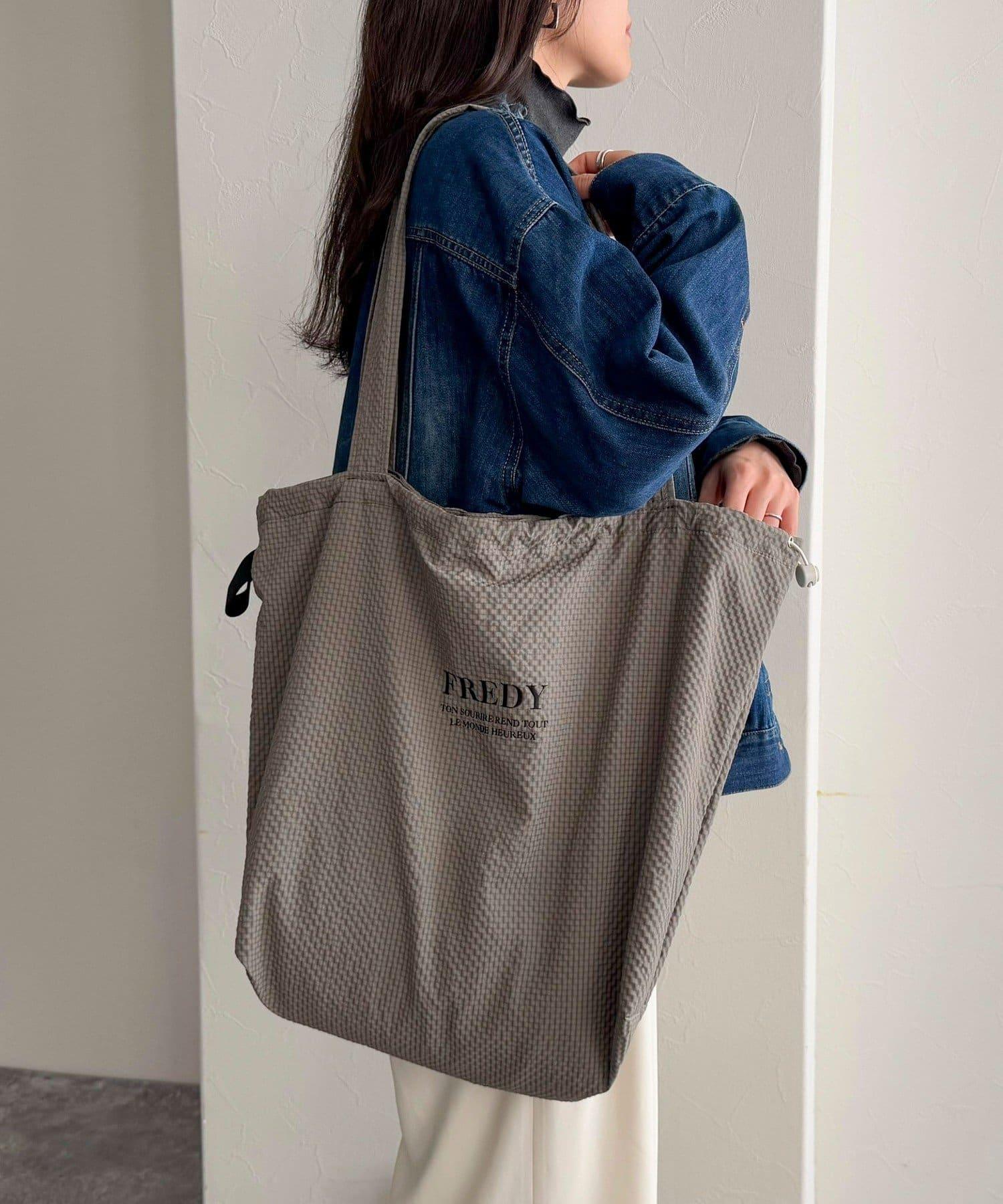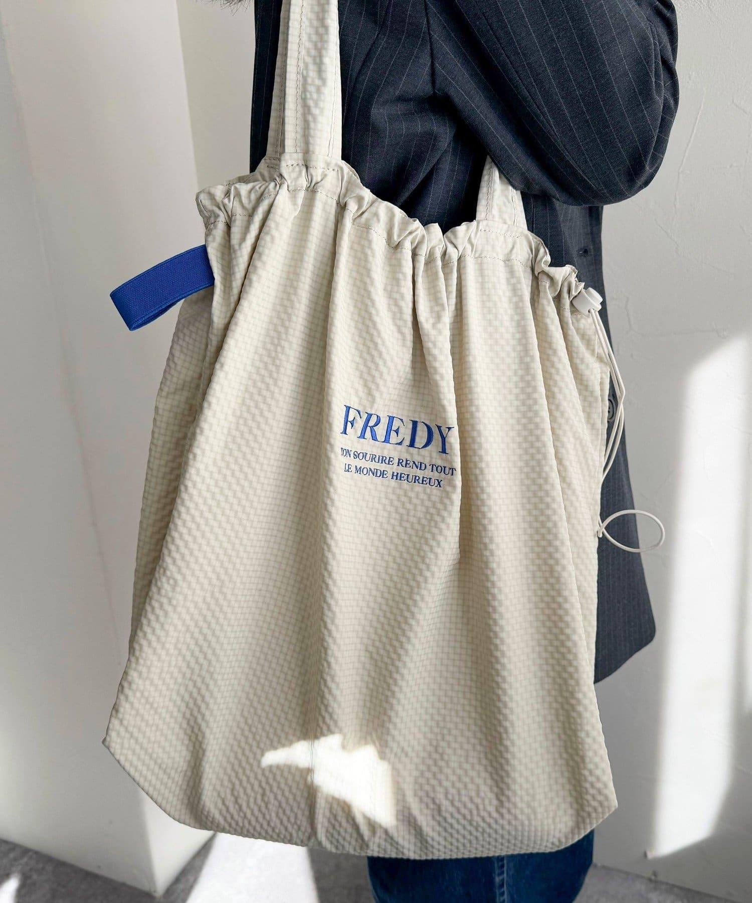 這是一款便於日常使用的手提包,格紋面料上繡有 FREDY 字樣。
