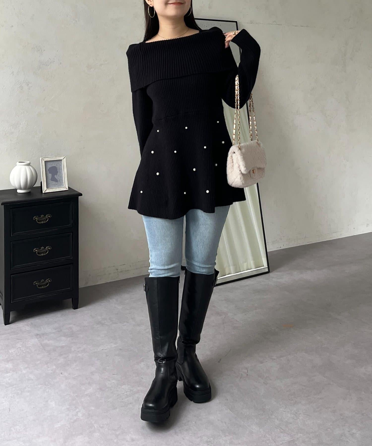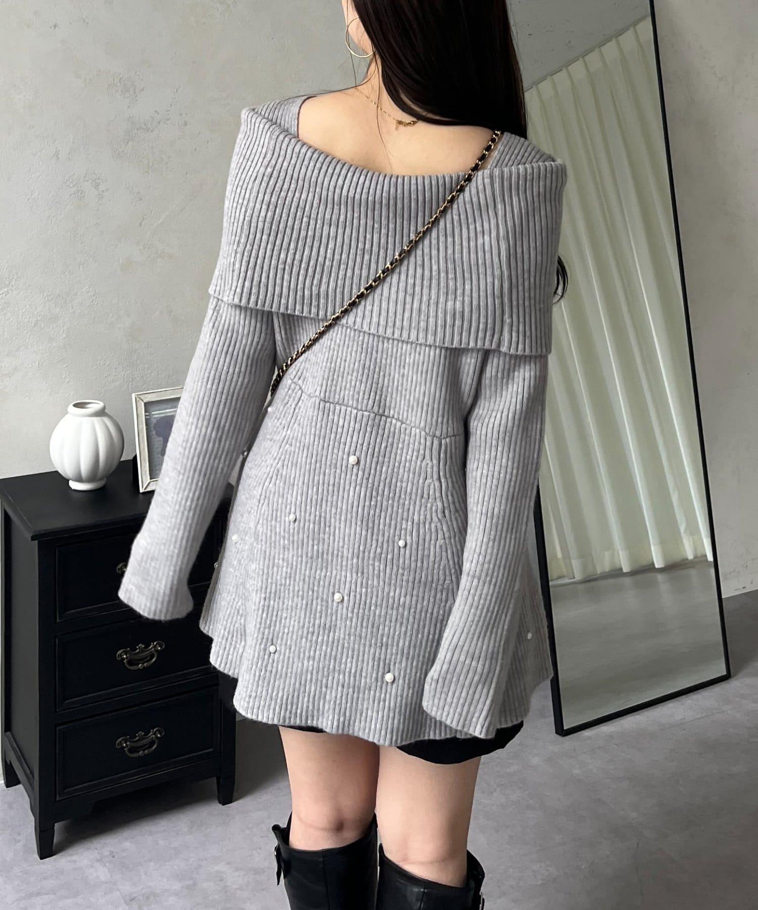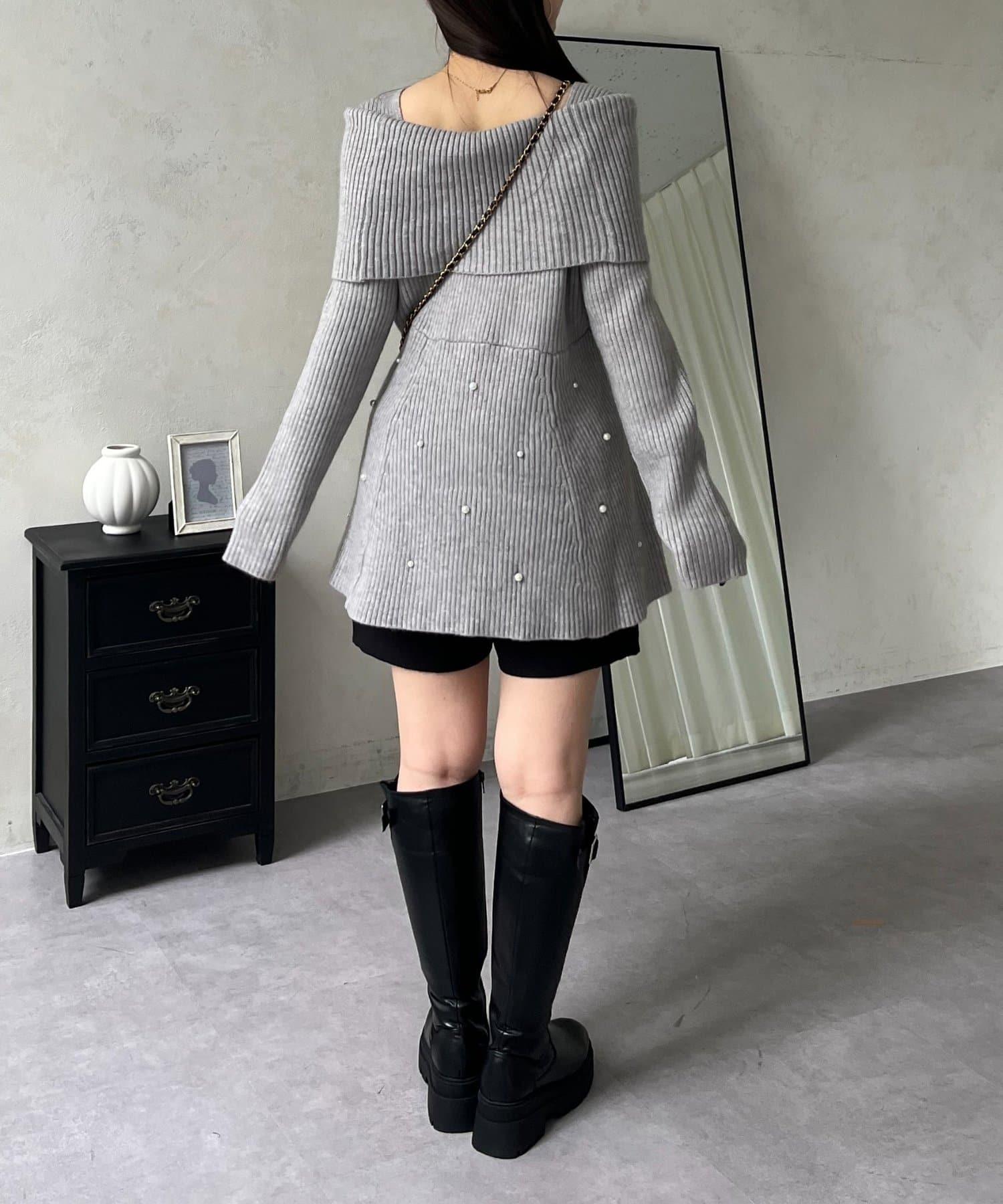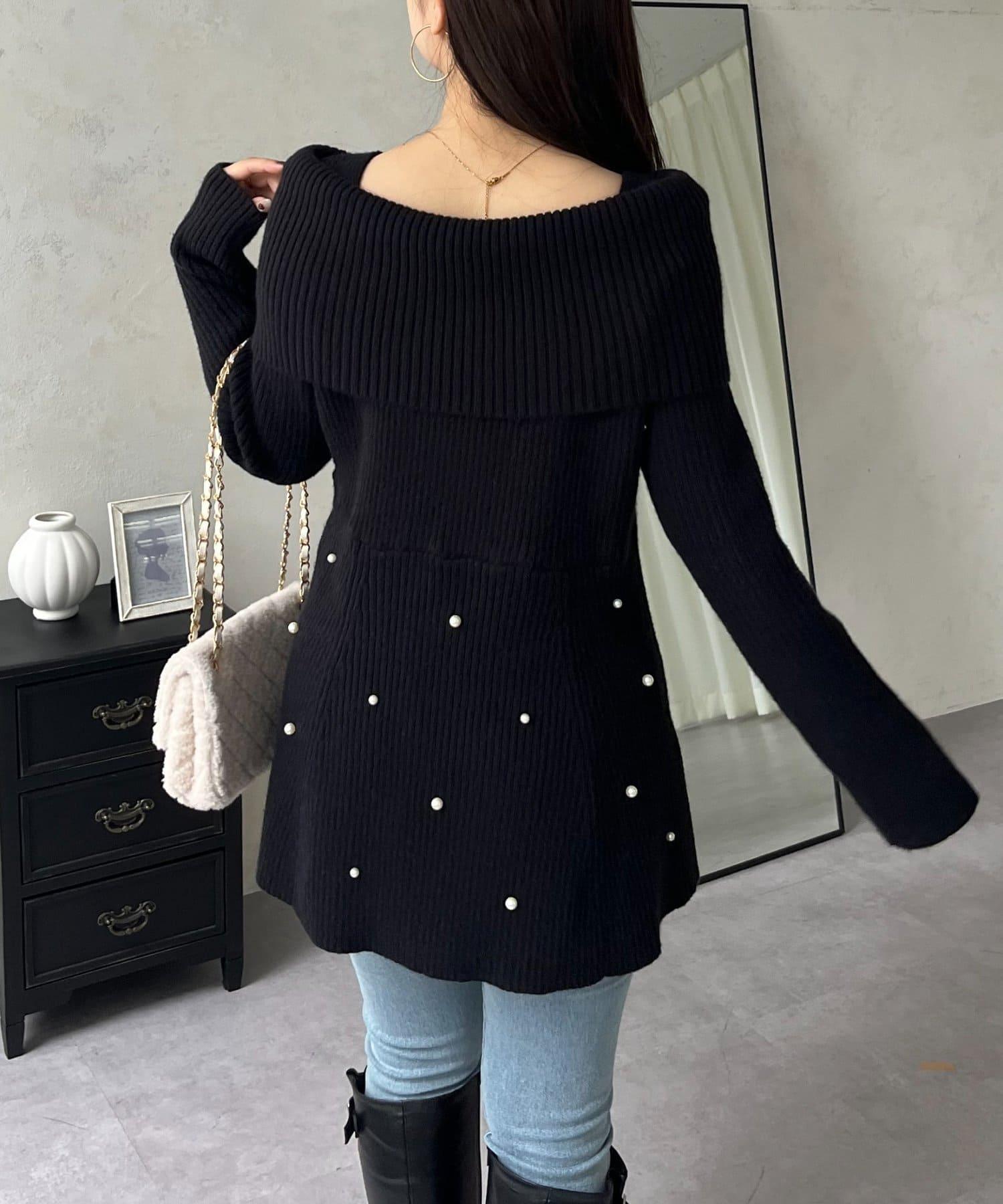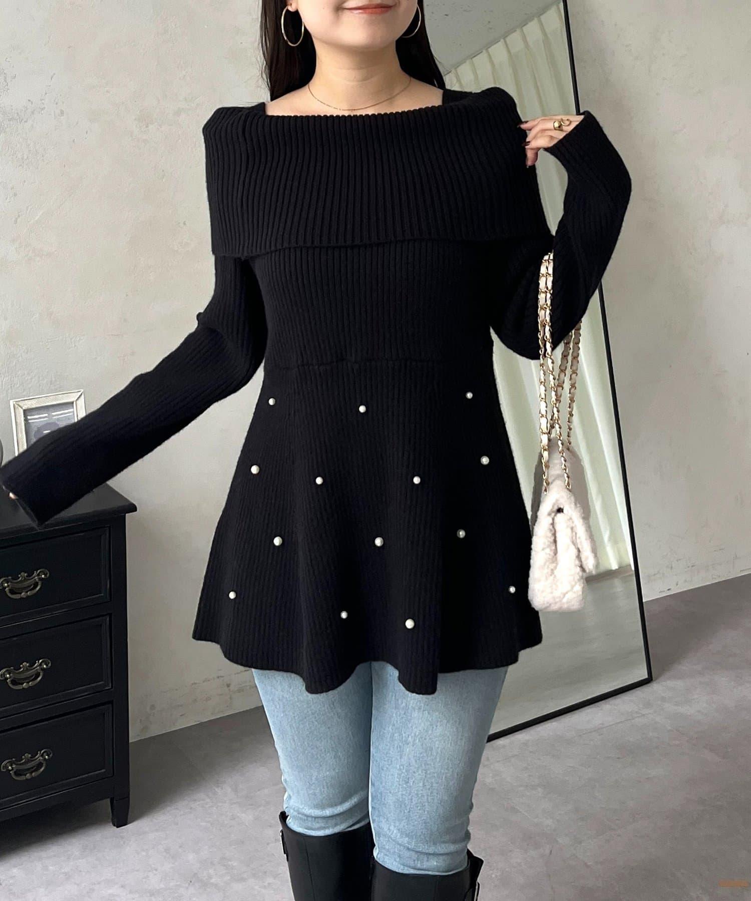 【防靜電】下襬珍珠一字肩荷葉邊針織衫