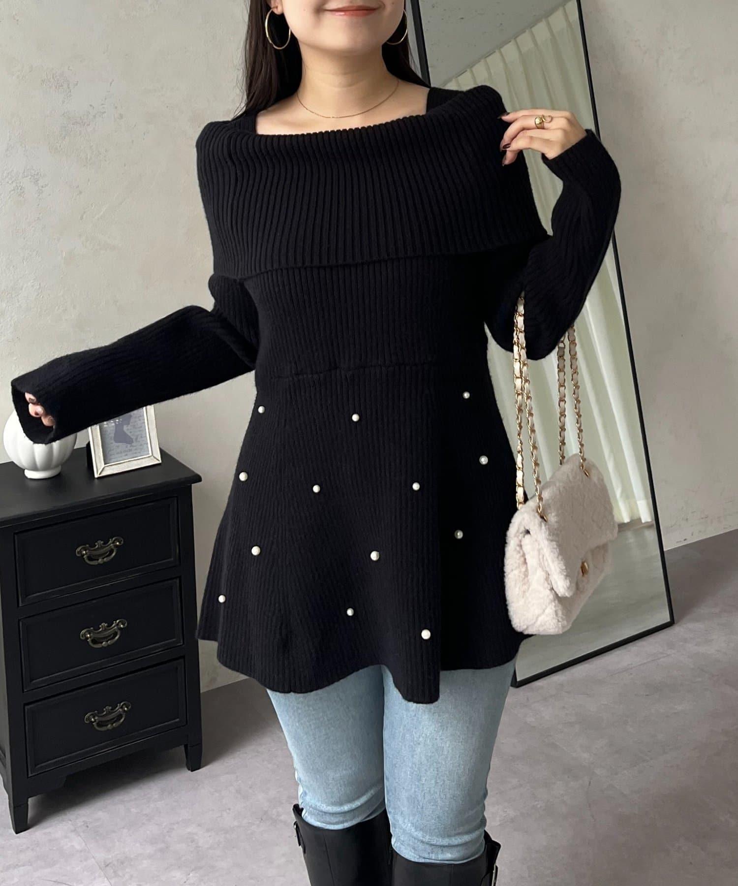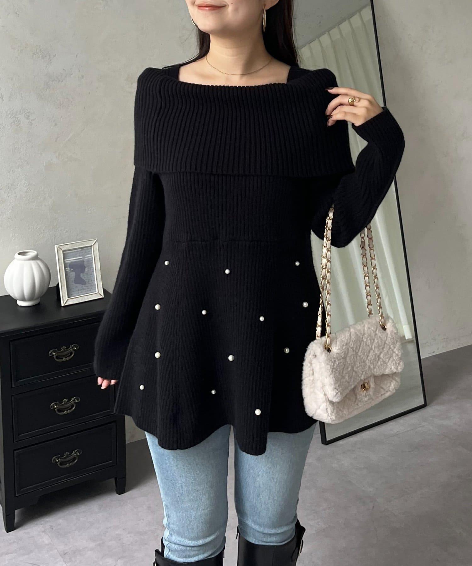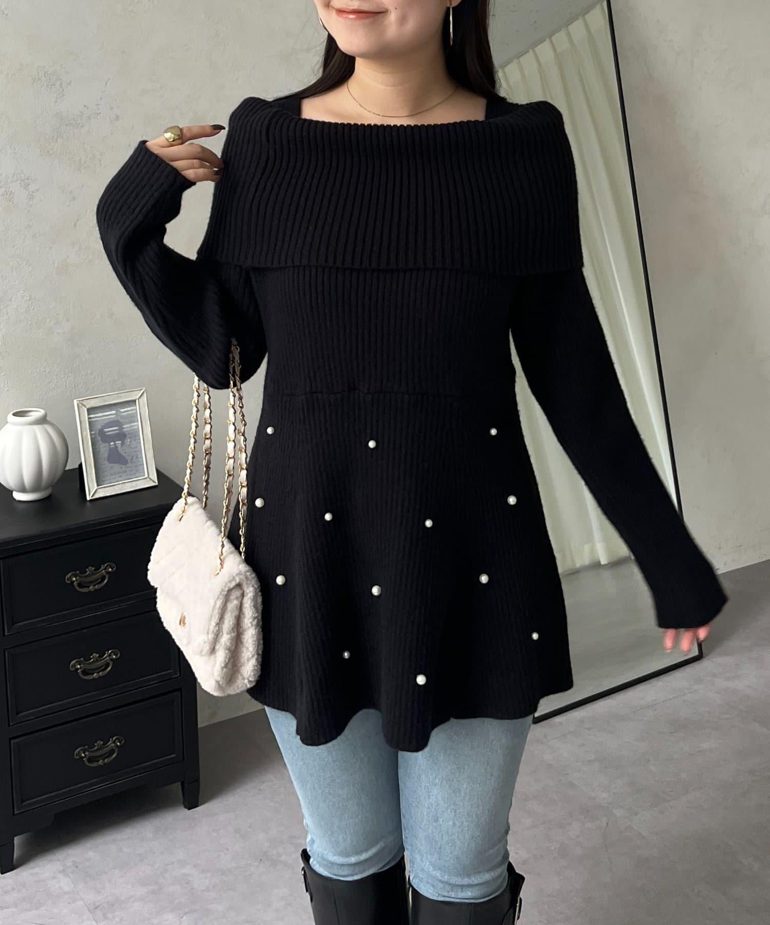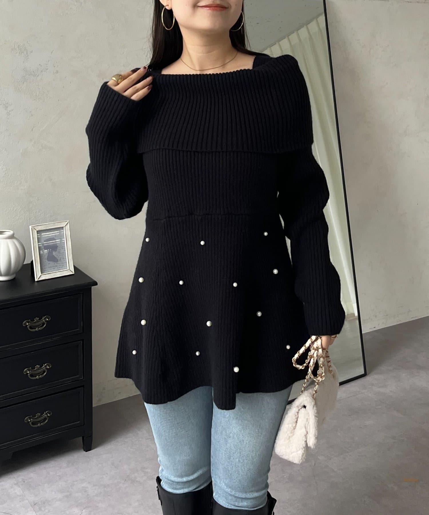 【防靜電】下襬珍珠一字肩荷葉邊針織衫