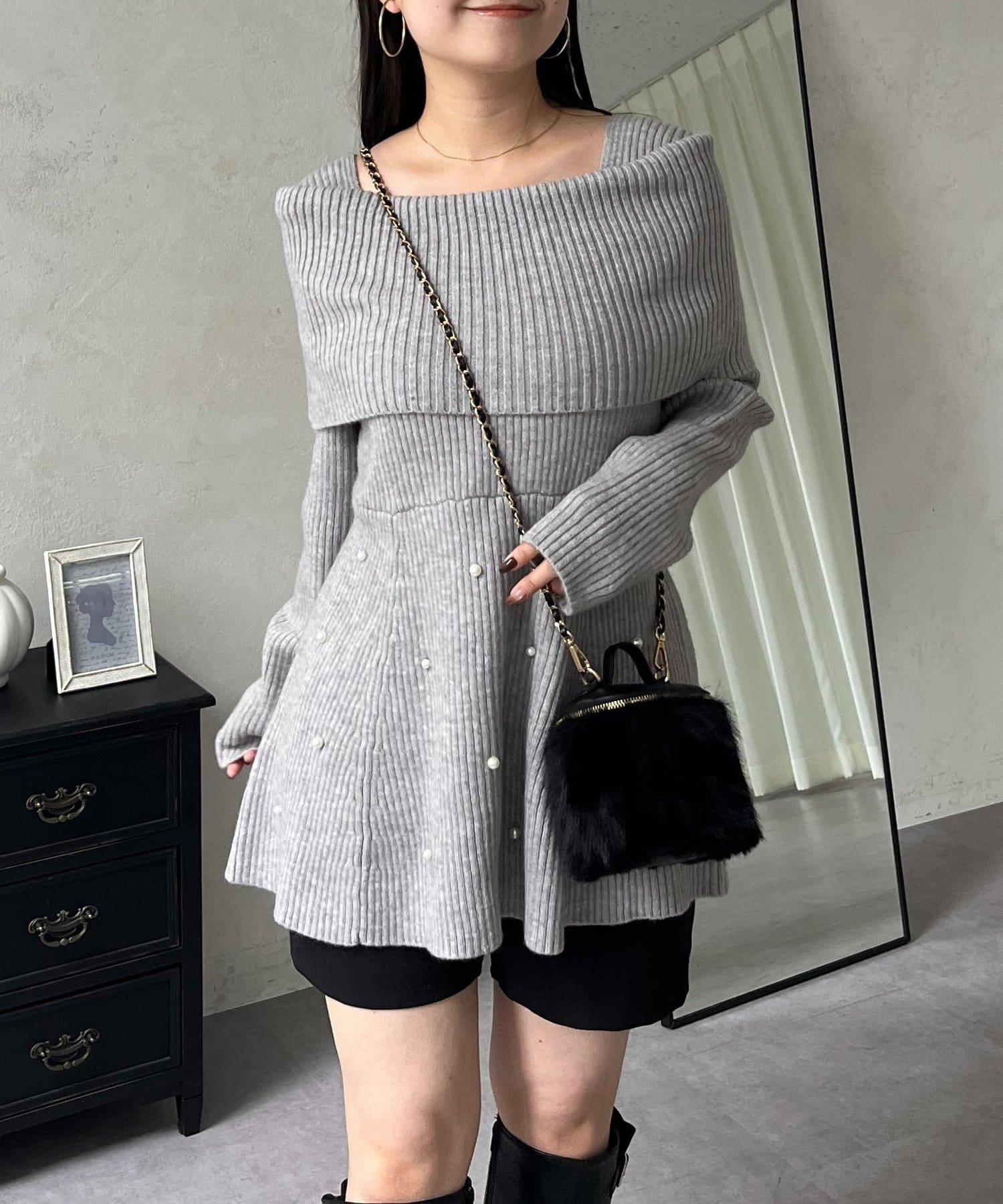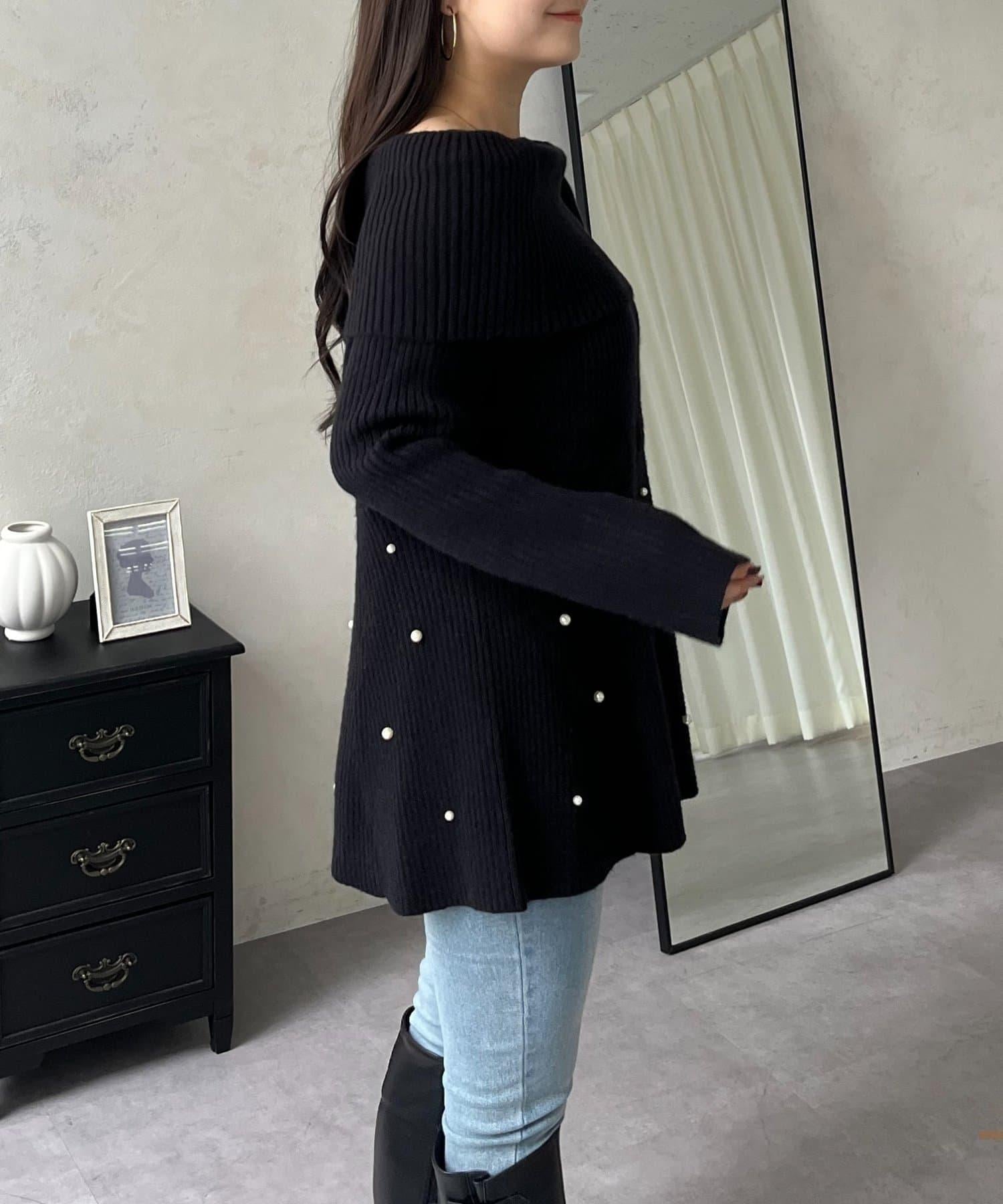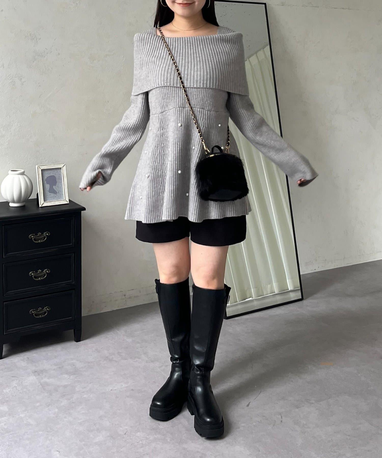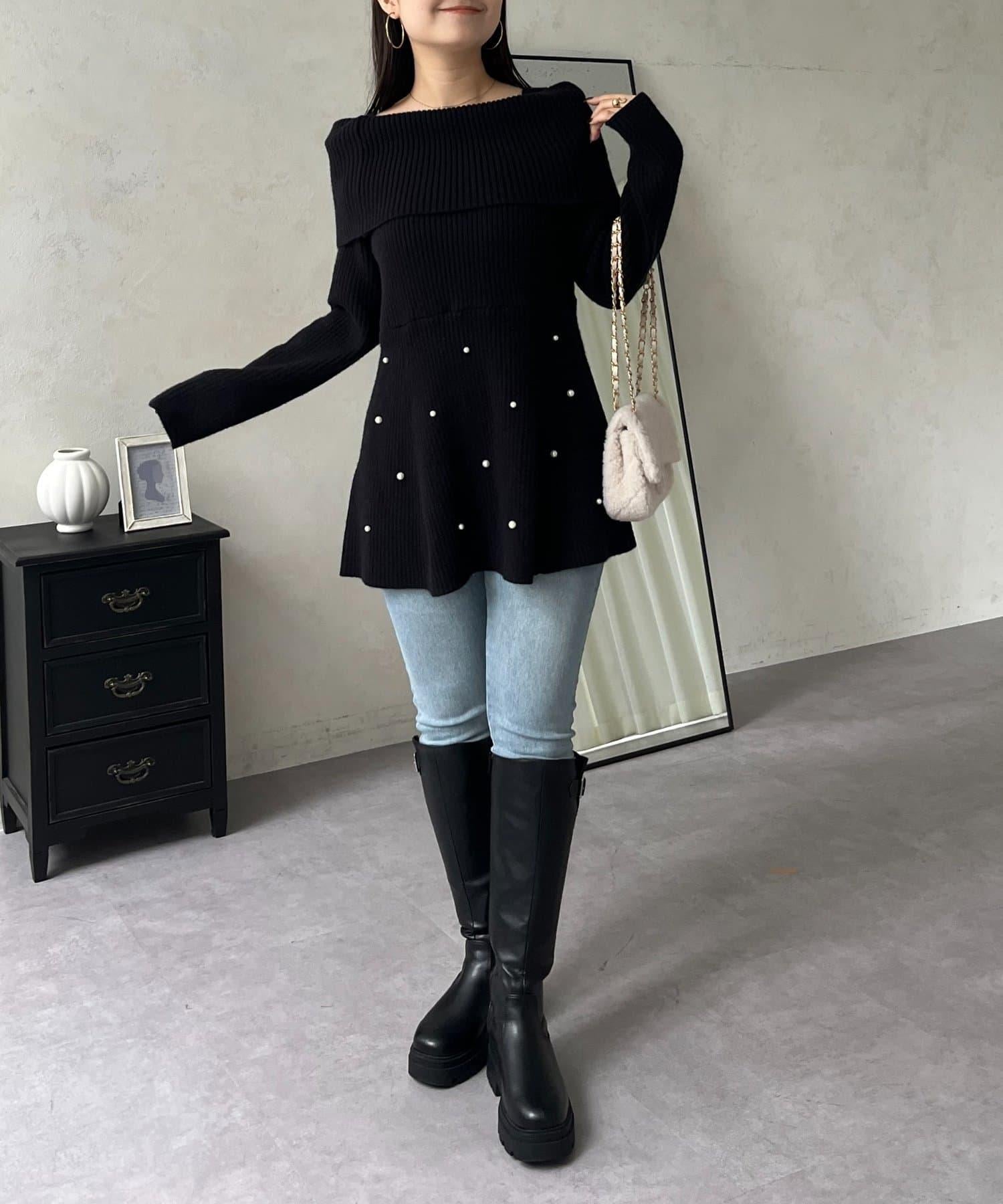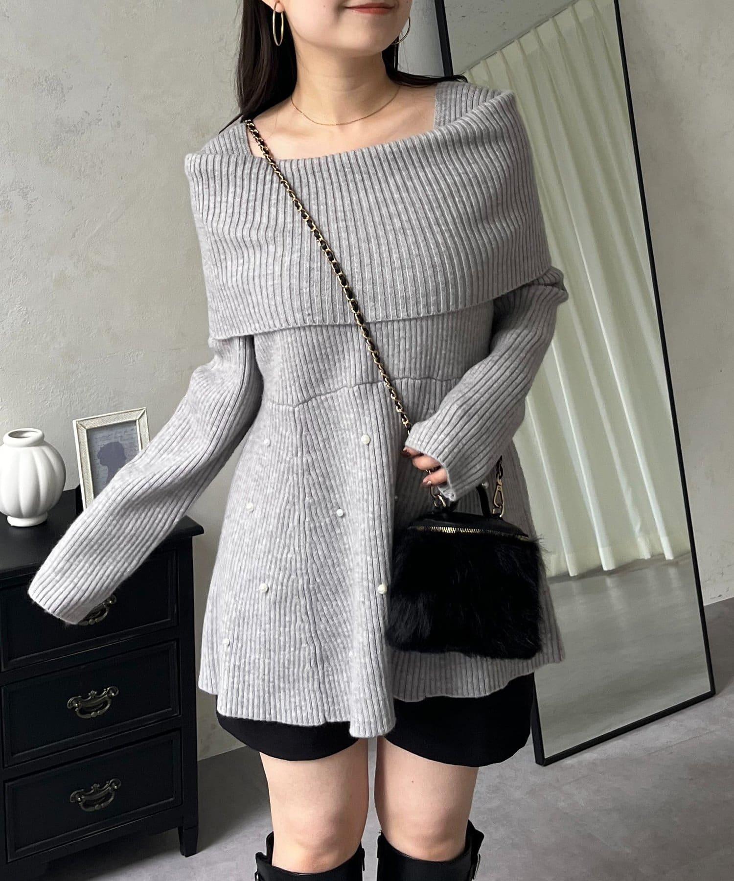 【防靜電】下襬珍珠一字肩荷葉邊針織衫