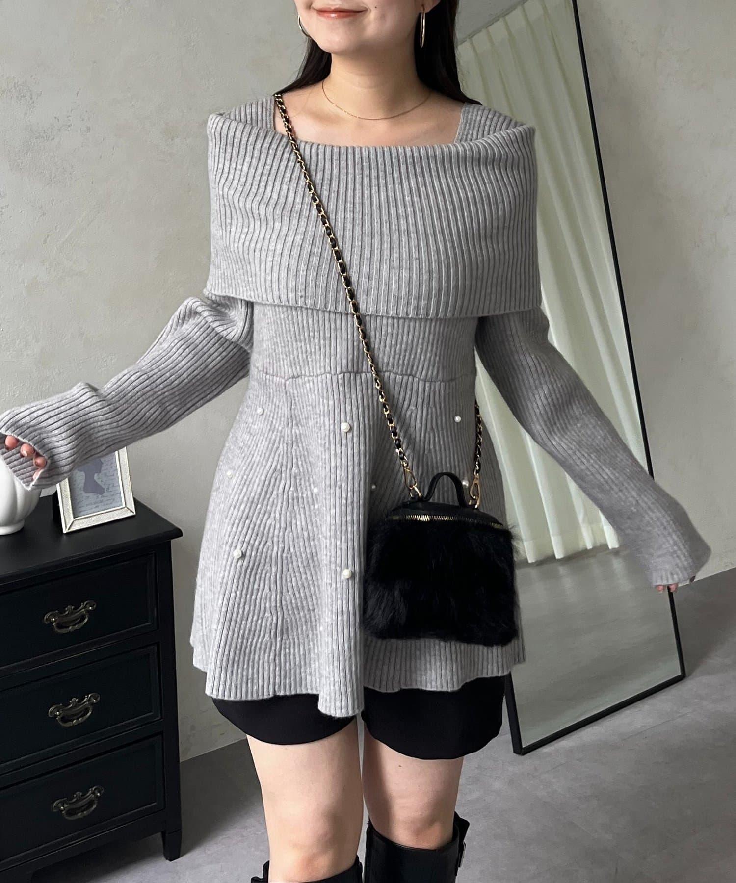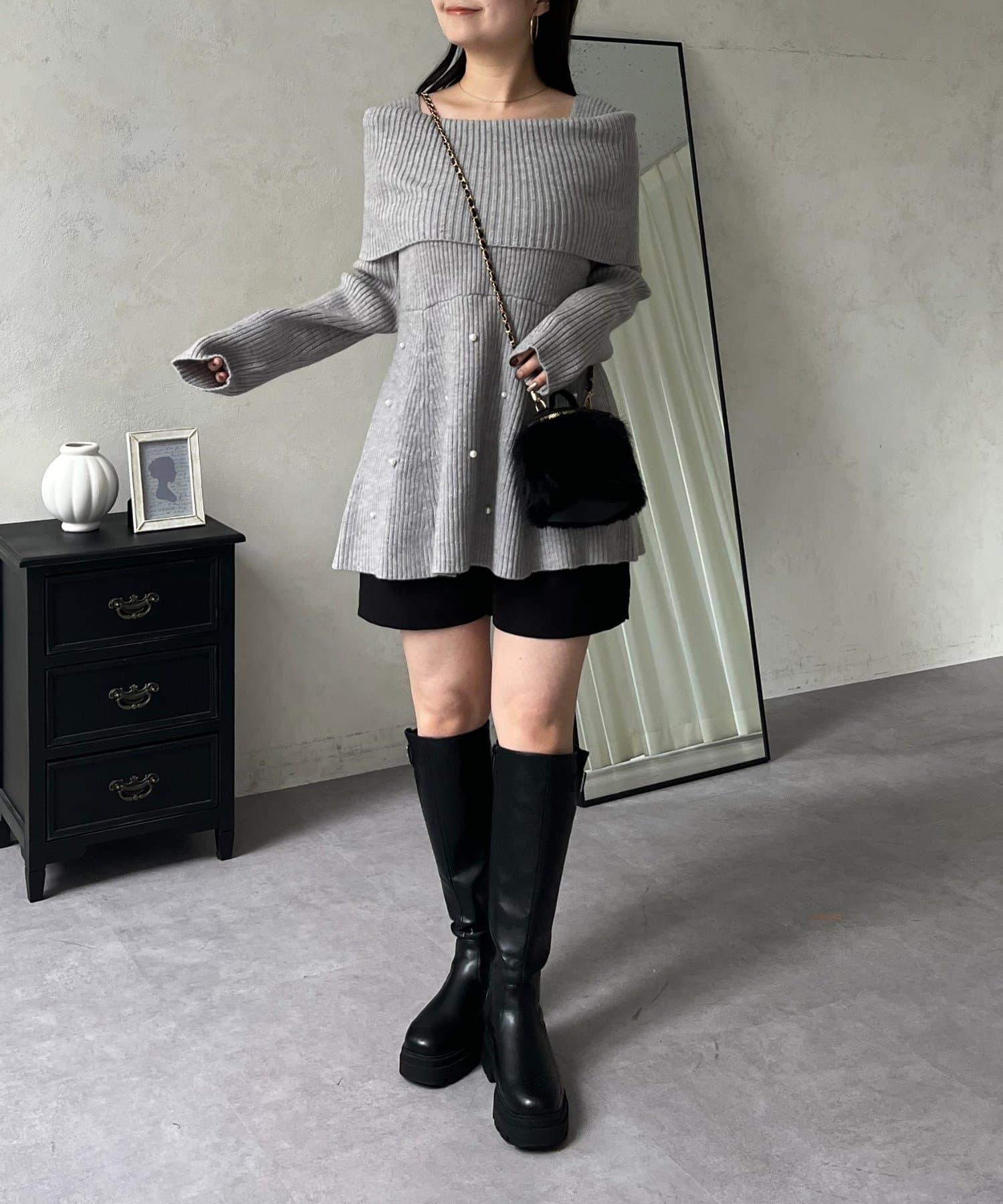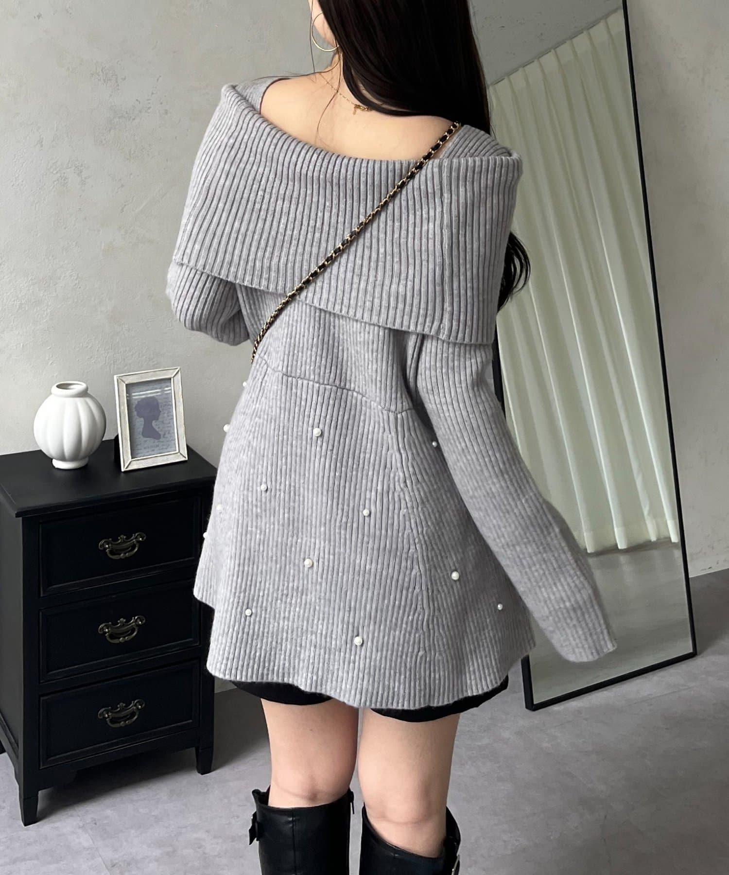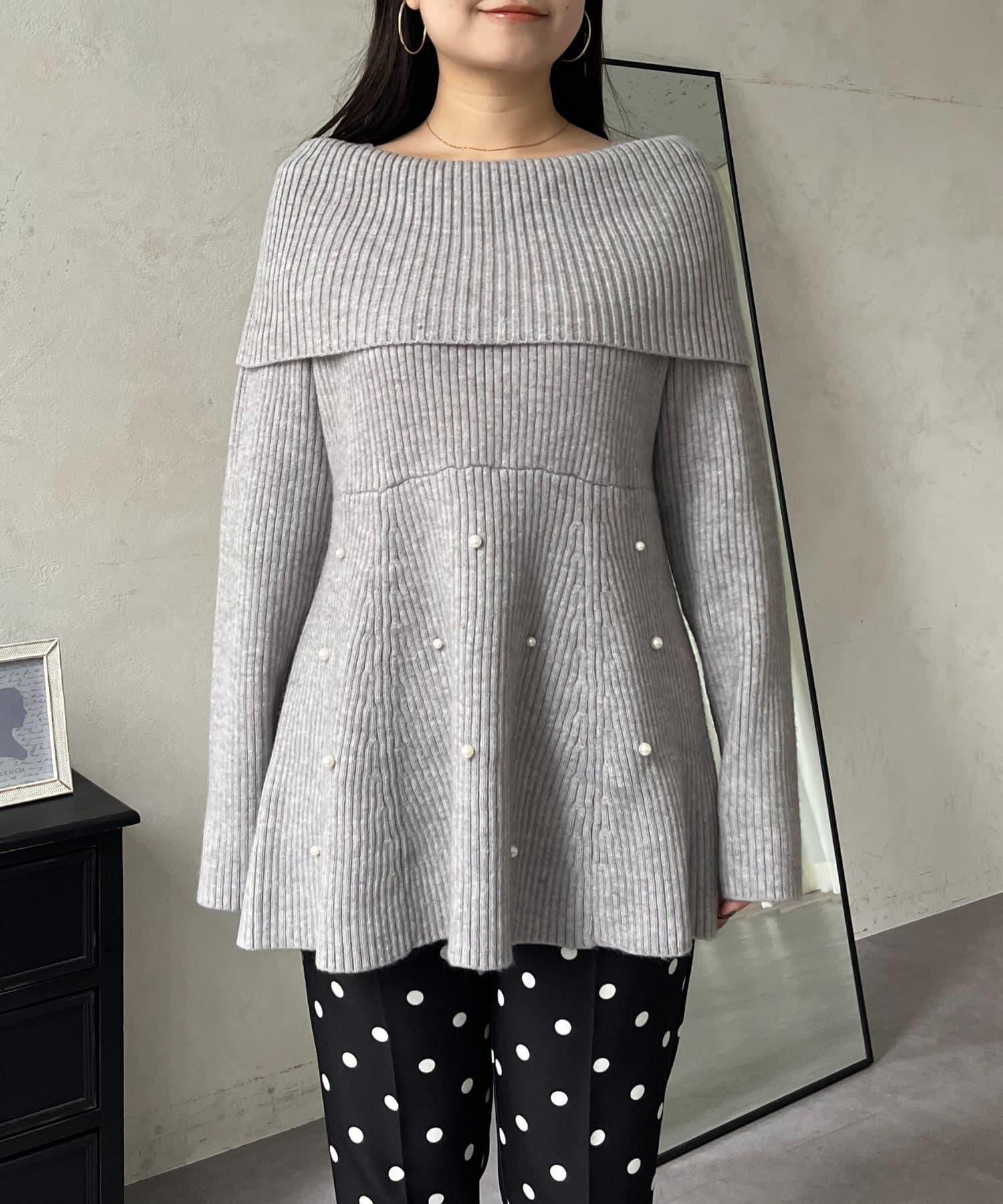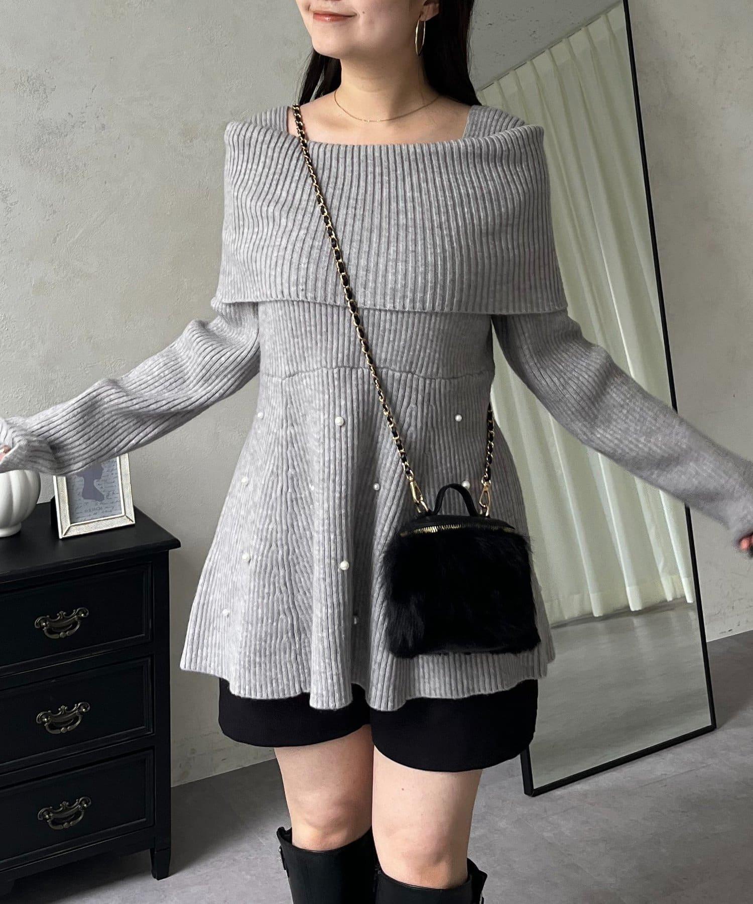 【防靜電】下襬珍珠一字肩荷葉邊針織衫