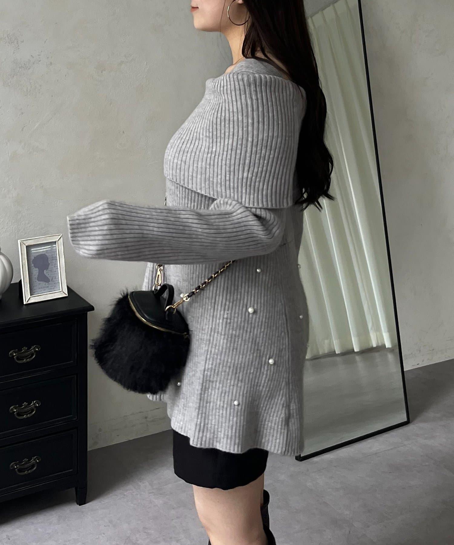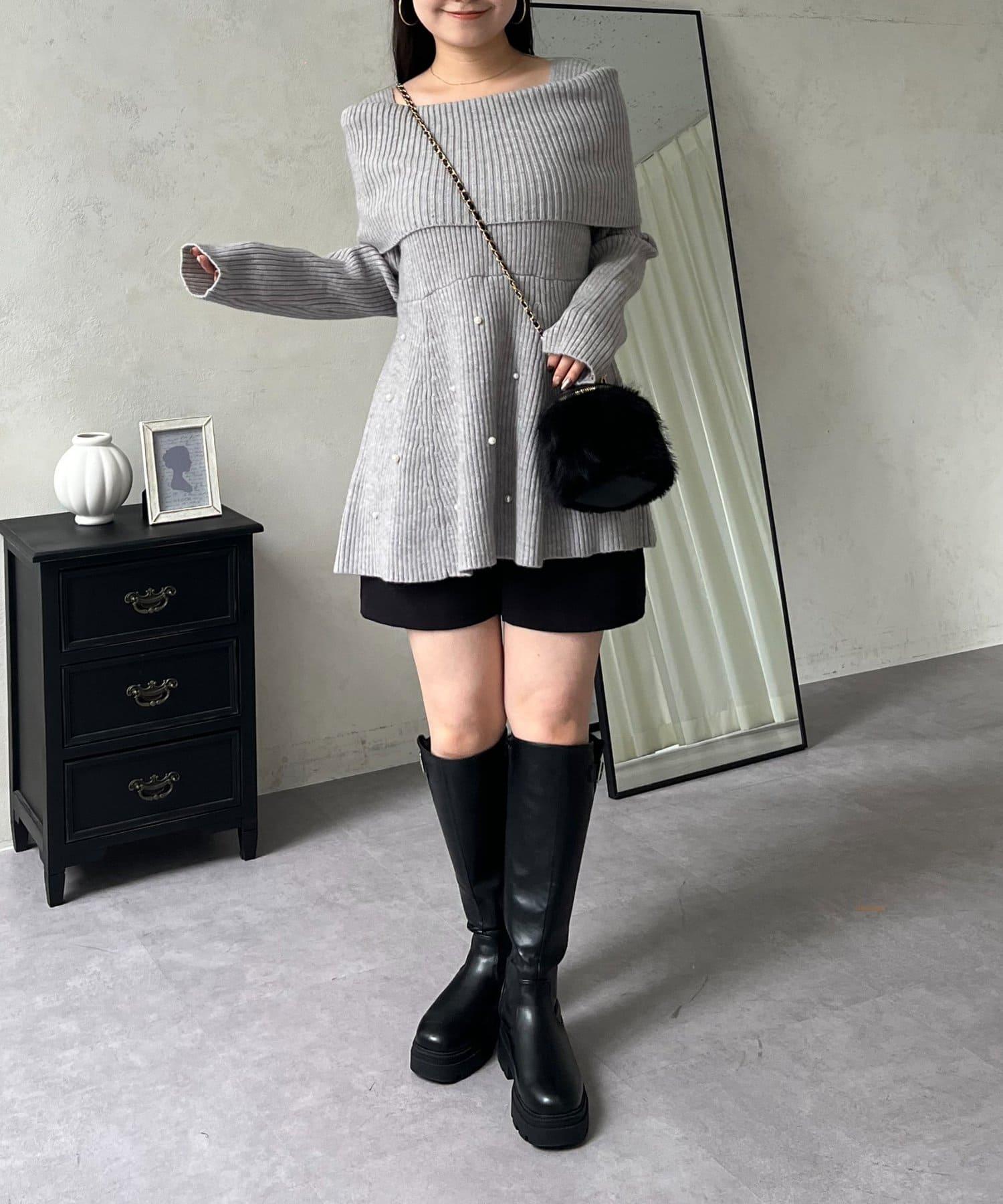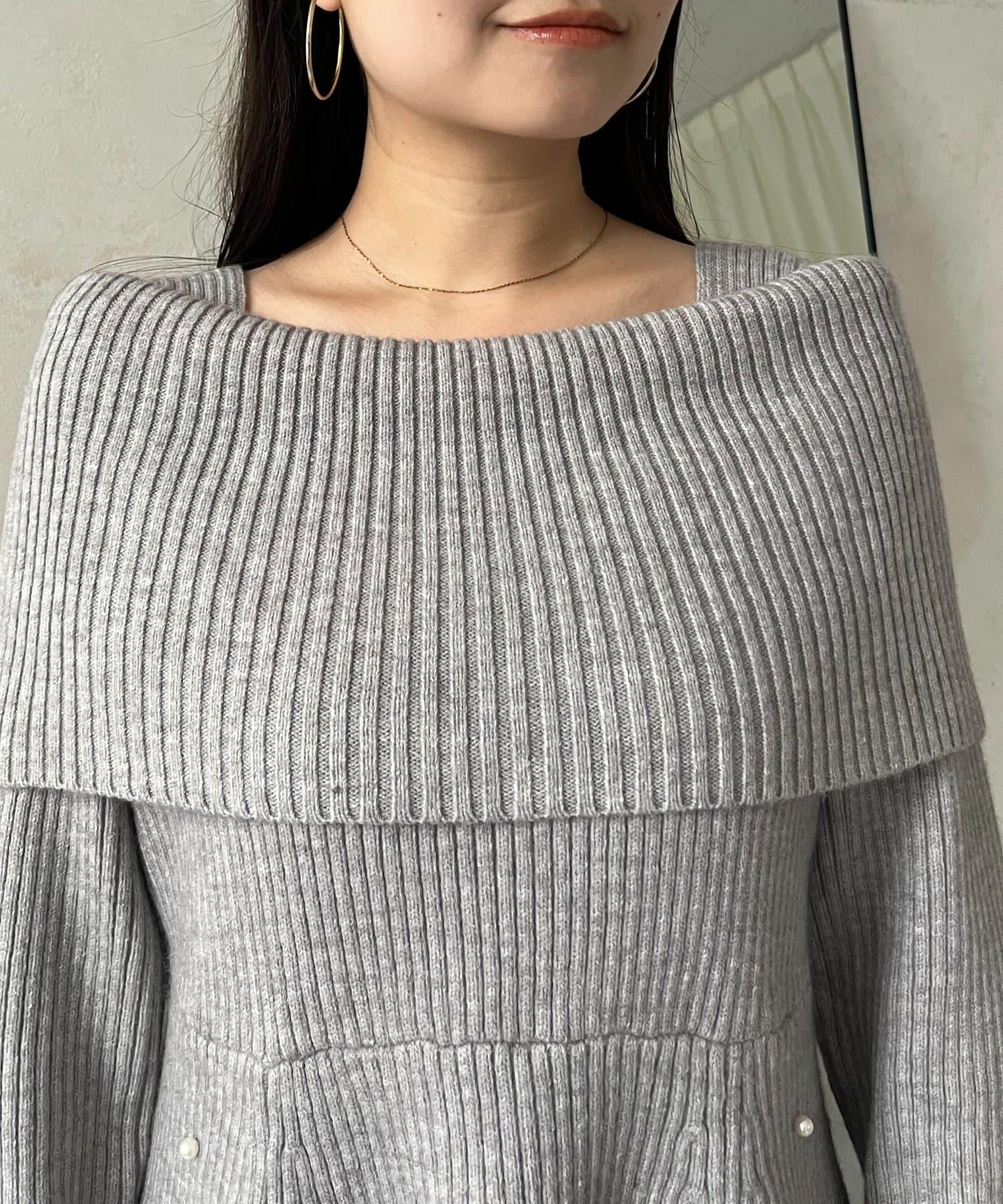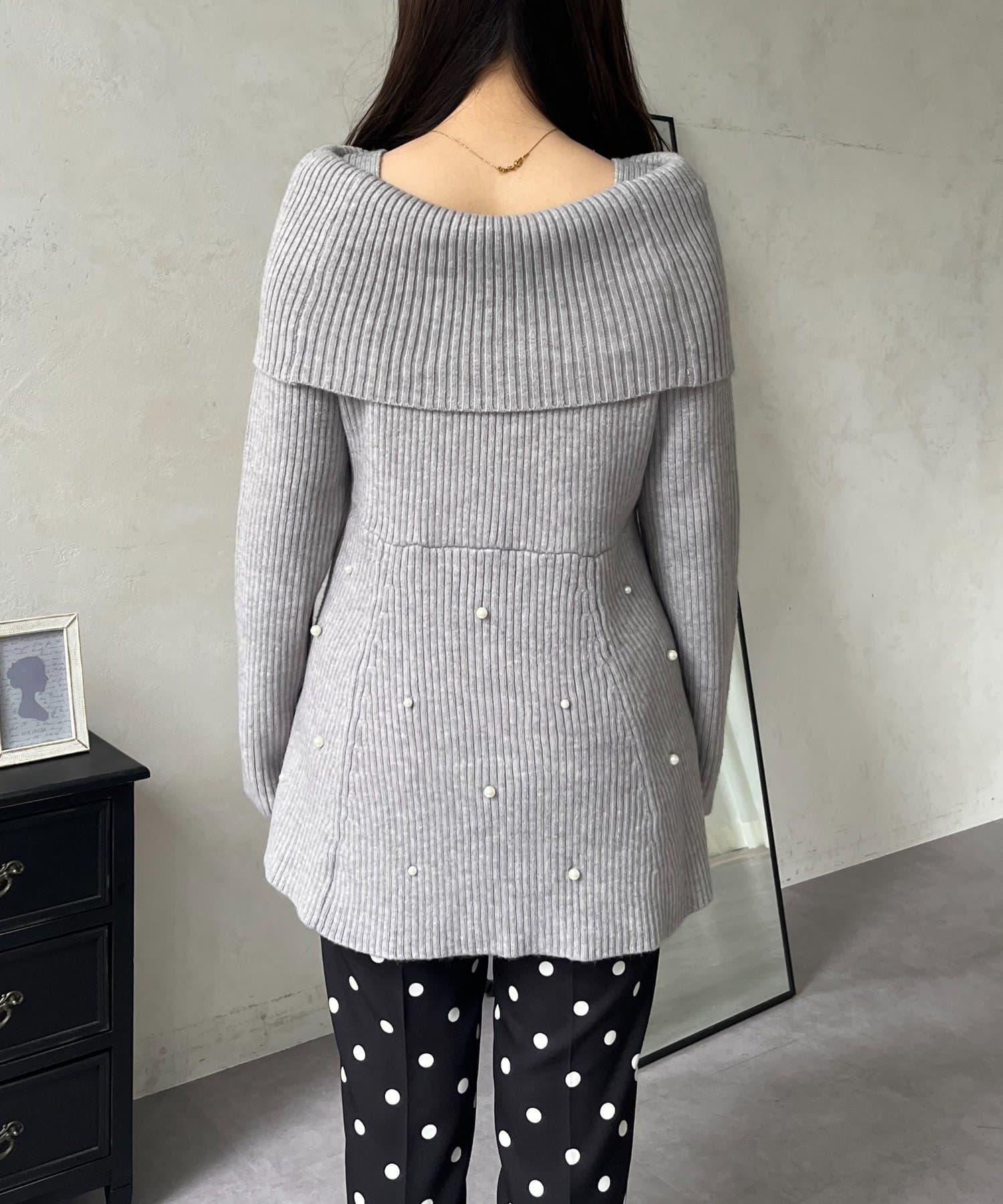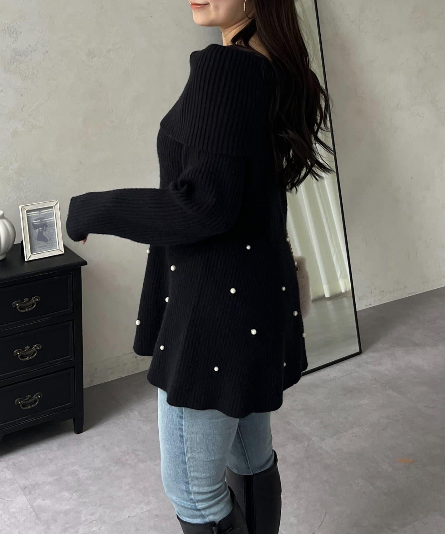 【防靜電】下襬珍珠一字肩荷葉邊針織衫