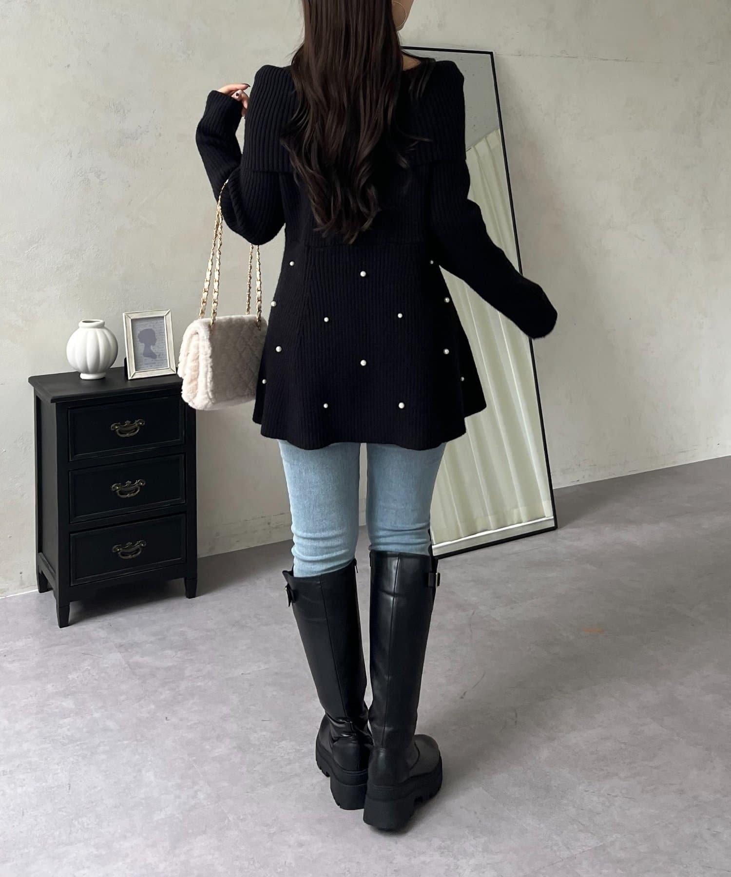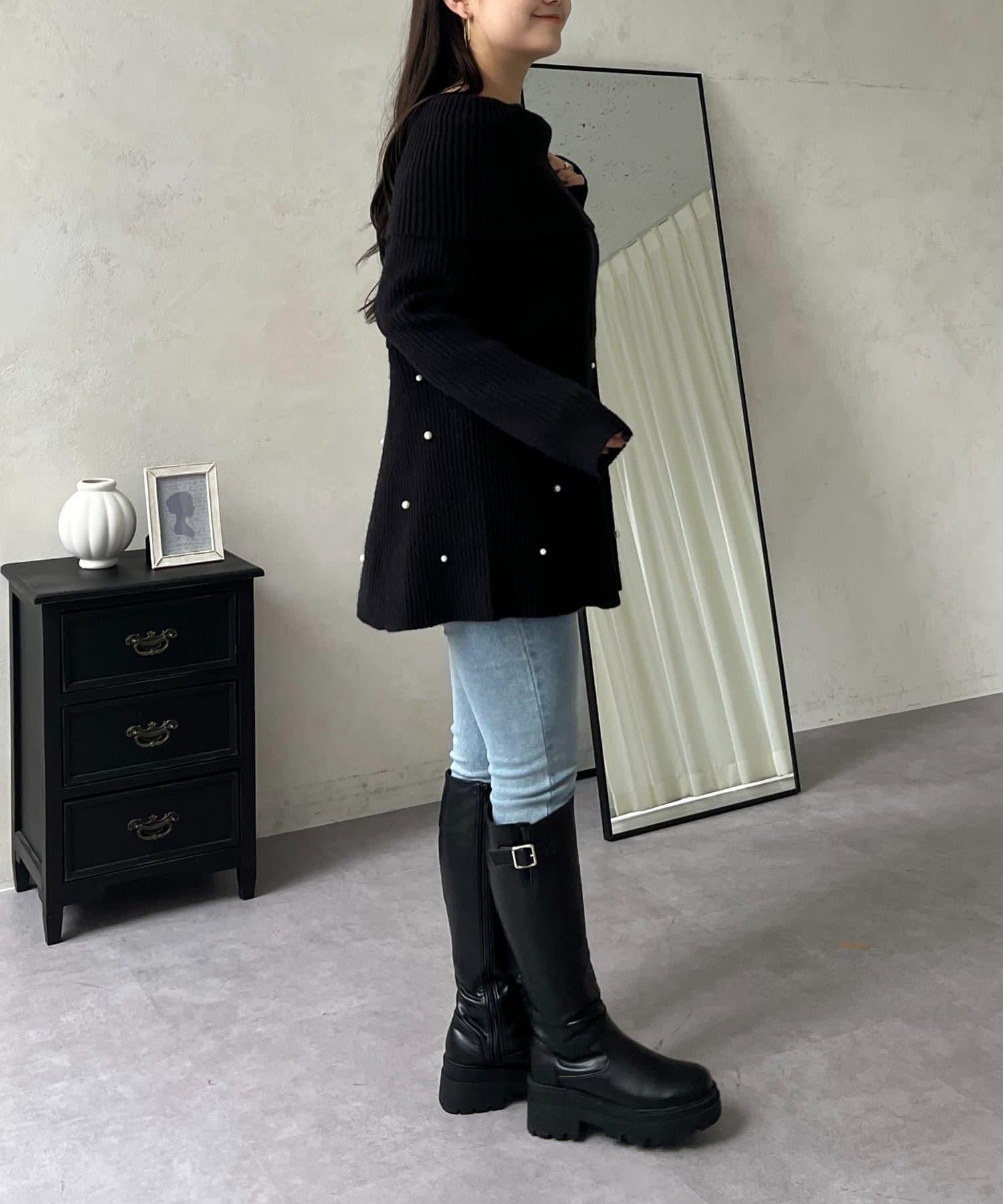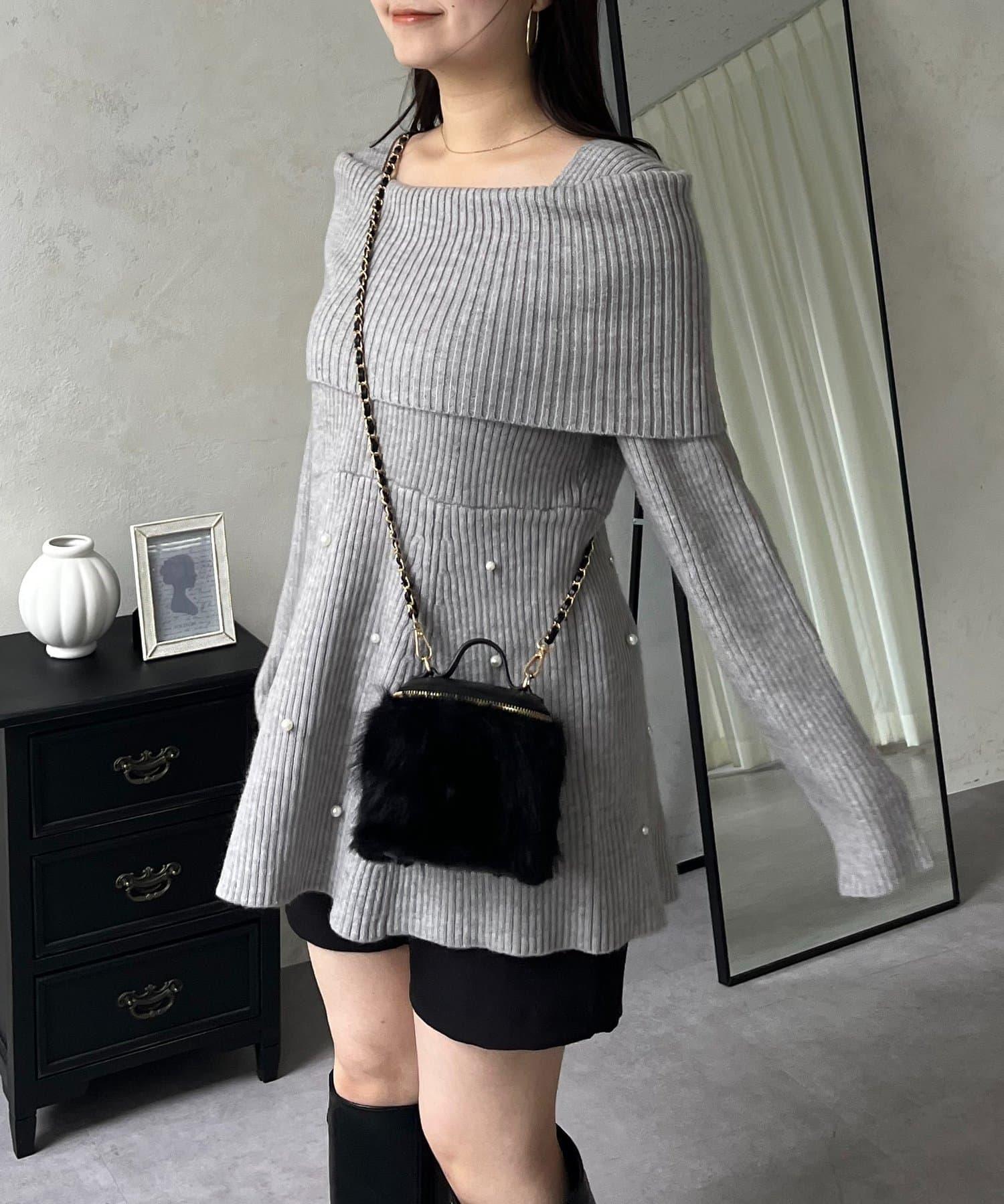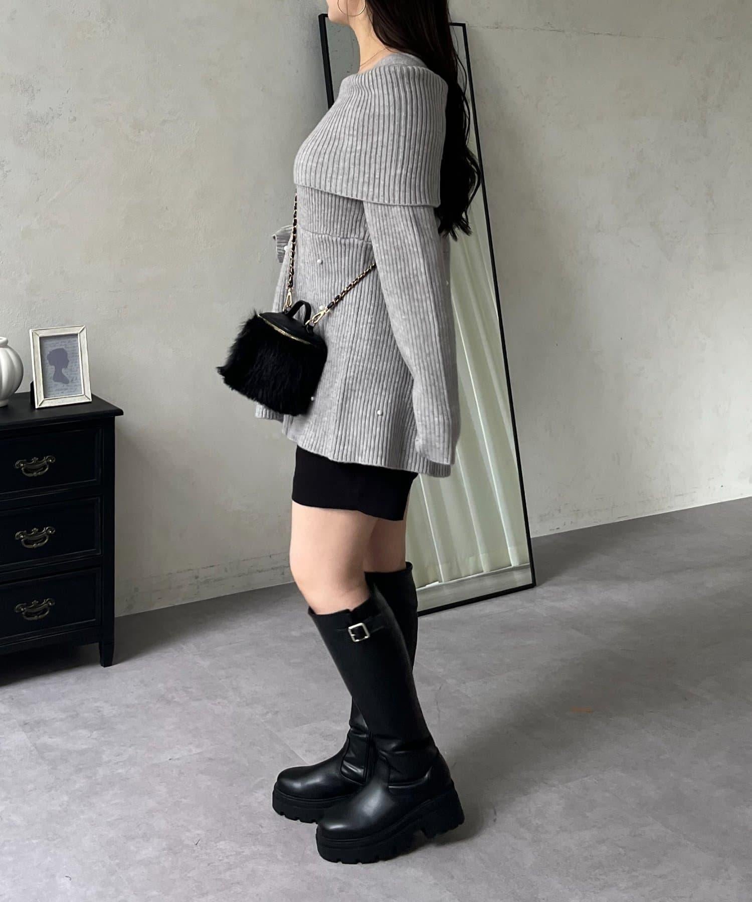【防靜電】下襬珍珠一字肩荷葉邊針織衫