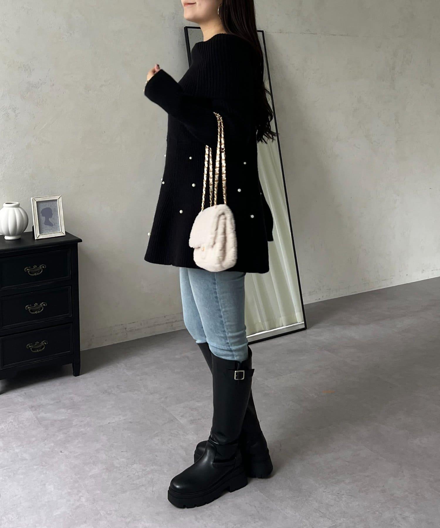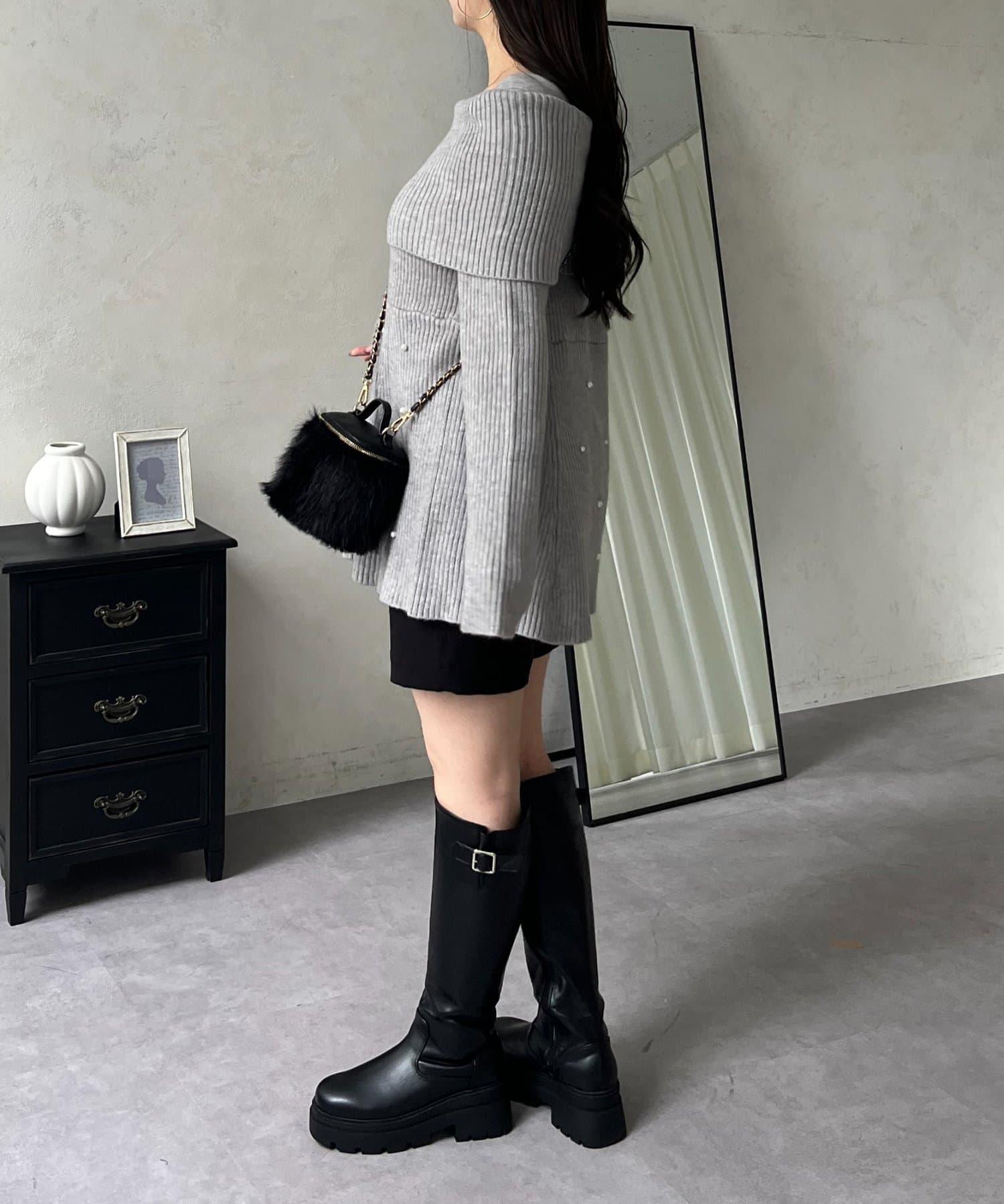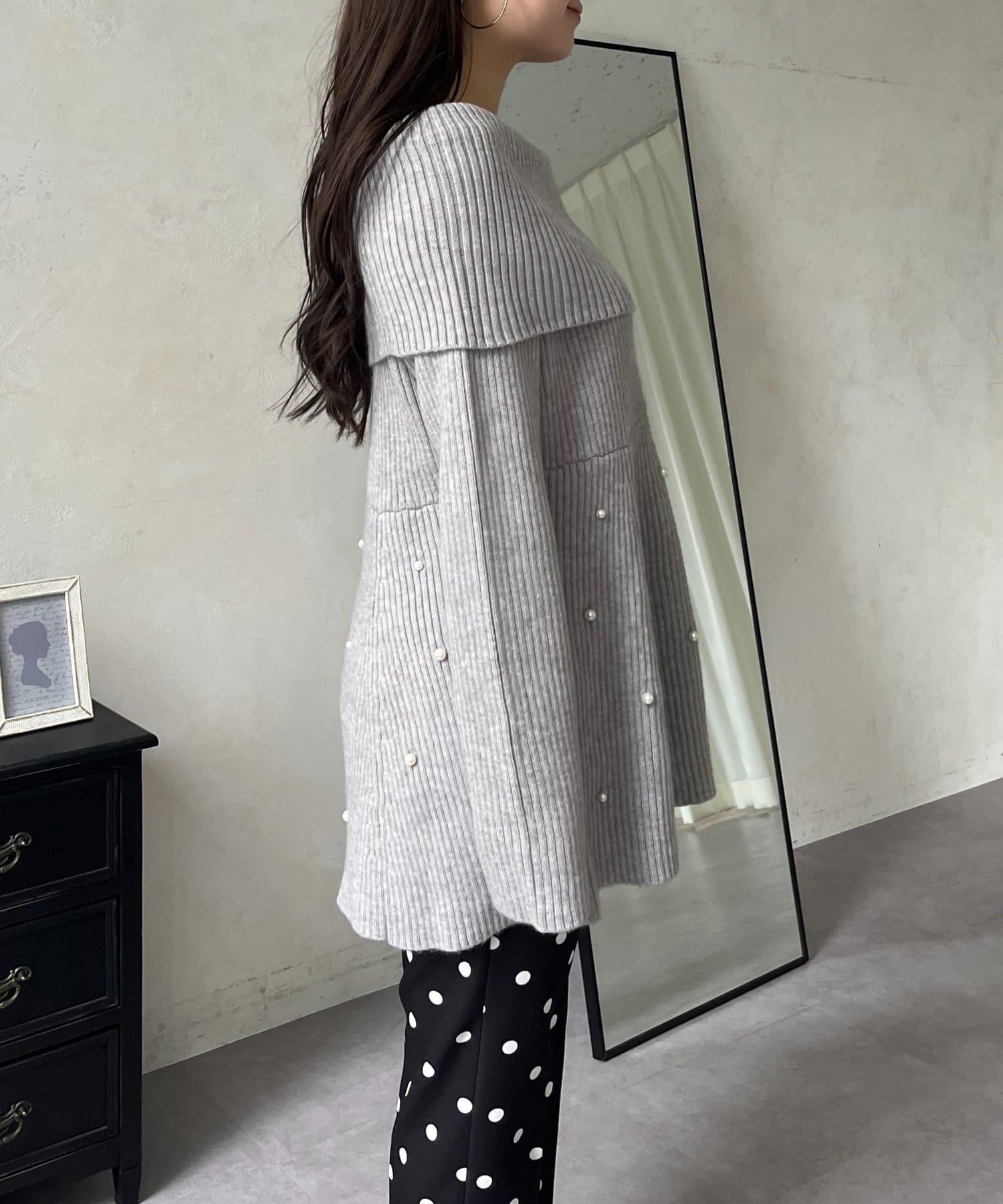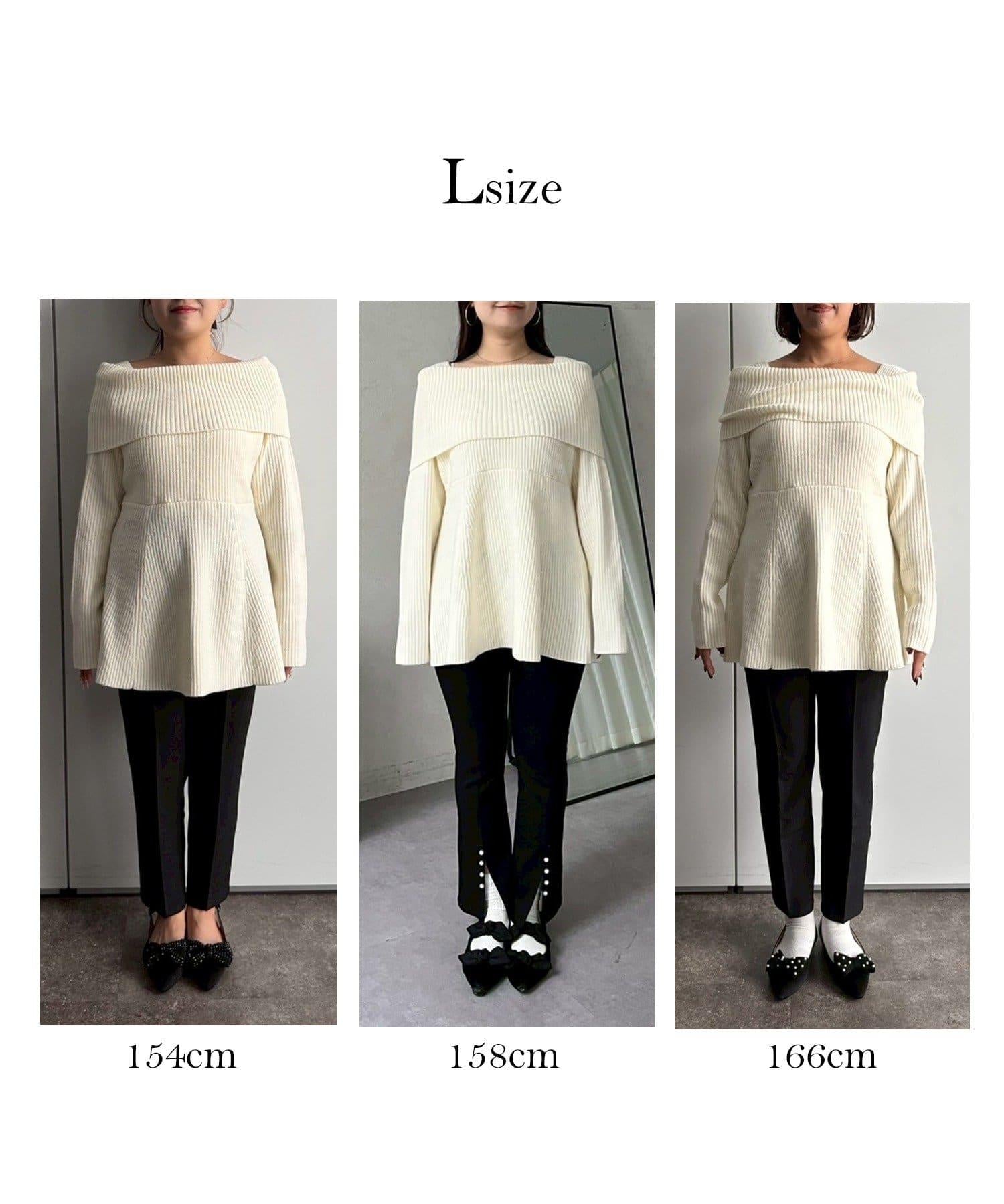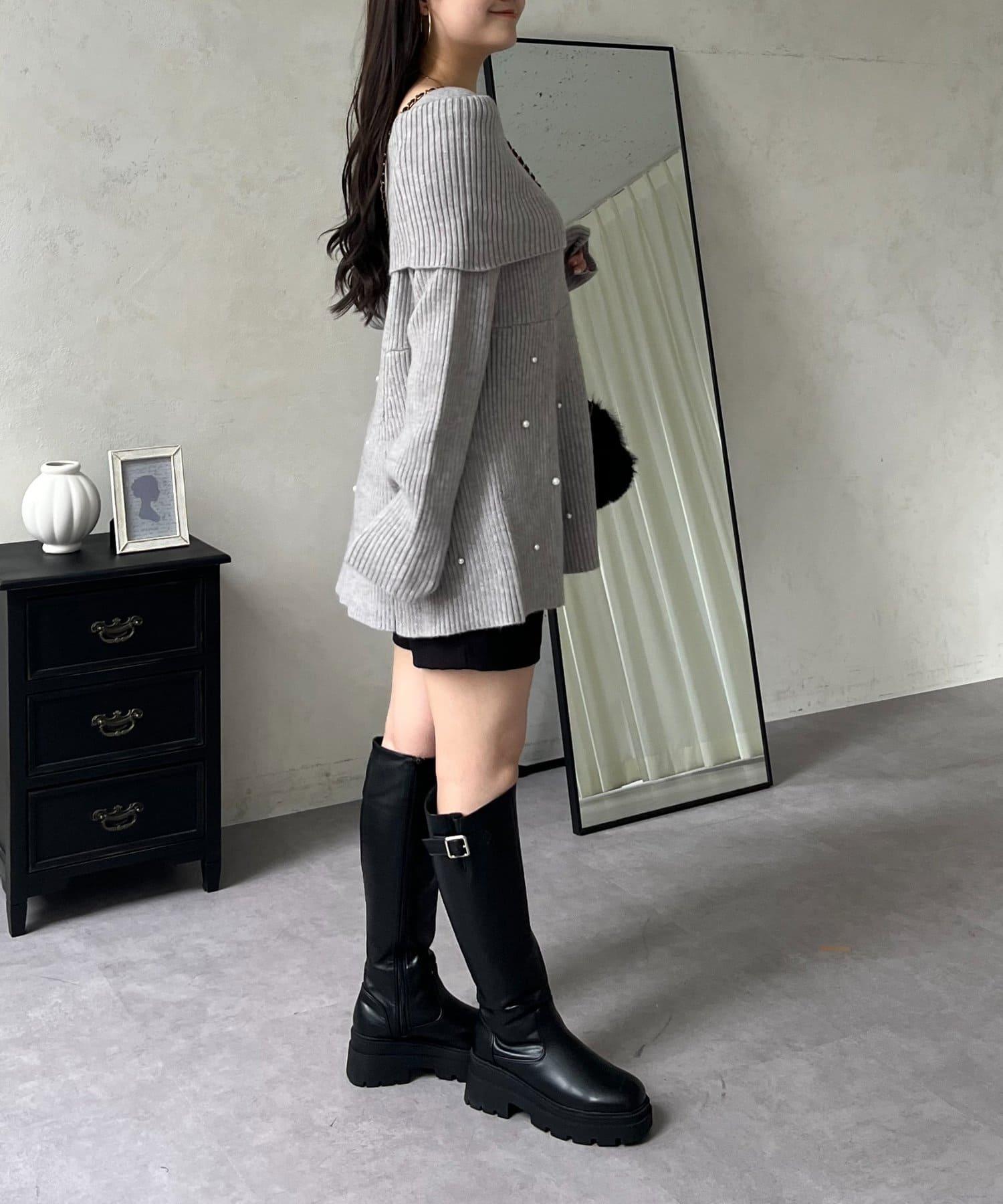 【防靜電】下襬珍珠一字肩荷葉邊針織衫