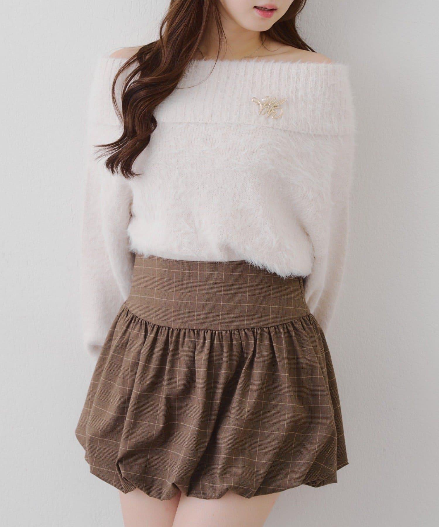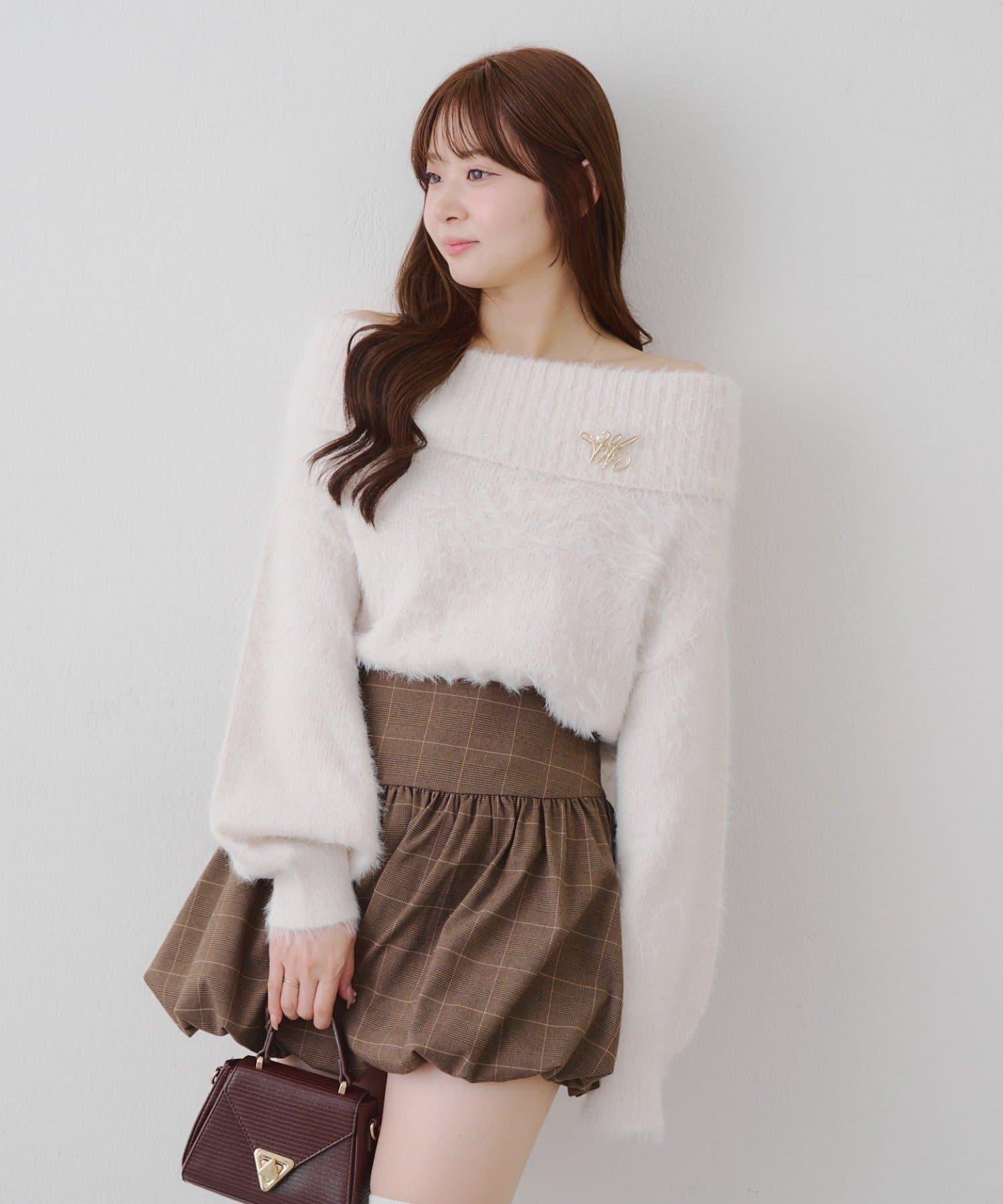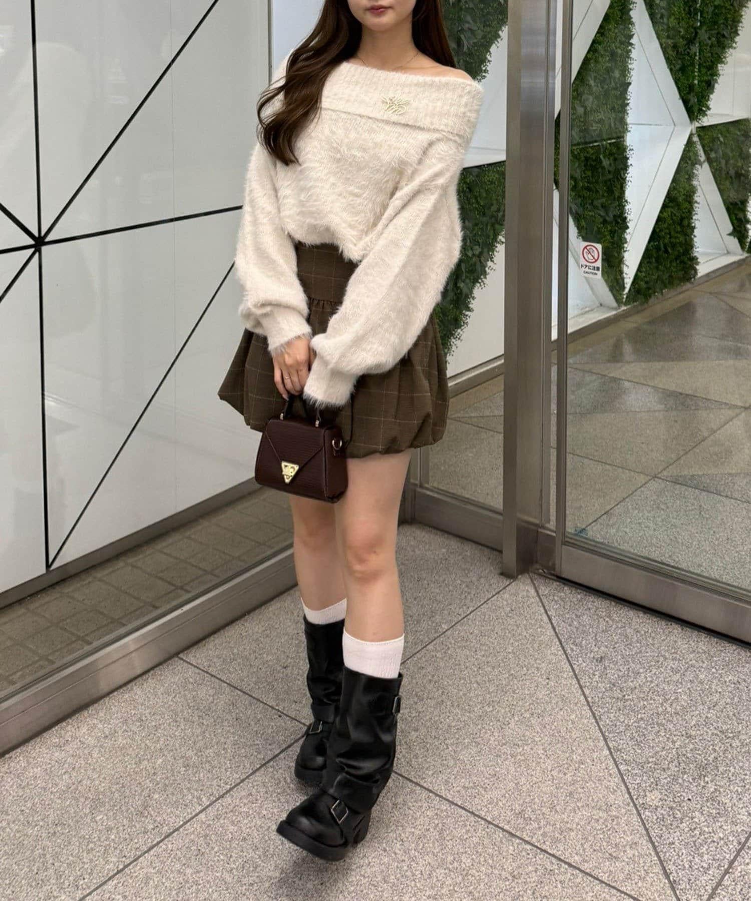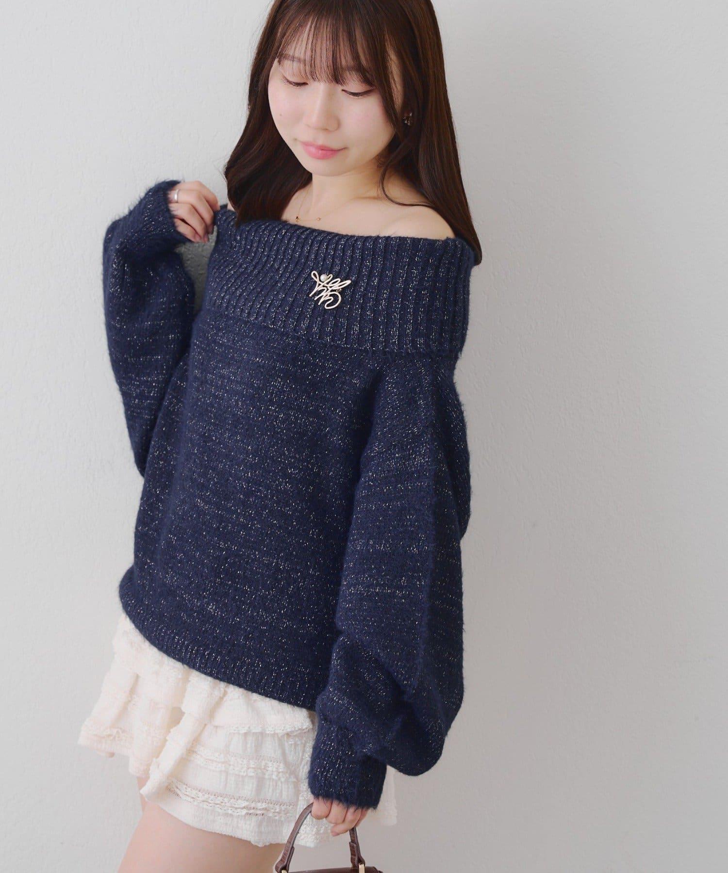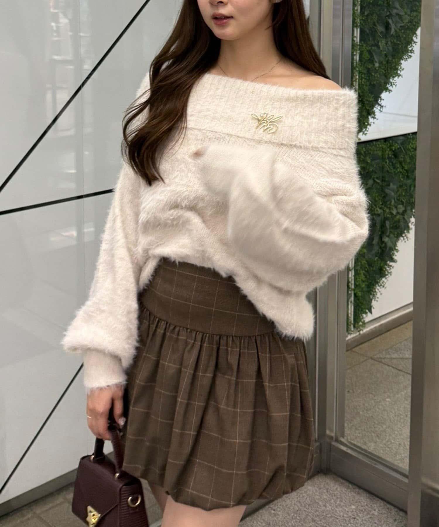 上衣配有可拆卸胸針,露肩設計十分可愛。
