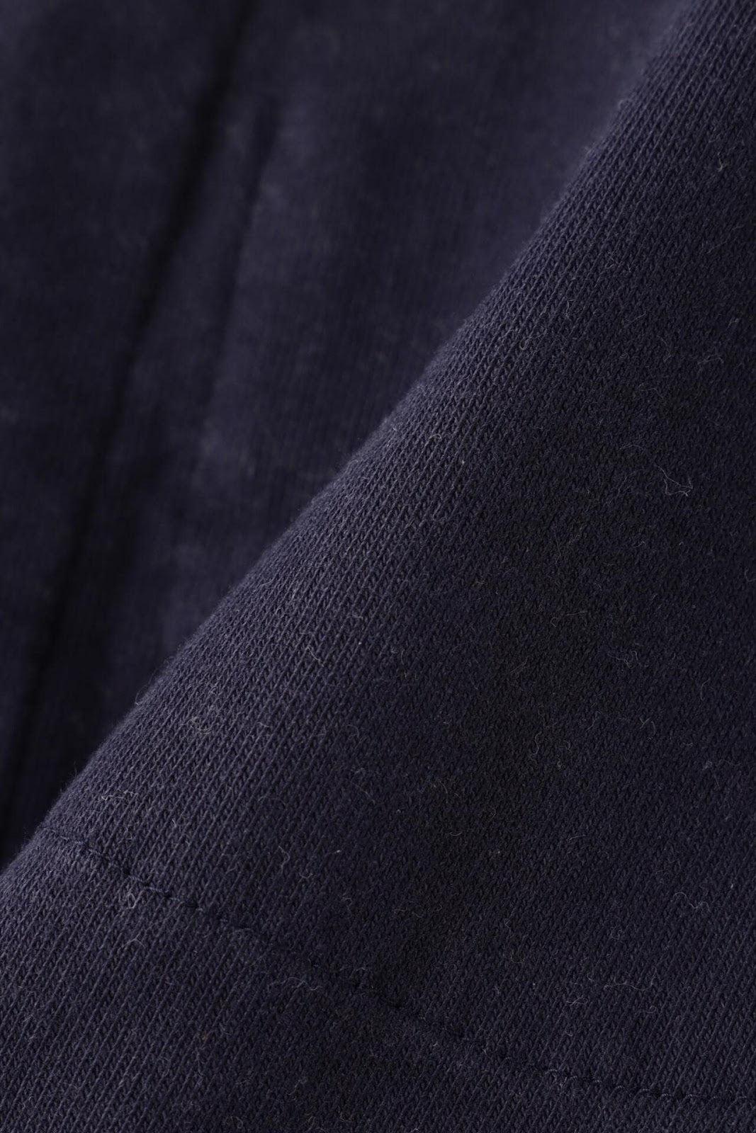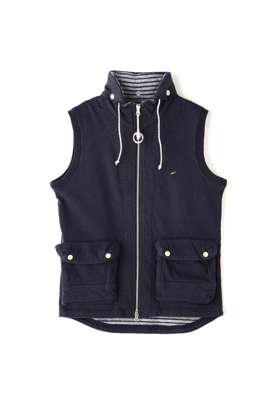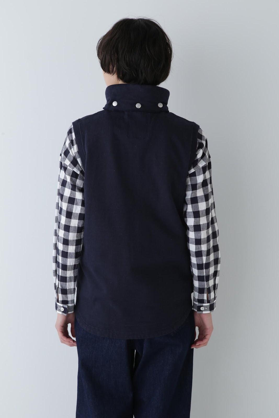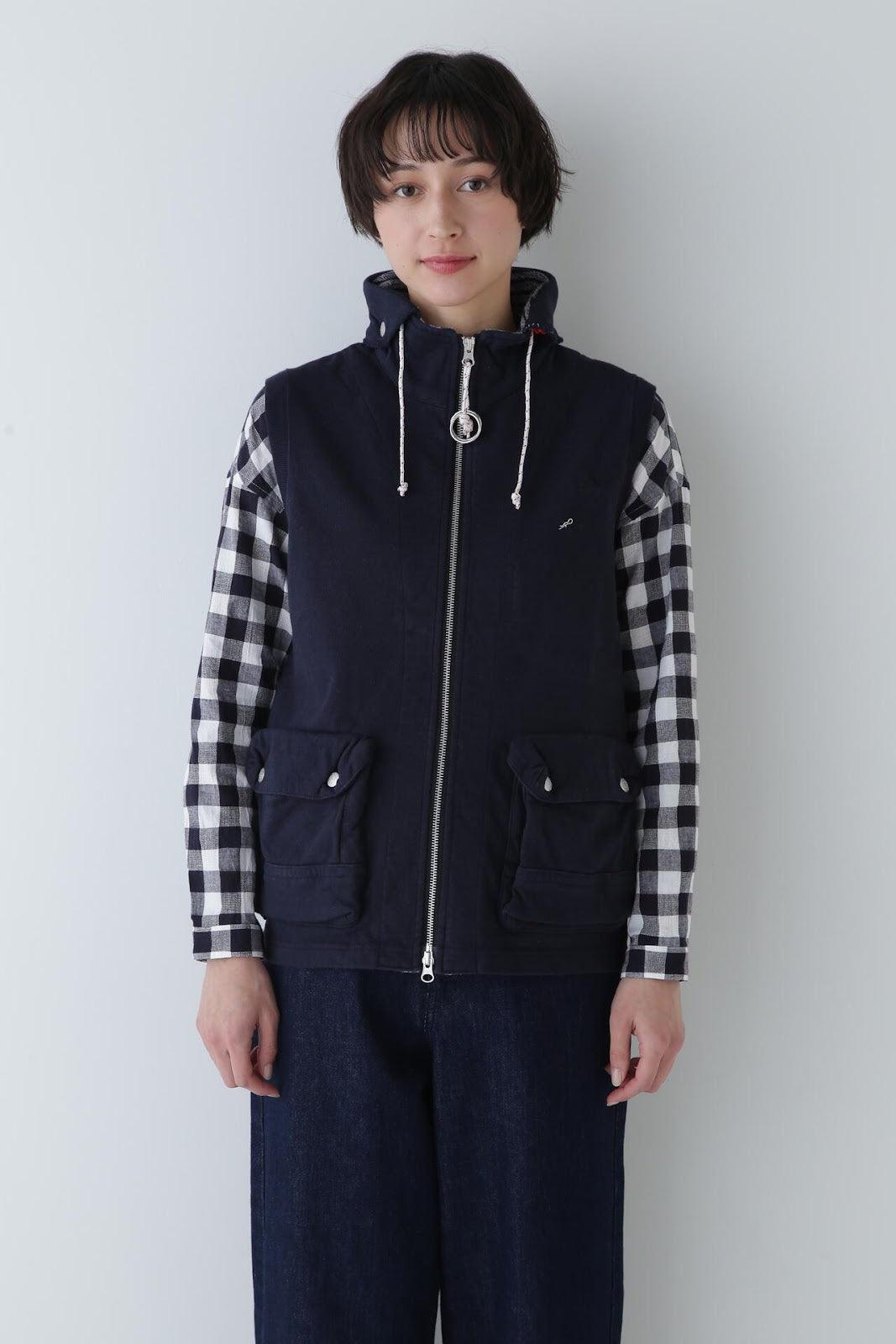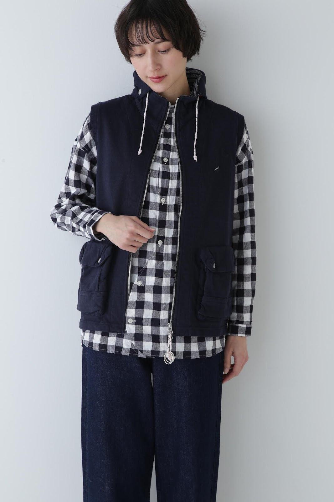 橙色滌綸連帽被塞進立領的圓領內,可以不戴連帽。其輪廓為箱型,後部有長長的圓形下襬,前部為方形,具有運動服裝中常見的功能規格。這是一款方便的馬甲,三季都可穿著,易於疊穿。正面是素色的,背面是帶有邊框的原始棉質襯裡。它是一種通過在反面填充邊線的程度,使其無法透視到表面,從而對外衣的背毛進行加工的材料。natic] na = 海軍,t = 技術,i = 創新,c = 概念。