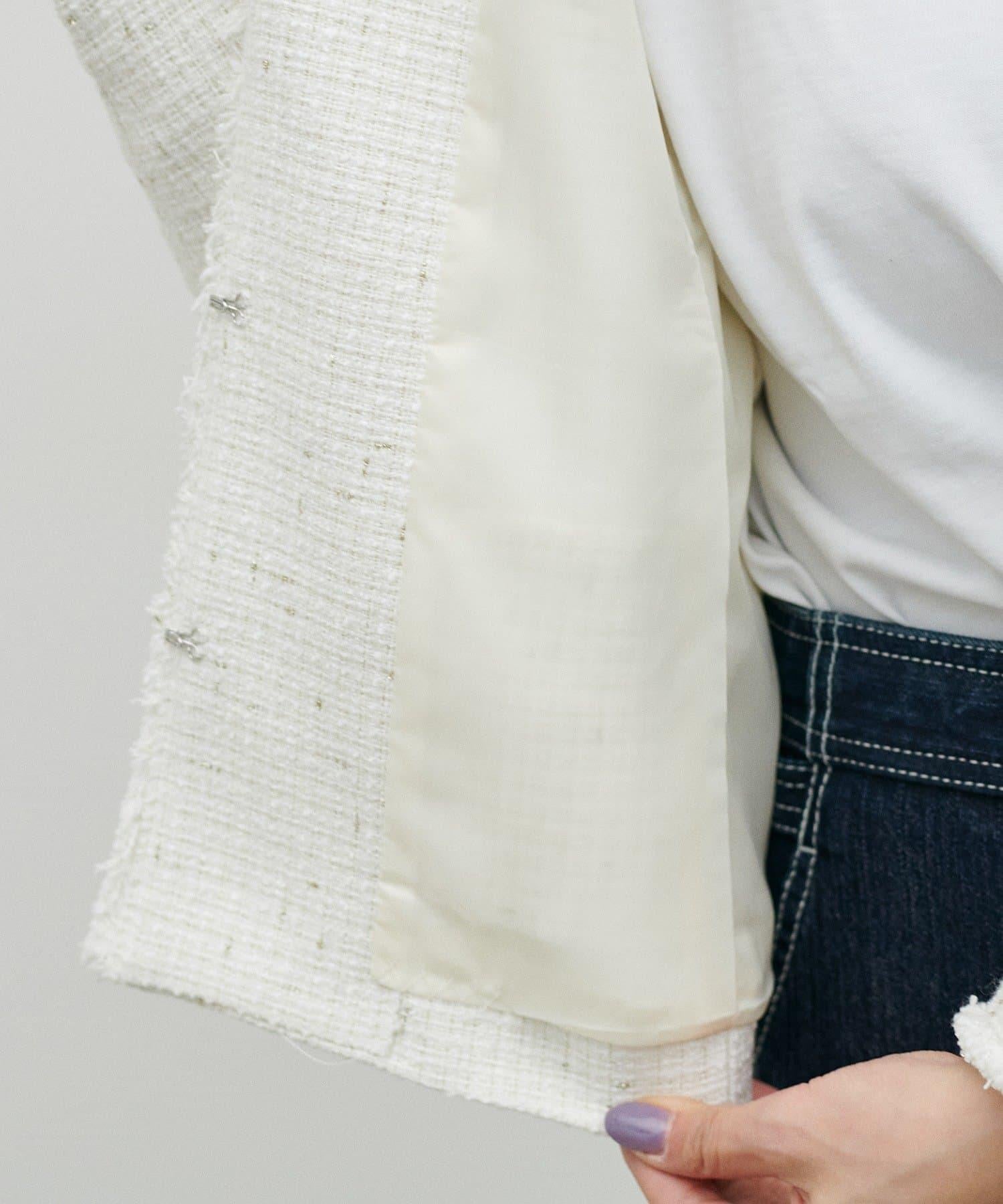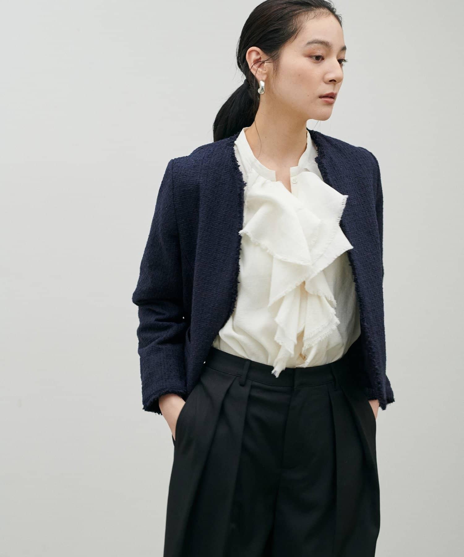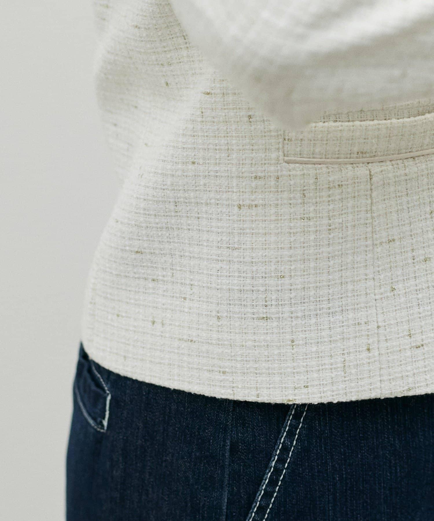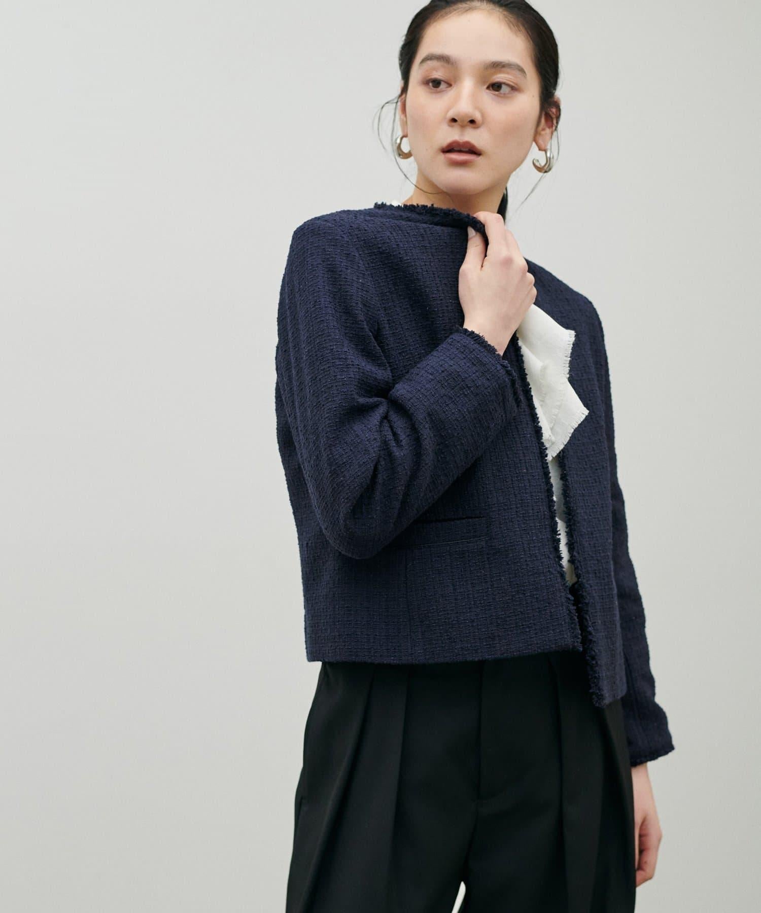 下襬處的流蘇和稍細線頭的斜紋軟呢混搭讓夾克看起來更輕鬆、