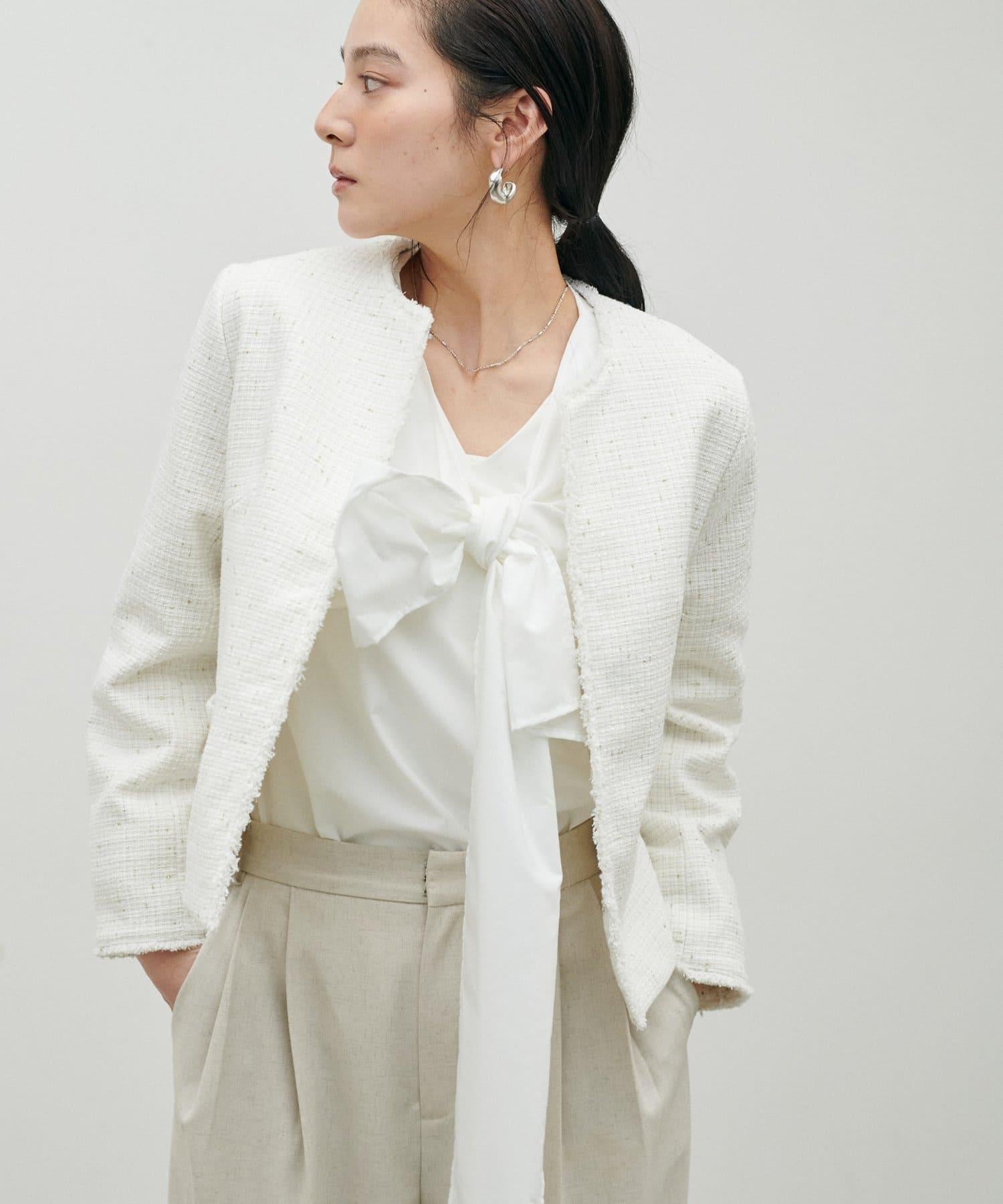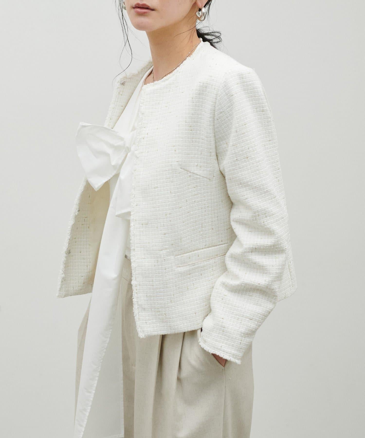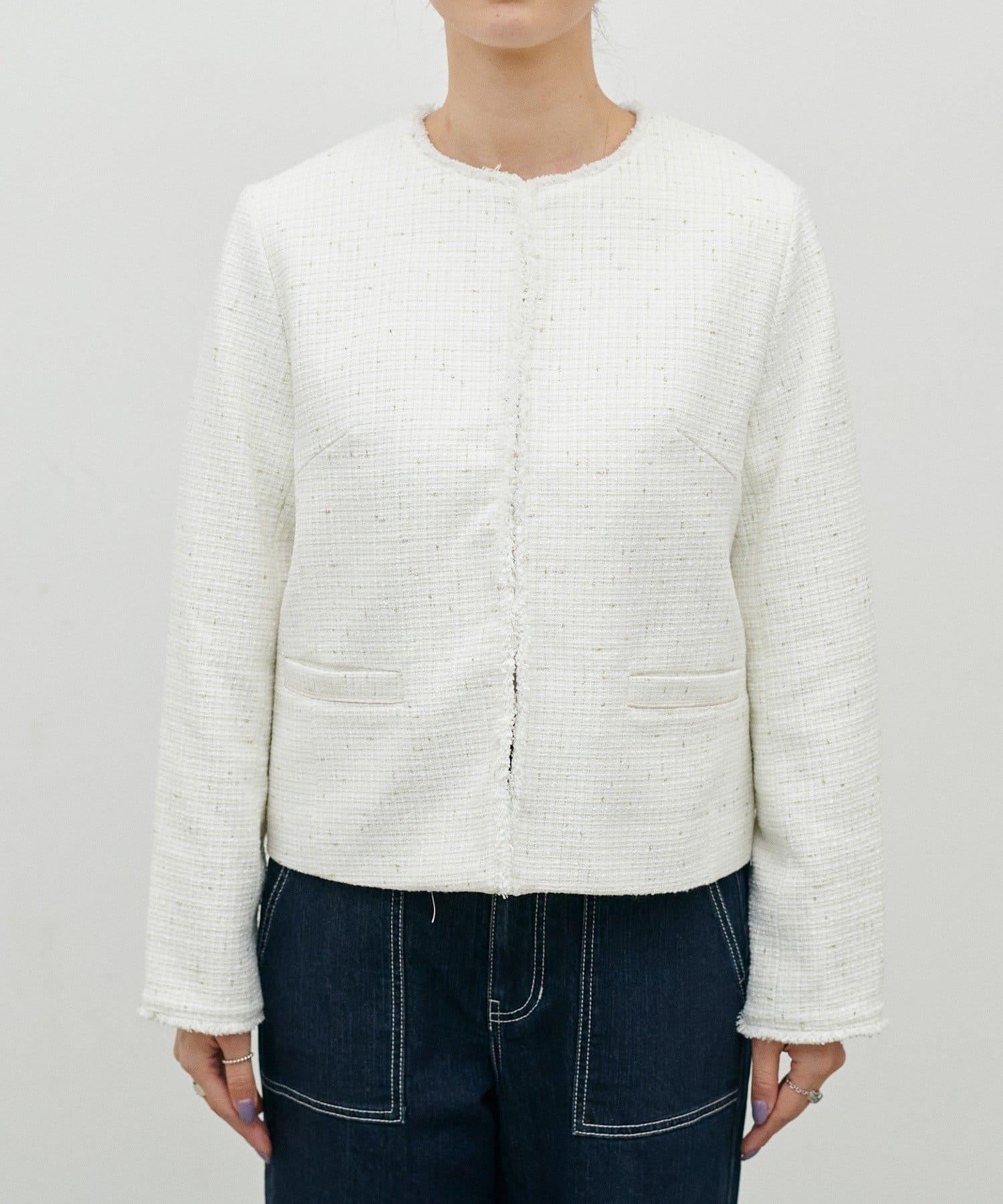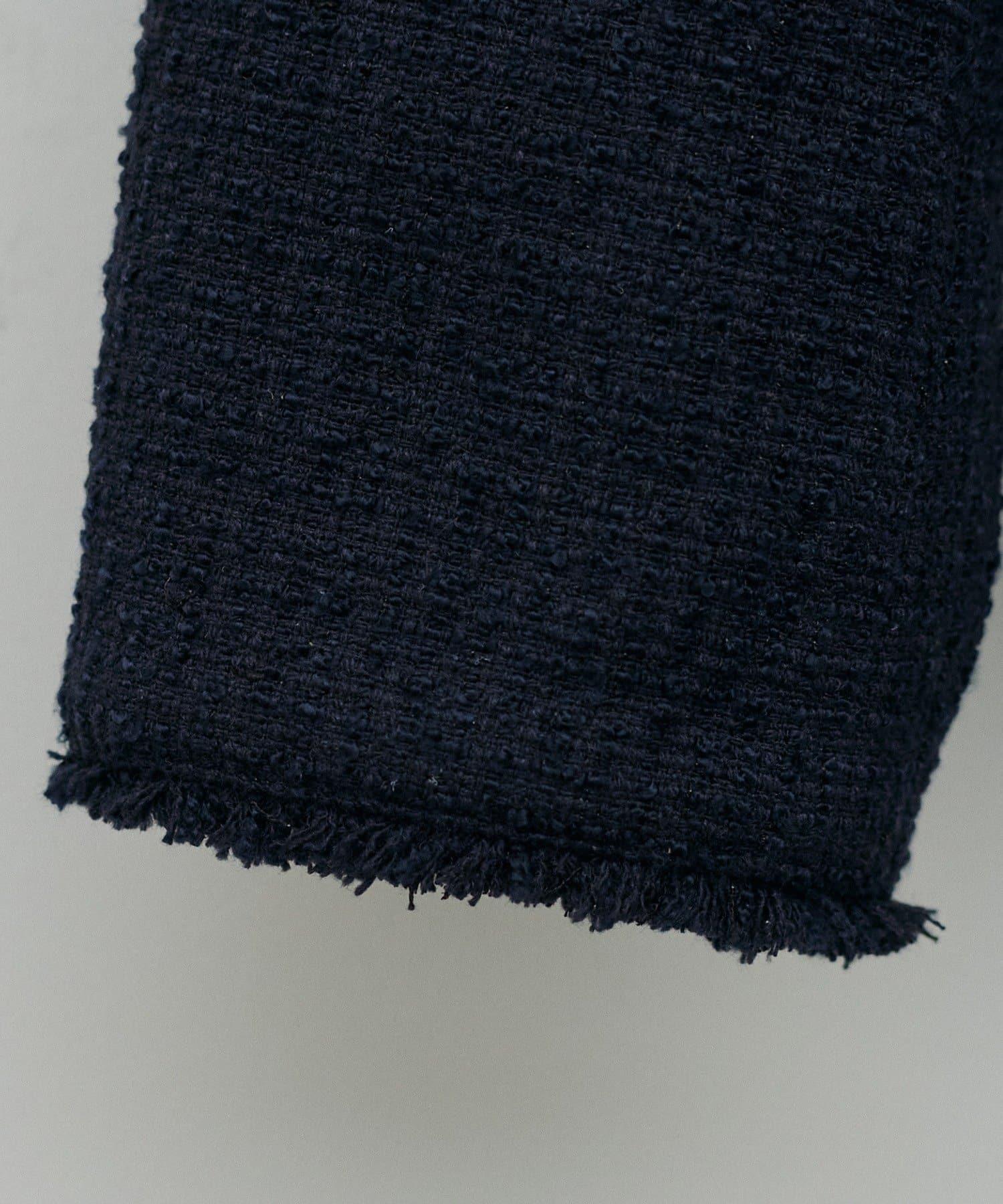 下襬處的流蘇和稍細線頭的斜紋軟呢混搭讓夾克看起來更輕鬆、
