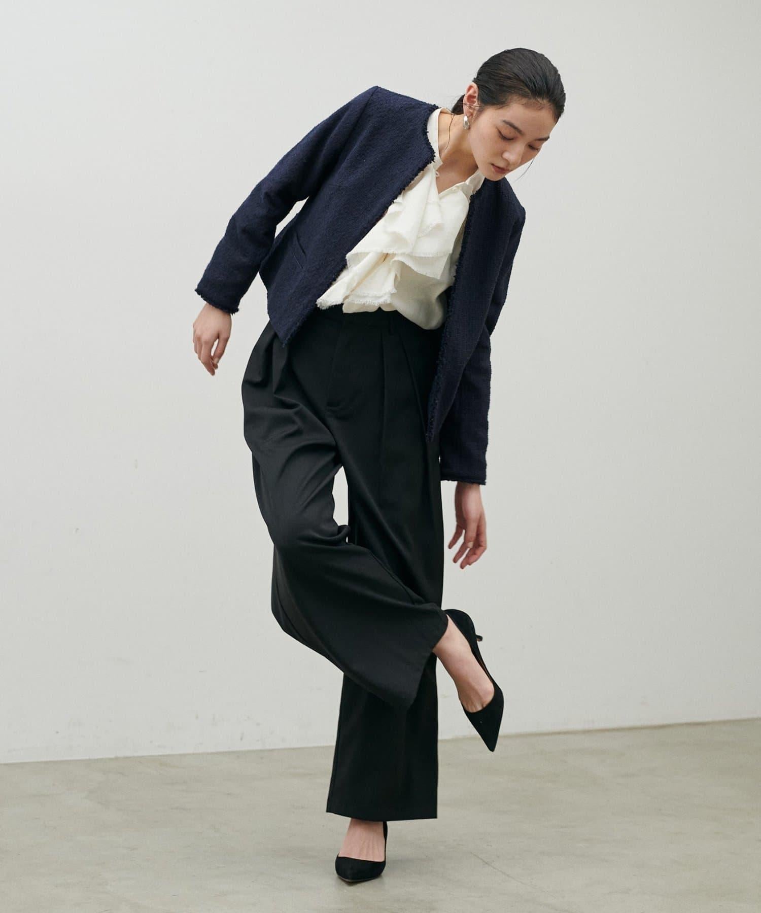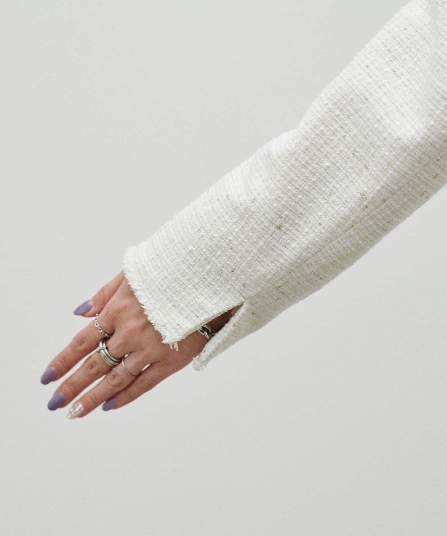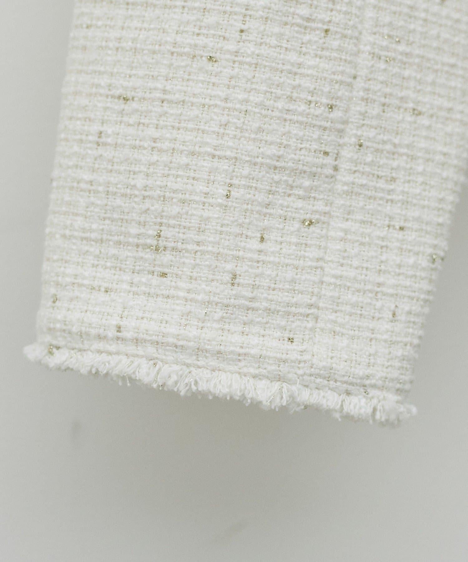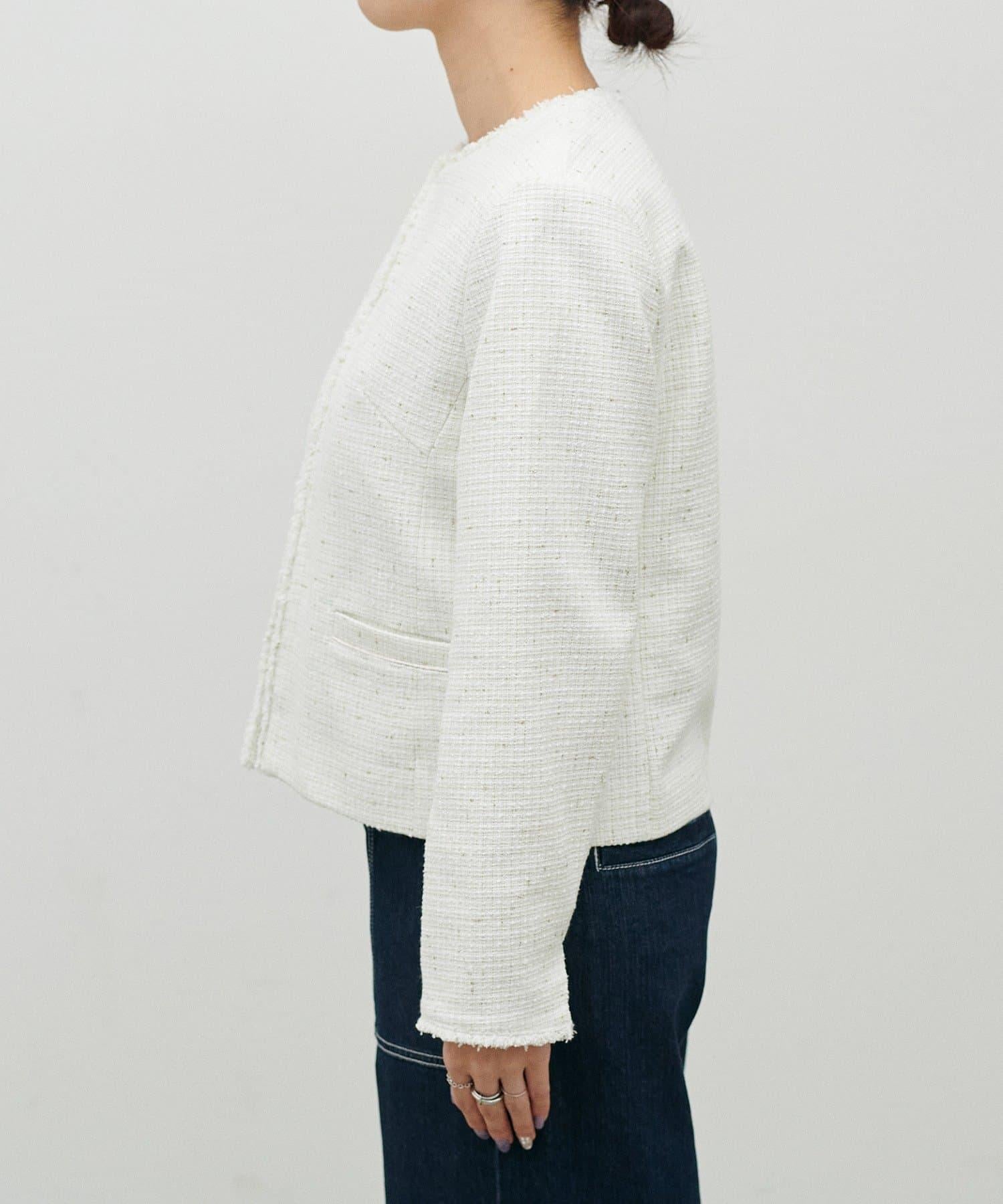 下襬處的流蘇和稍細線頭的斜紋軟呢混搭讓夾克看起來更輕鬆、