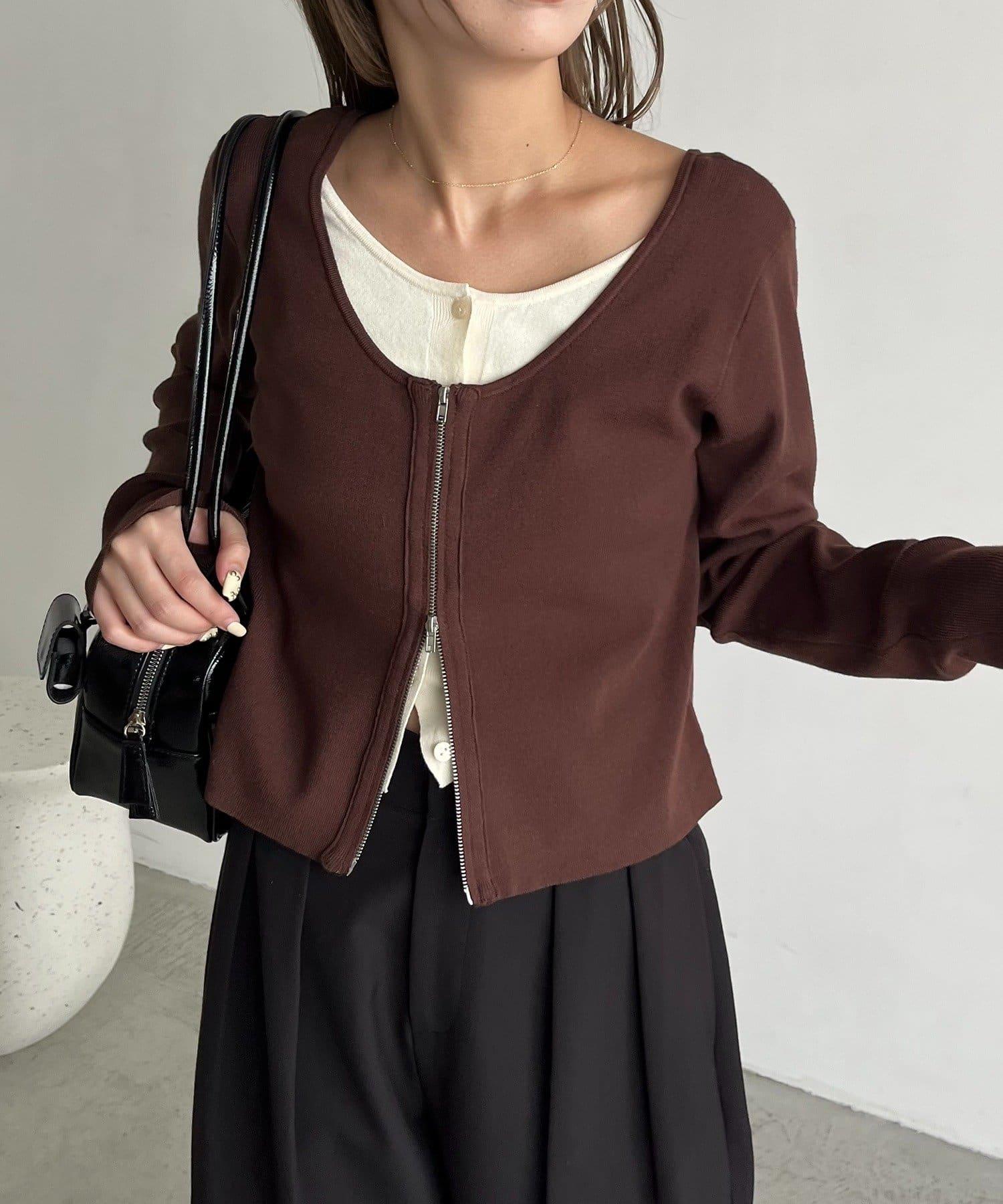 將外層 W 拉鍊開衫的下襬拉開,露出內層即可穿著。