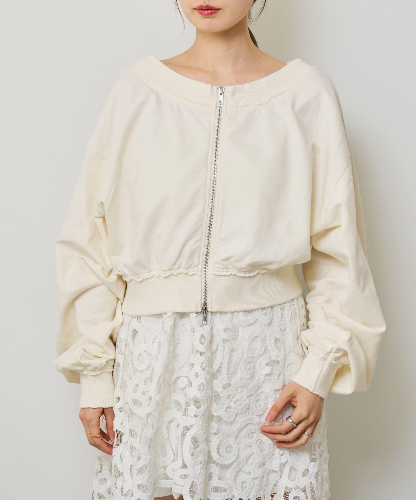 稍稍拉開拉鍊,讓肩部下垂,增加寬鬆感,打造成熟穩重的風格。