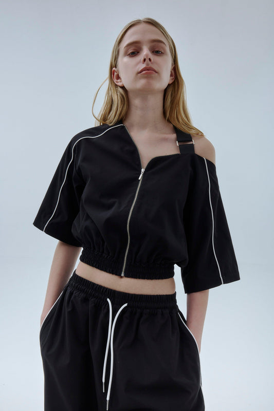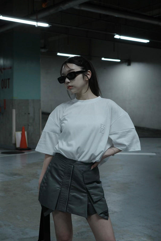 這款上衣採用男裝式的廓形,從正面探出的不平衡皮膚給人一種獨特的印象。