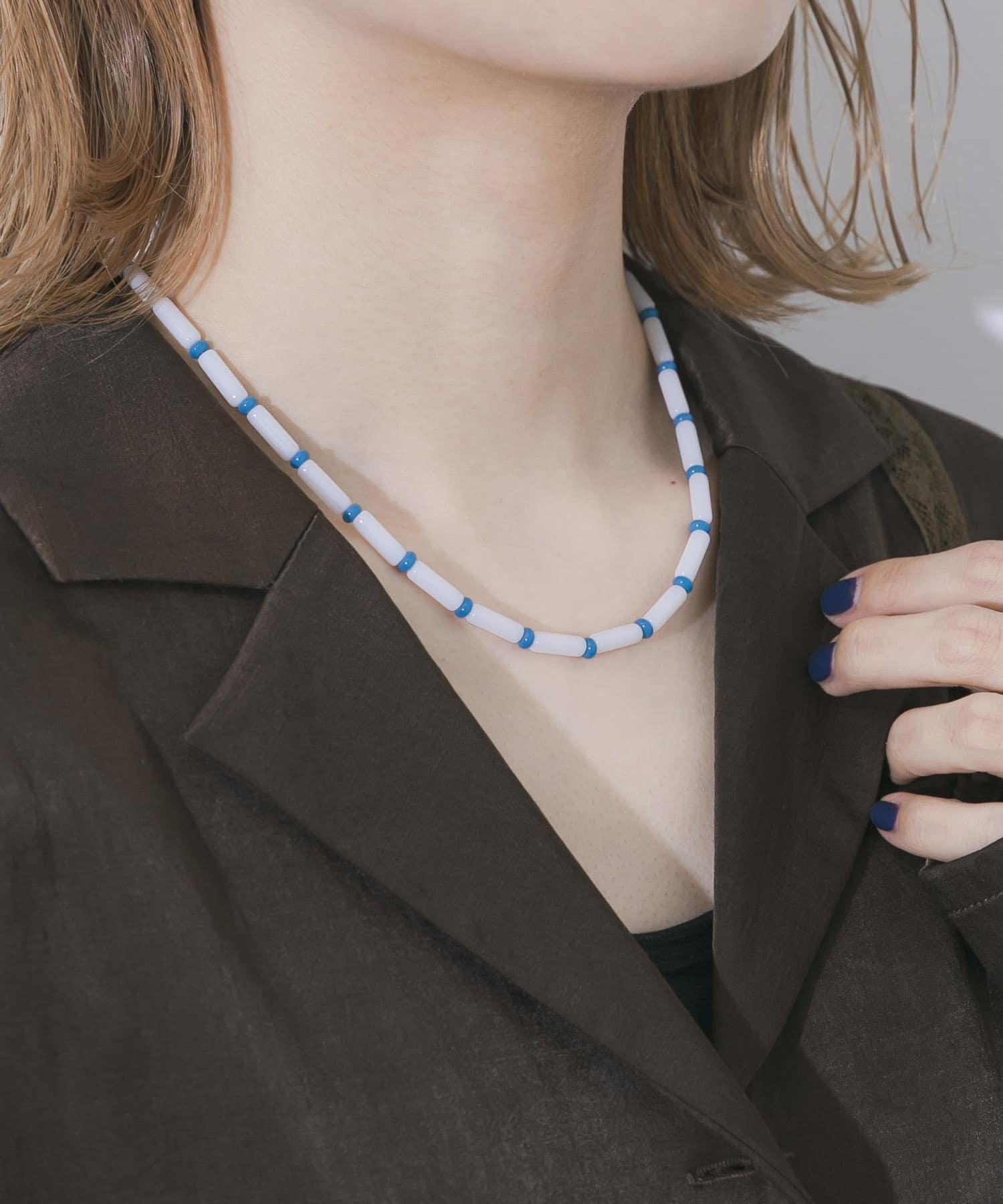 由白色和藍色珠子有節奏地連接而成的項鍊。