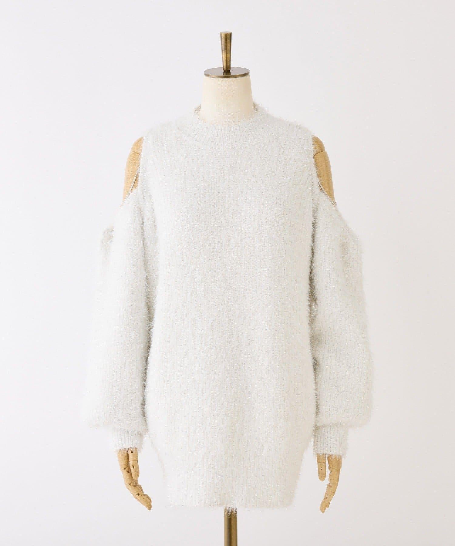 迷你針織連衣裙,採用開肩設計和閃亮鏈條。