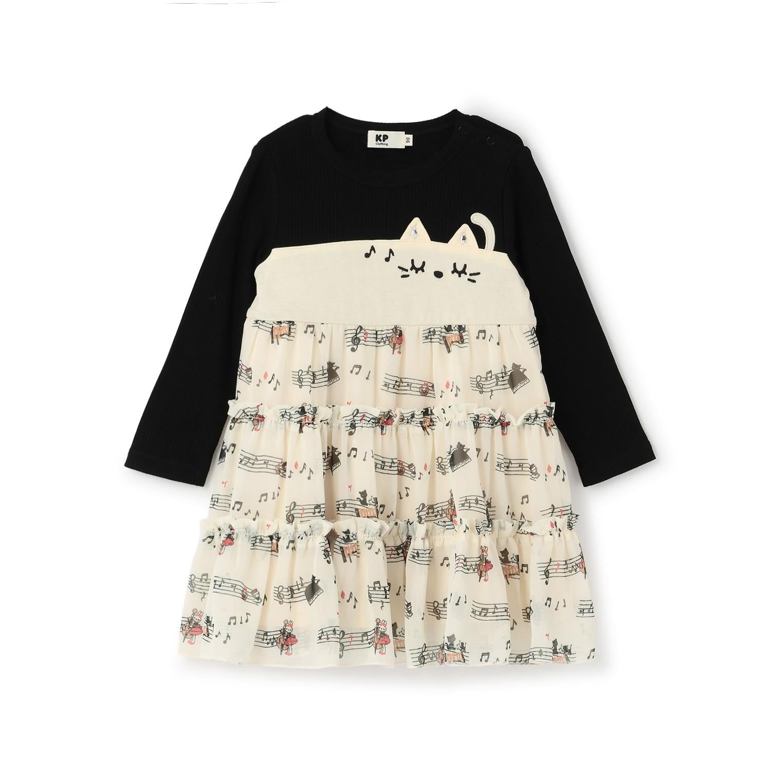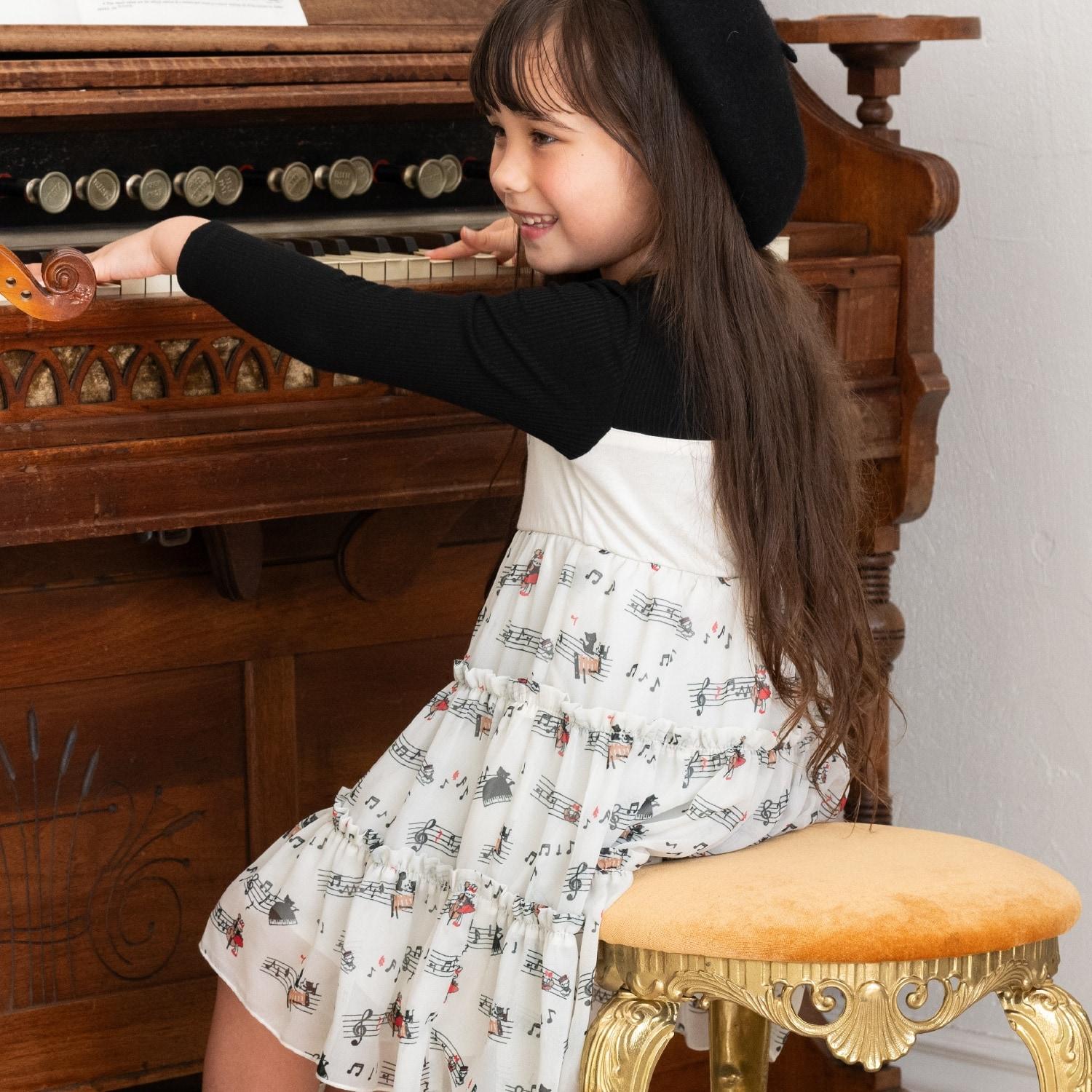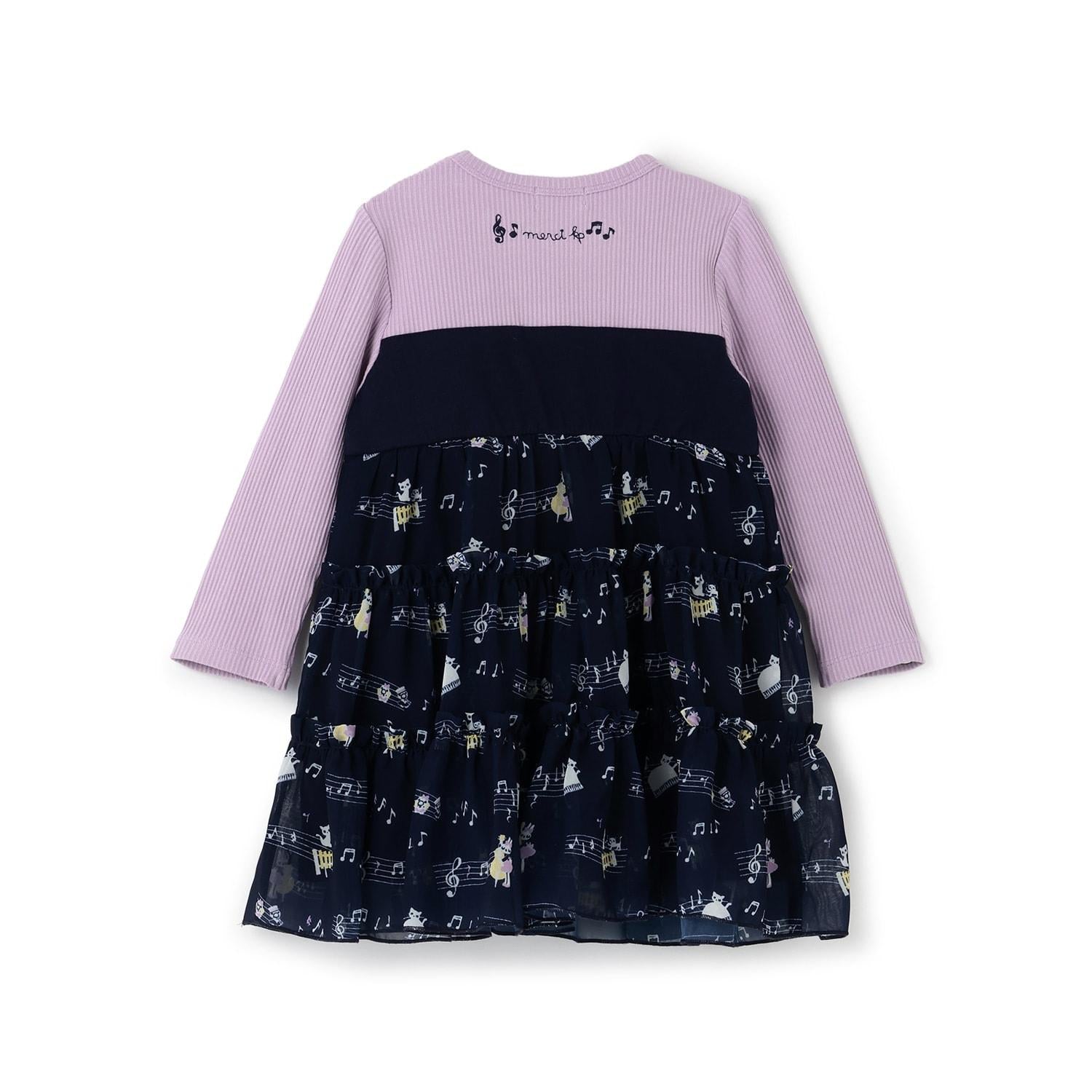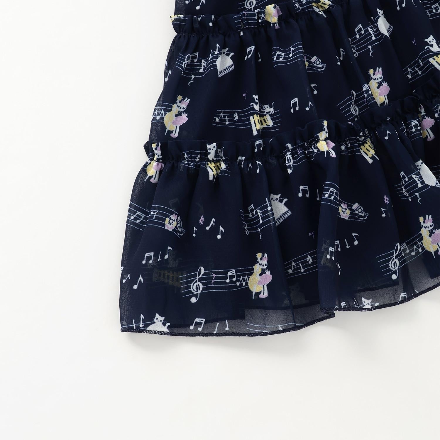 雪紡層疊式連衣裙,印有 MIMI 作為音樂家、鋼琴和五線譜的圖案。半身裙式的過渡部分印有可可的臉部圖案和可愛的裝飾。90 厘米版的左肩開口。