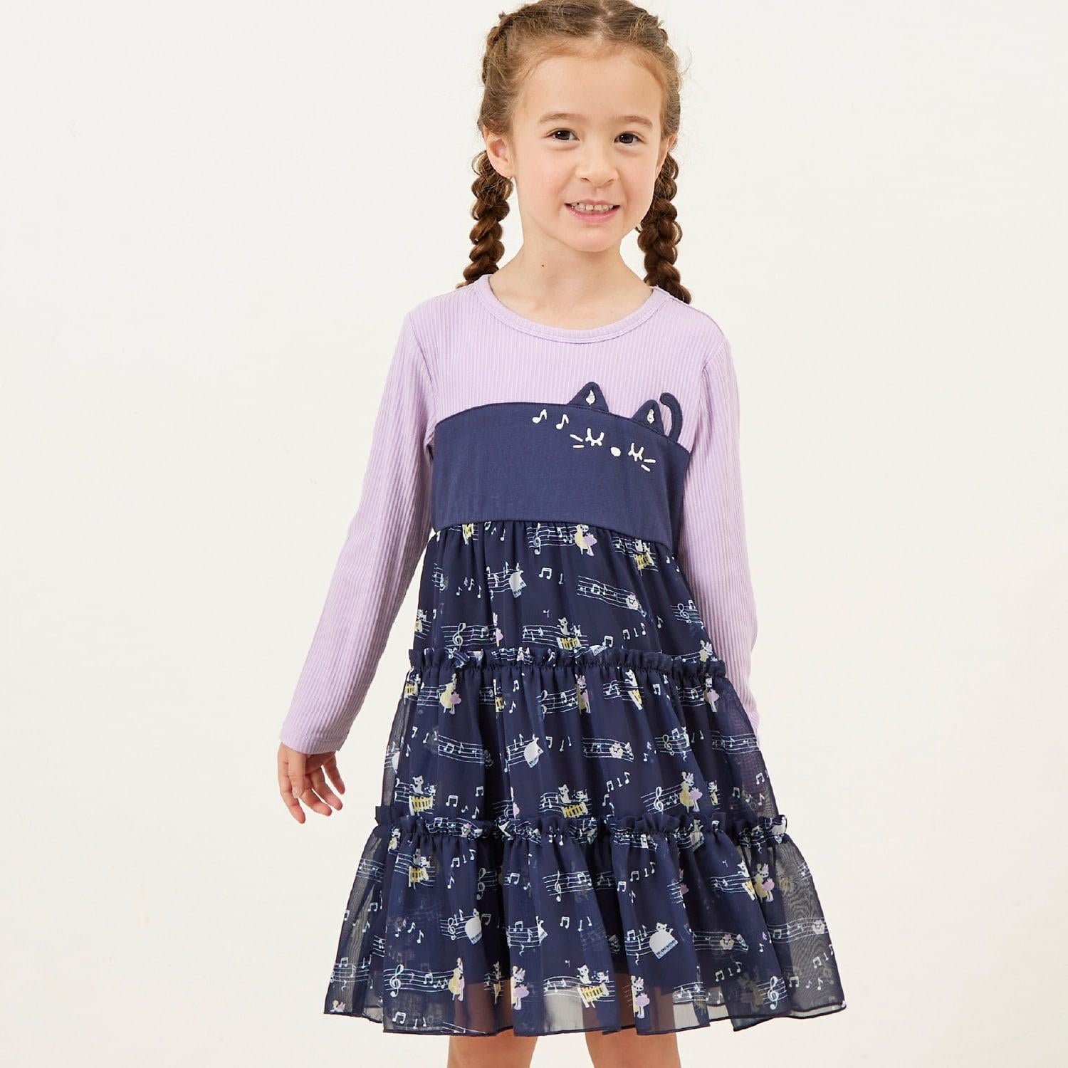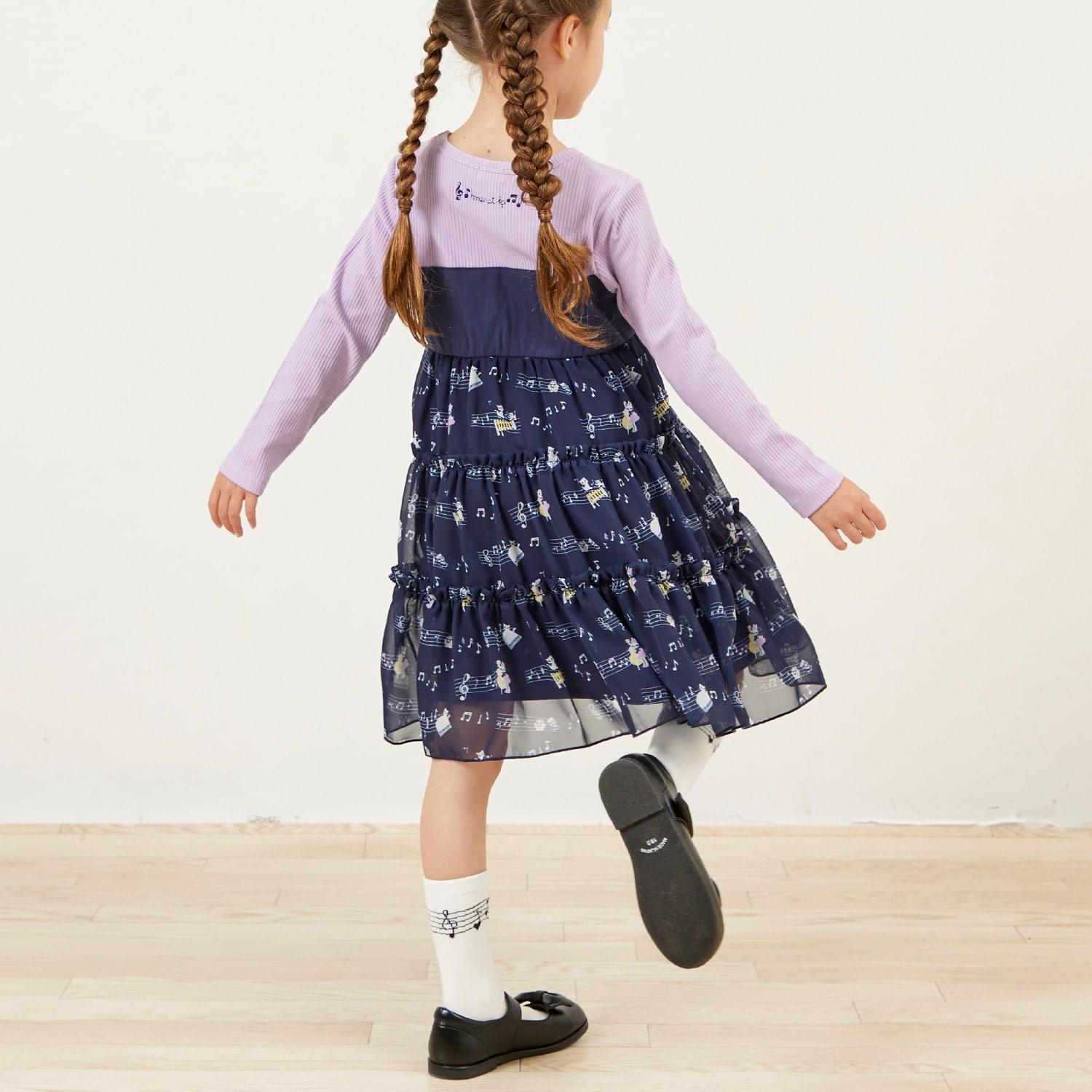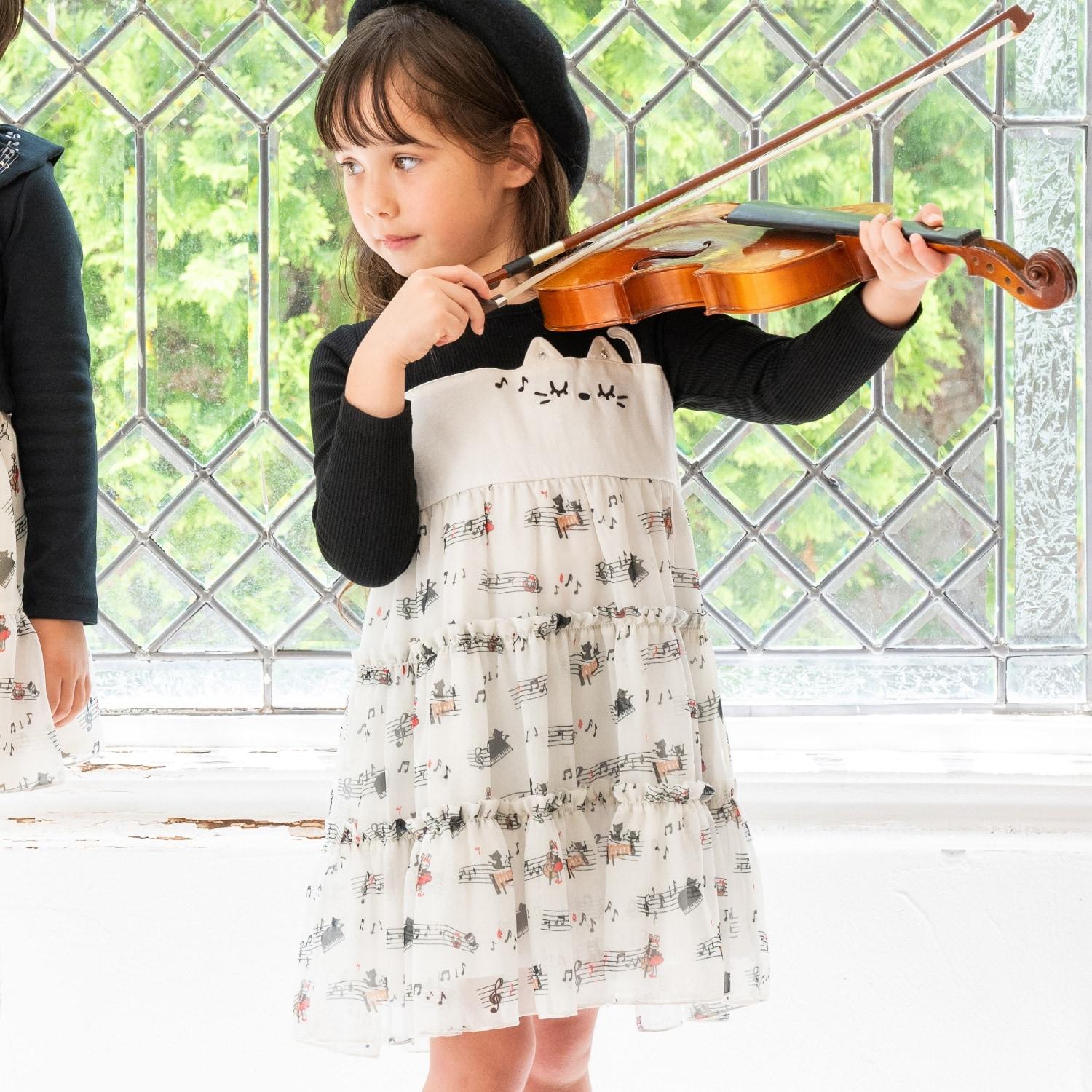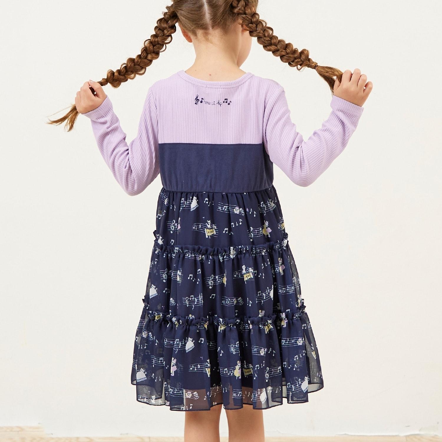 雪紡層疊式連衣裙,印有 MIMI 作為音樂家、鋼琴和五線譜的圖案。半身裙式的過渡部分印有可可的臉部圖案和可愛的裝飾。90 厘米版的左肩開口。