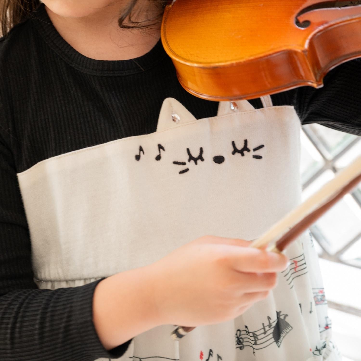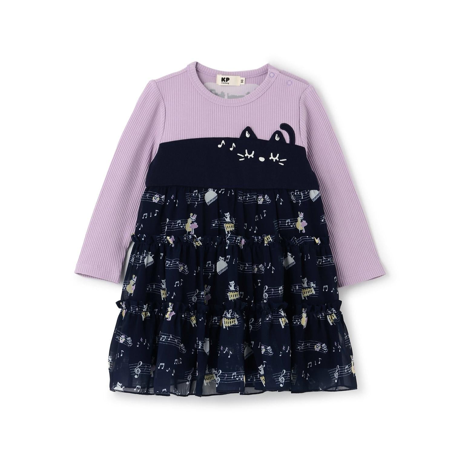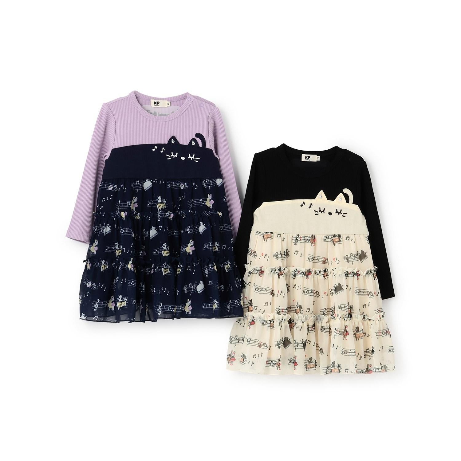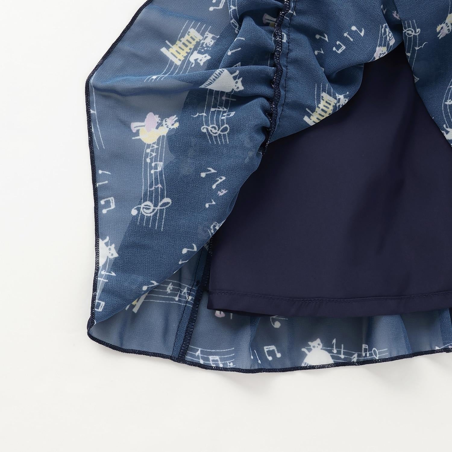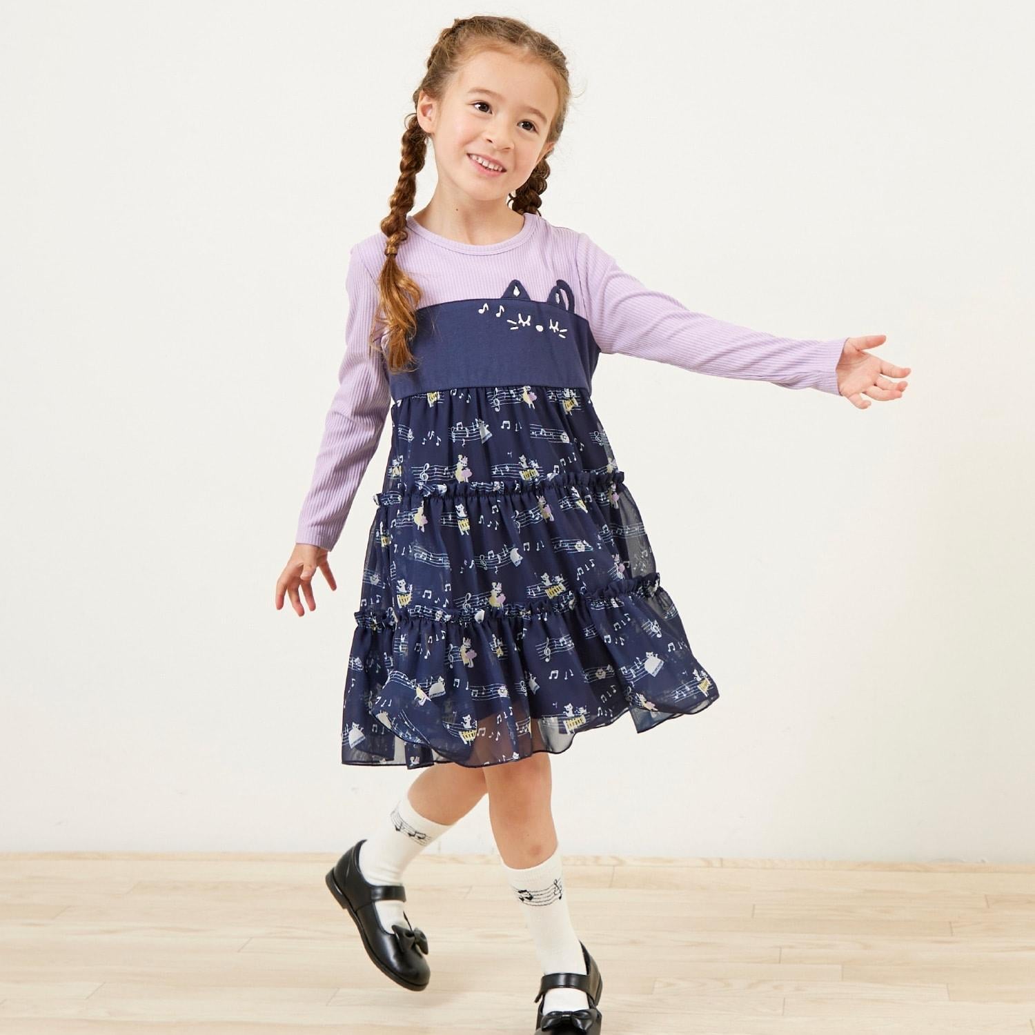 雪紡層疊式連衣裙,印有 MIMI 作為音樂家、鋼琴和五線譜的圖案。半身裙式的過渡部分印有可可的臉部圖案和可愛的裝飾。90 厘米版的左肩開口。