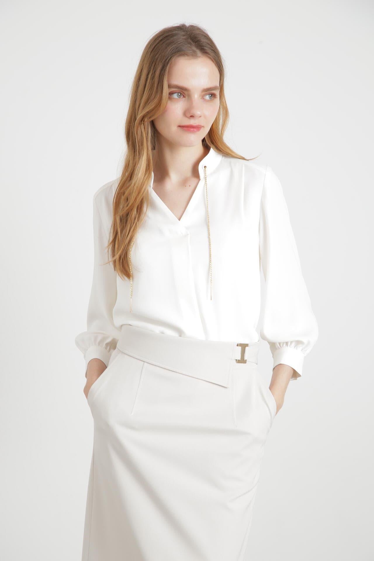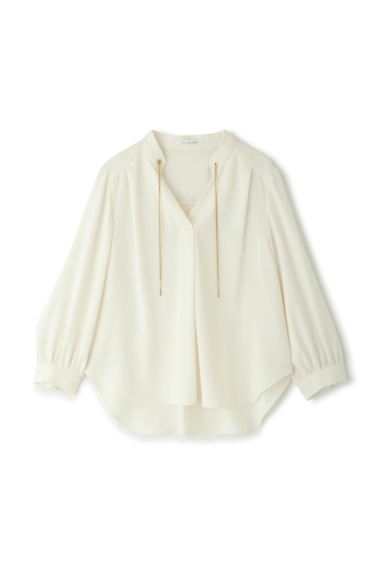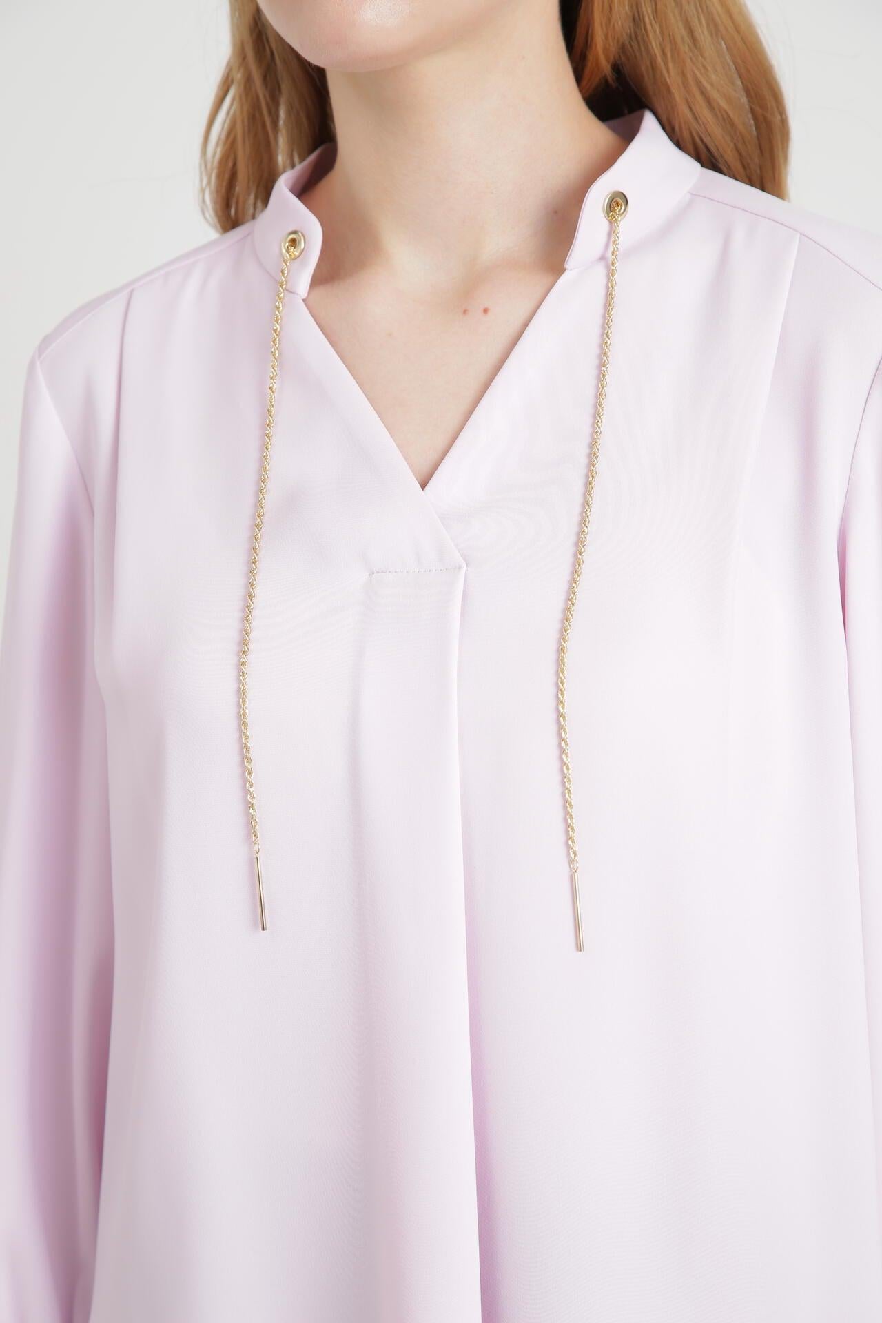 這款上衣的立領設計非常醒目,領口有鴿子孔和鏈條。立領簡潔的 V 字領口在頸部顯得非常美觀,將前軛收起後,輪廓就有了恰到好處的空間。鏈條可拆卸,因此可以安全洗滌。