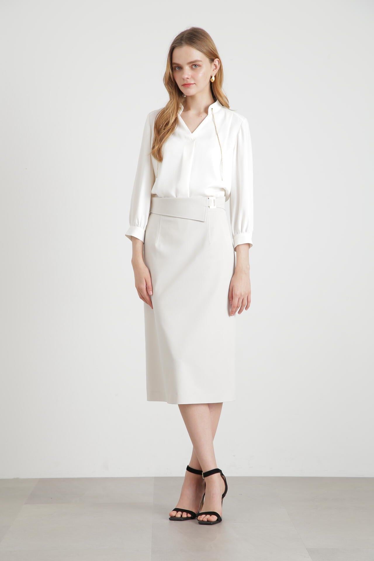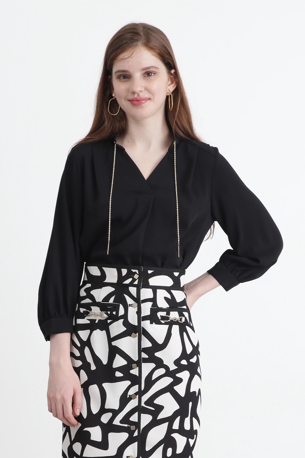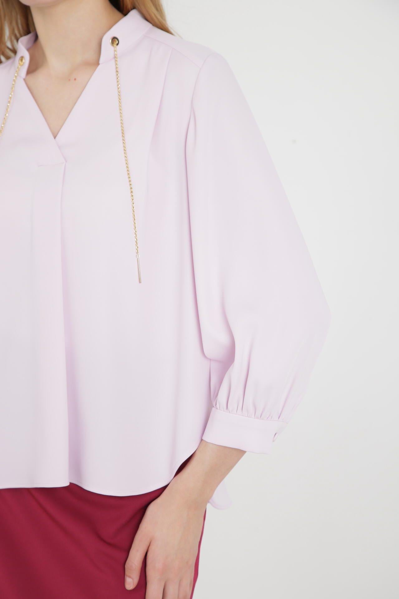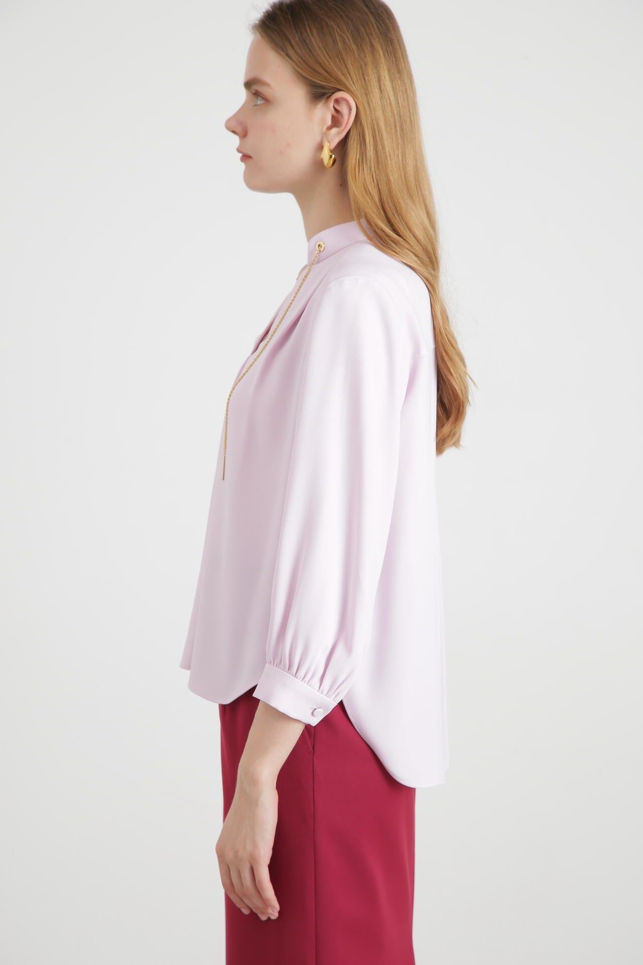 這款上衣的立領設計非常醒目,領口有鴿子孔和鏈條。立領簡潔的 V 字領口在頸部顯得非常美觀,將前軛收起後,輪廓就有了恰到好處的空間。鏈條可拆卸,因此可以安全洗滌。