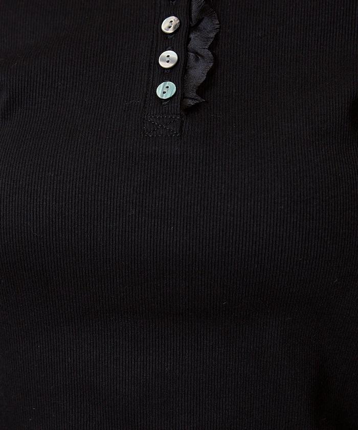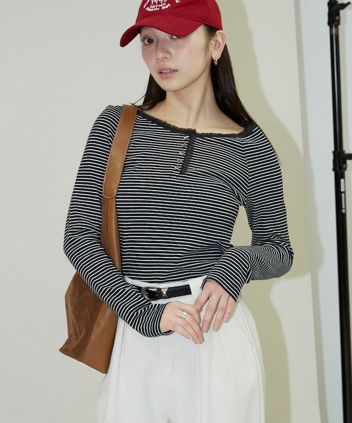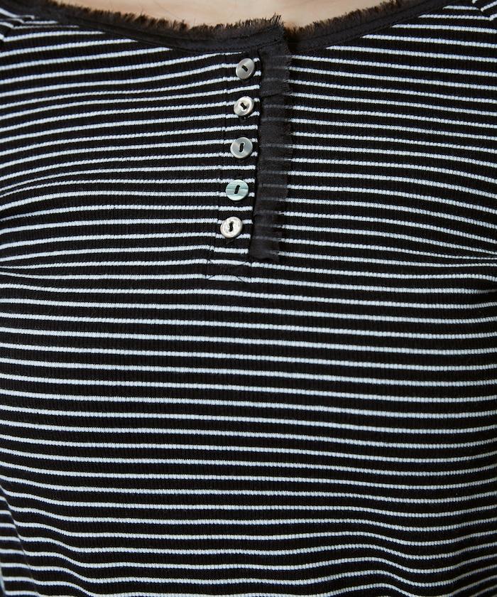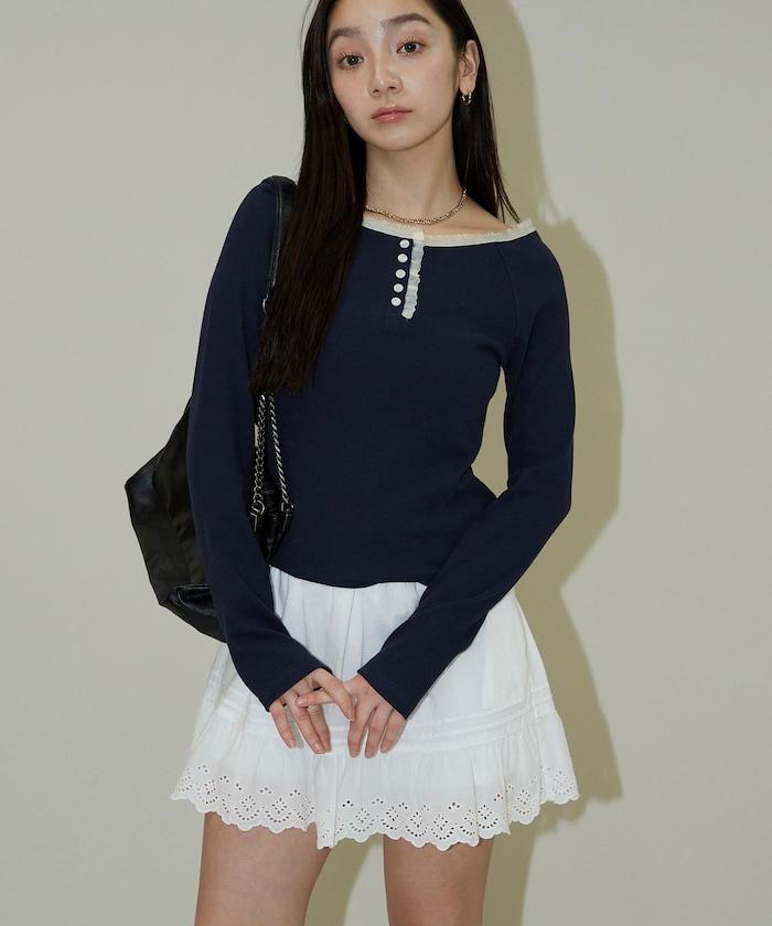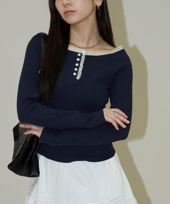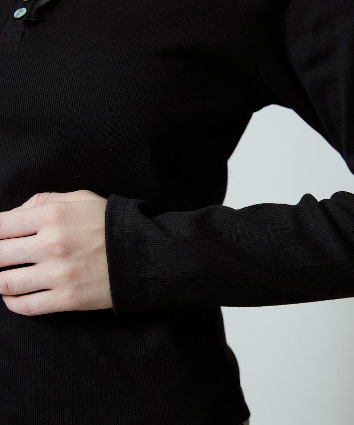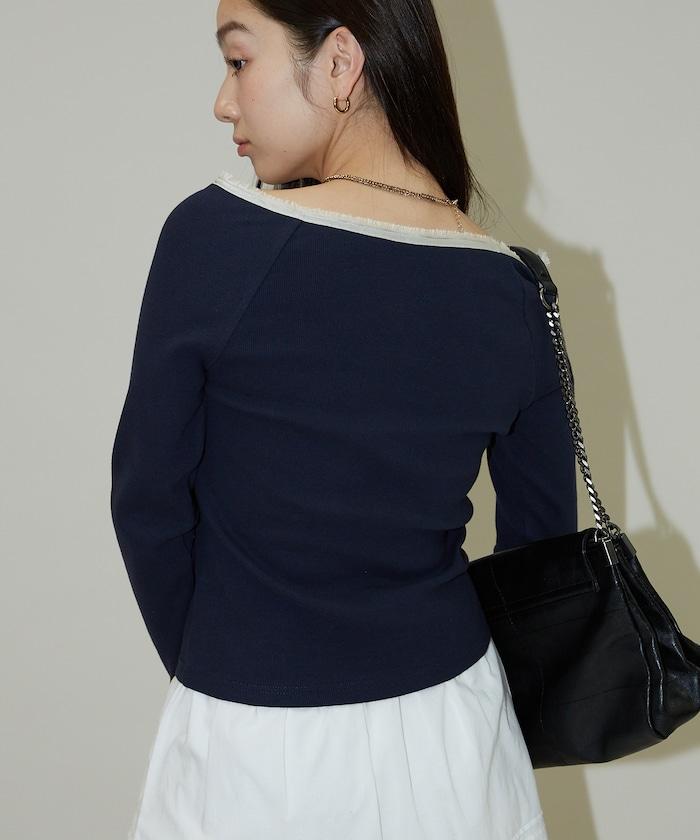 羅紋上衣,採用雞心領設計,衣領處有微妙的彩色編碼細節。