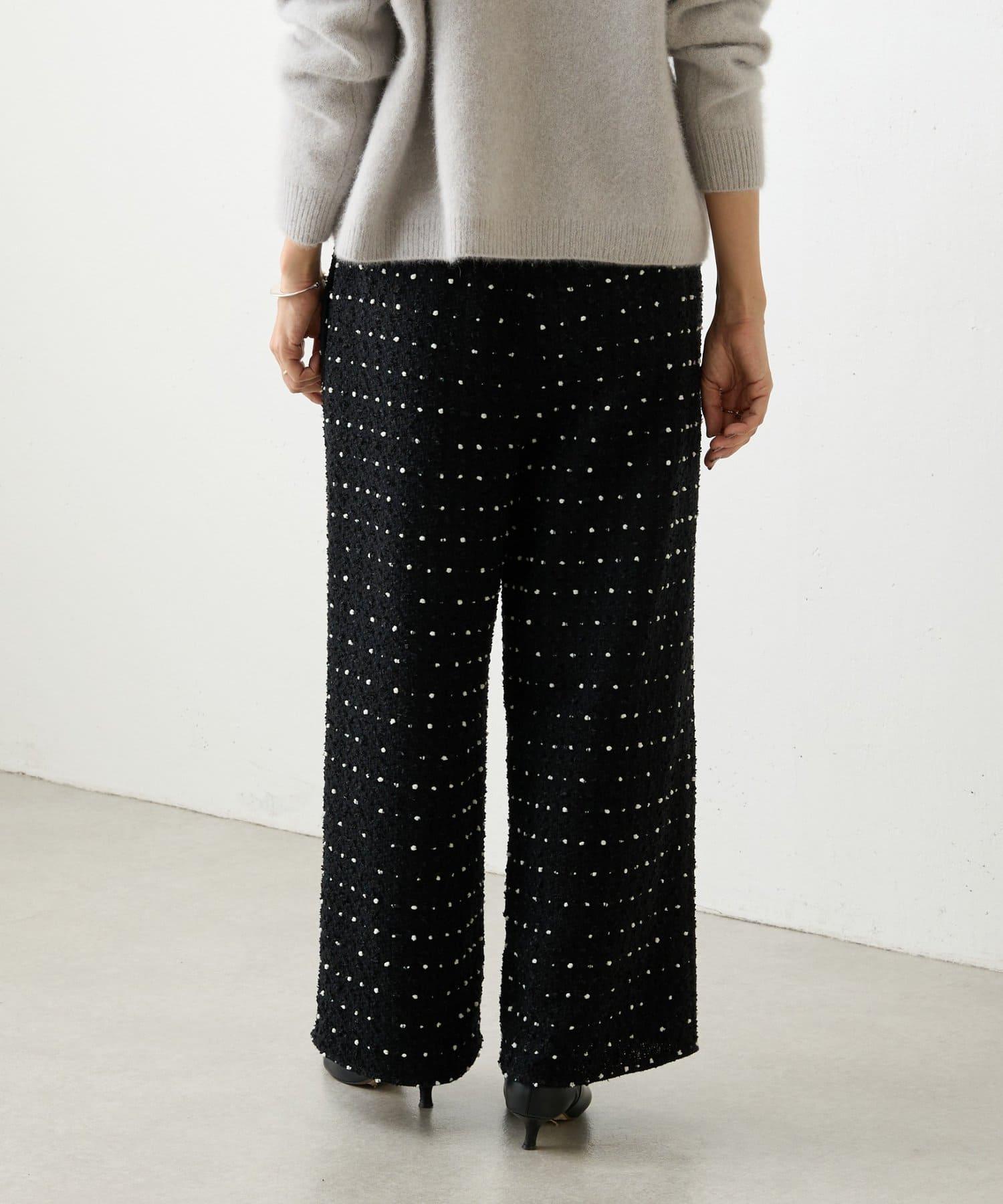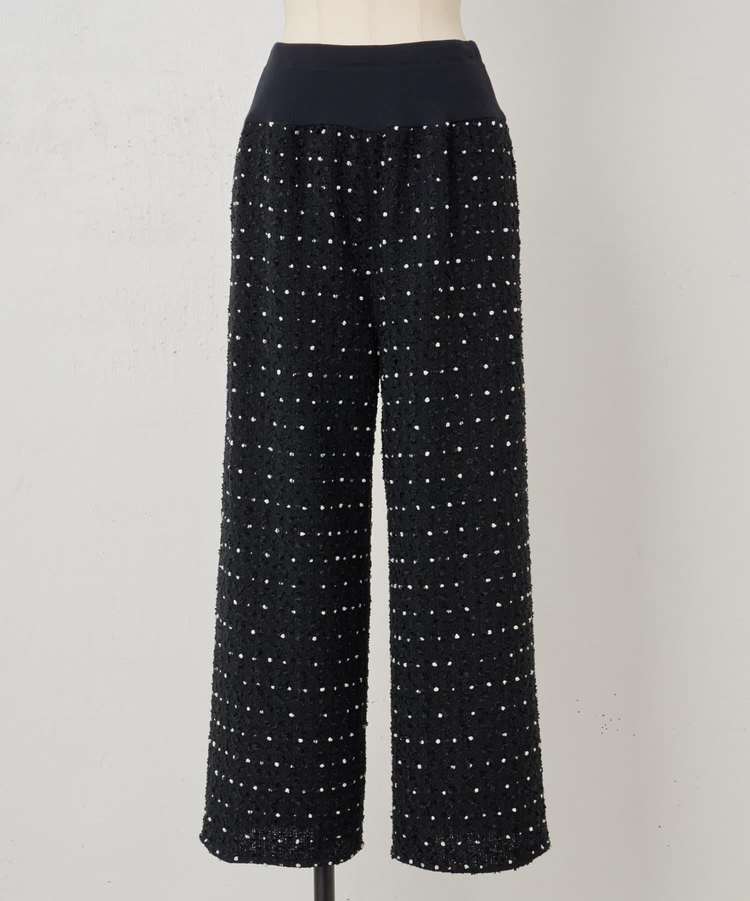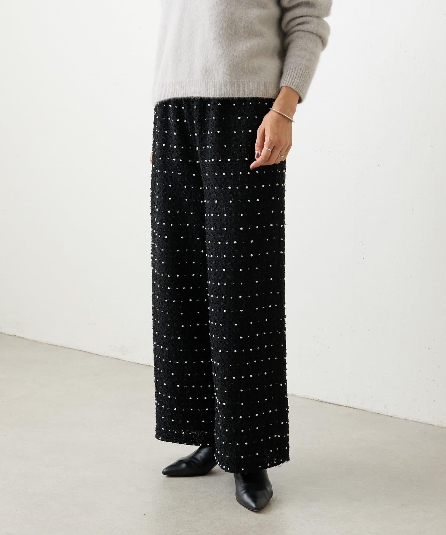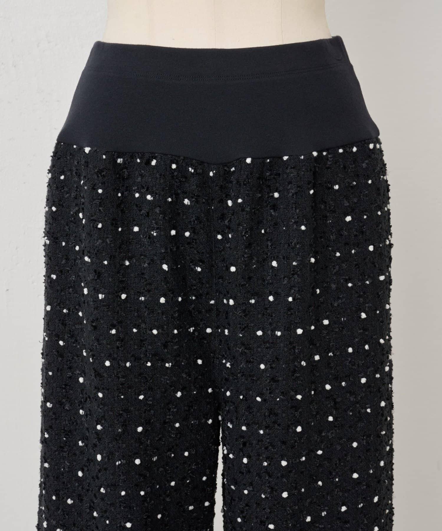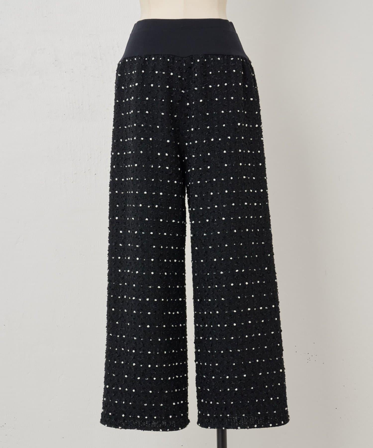 優雅的粗花呢面料長褲,配以不同尺寸的白色碎花點綴。
