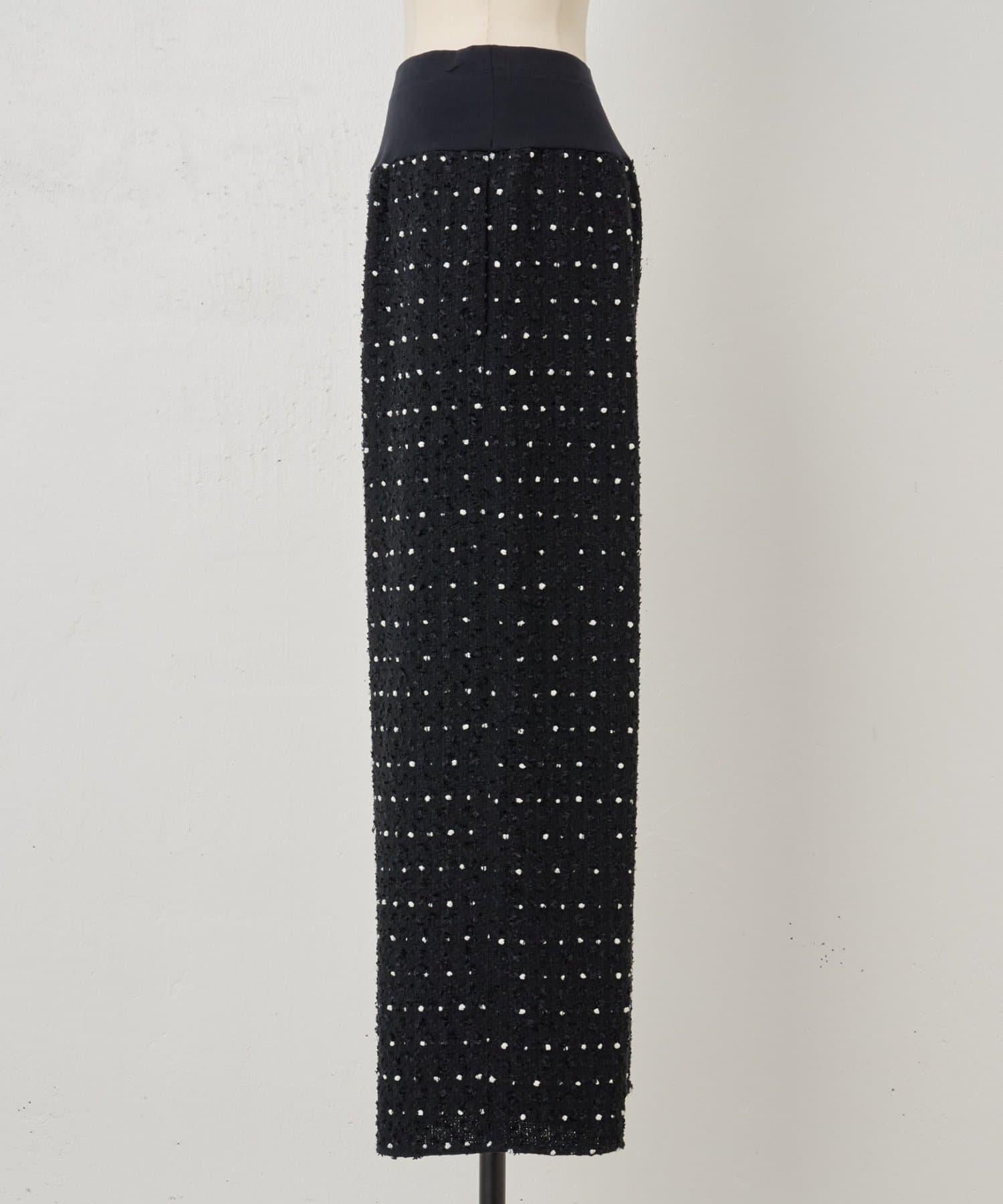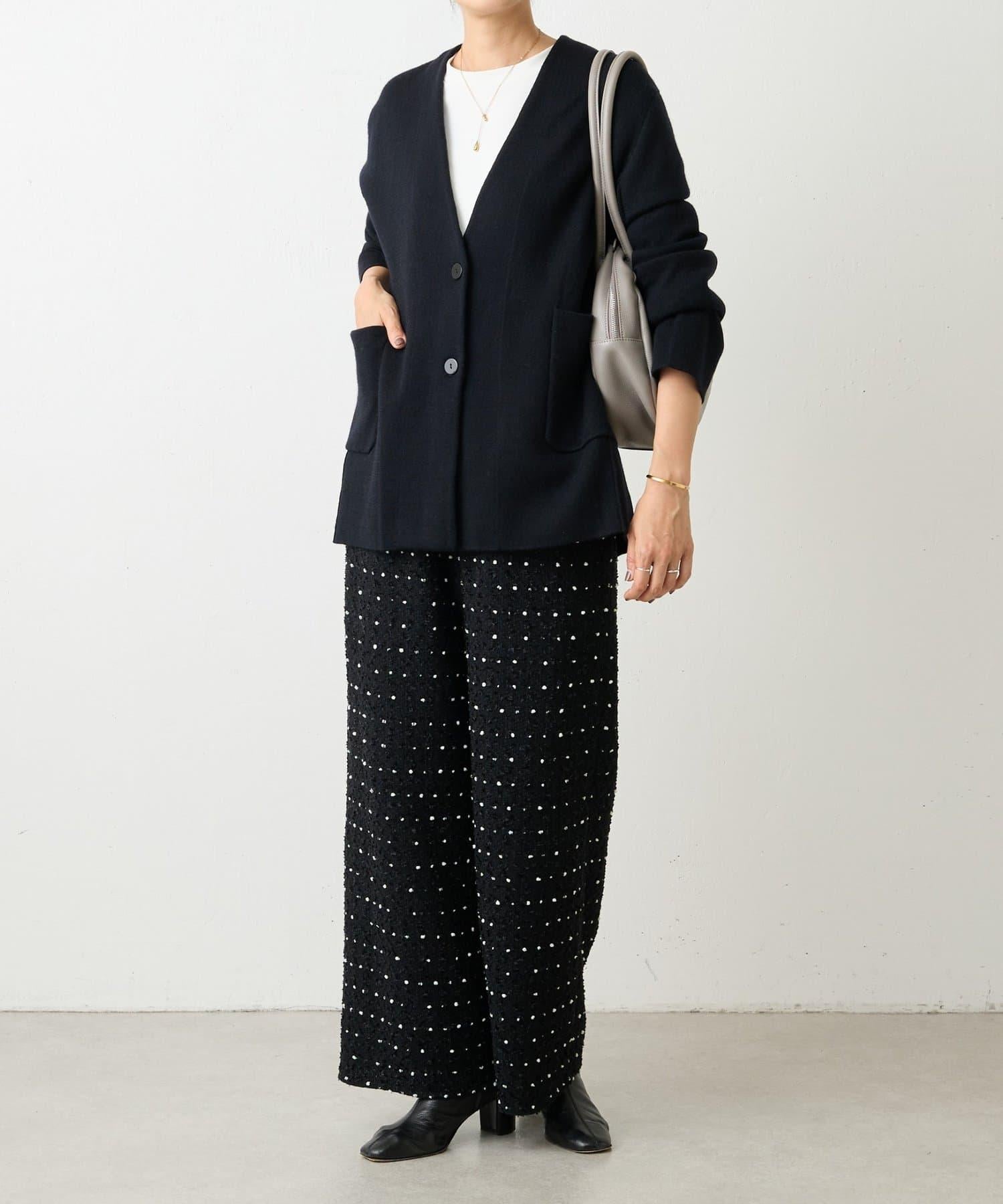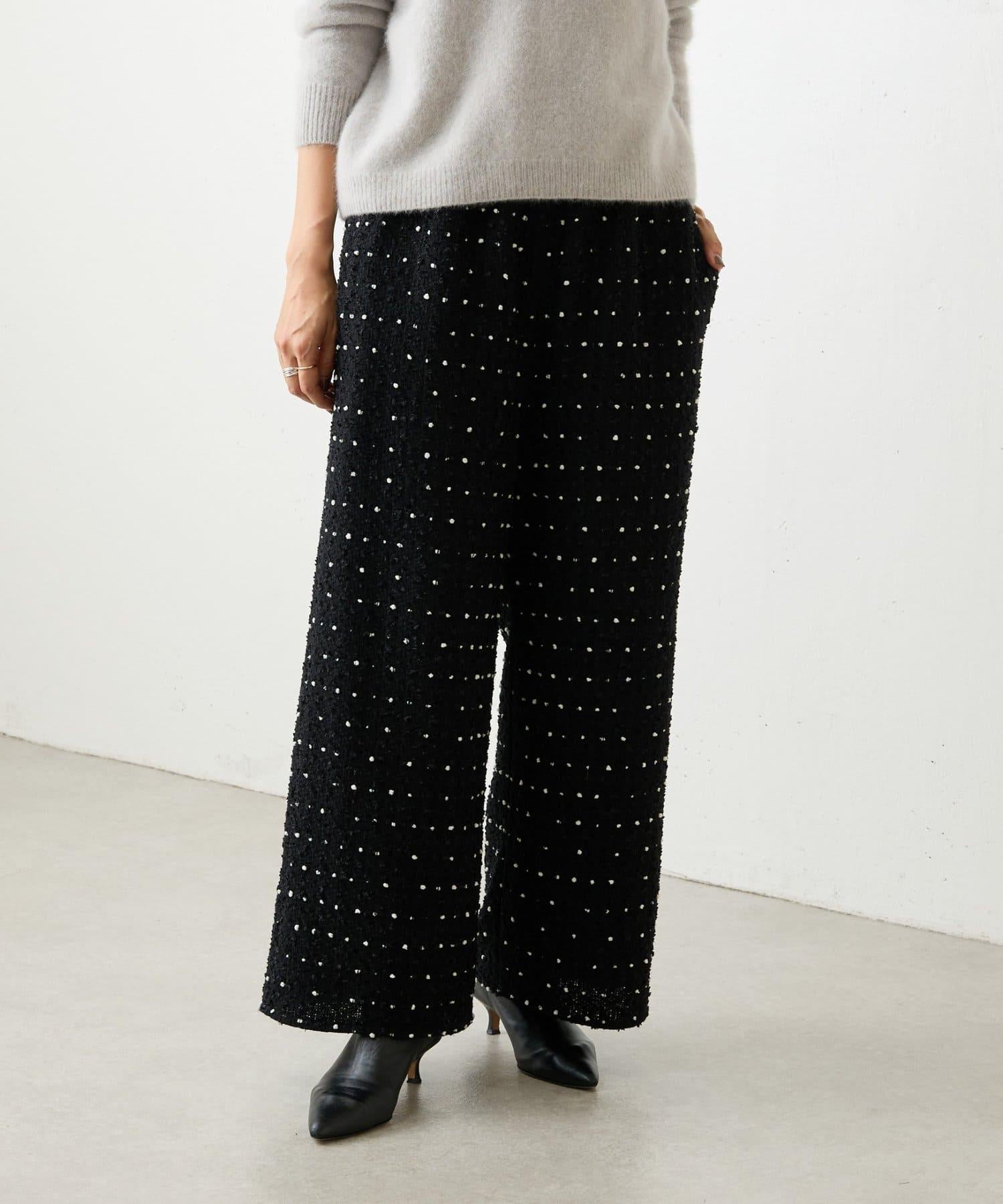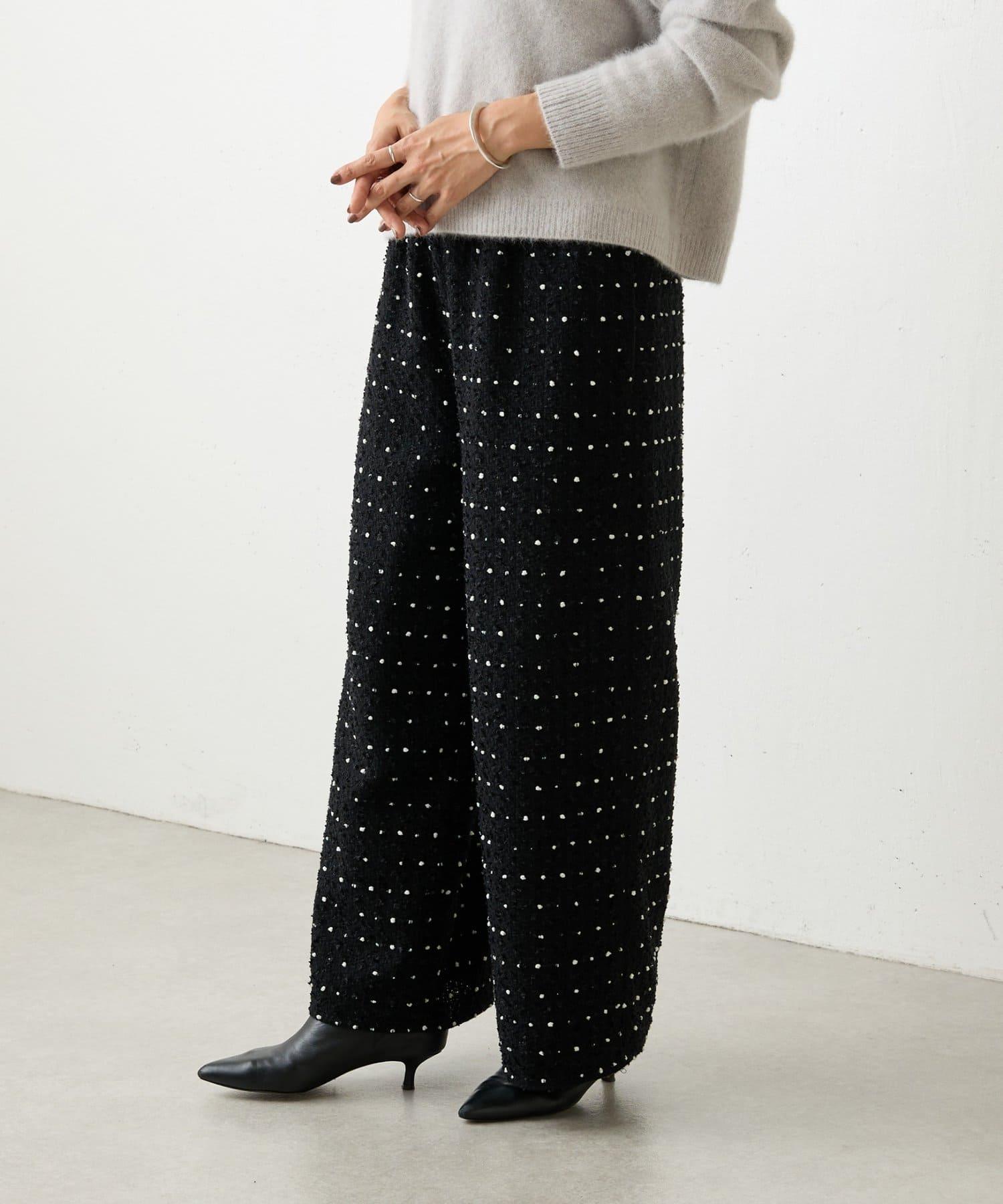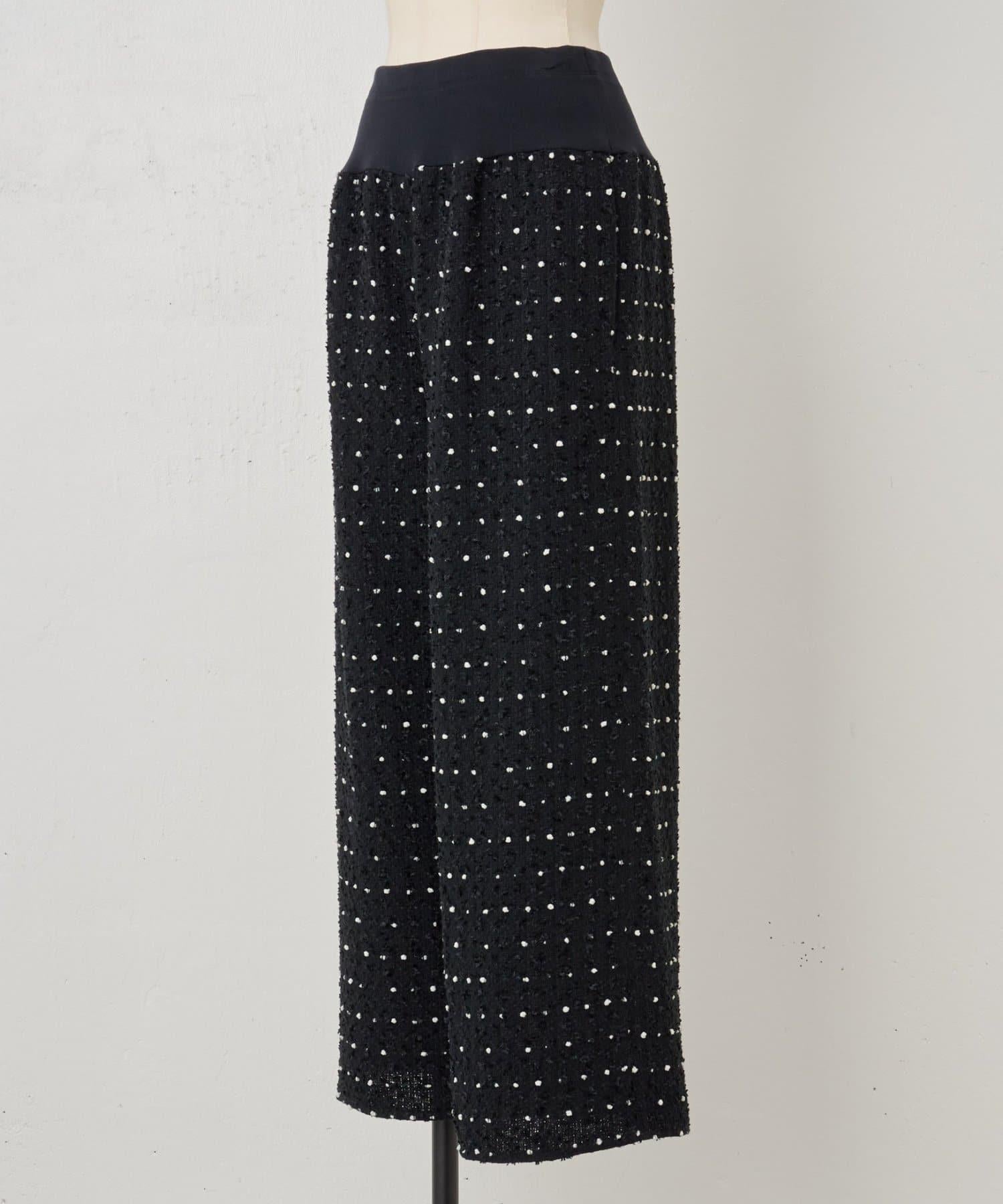 優雅的粗花呢面料長褲,配以不同尺寸的白色碎花點綴。