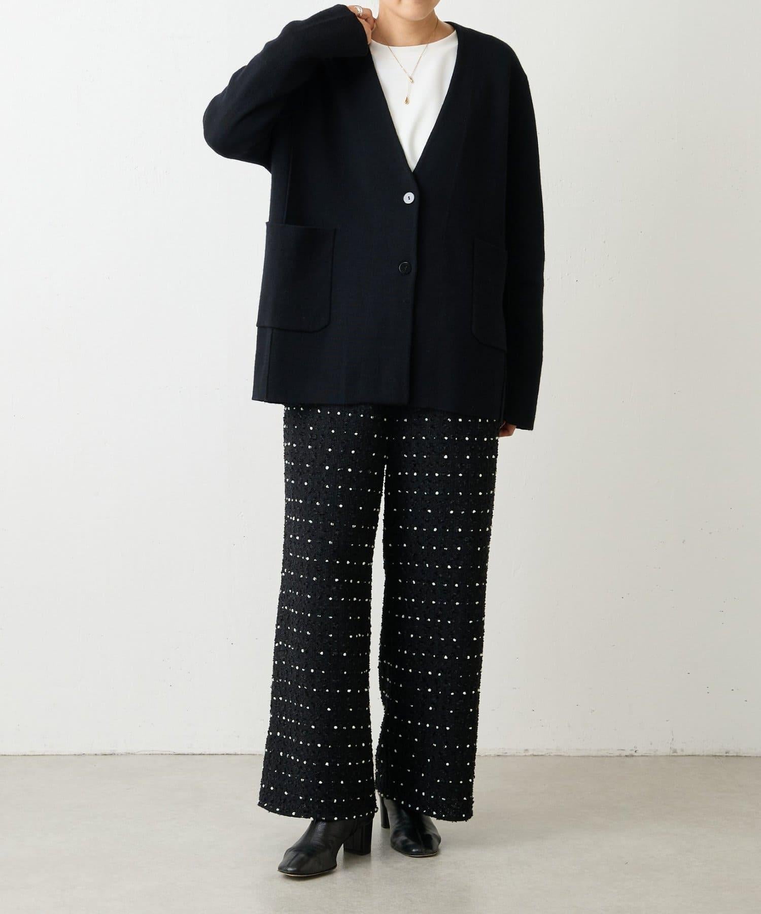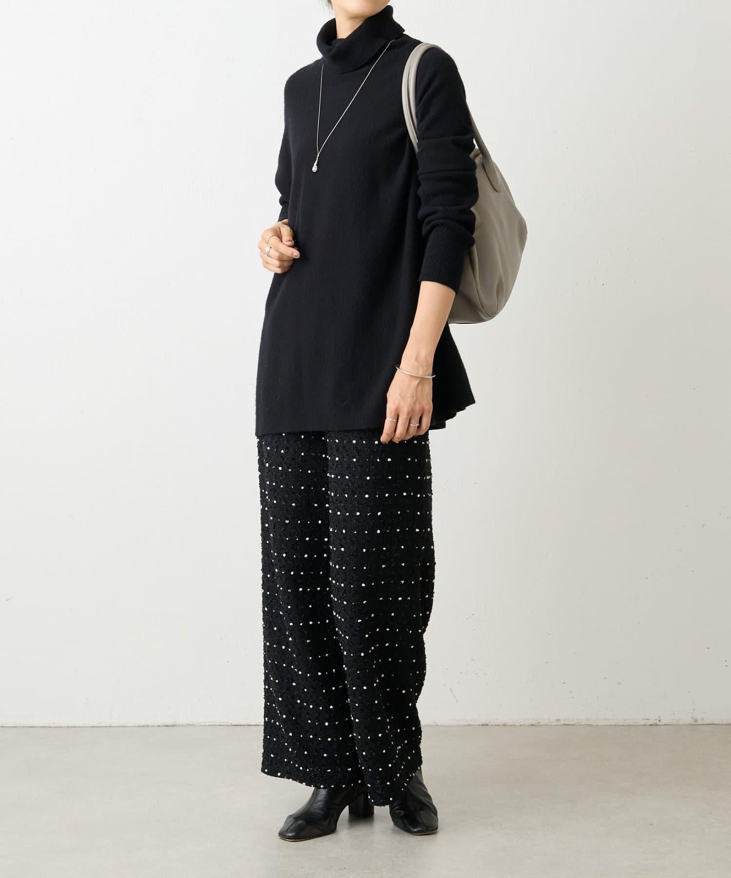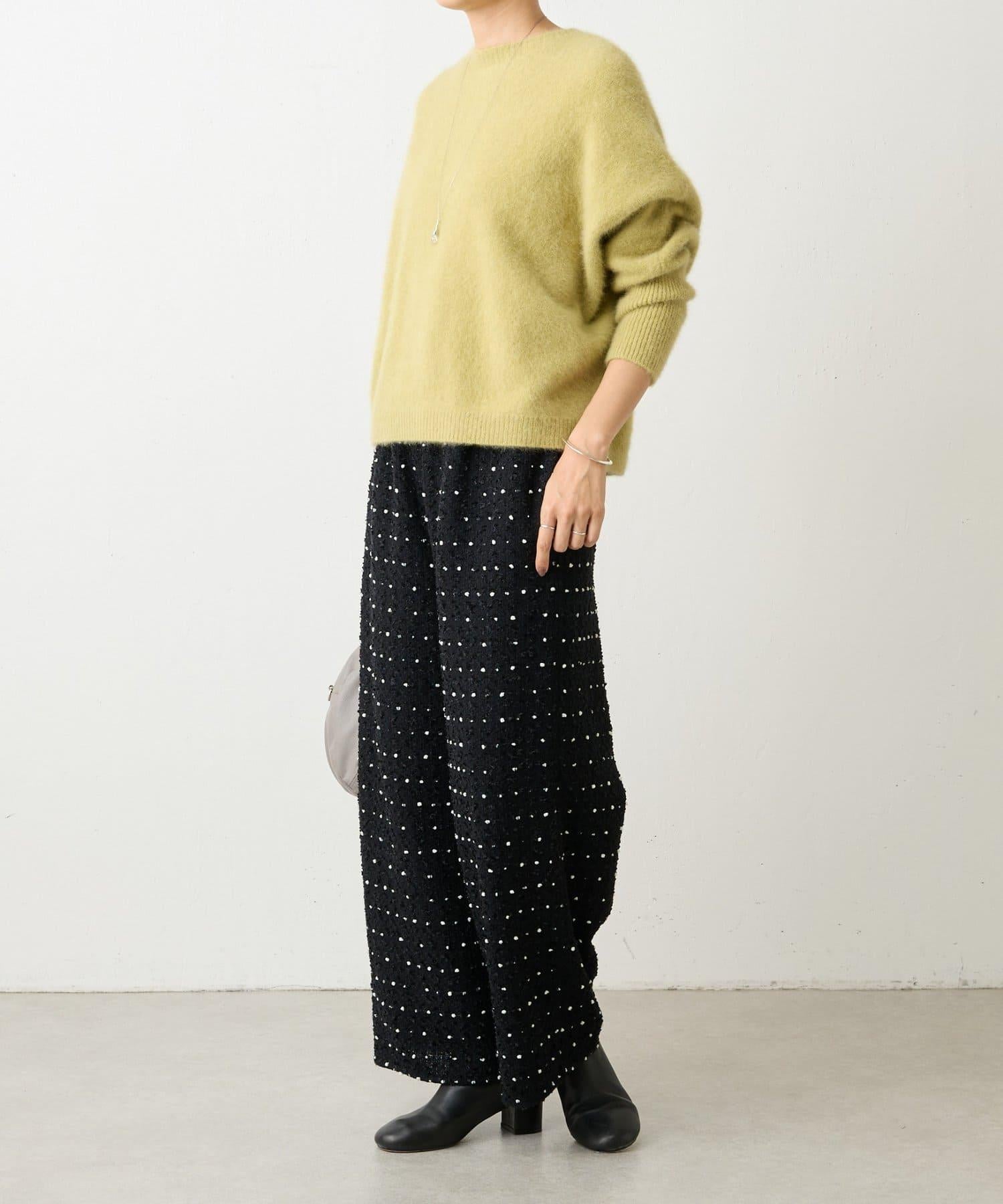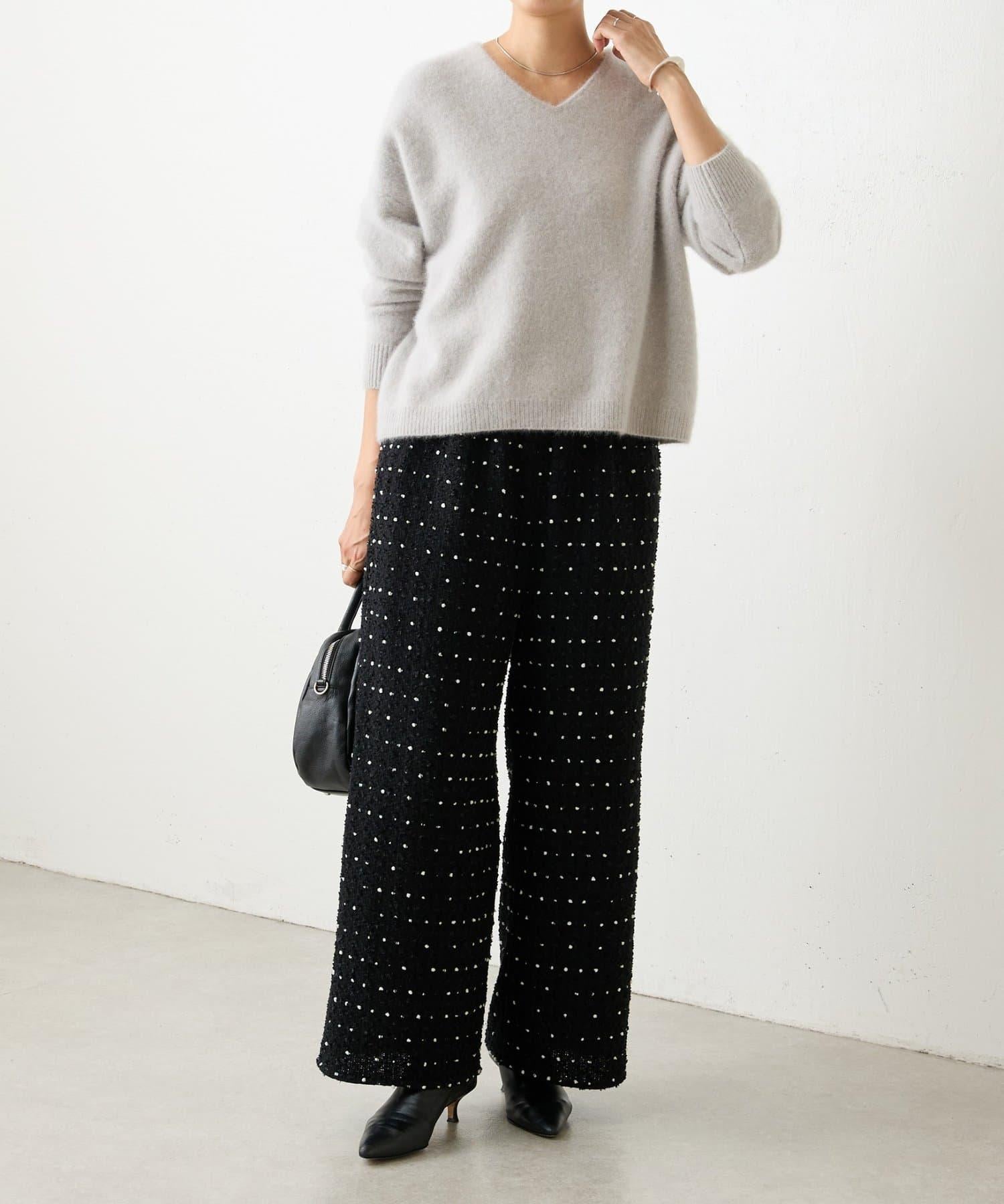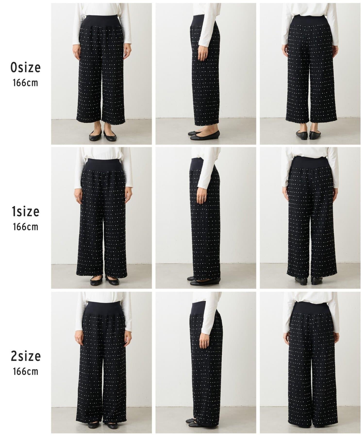 優雅的粗花呢面料長褲,配以不同尺寸的白色碎花點綴。