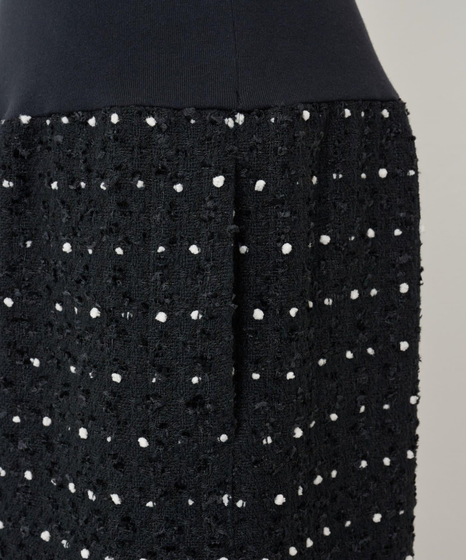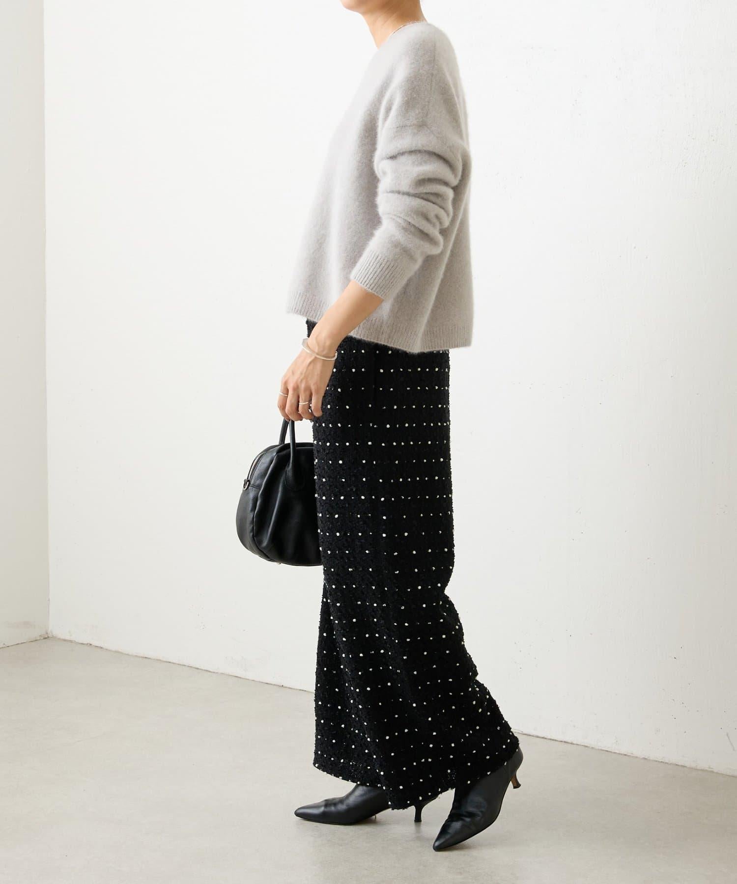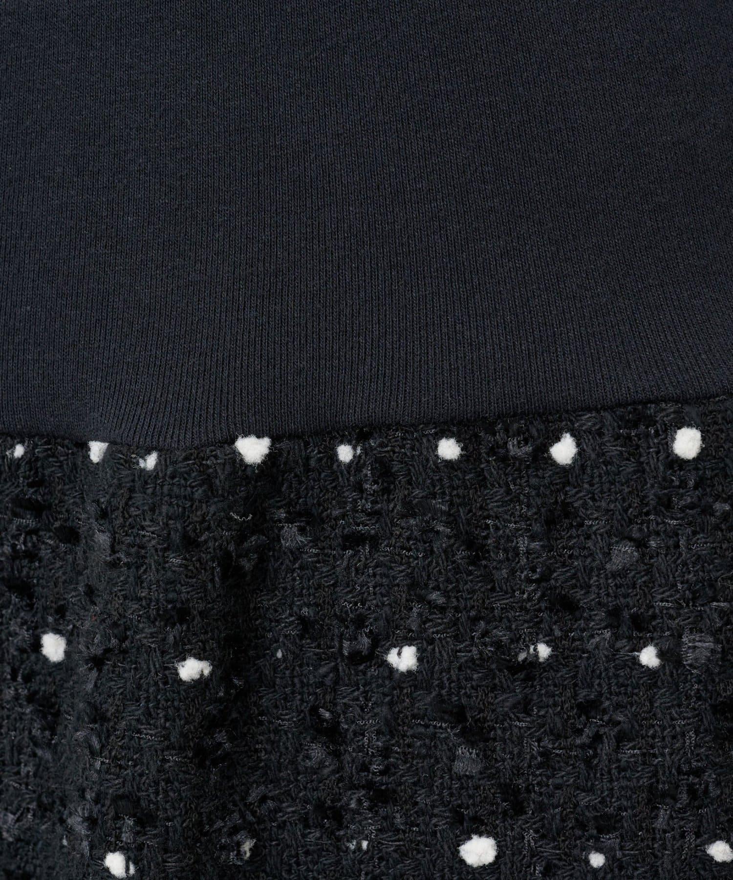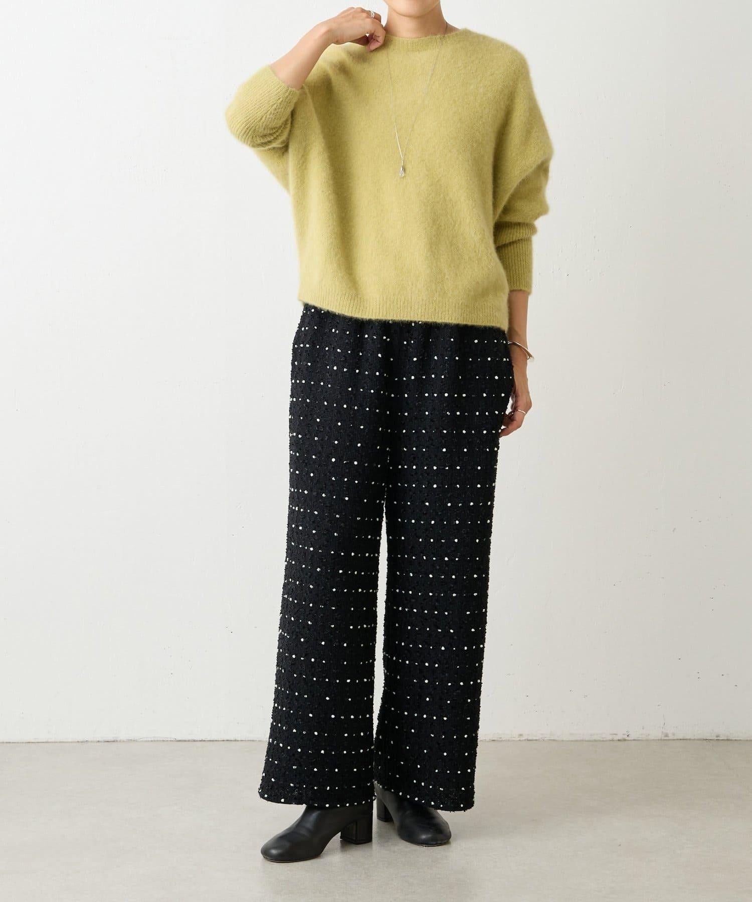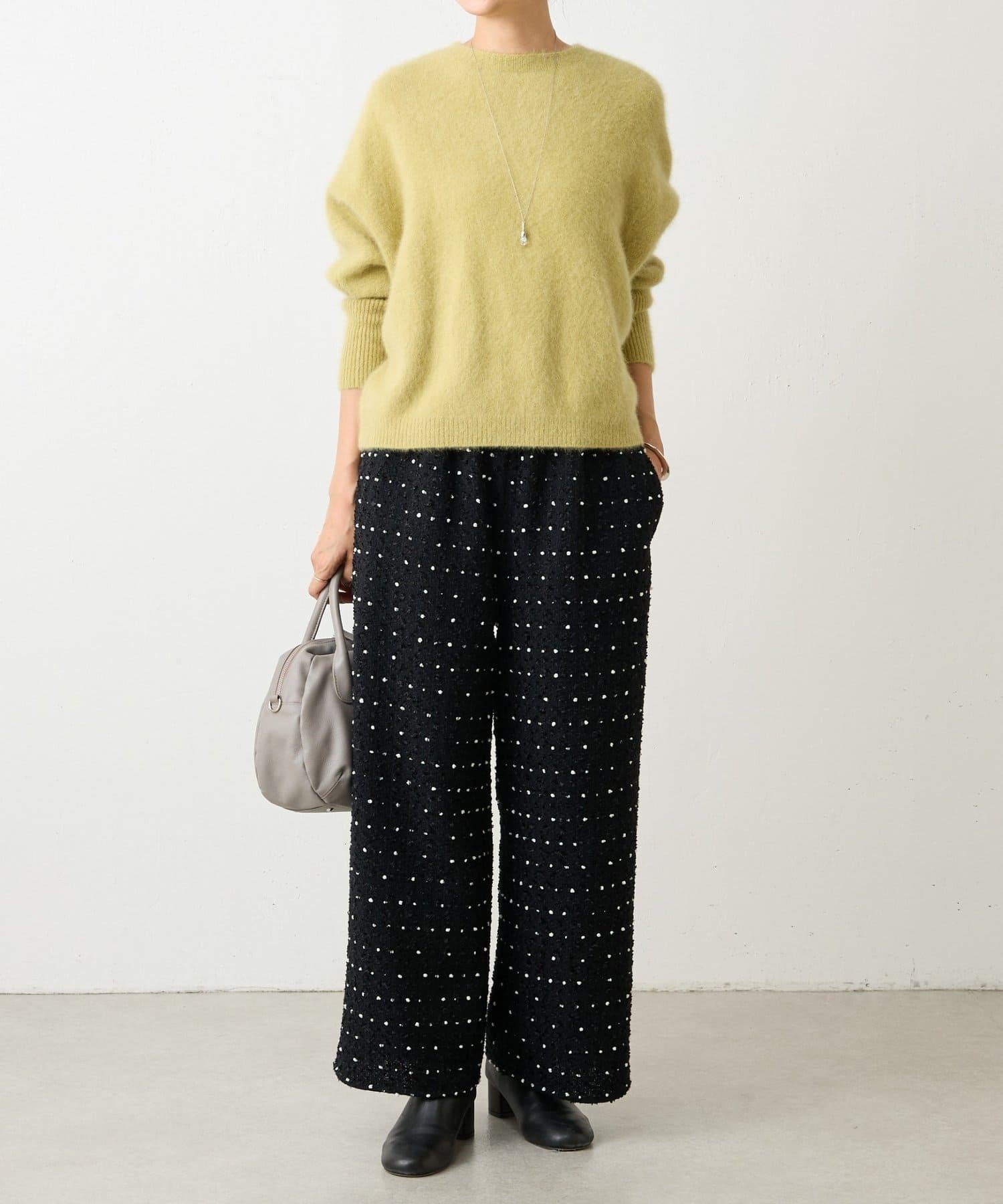 優雅的粗花呢面料長褲,配以不同尺寸的白色碎花點綴。