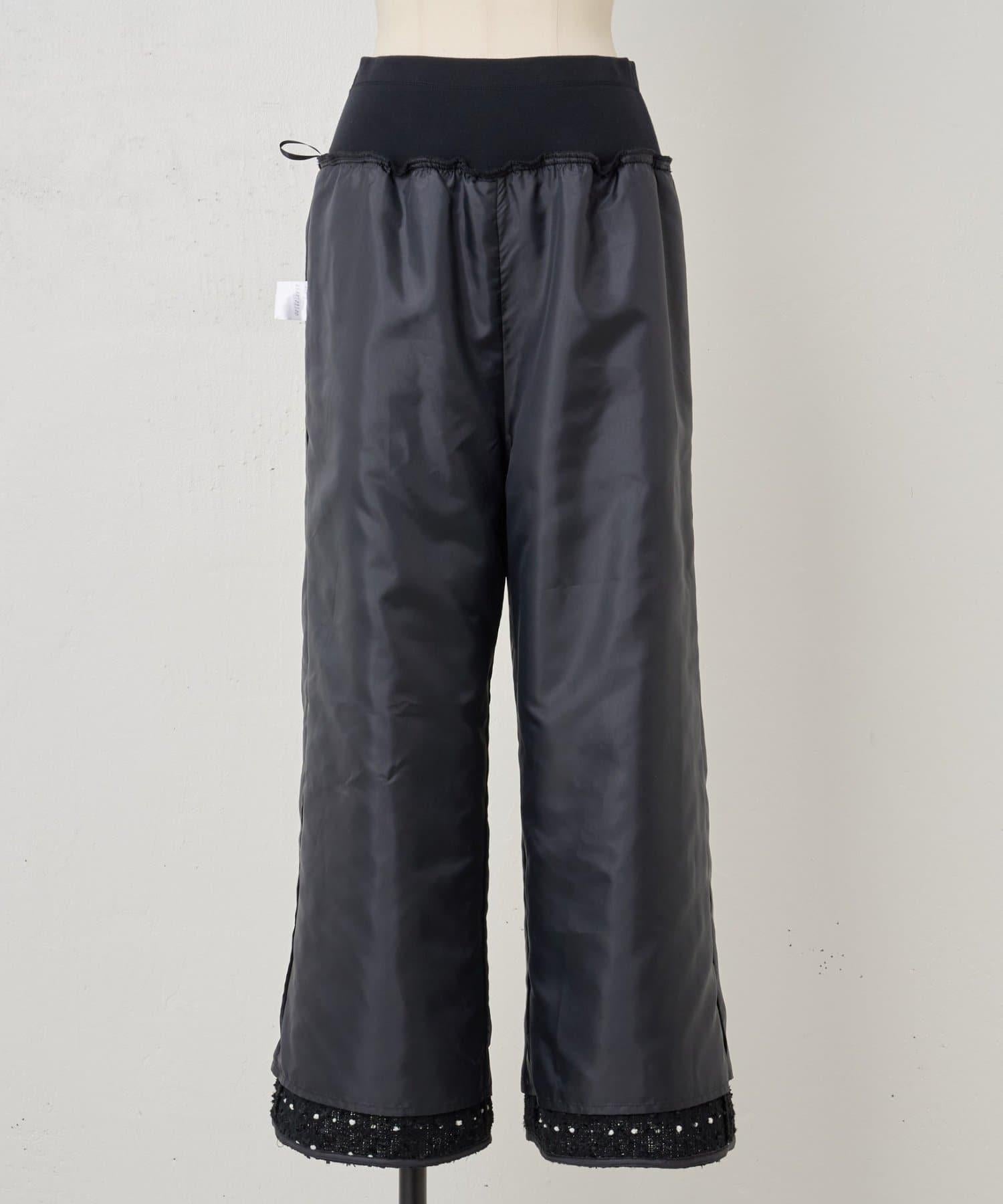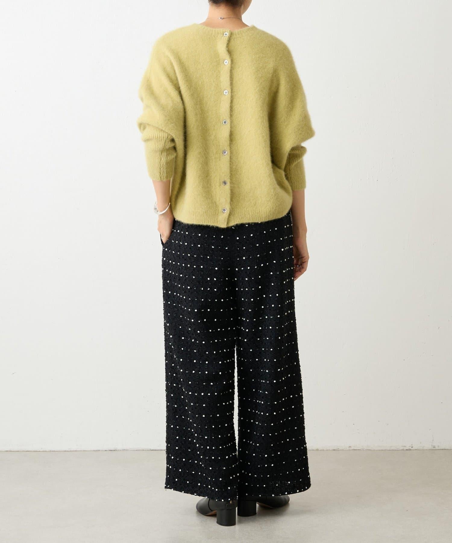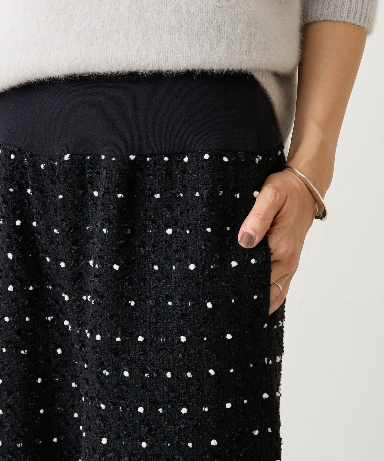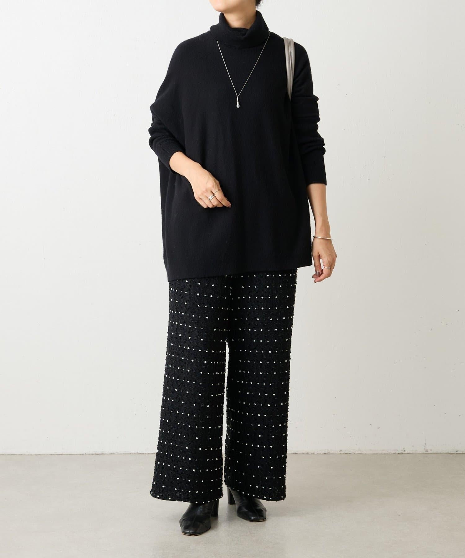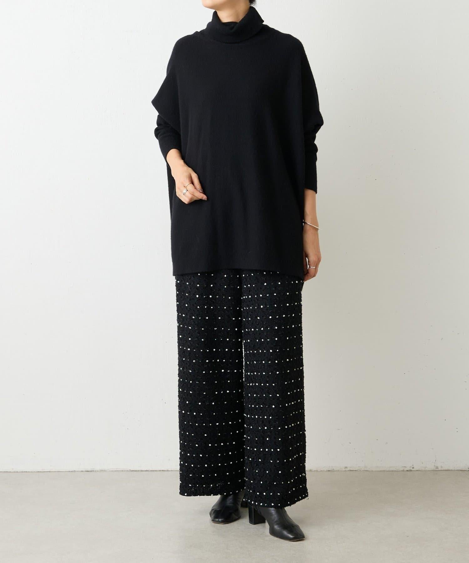 優雅的粗花呢面料長褲,配以不同尺寸的白色碎花點綴。