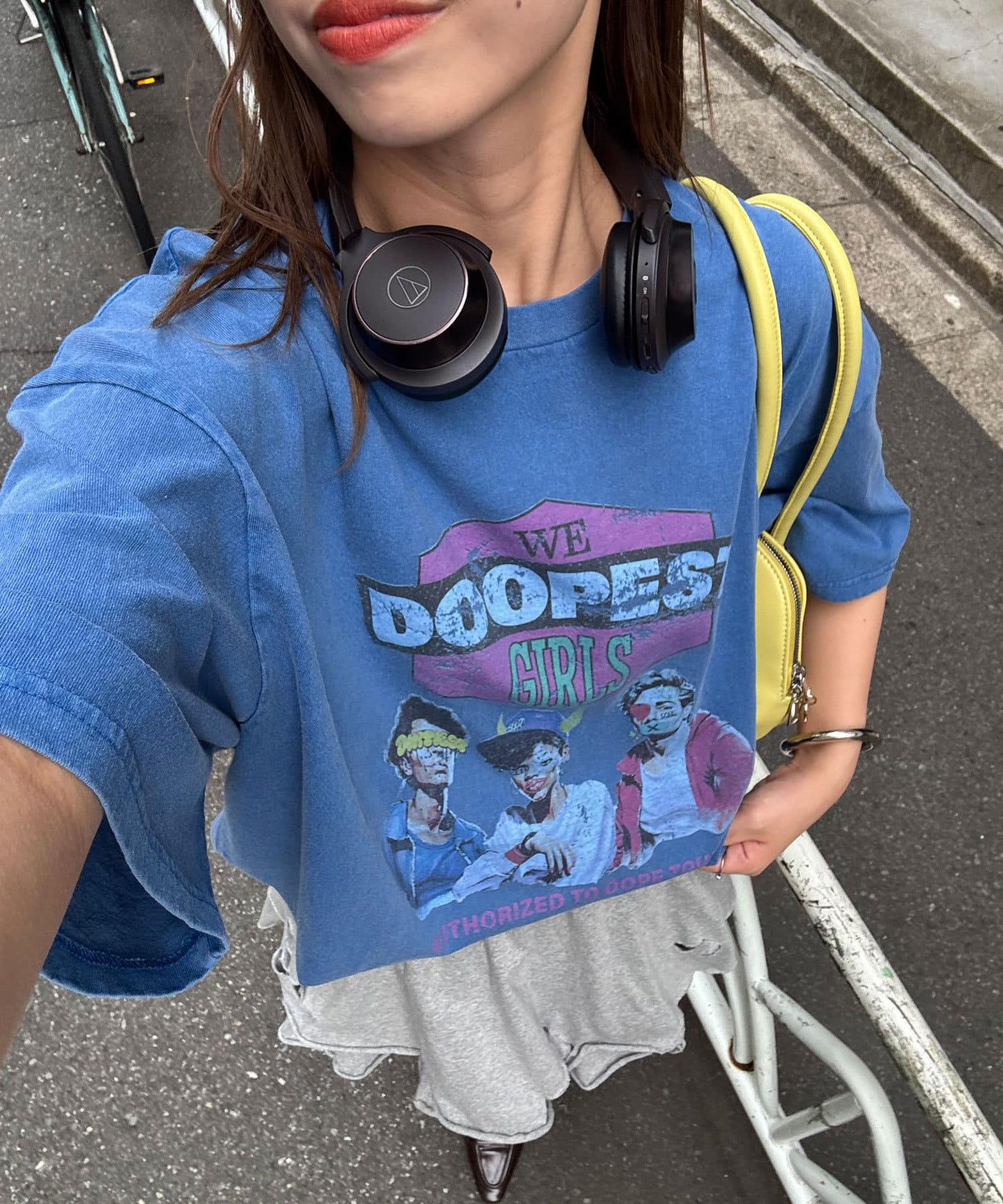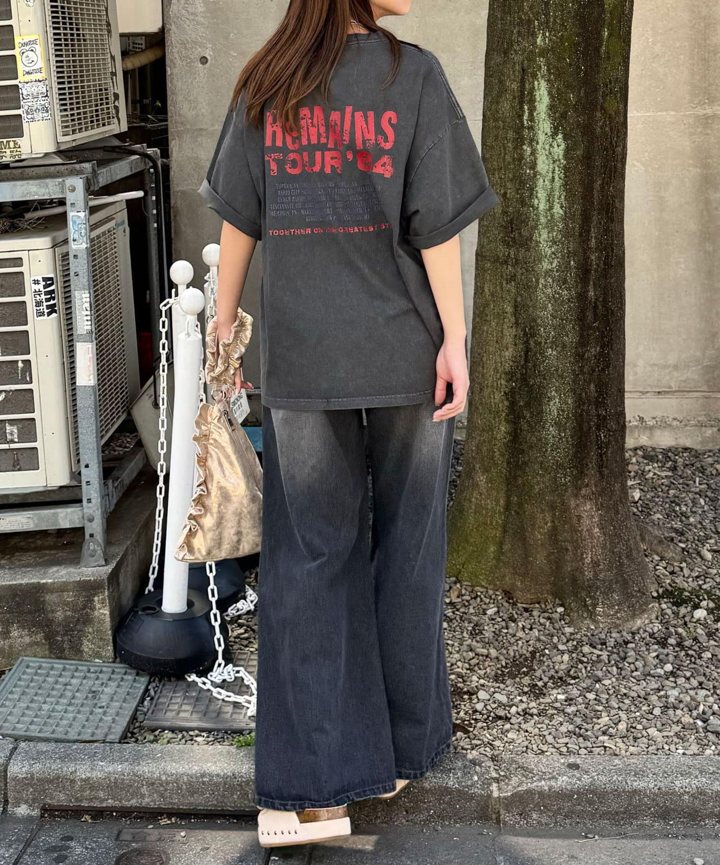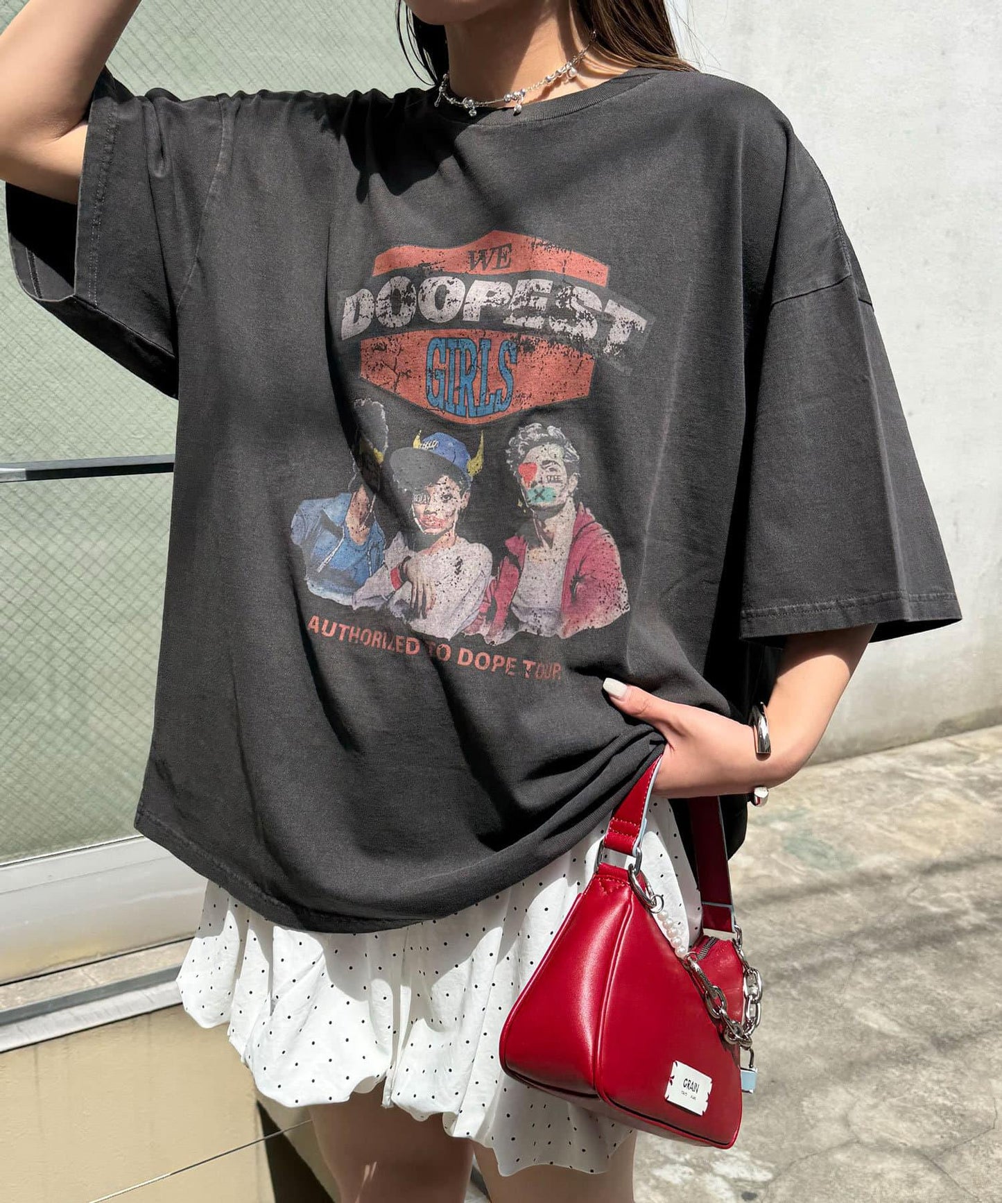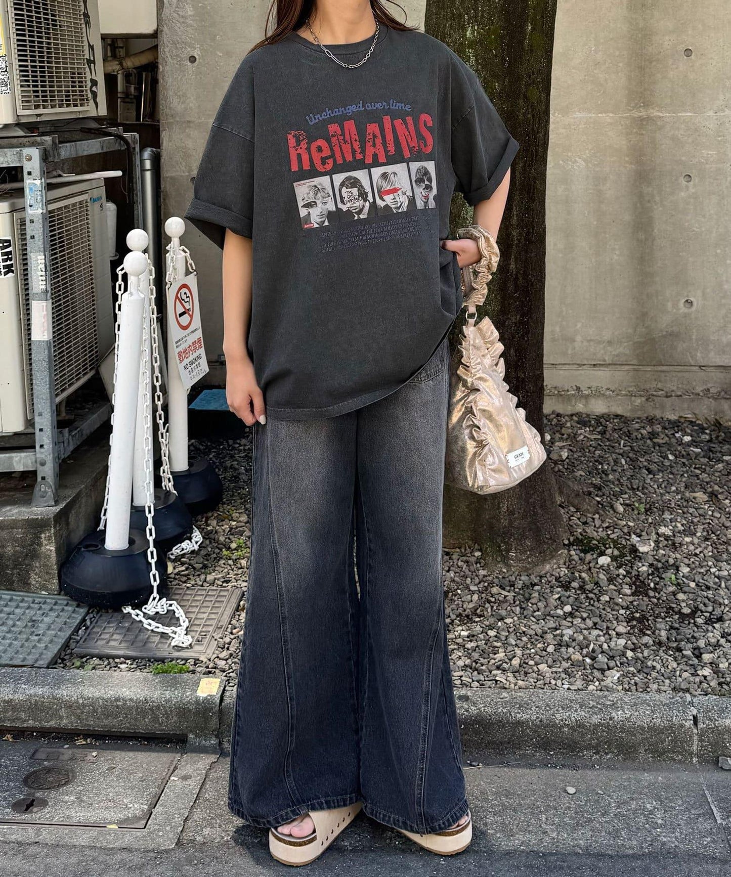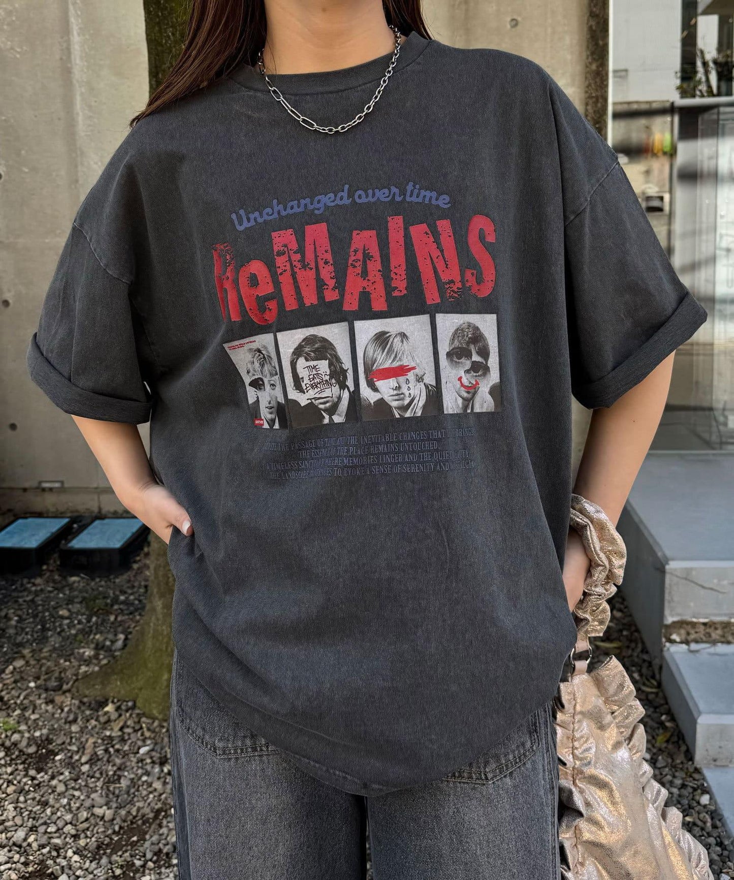 這是一款印花 T 恤,大膽的印花中帶有醒目的樂隊圖案。