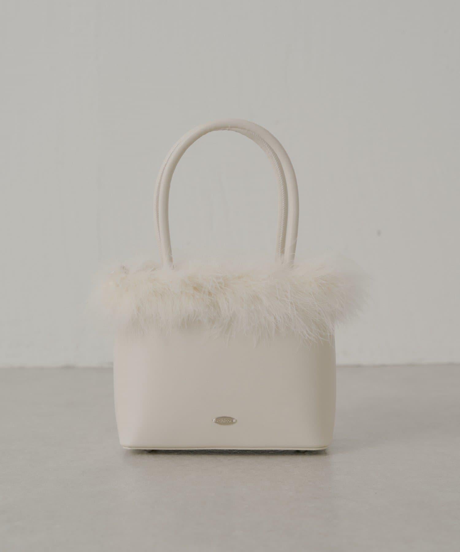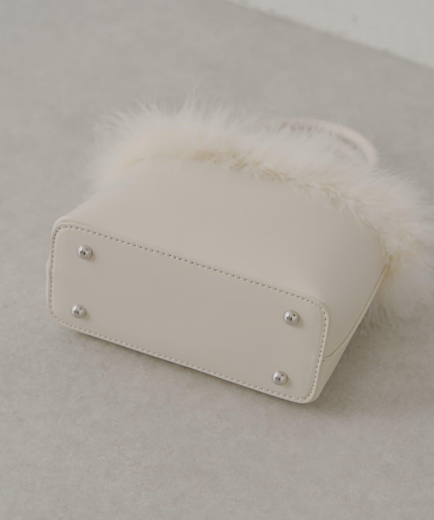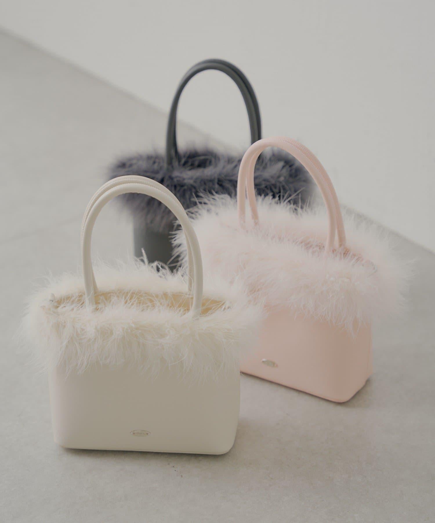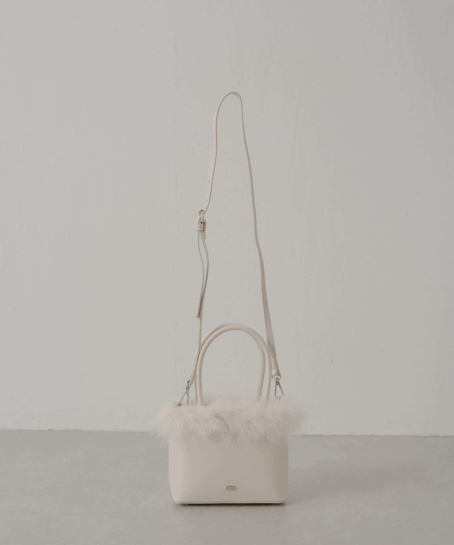 這款方形手袋飾有蓬鬆的毛邊。