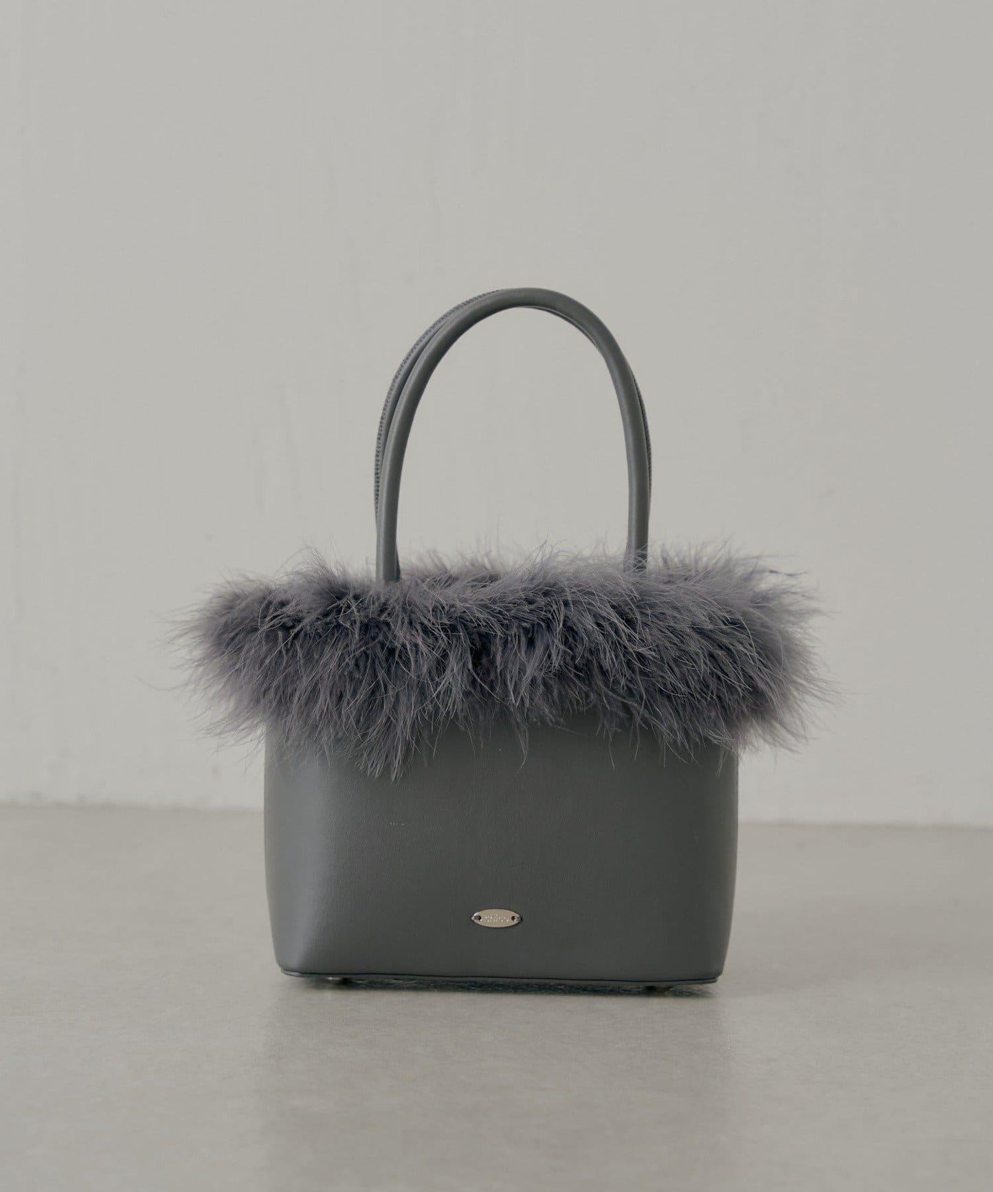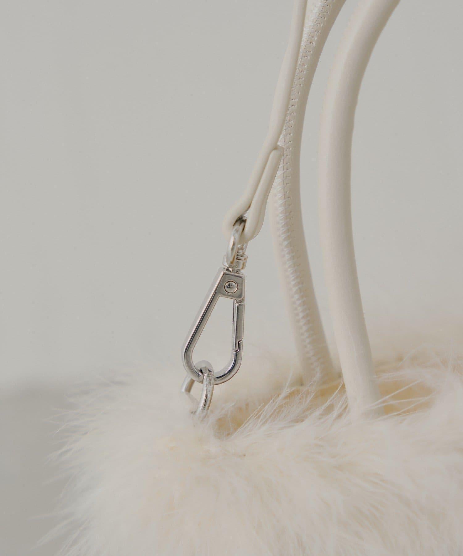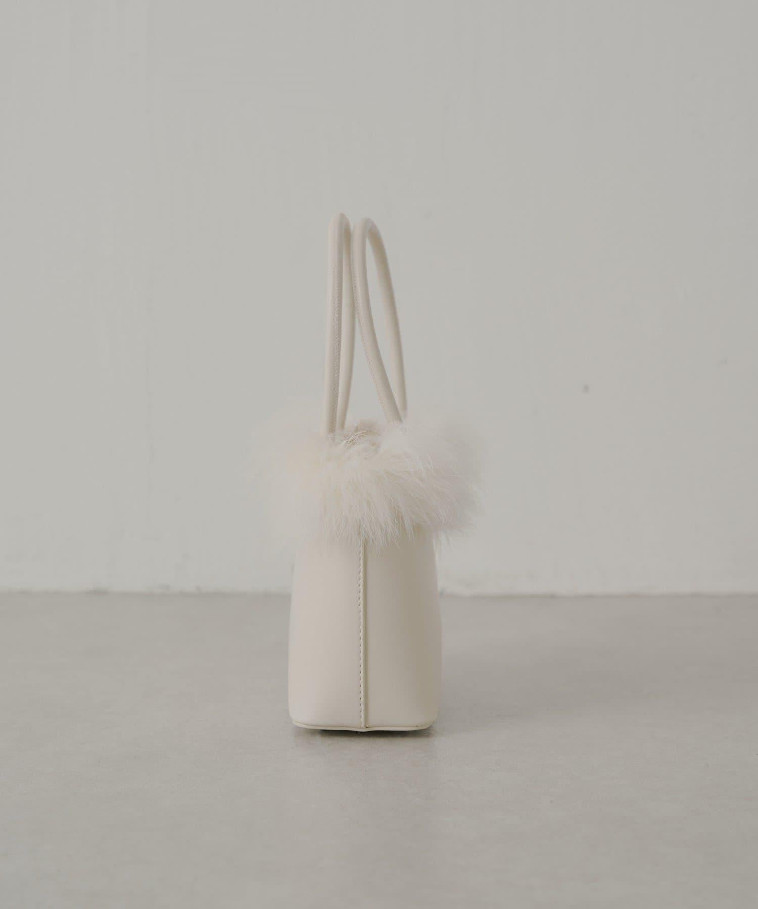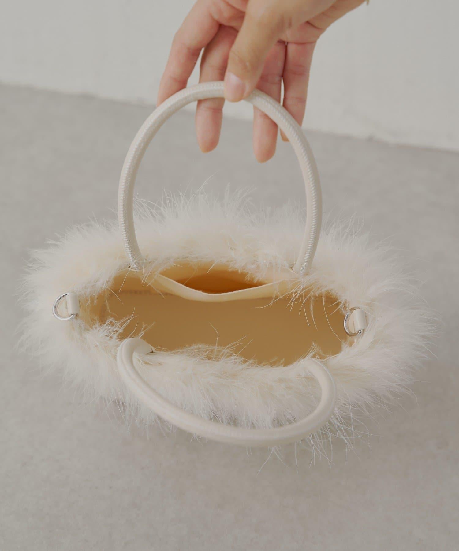 這款方形手袋飾有蓬鬆的毛邊。