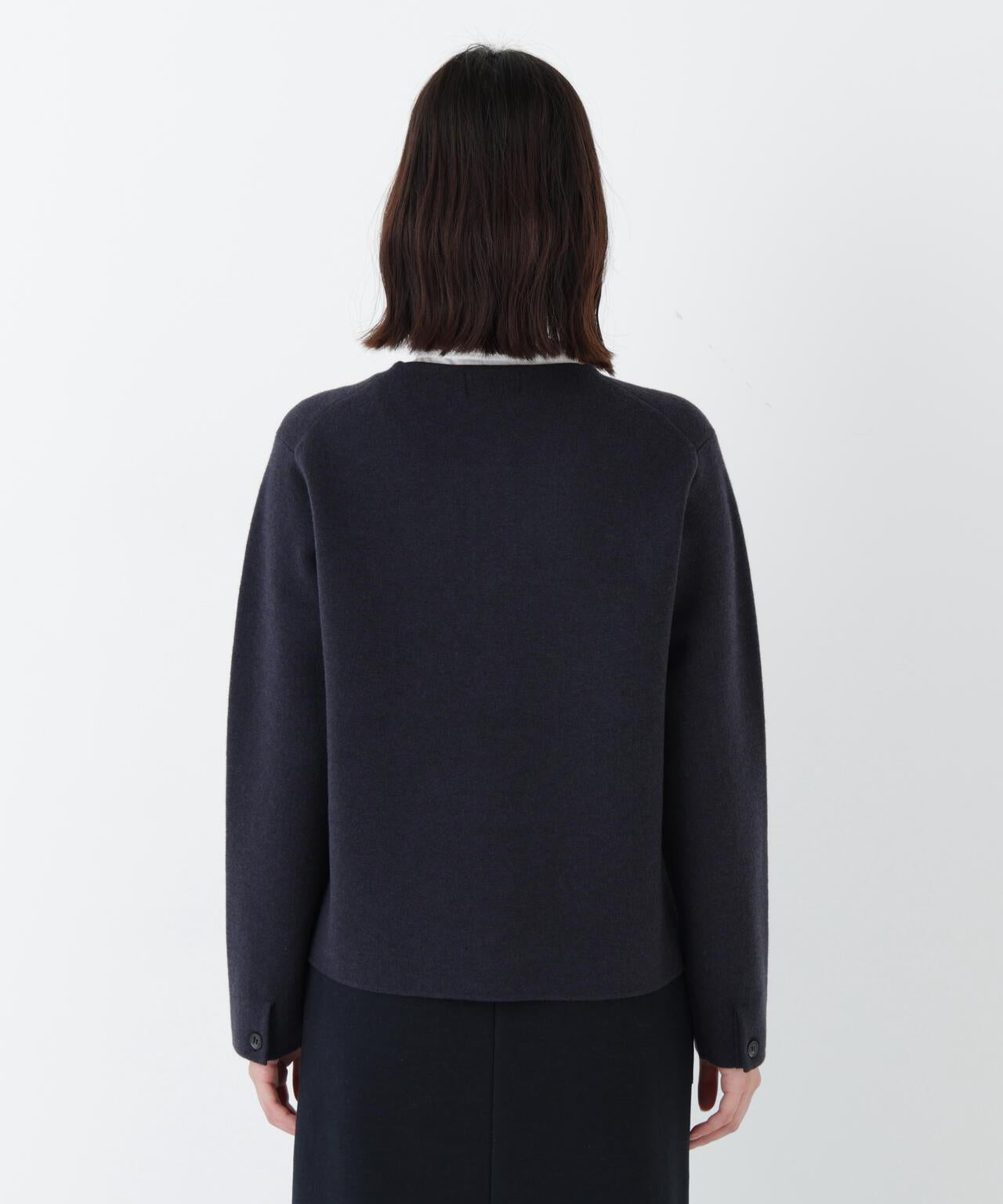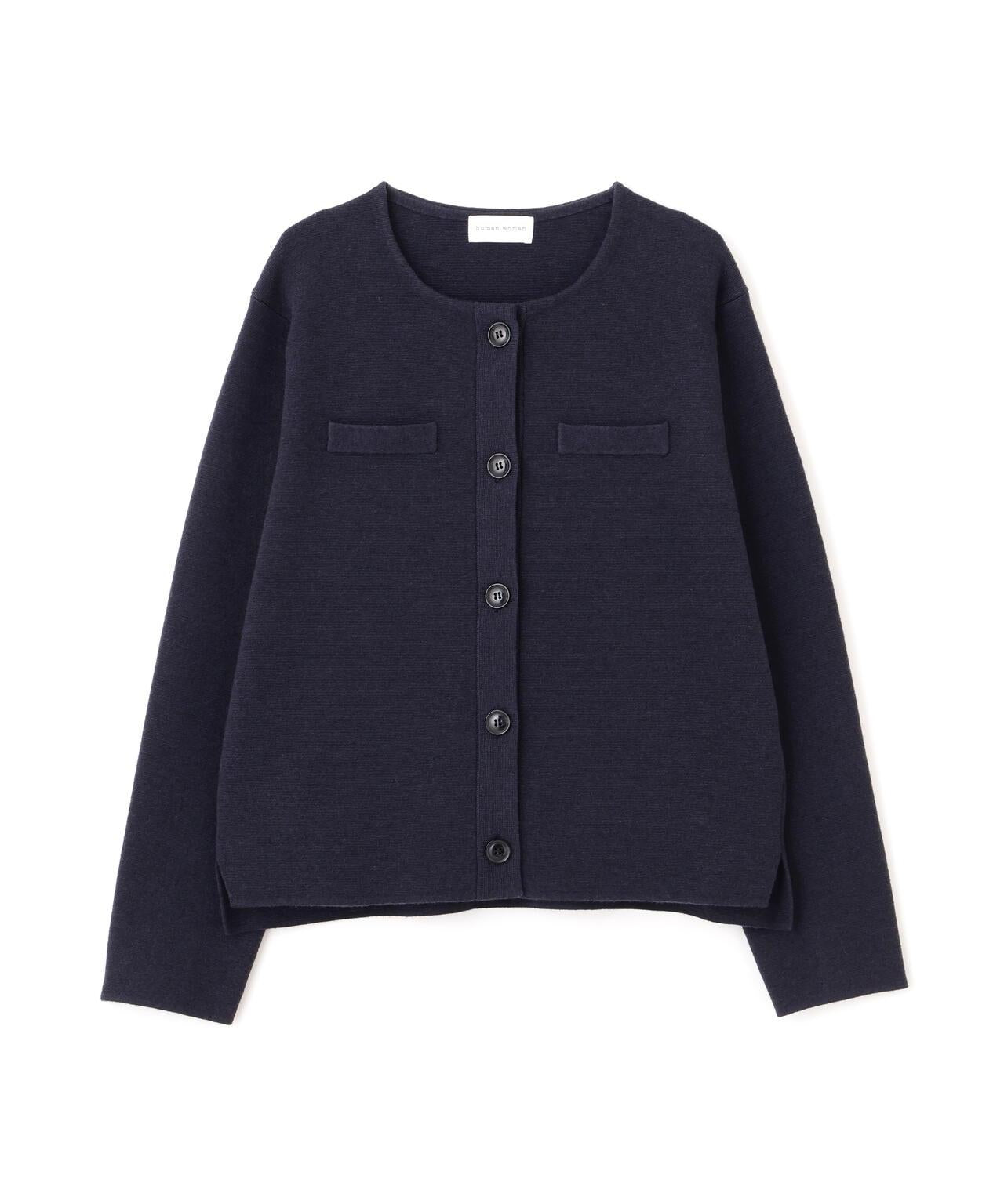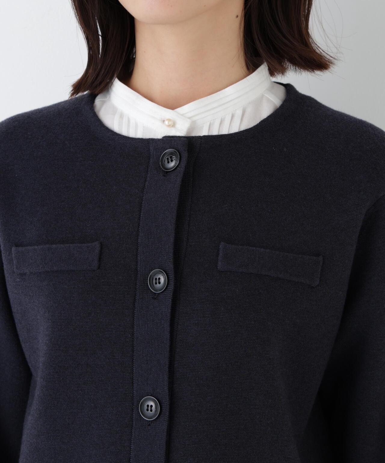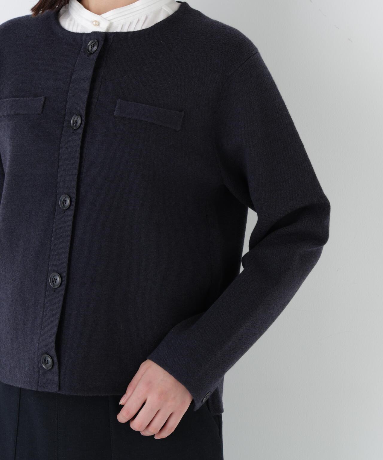 開衫式夾克,上班下班兩相宜 [設計特色] 開衫式夾克,圓領設計。胸前的裝飾口袋和袖口的紐扣開口使其顯得整潔大方。前後長度差和開衩設計給人輕盈的感覺。針織面料質地結實,有彈性,因此不必擔心會變形。表面乾淨整潔的外觀在美麗的場景中也很實用。推薦座標] 製作成也可用作外套的尺寸。也推薦紐扣扣緊的類似套頭衫的款式。