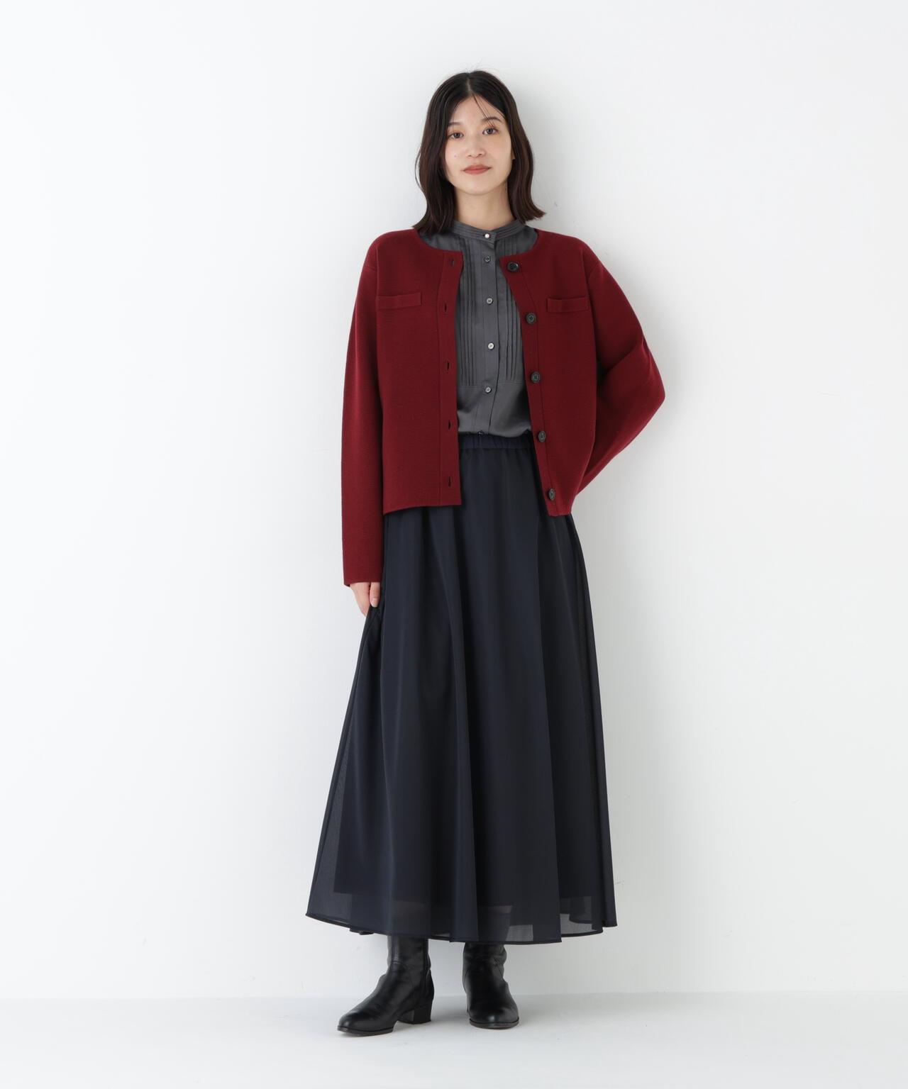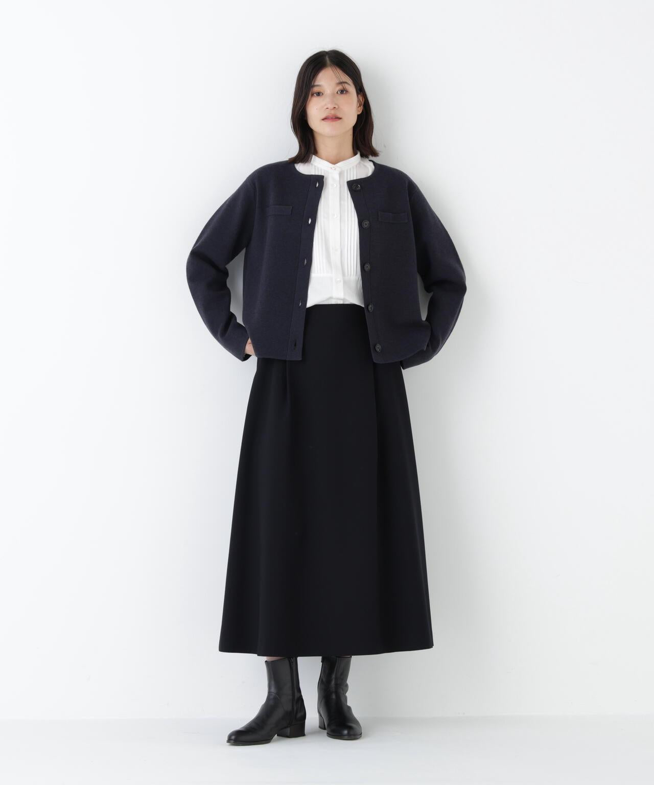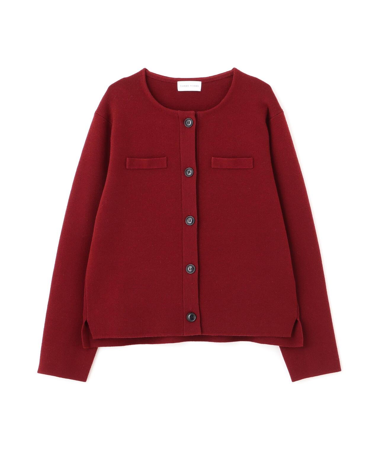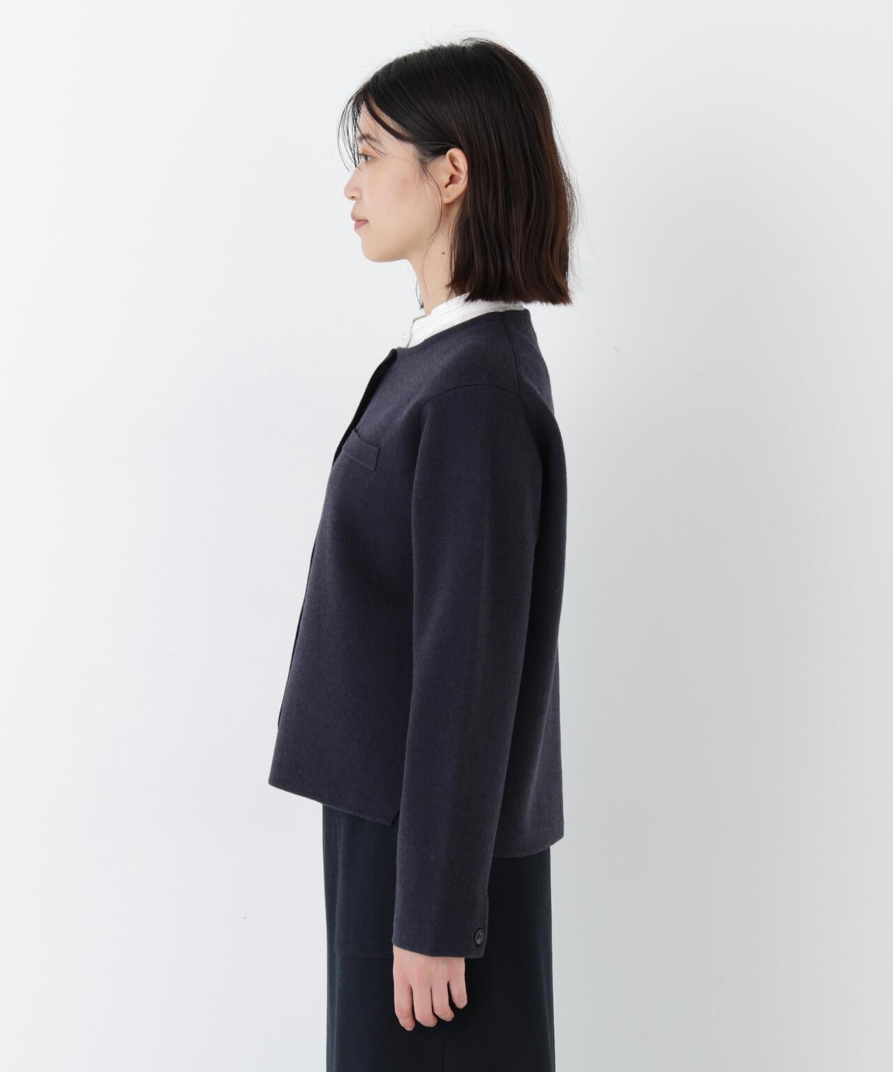 開衫式夾克,上班下班兩相宜 [設計特色] 開衫式夾克,圓領設計。胸前的裝飾口袋和袖口的紐扣開口使其顯得整潔大方。前後長度差和開衩設計給人輕盈的感覺。針織面料質地結實,有彈性,因此不必擔心會變形。表面乾淨整潔的外觀在美麗的場景中也很實用。推薦座標] 製作成也可用作外套的尺寸。也推薦紐扣扣緊的類似套頭衫的款式。