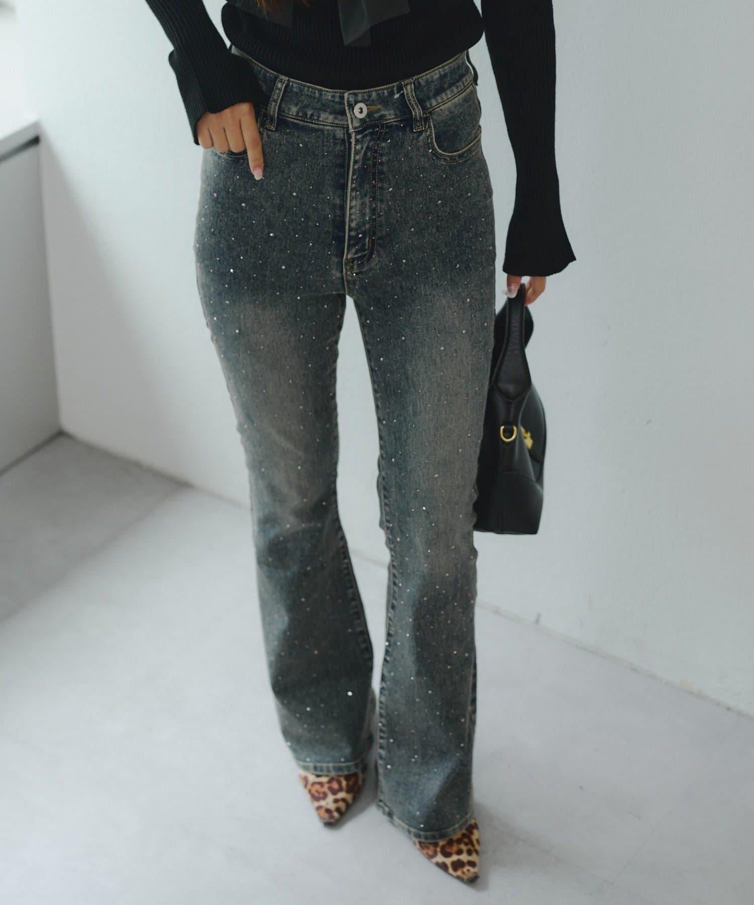 鑲嵌寶石的牛仔長褲,走起路來閃閃發光。
